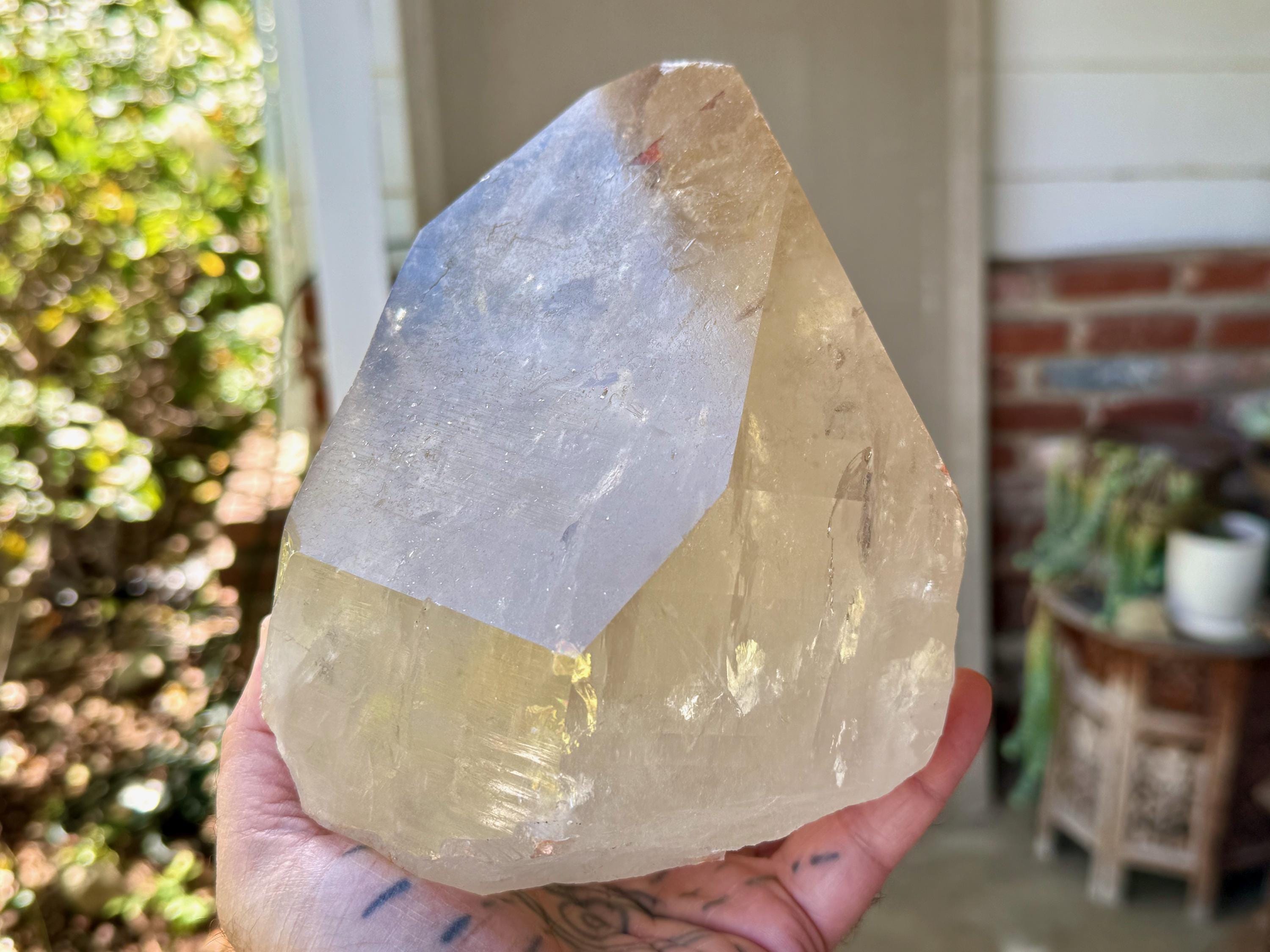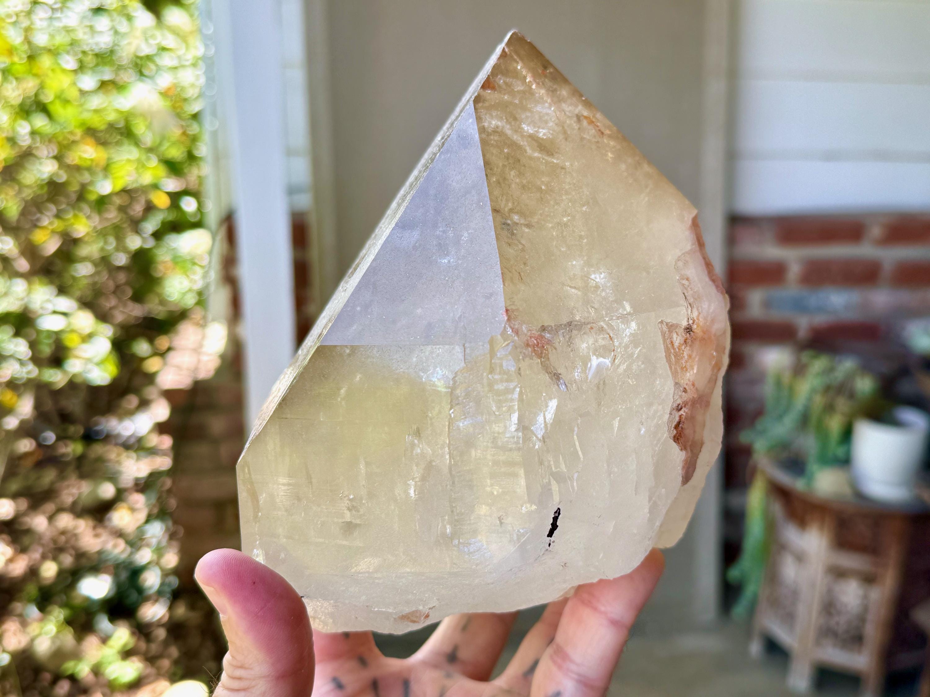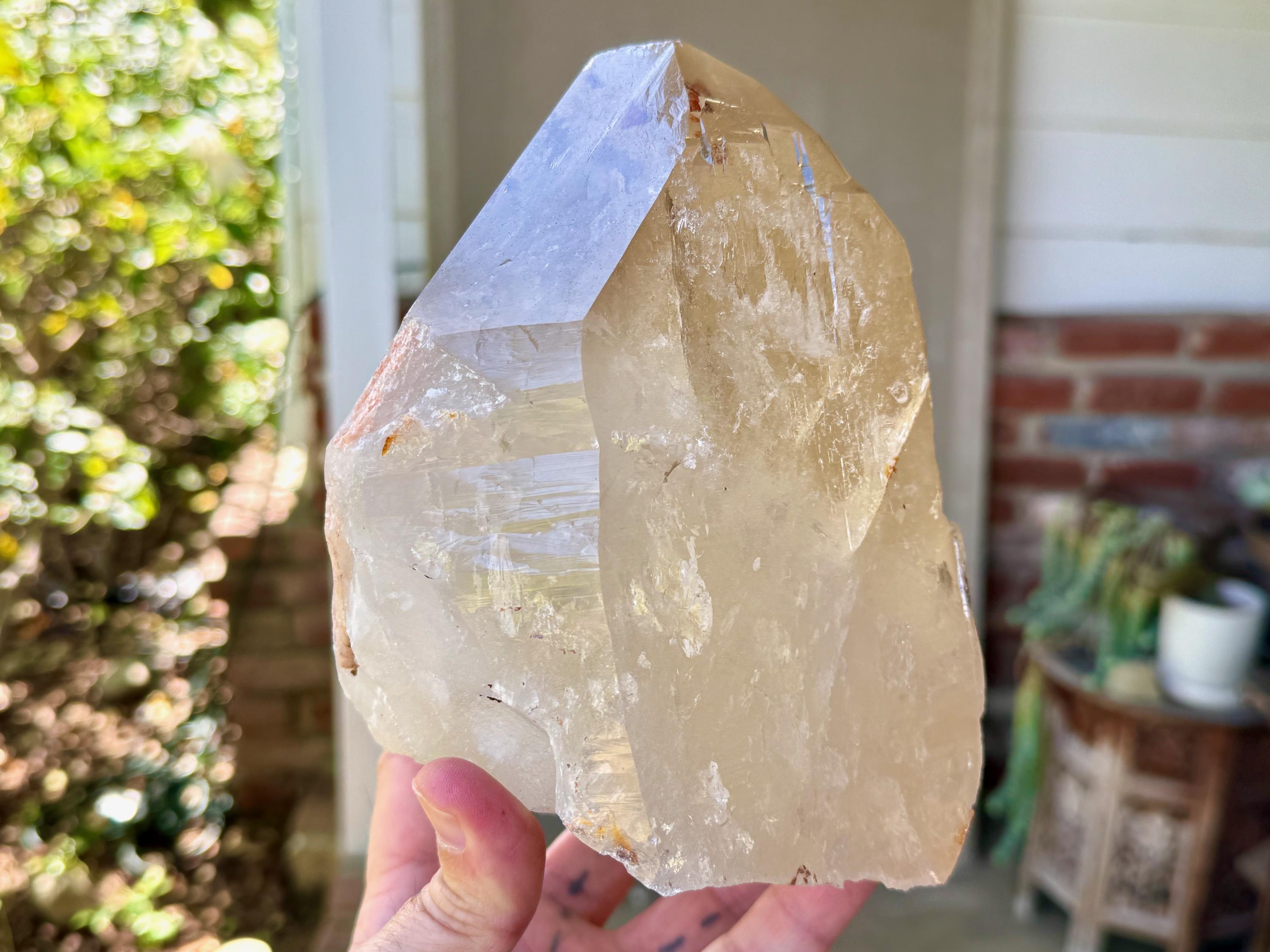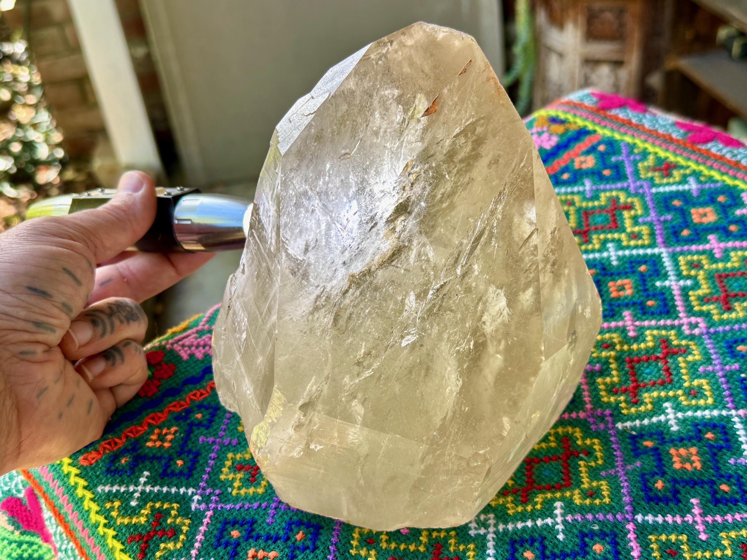 Superb luster and a mild golden color to this massive Cathedral Citrine powerhouse! This is a natural crystal with great clarity and an absolutely GIANT main facet. This clarity allows us to peer inside and see all the crystalline formations within. And when backlit, as in Photos 2-3, we can see it lights up brilliantly.