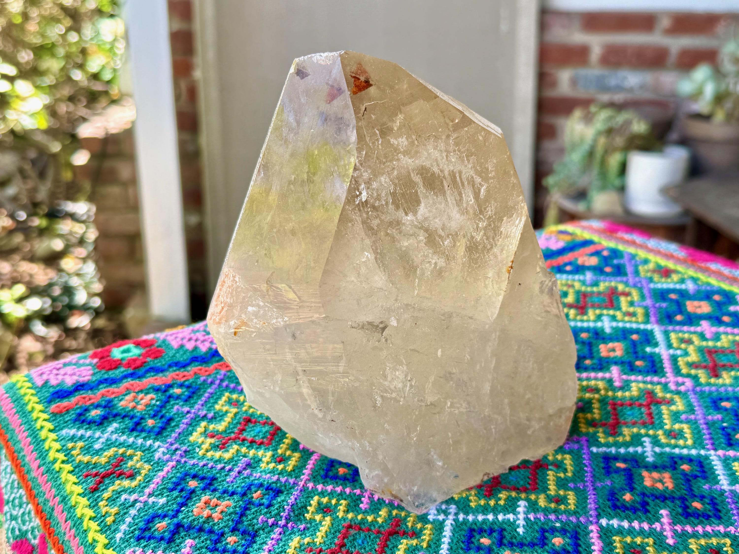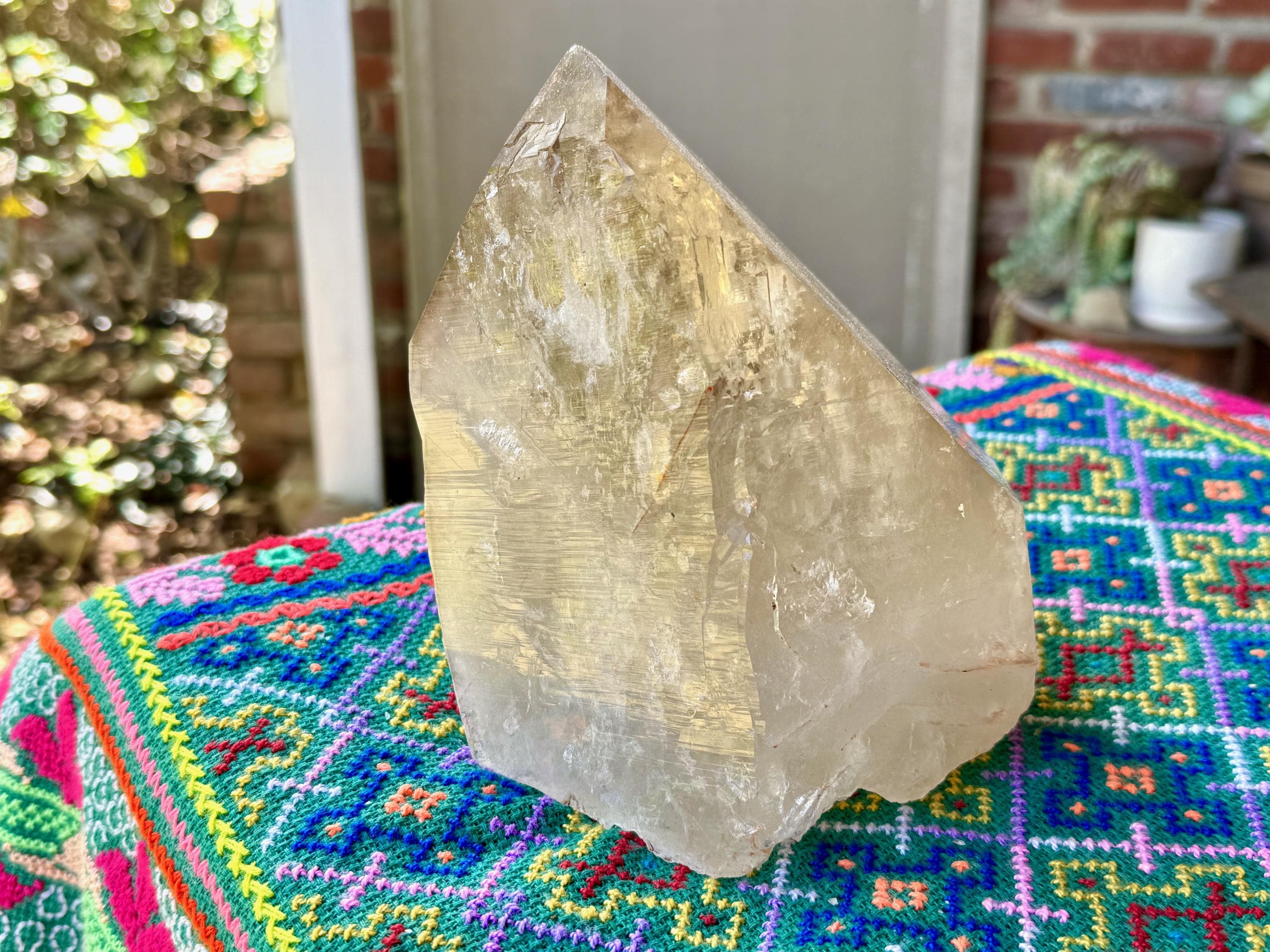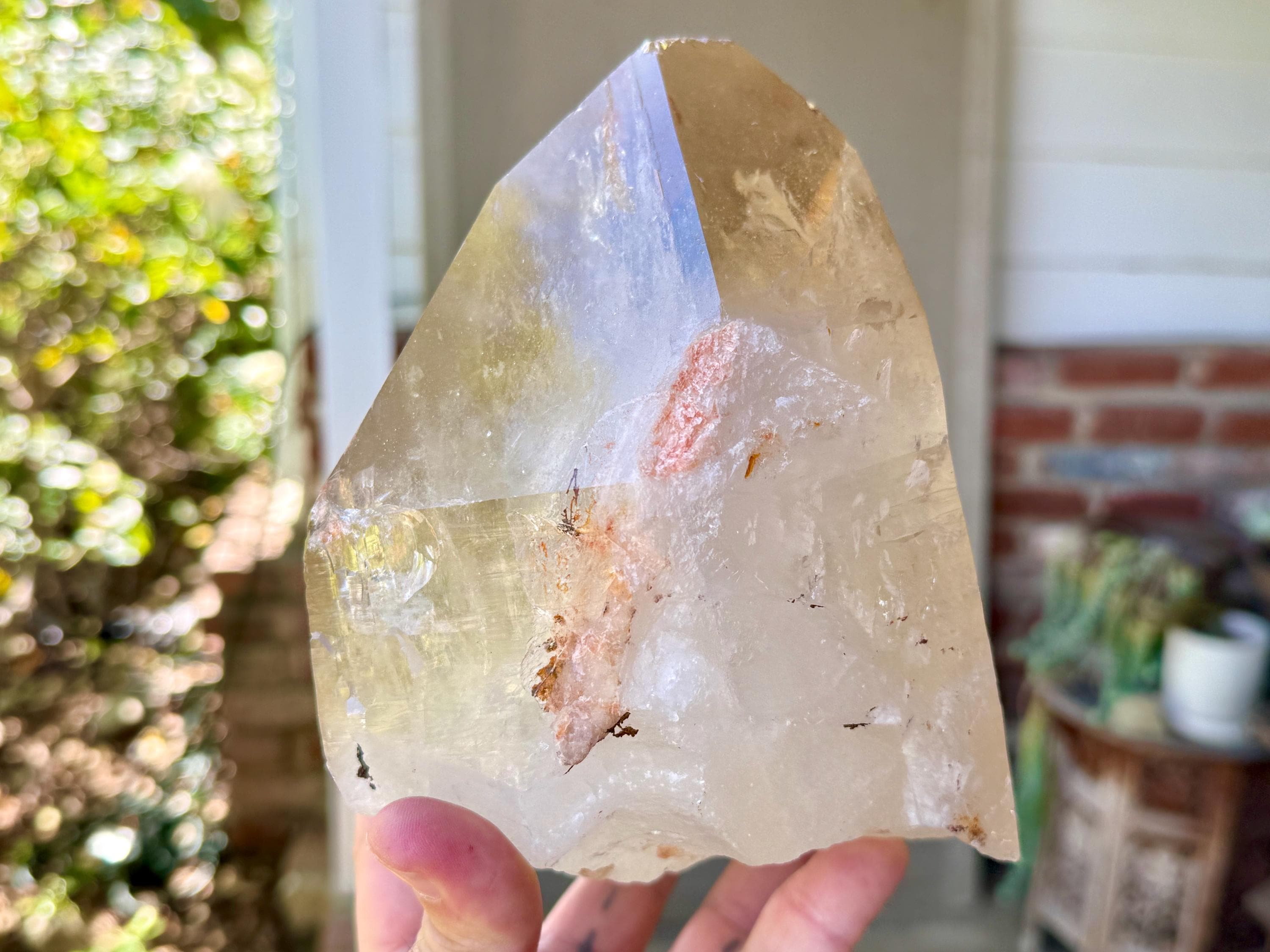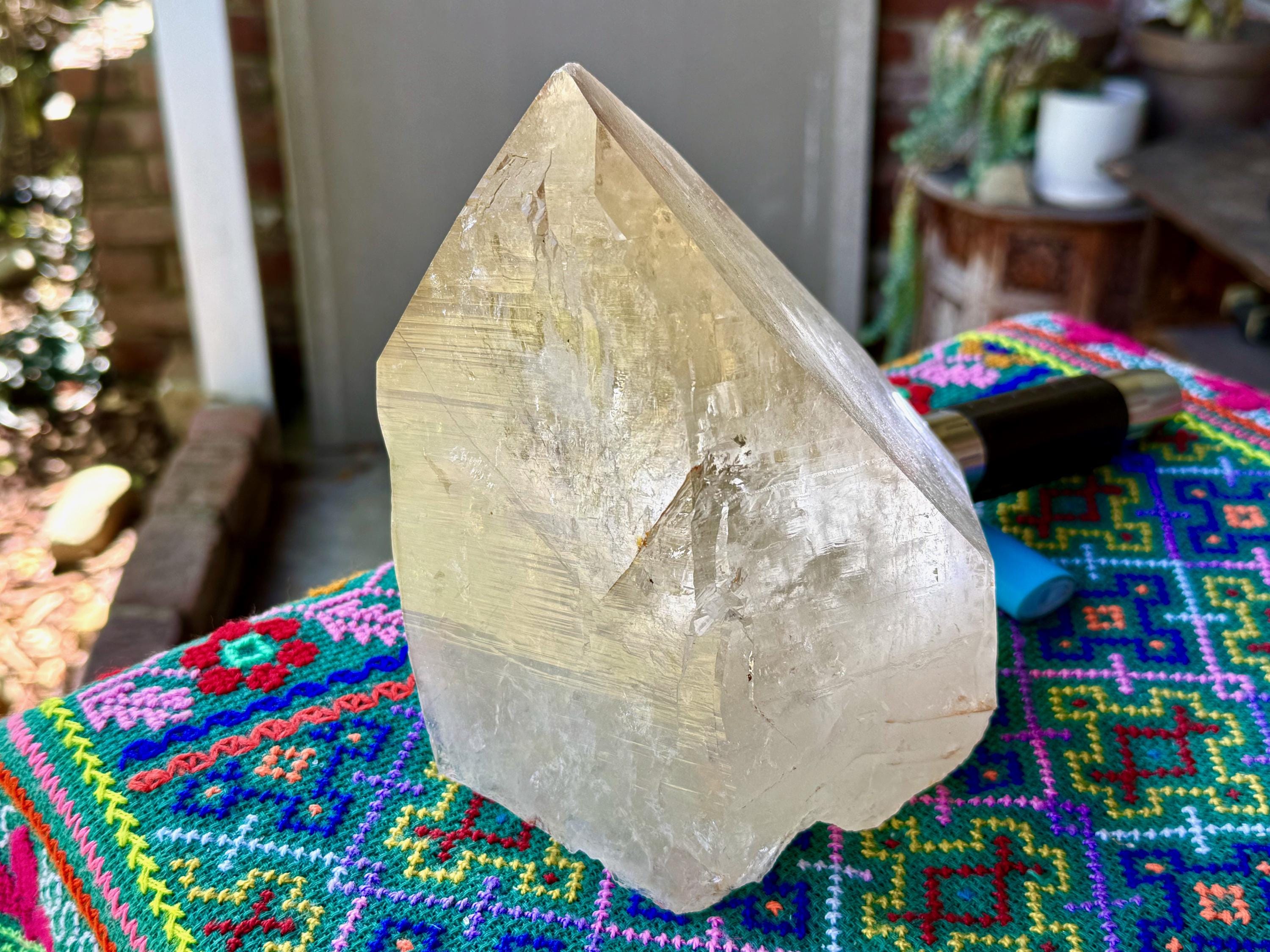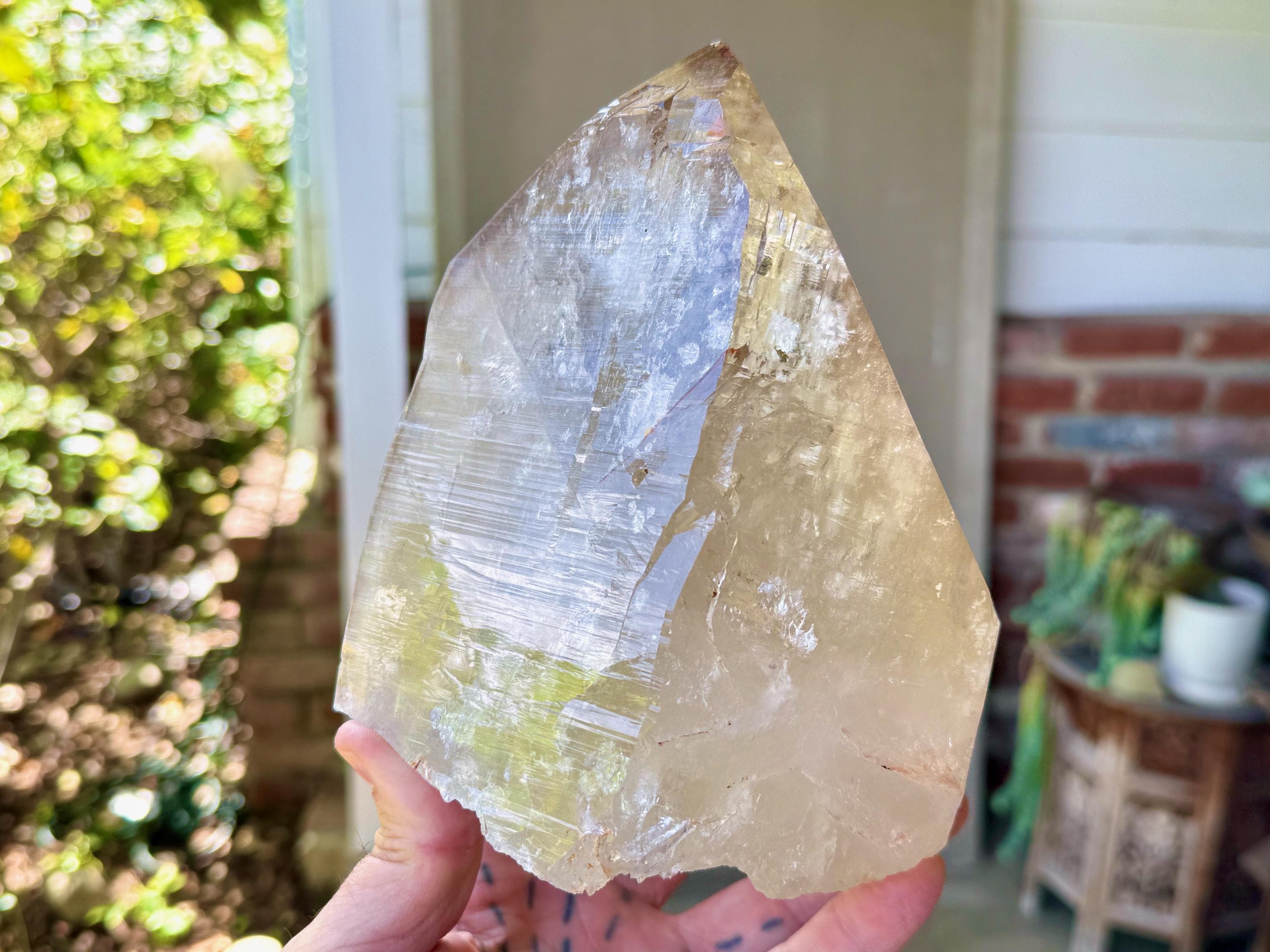 Superb luster and a mild golden color to this massive Cathedral Citrine powerhouse! This is a natural crystal with great clarity and an absolutely GIANT main facet. This clarity allows us to peer inside and see all the crystalline formations within. And when backlit, as in Photos 2-3, we can see it lights up brilliantly.
