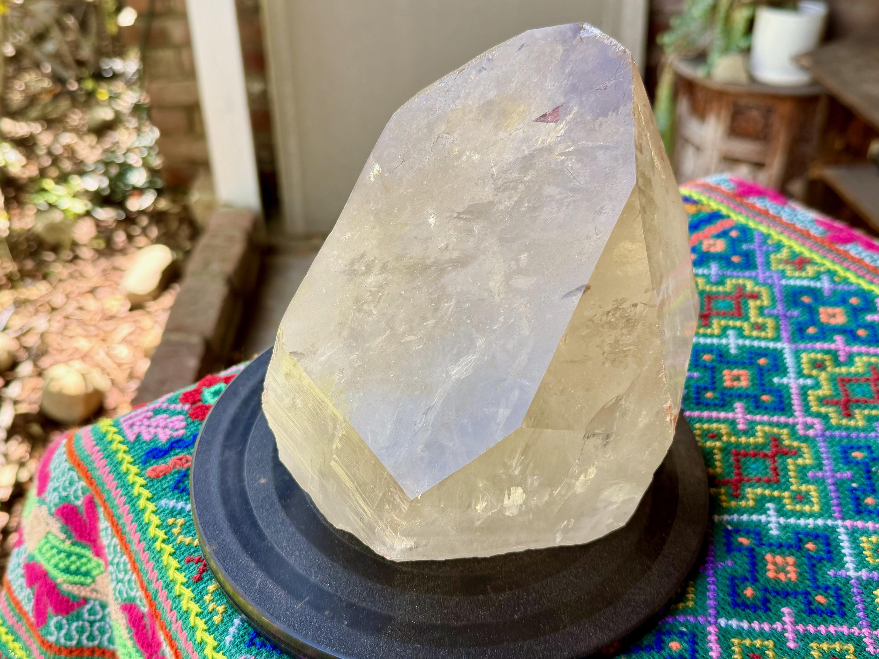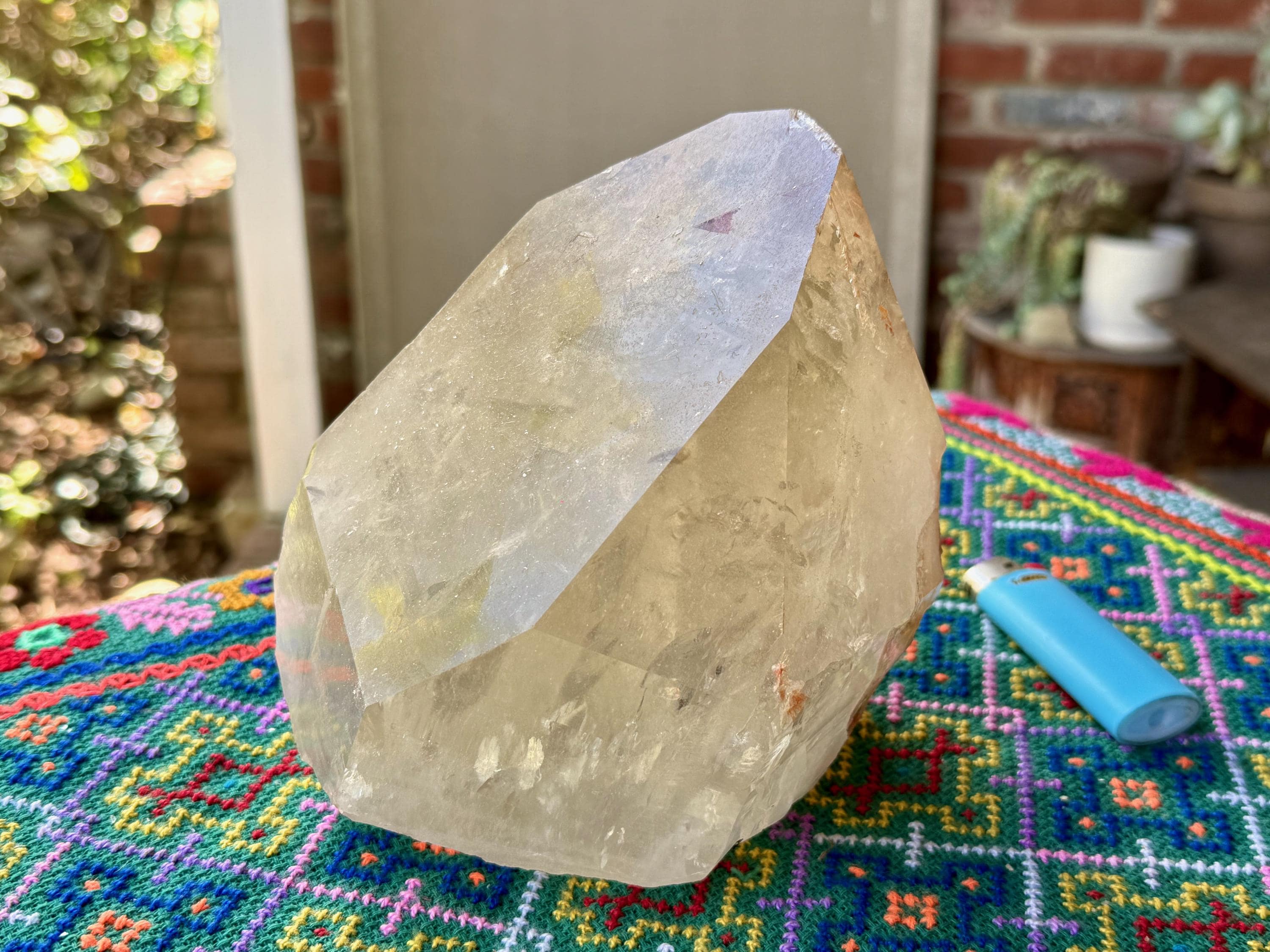 The size of this crystal is most impressive, we've included a standard lighter in a few of the photos to show a relative size comparison. And because of its naturally flat base, it sits beautifully for display, as pictured.