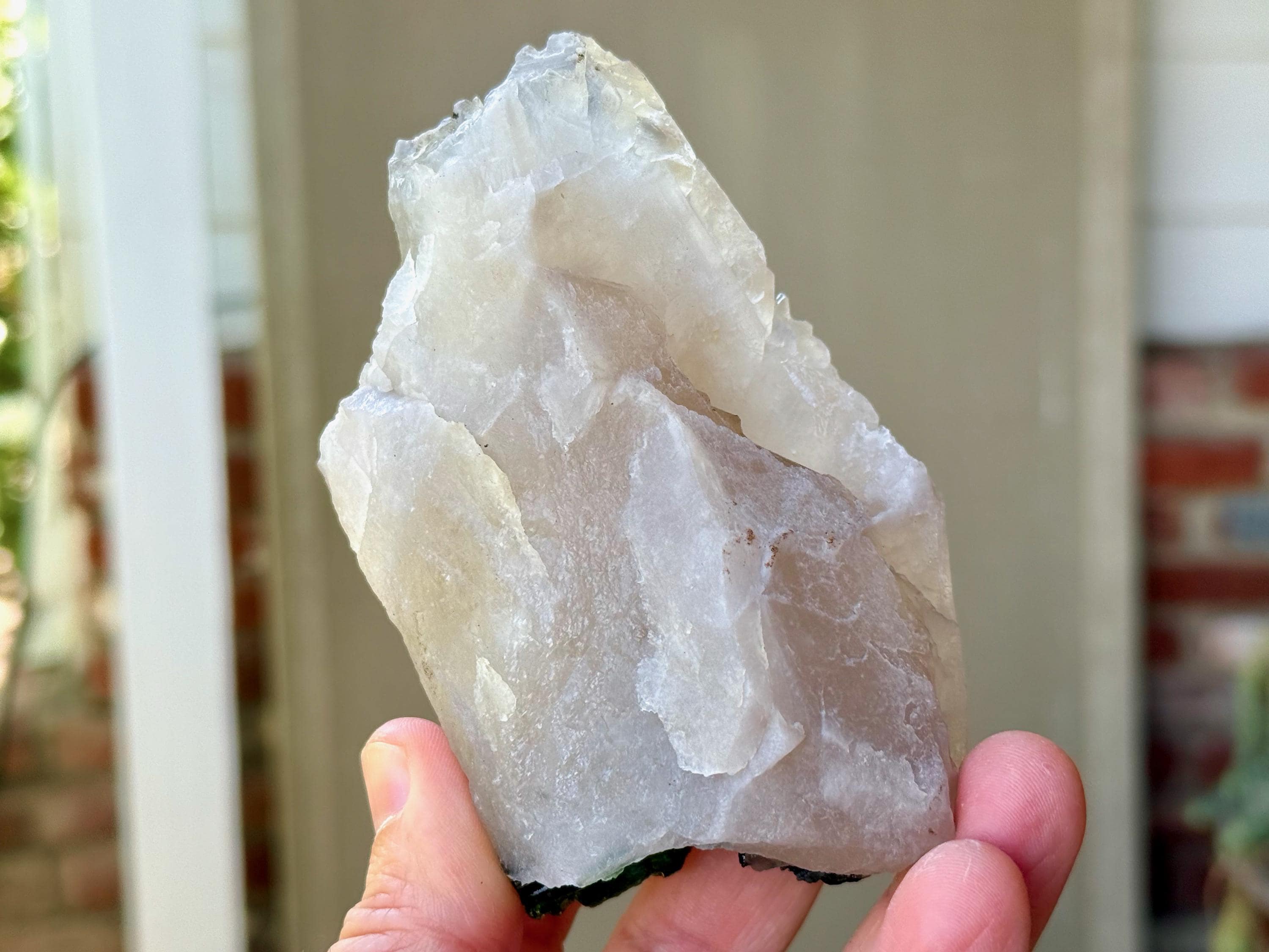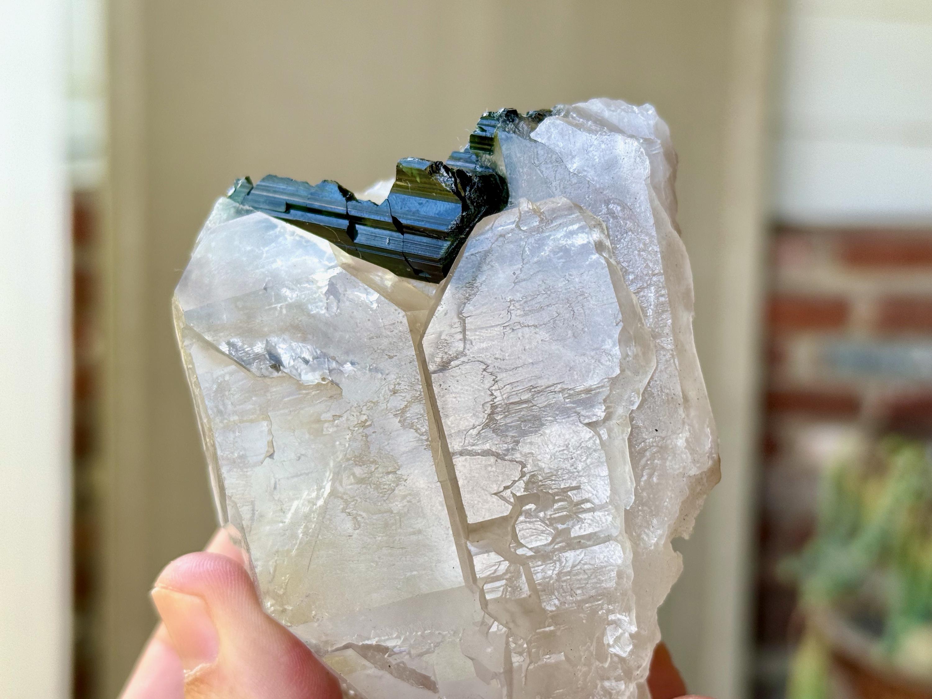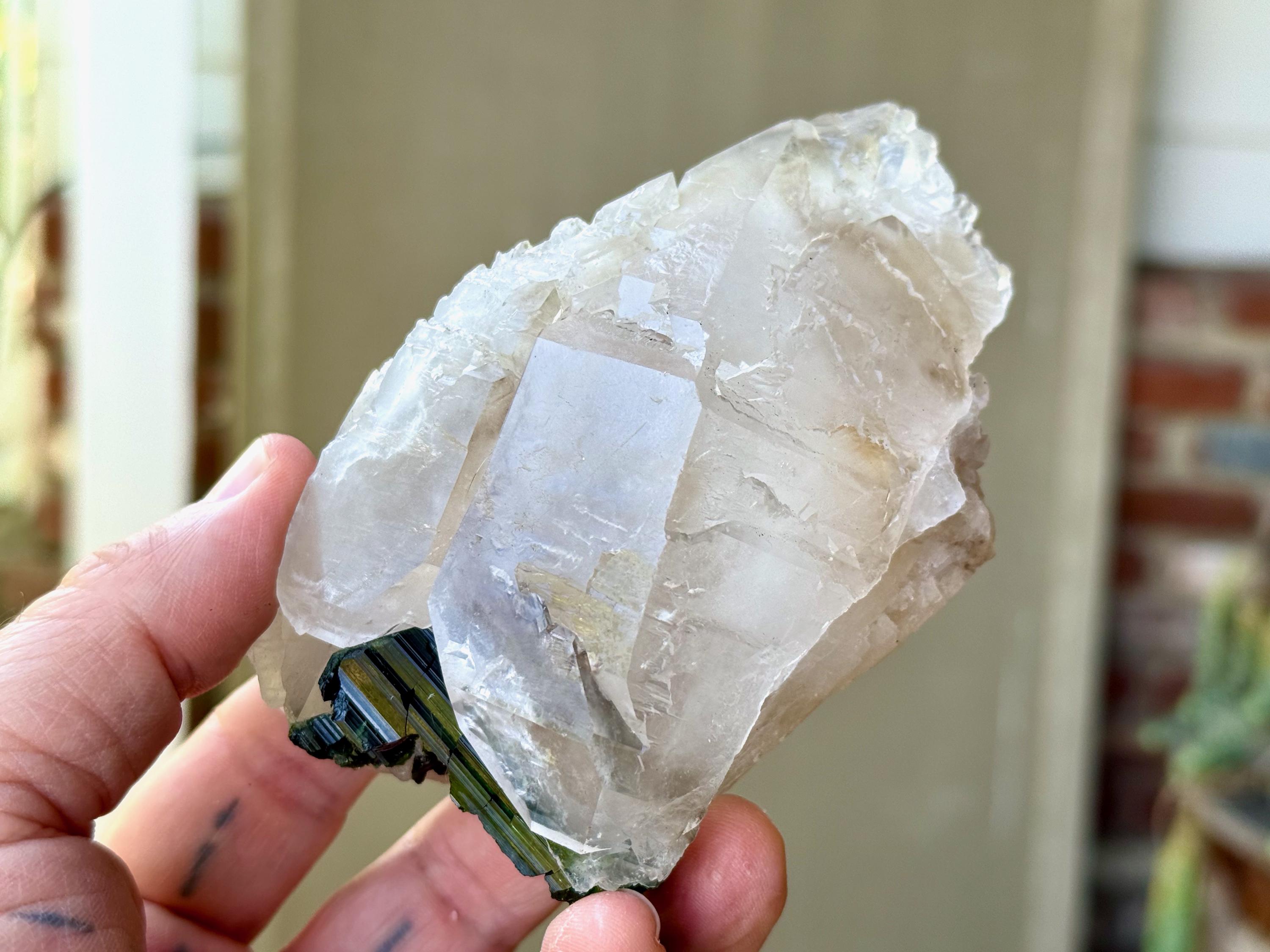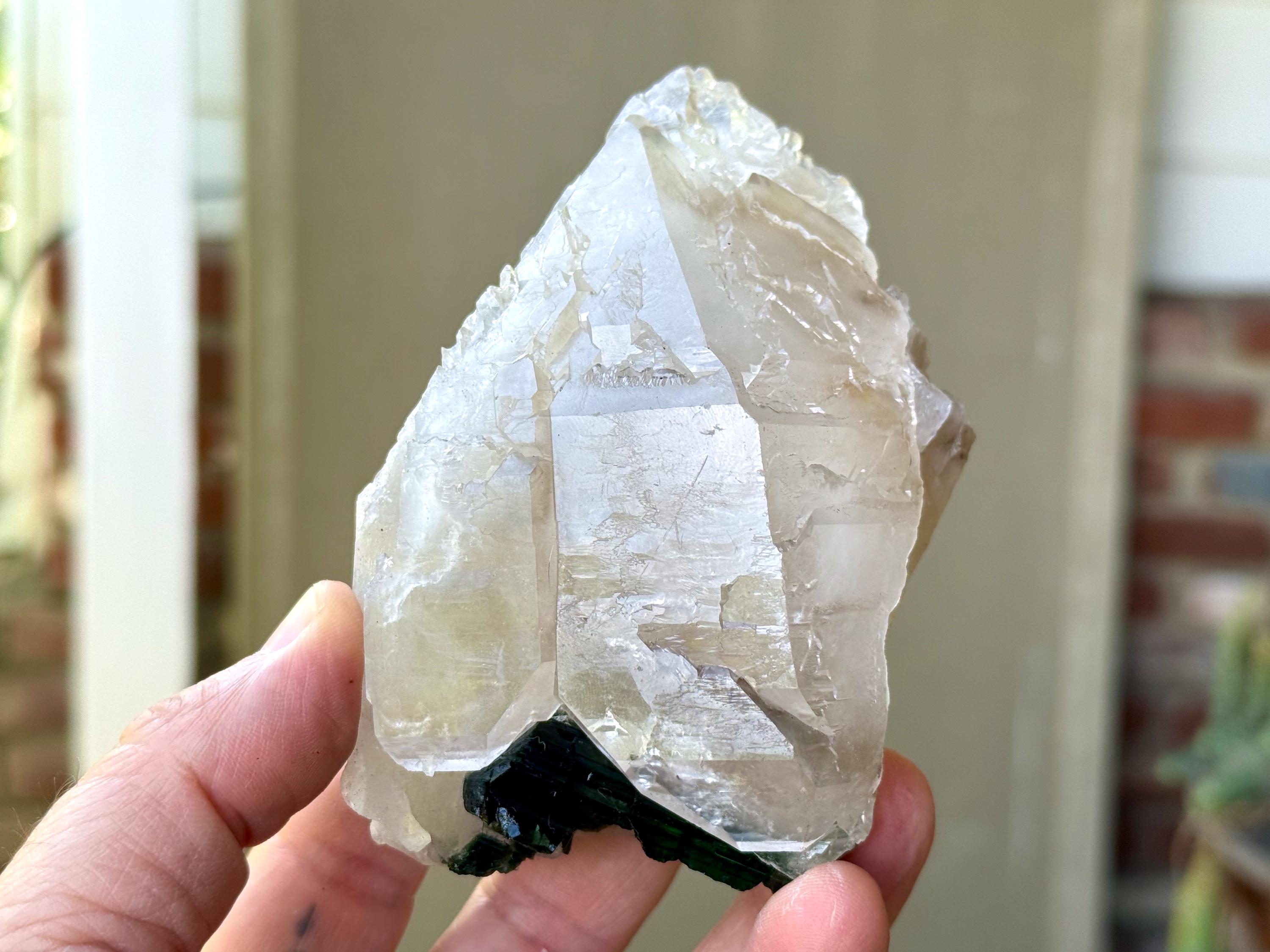 Icy luster and a unique marbling of whitish, clear and mildly smoky to this Elestial Quartz crystal with a large inclusion of Green Tourmaline embedded at the base.