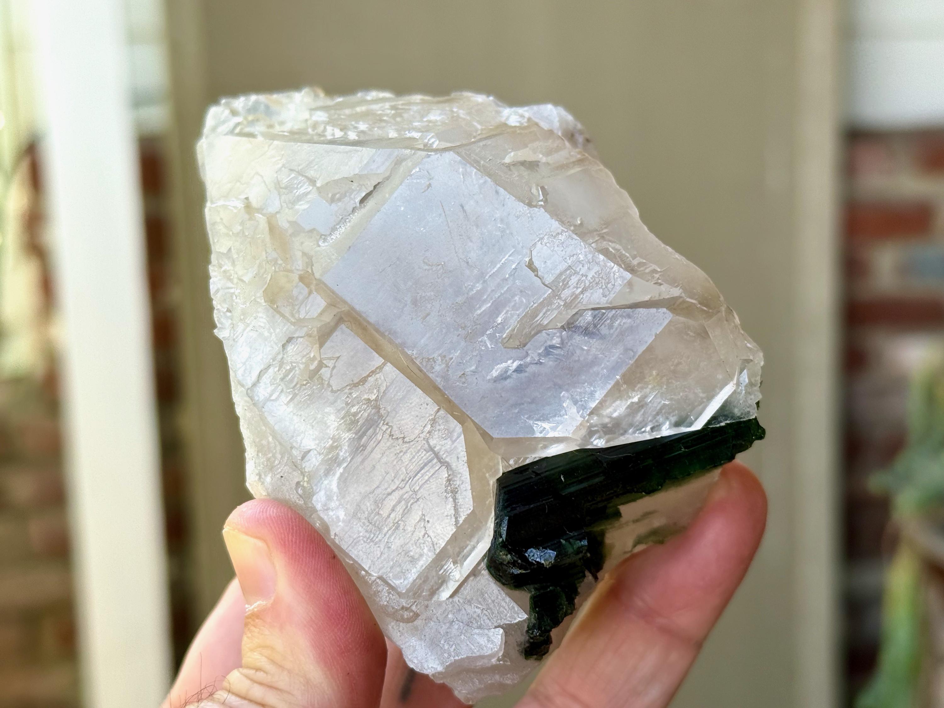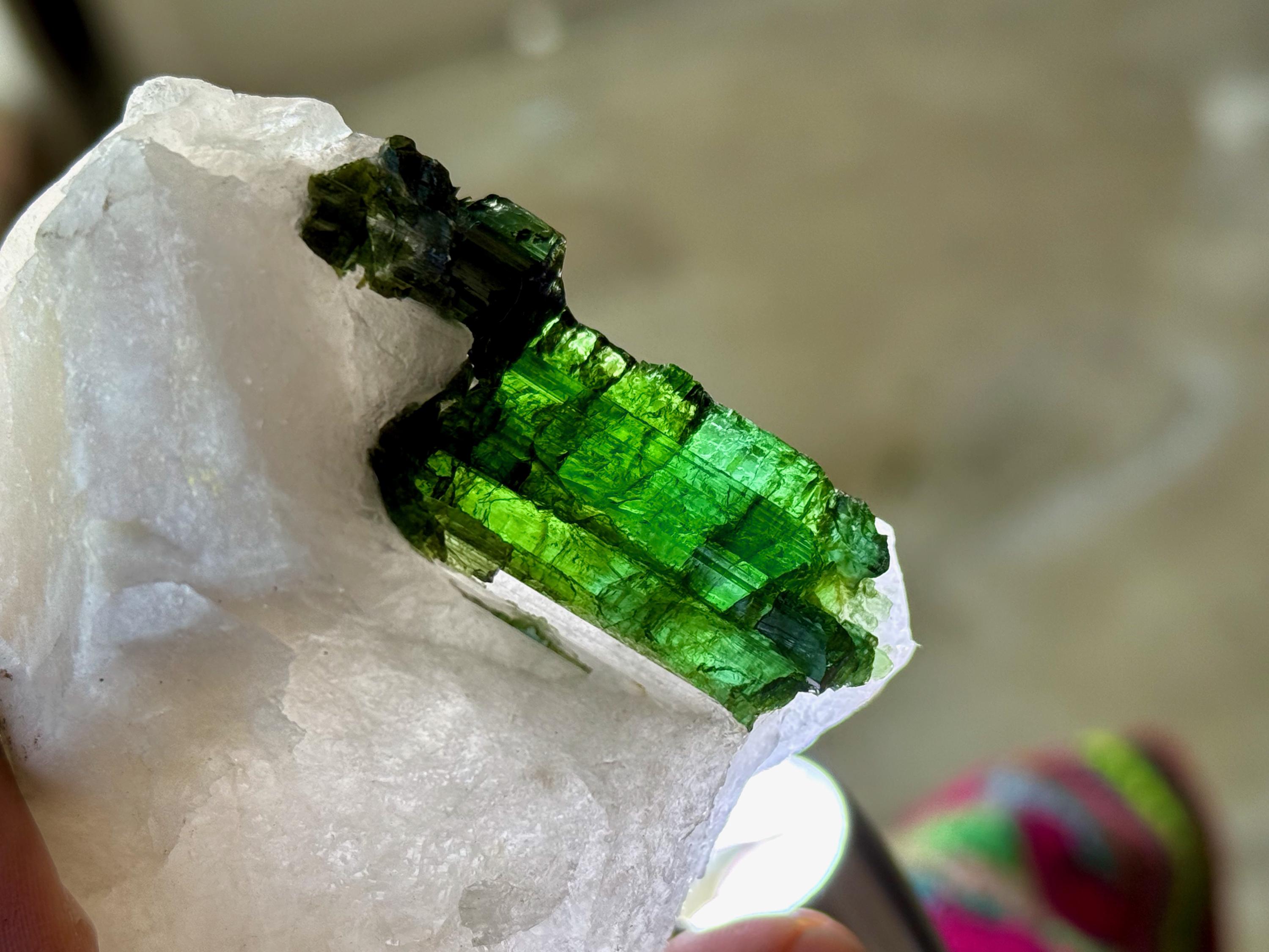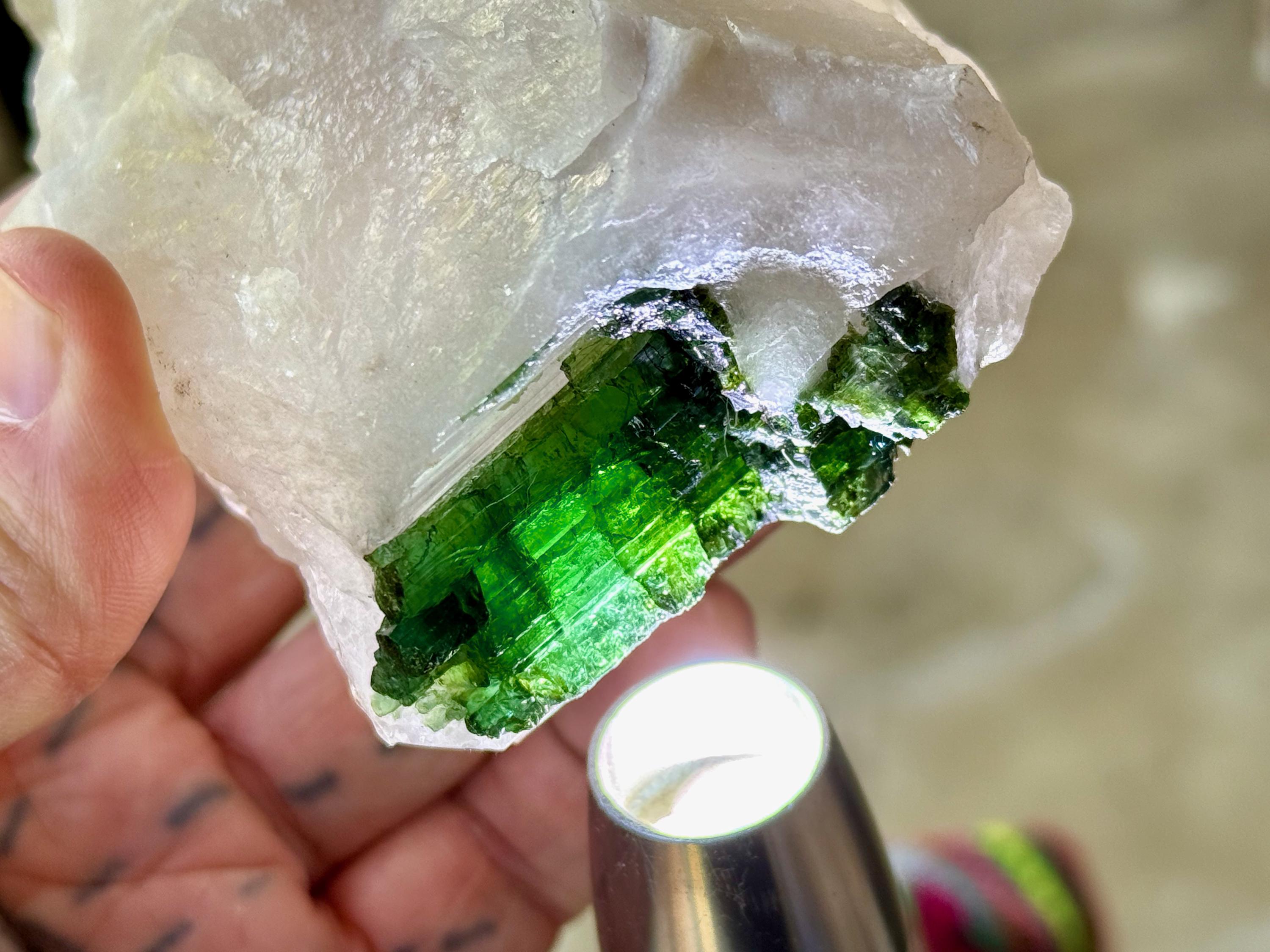 At first glance, this Tourmaline appears to be black. However, when backlit, it reveals a juicy, vibrant green color (Photos 2, 5-7).
