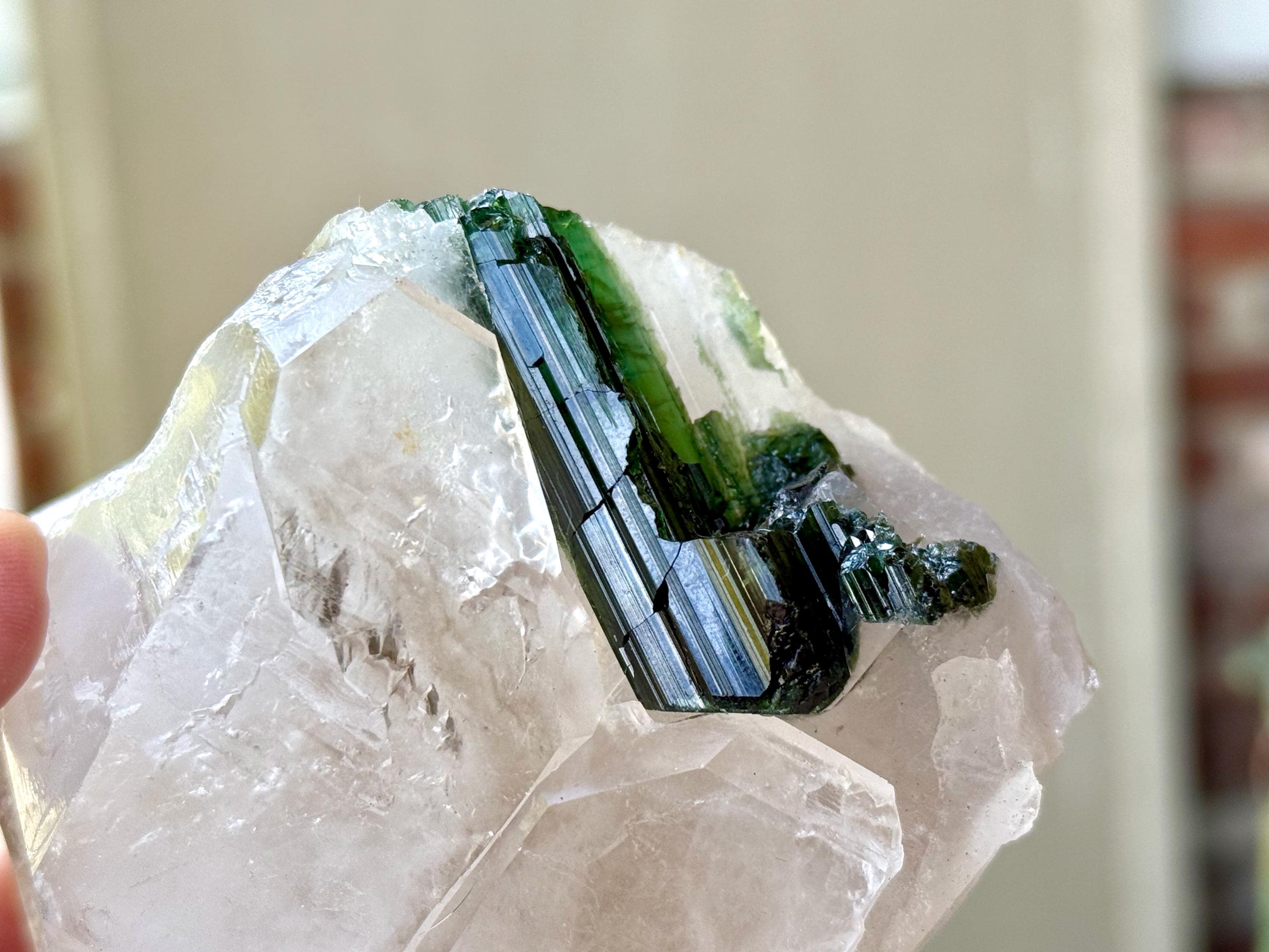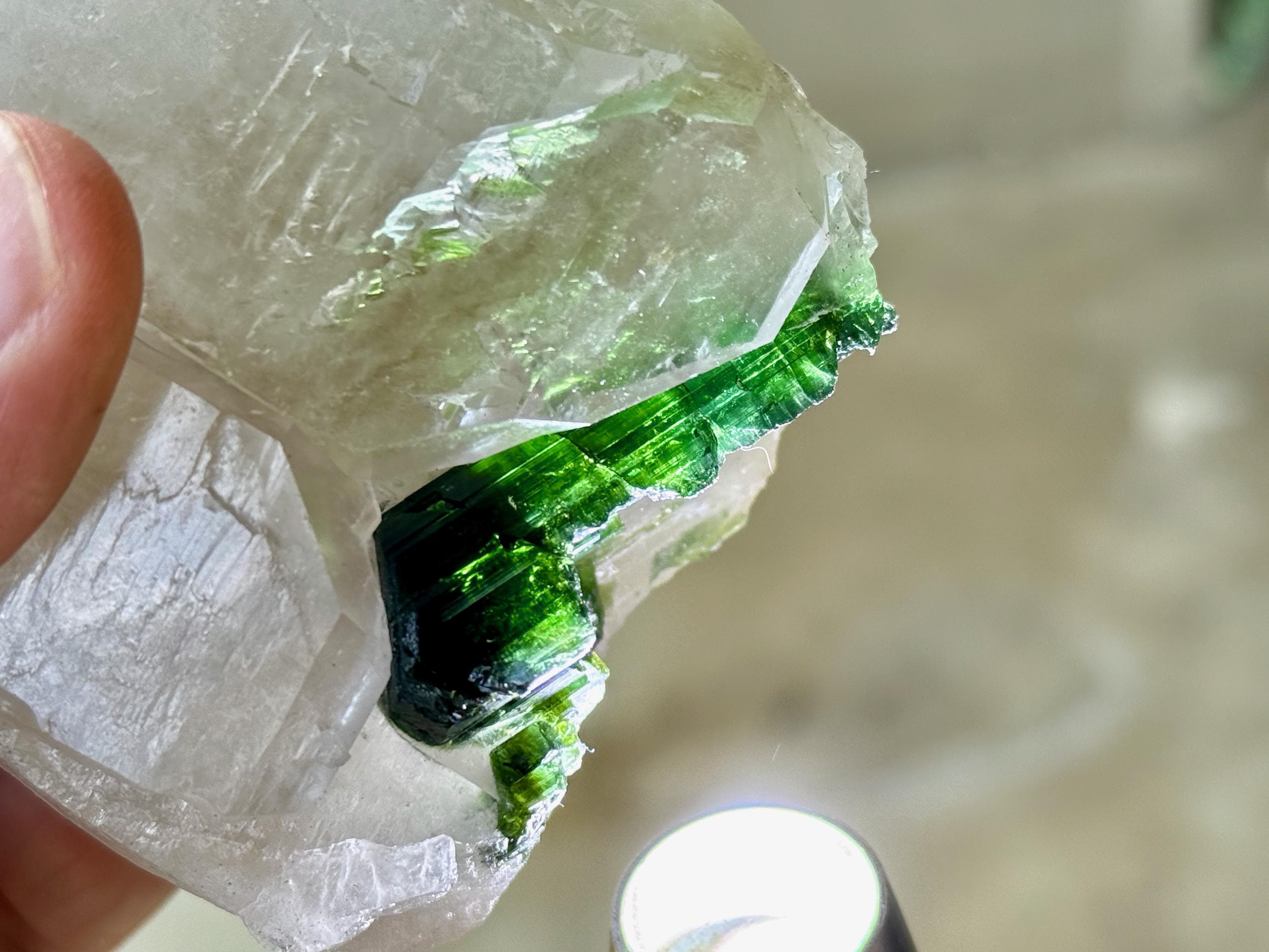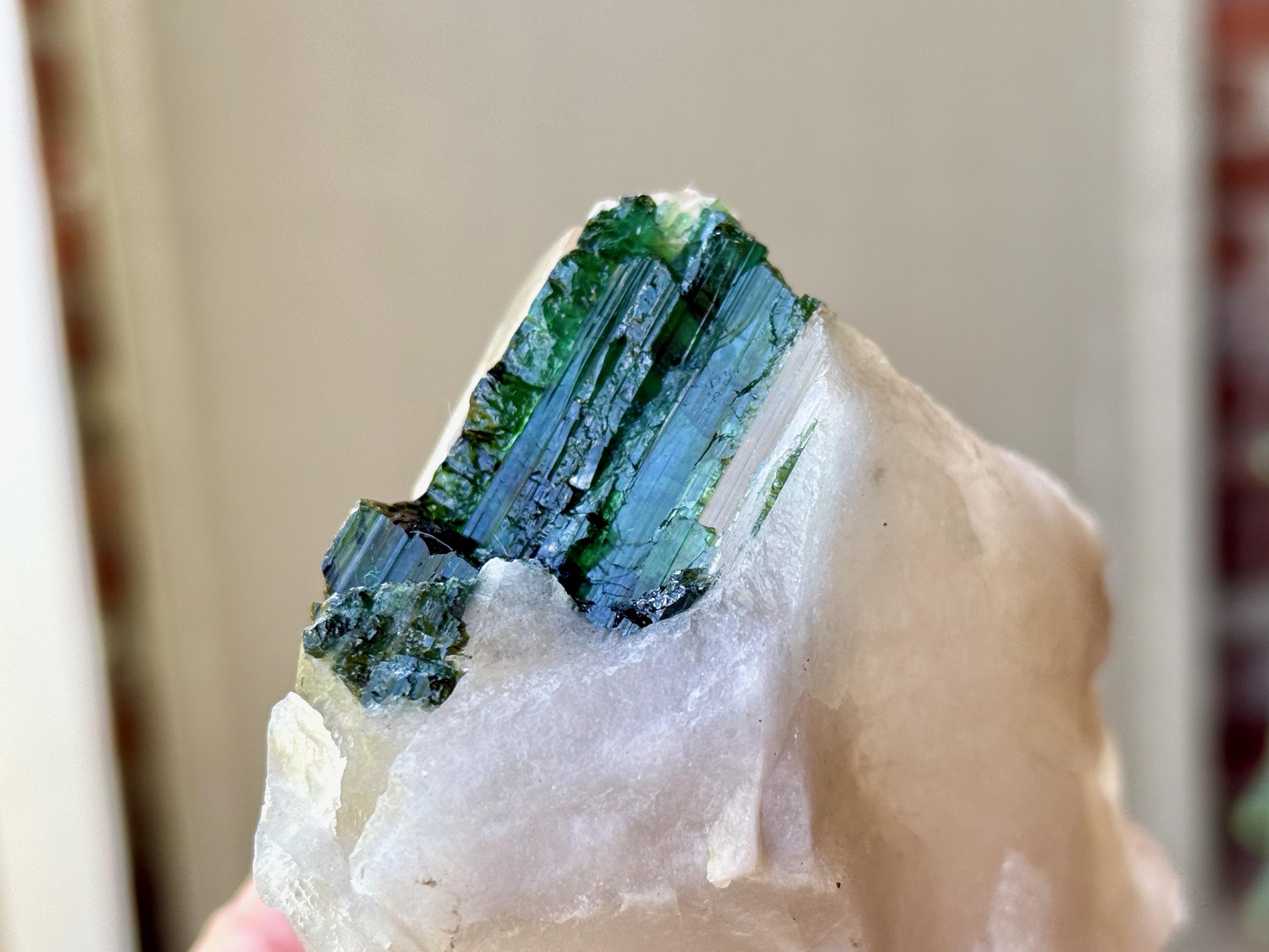 At first glance, this Tourmaline appears to be black. However, when backlit, it reveals a juicy, vibrant green color (Photos 2, 5-7).