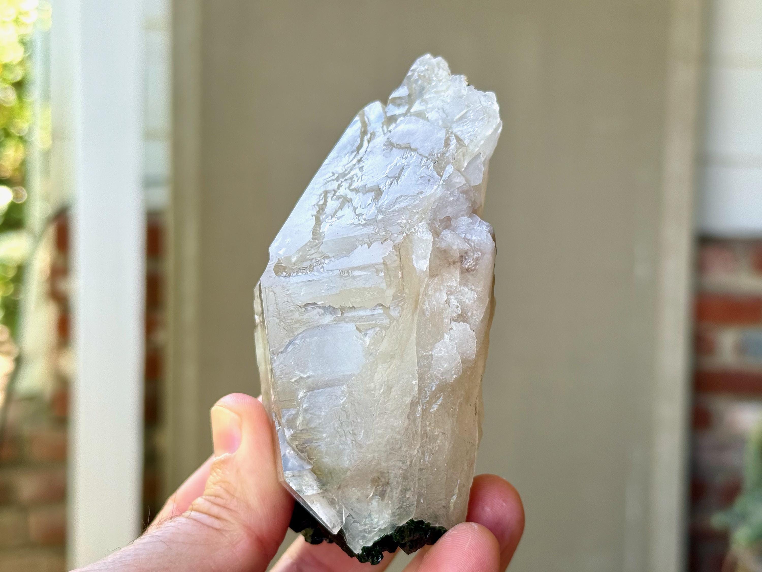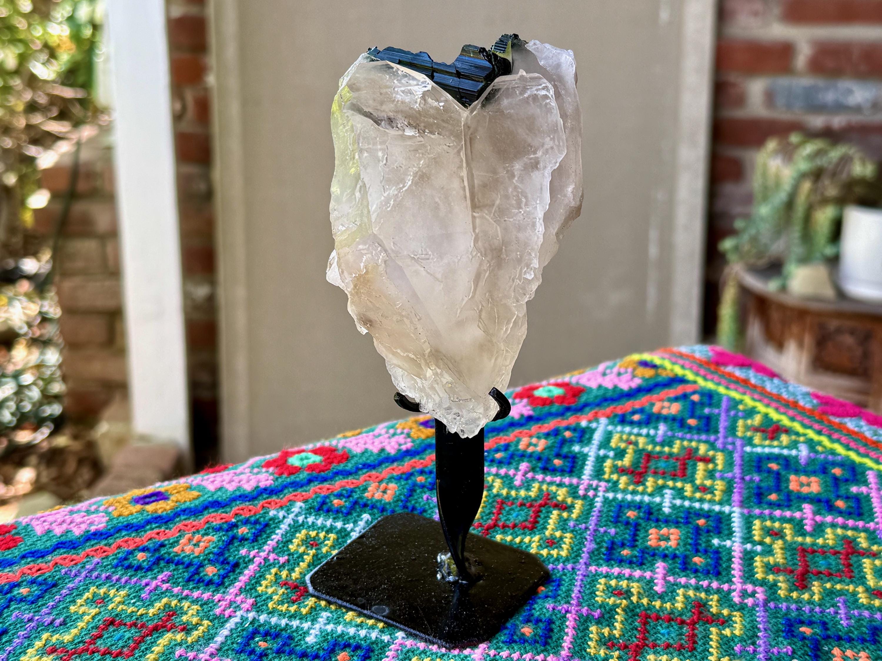 This crystal comes with its own custom stand (Photo 9), which was designed to display the crystal upside down, showing off the Green Tourmaline. However, this crystal possesses a naturally flat base so it will sit upright (the "right way") on its own if you wish.
