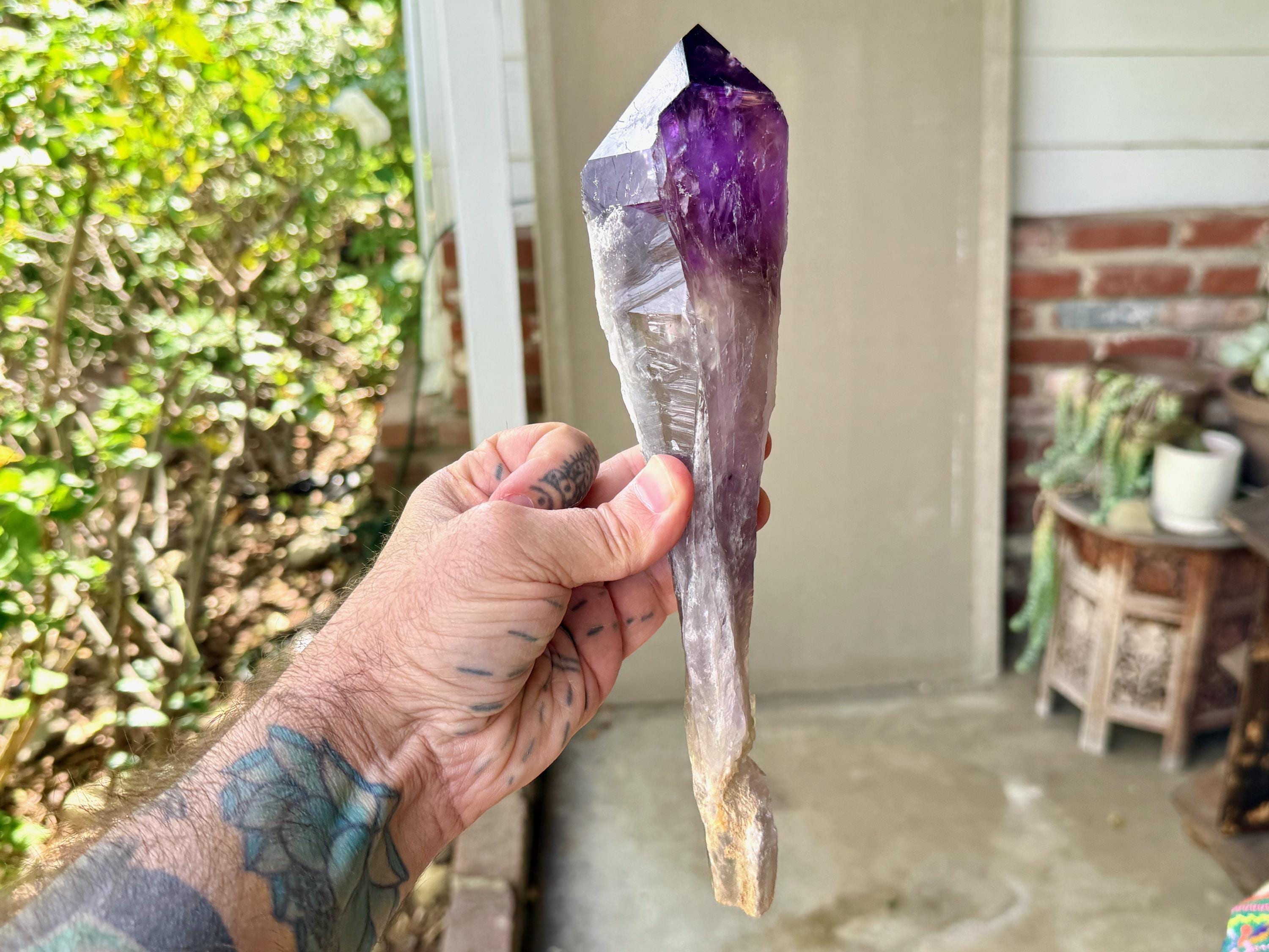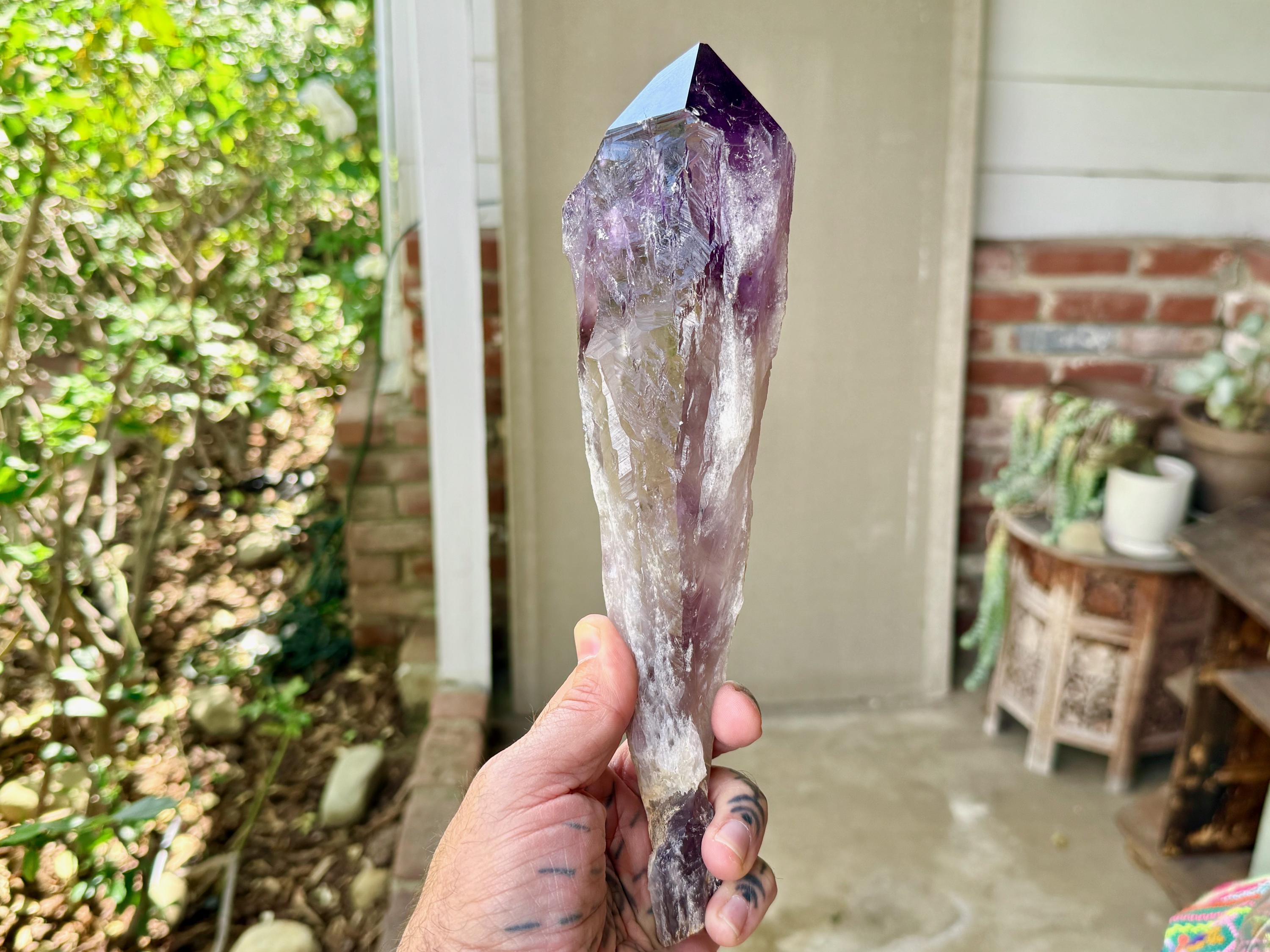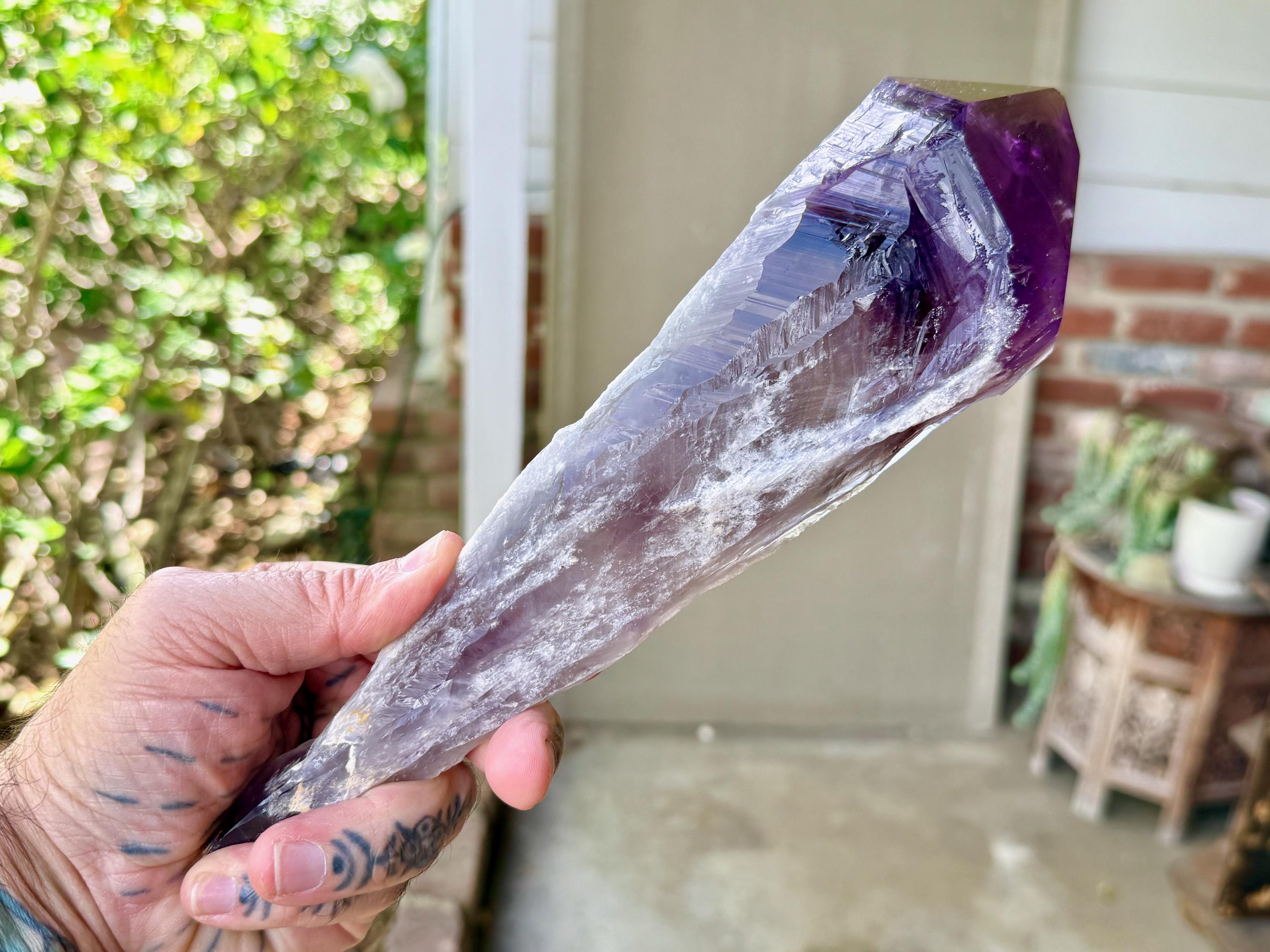 So massive and so beautiful, this Dragon's Tooth Amethyst is one of the largest pieces from this collection, standing 11" (28 cm) tall and weighing nearly 2 pounds (846g), with striking elongated formation. It possesses a deep purple color and lovely clarity in the main facet area, and when we backlight it as we've done in Photos 4-6, we can really see this color take on a whole new level of beauty.