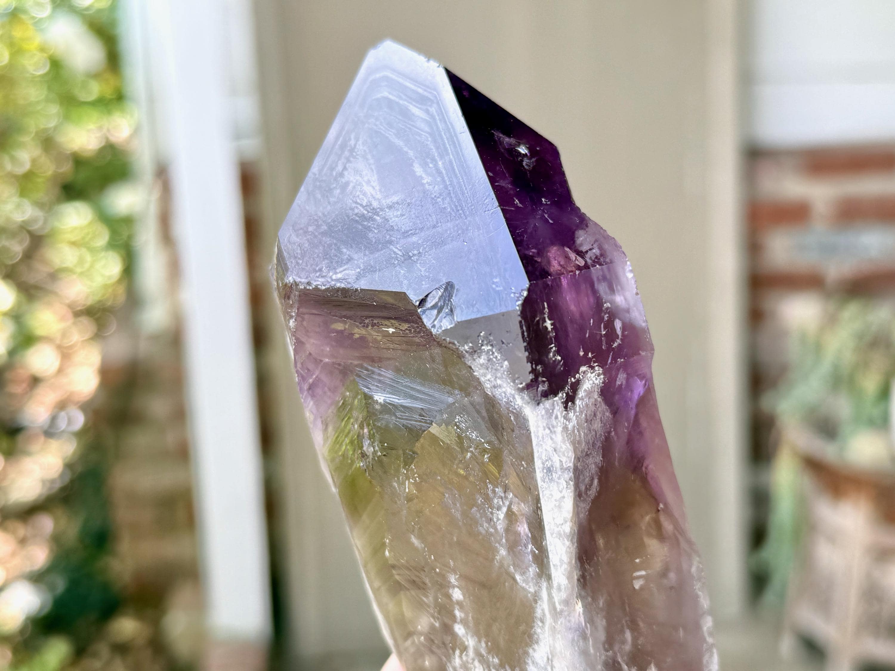 The Amethyst portion extends to about 1/3 of the way down, and then the "handle" or "root" turns into a smoky quartz with lovely textural etchings throughout.