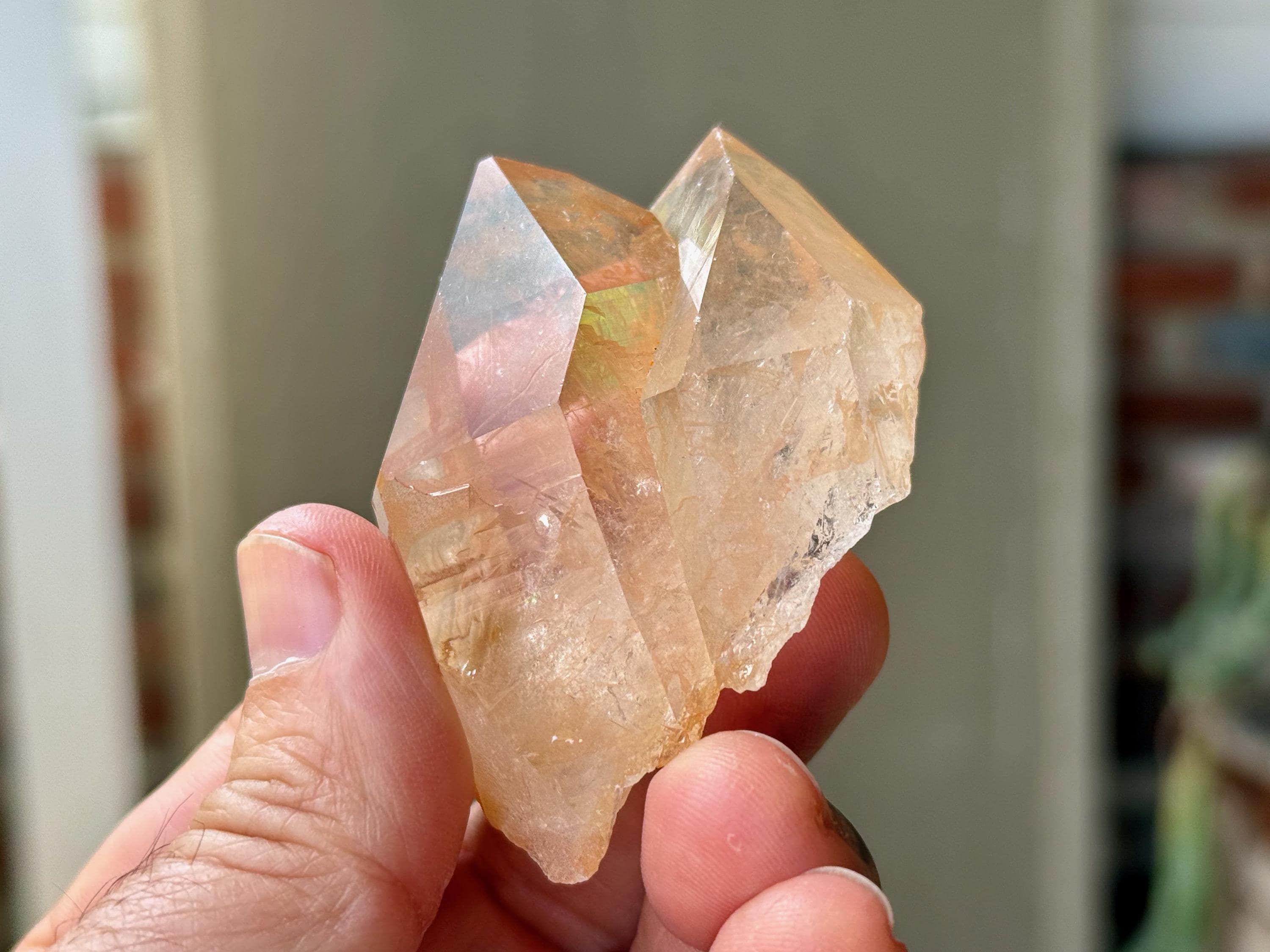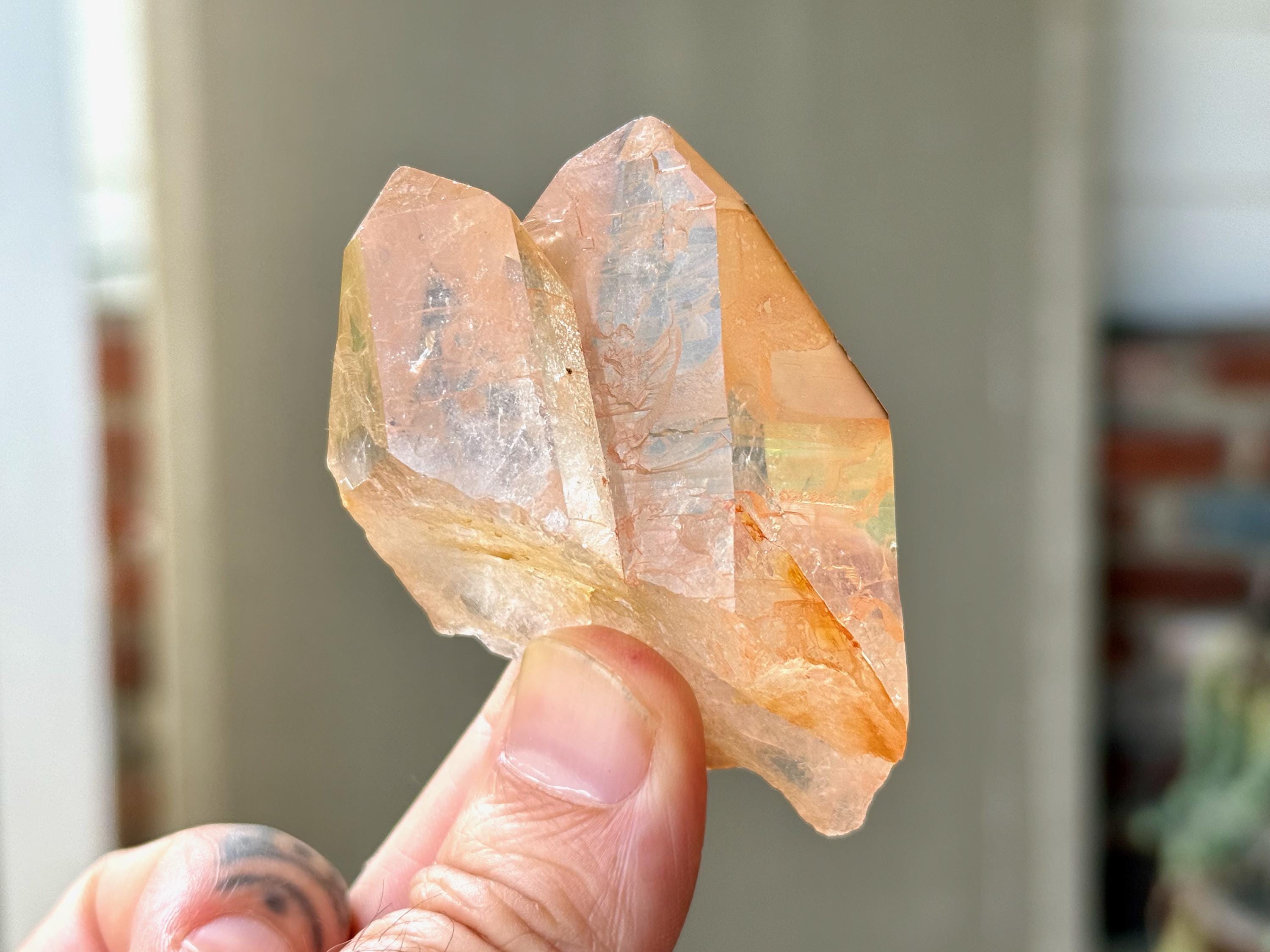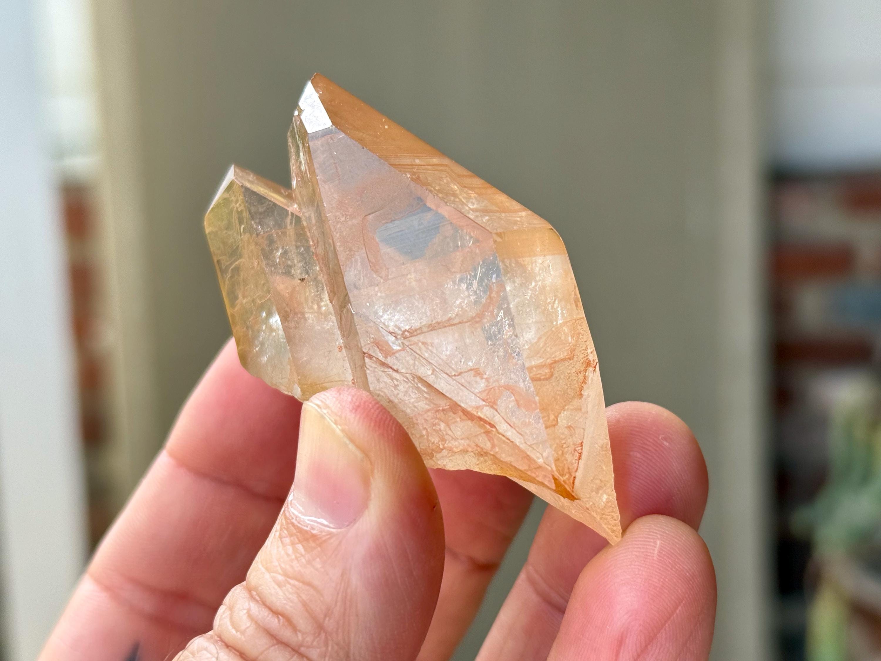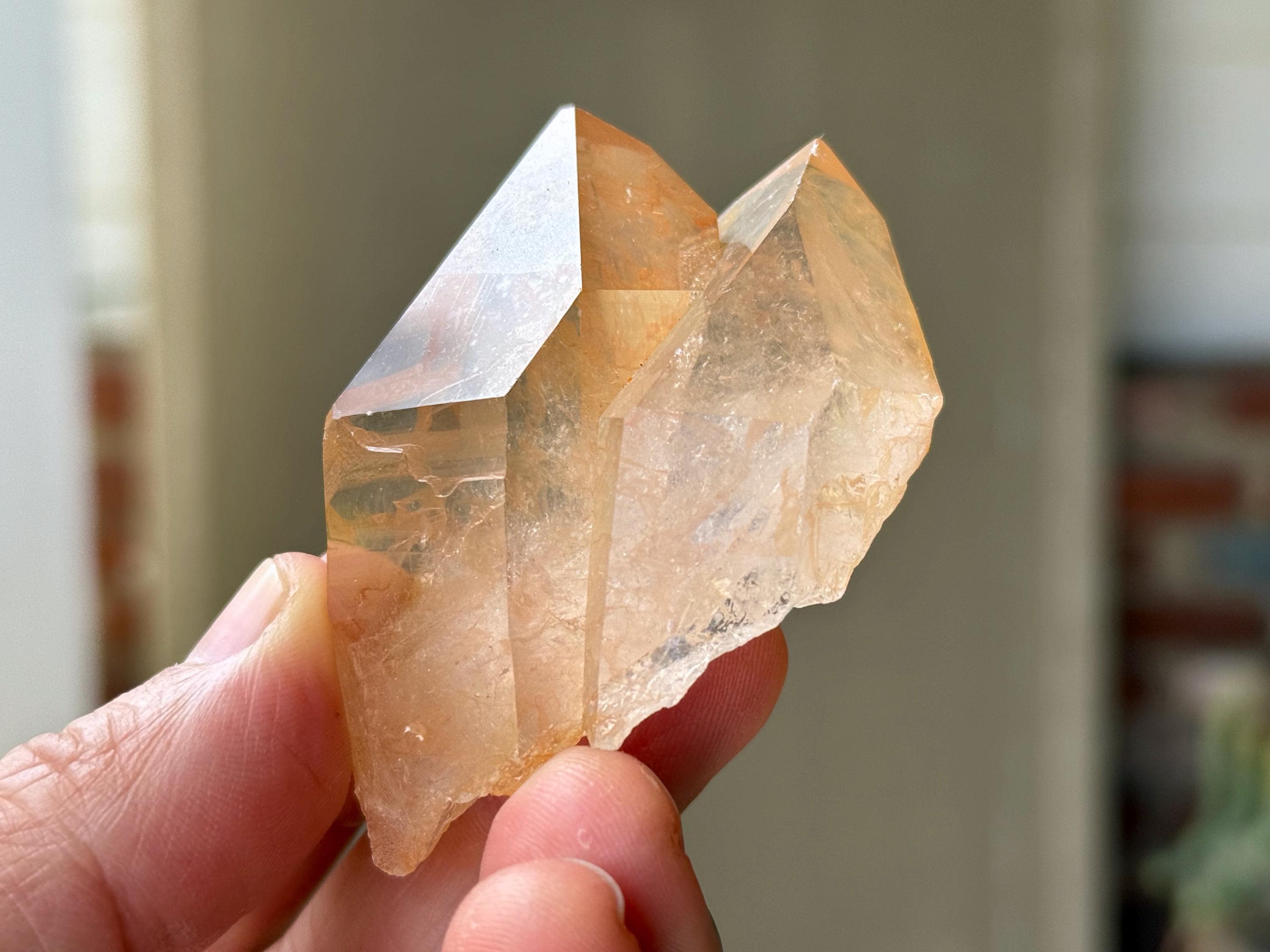 Water-clear clarity and a mild pinkish-orange hue to this lustrous Tangerose Quartz crystal. This piece features a Tantric Twin formation, with two crystals growing side by side. The flat base allows this crystal to sit nicely for display, and the terminations are excellent.