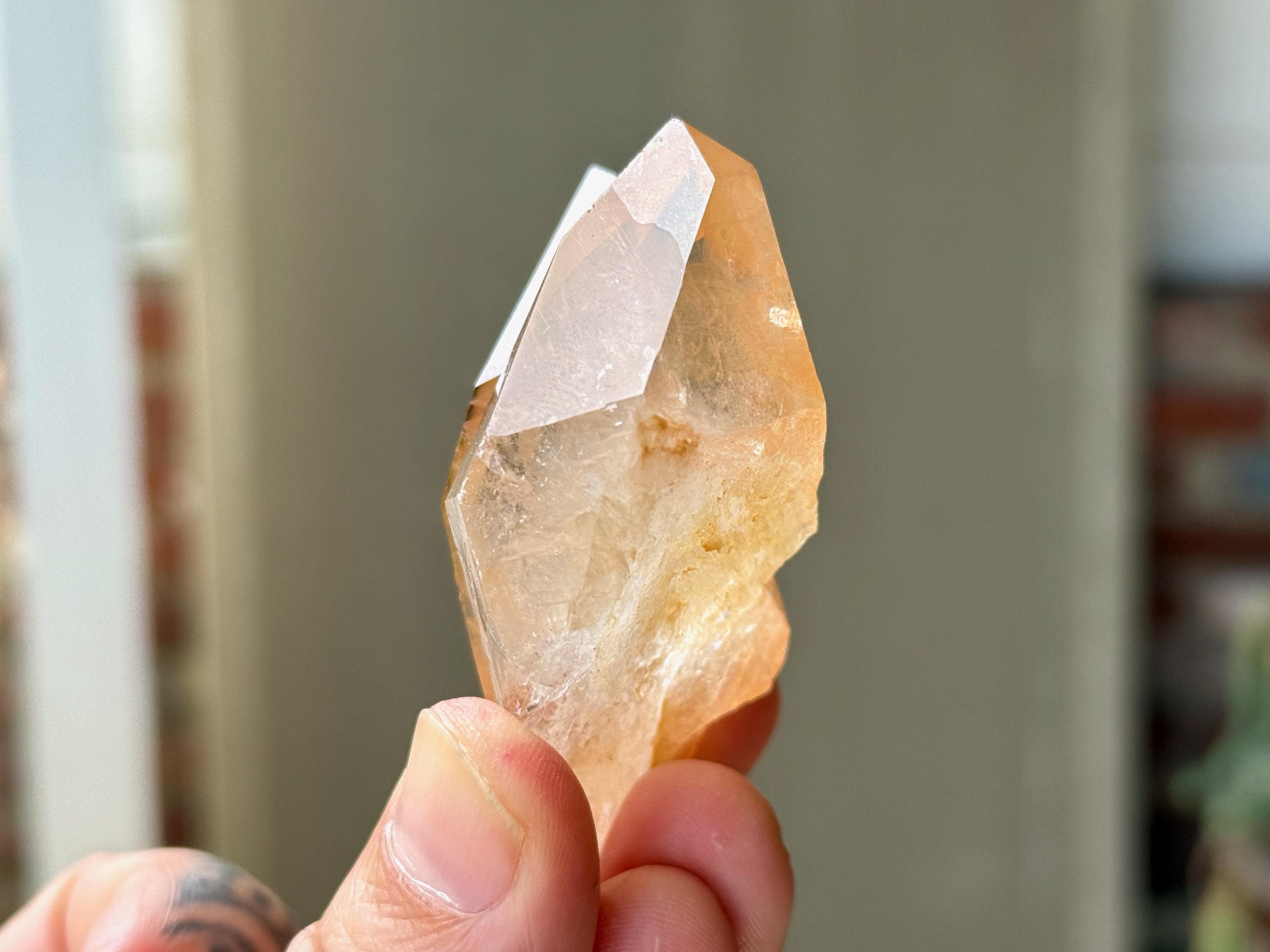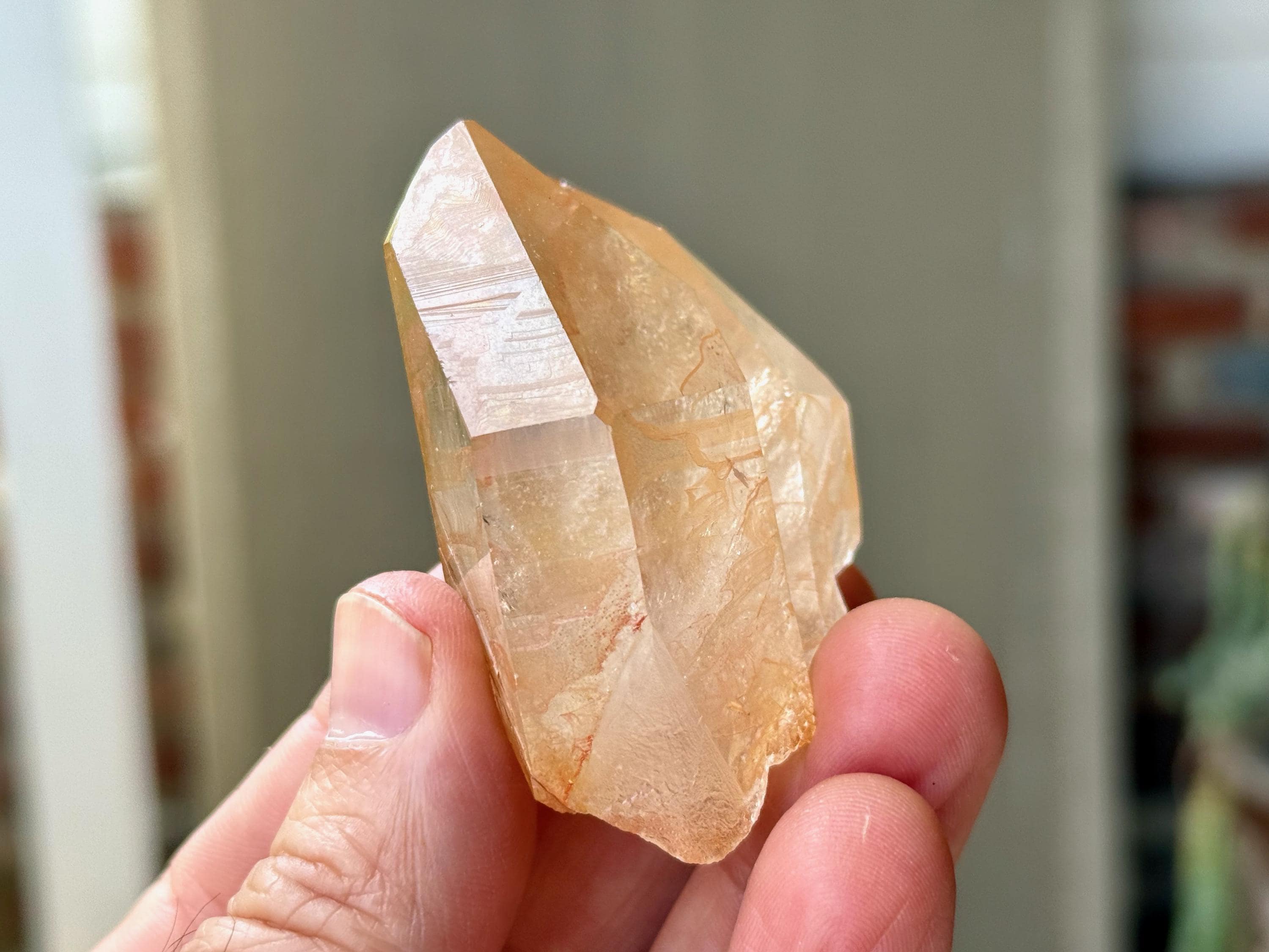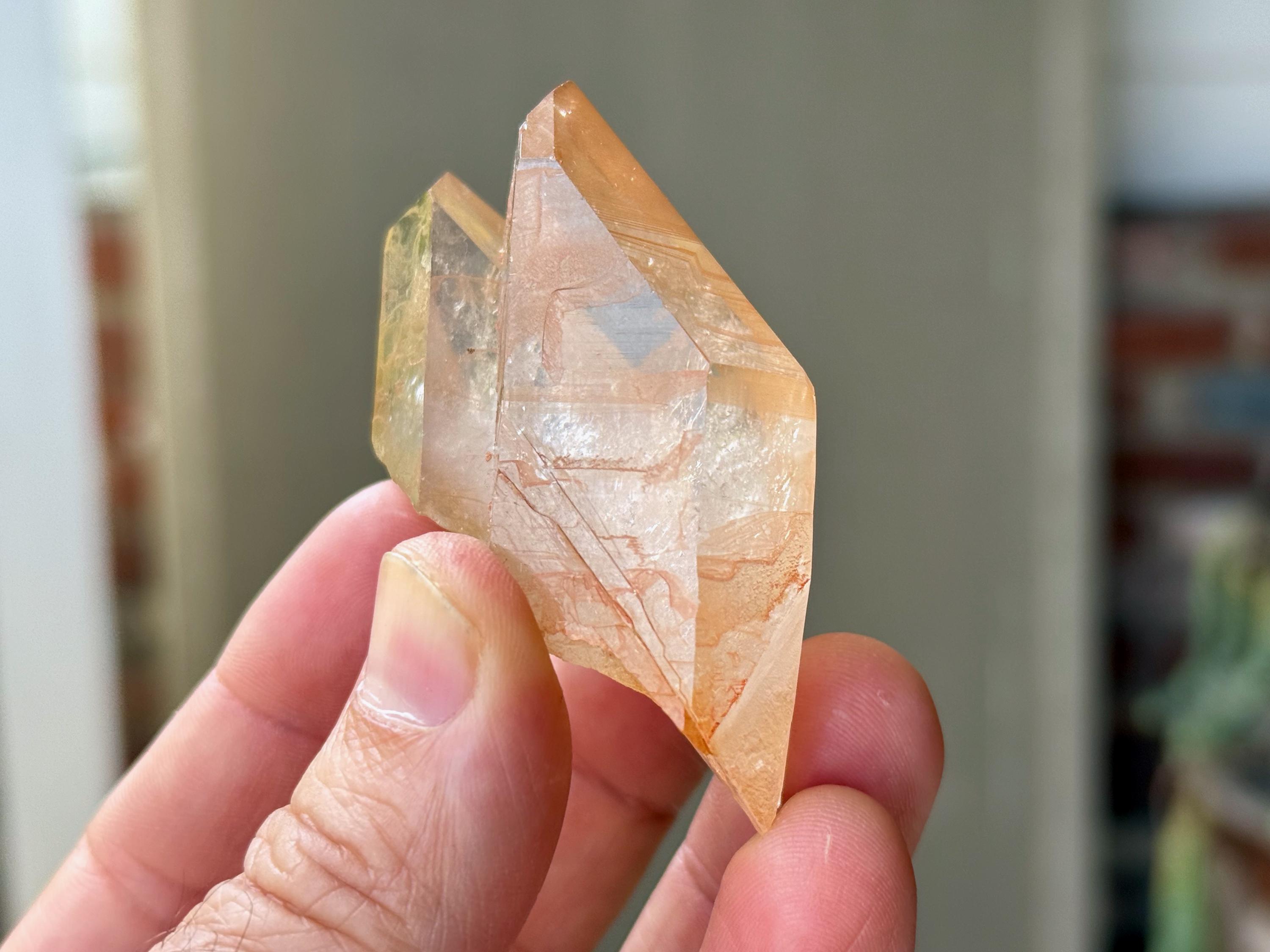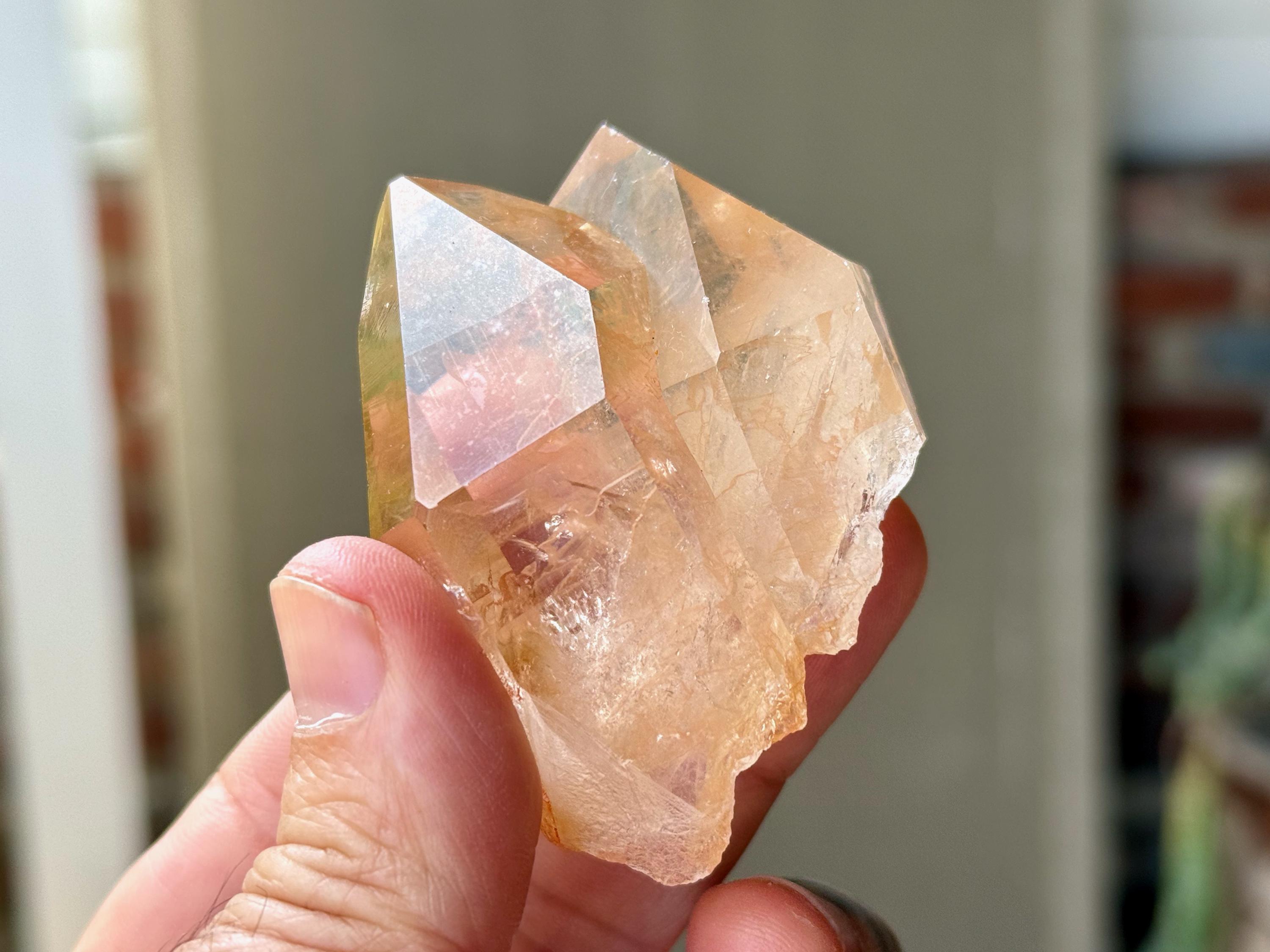 Water-clear clarity and a mild pinkish-orange hue to this lustrous Tangerose Quartz crystal. This piece features a Tantric Twin formation, with two crystals growing side by side. The flat base allows this crystal to sit nicely for display, and the terminations are excellent.