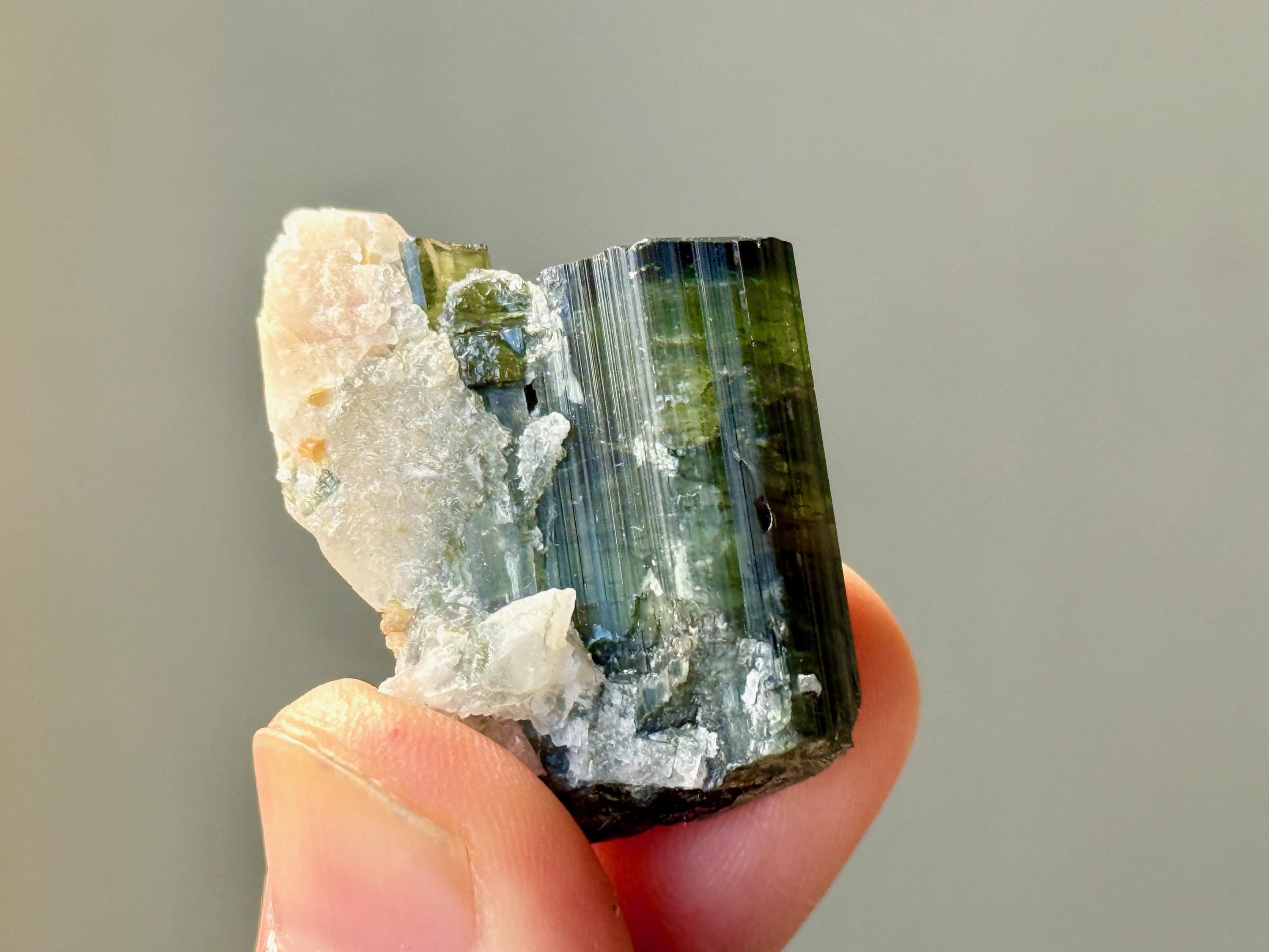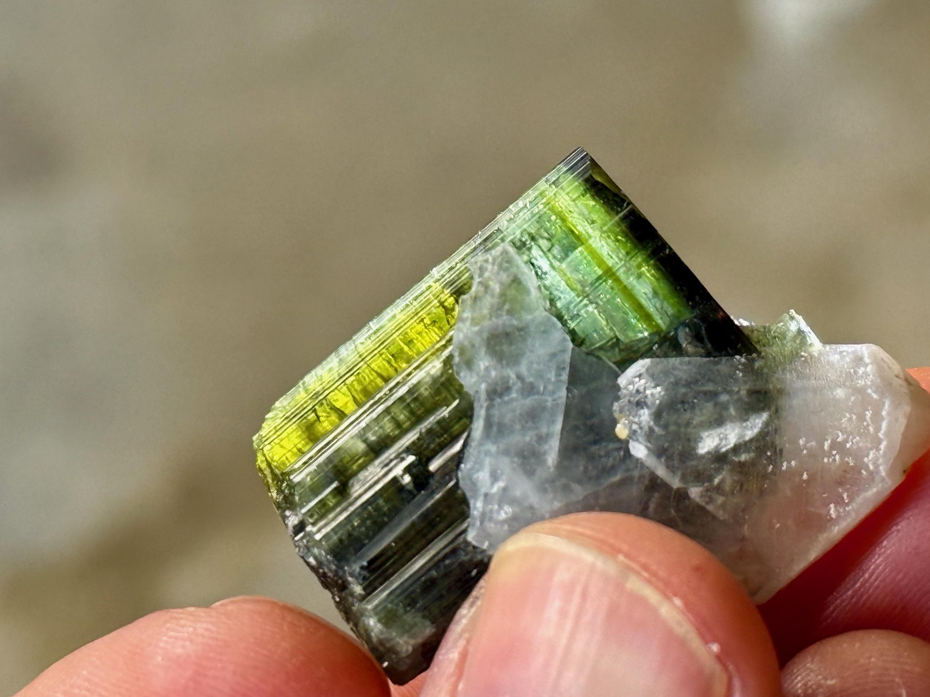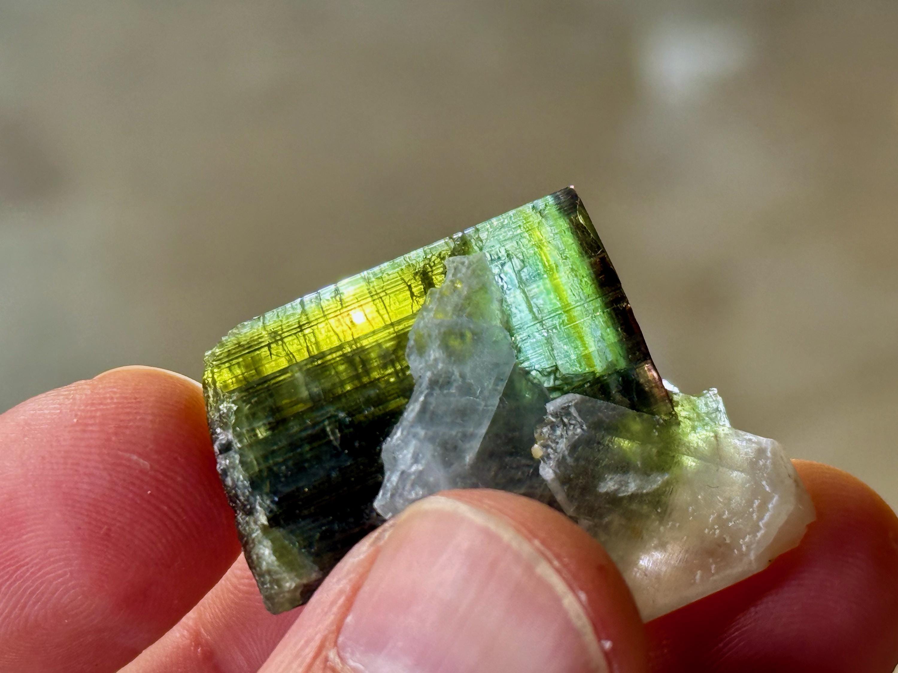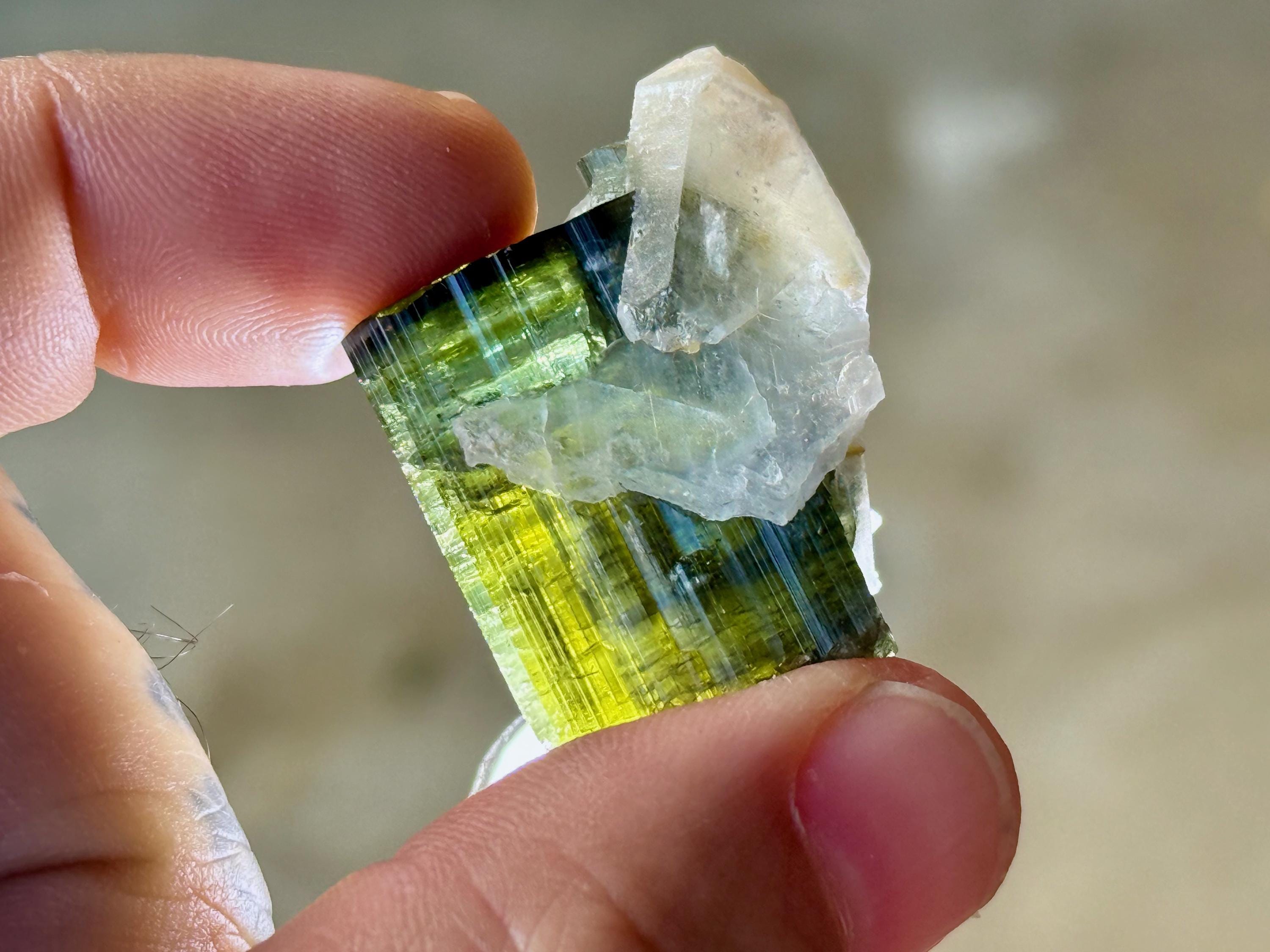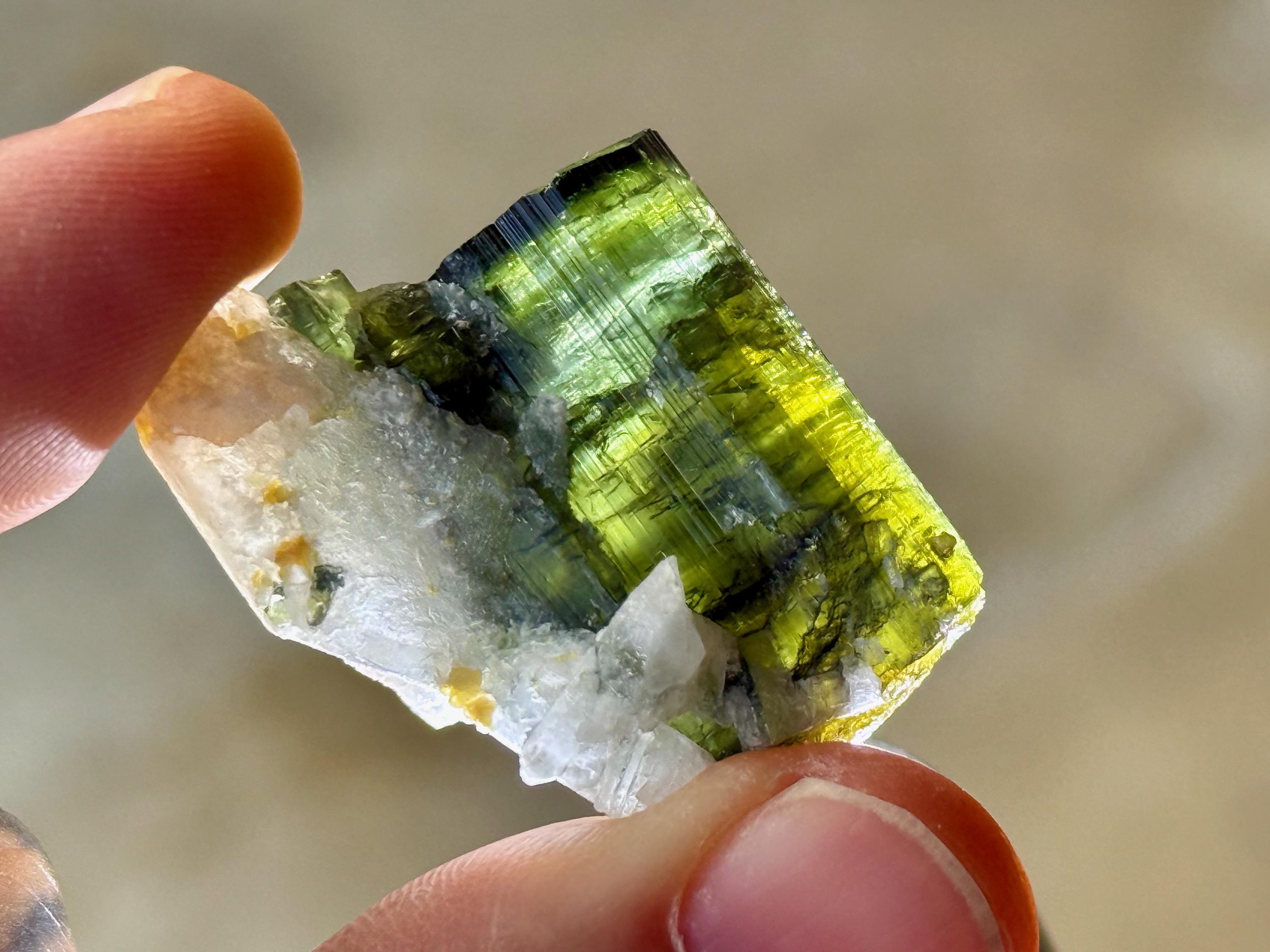 This vibrant Tricolor Tourmaline comes from a new (2025) find in Coronel Murta, Minas Gerais, Brazil. This crystal is all-natural and possesses banded colors of Yellow, Blue and Green.