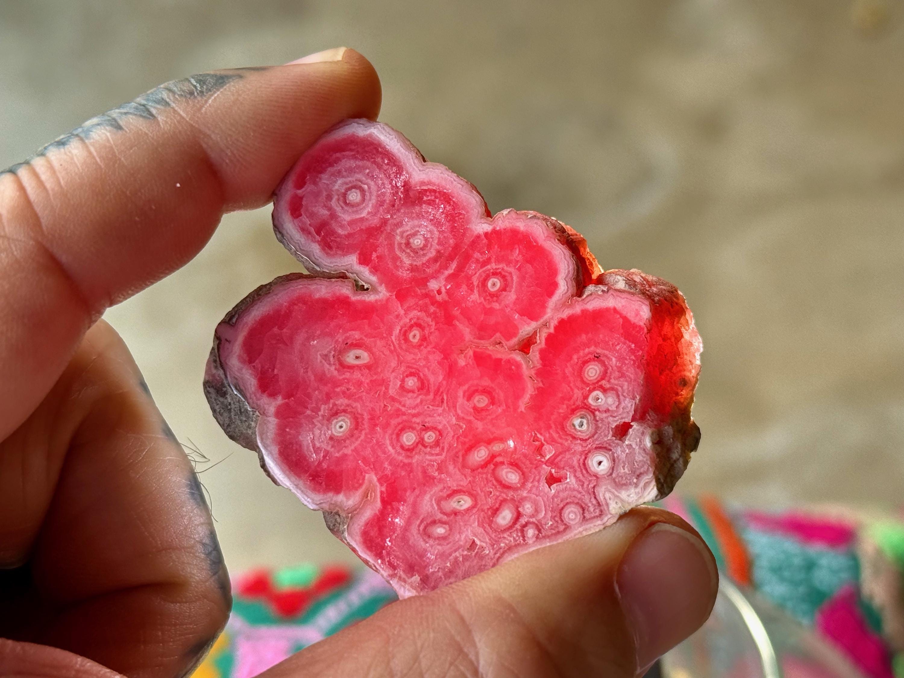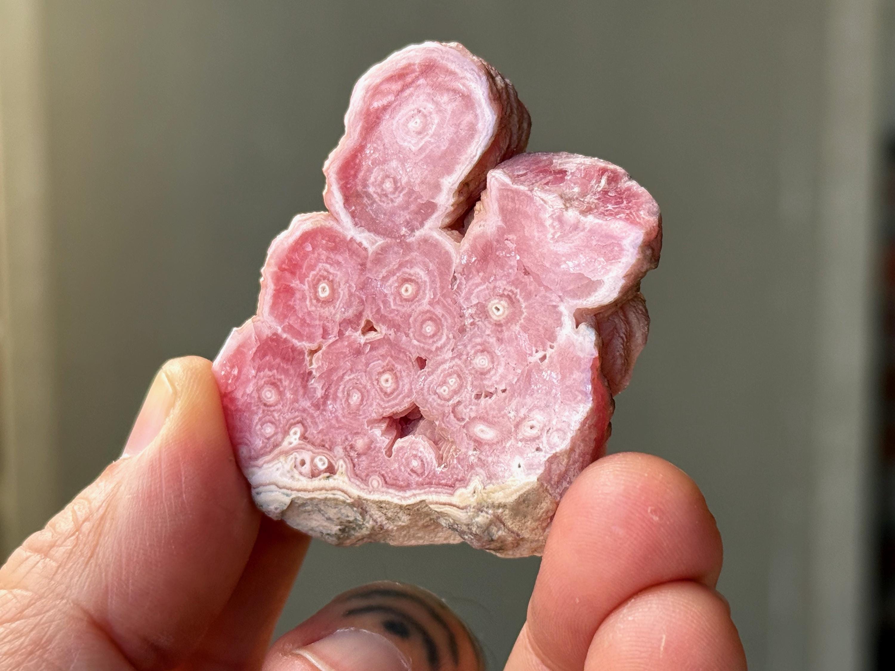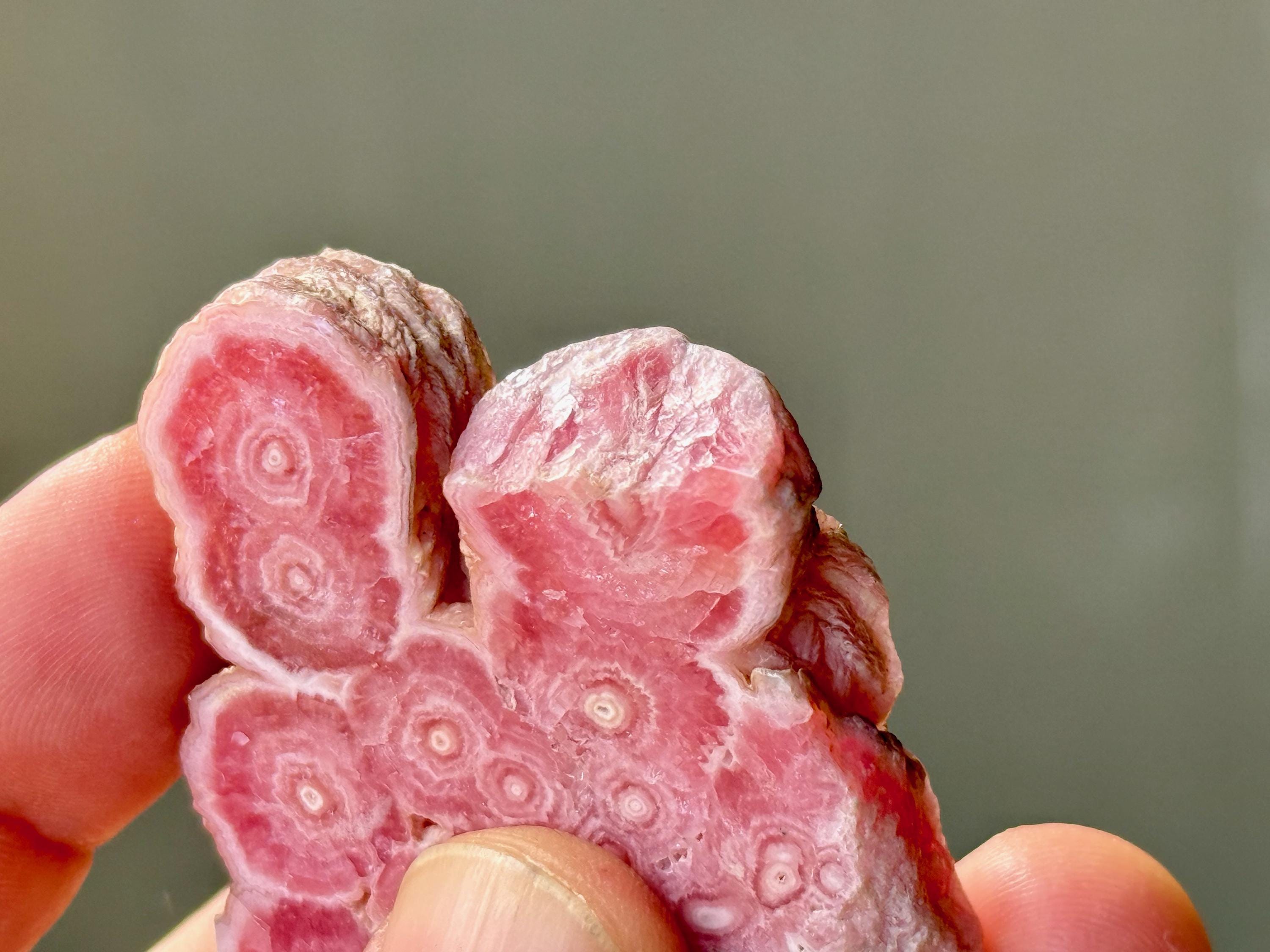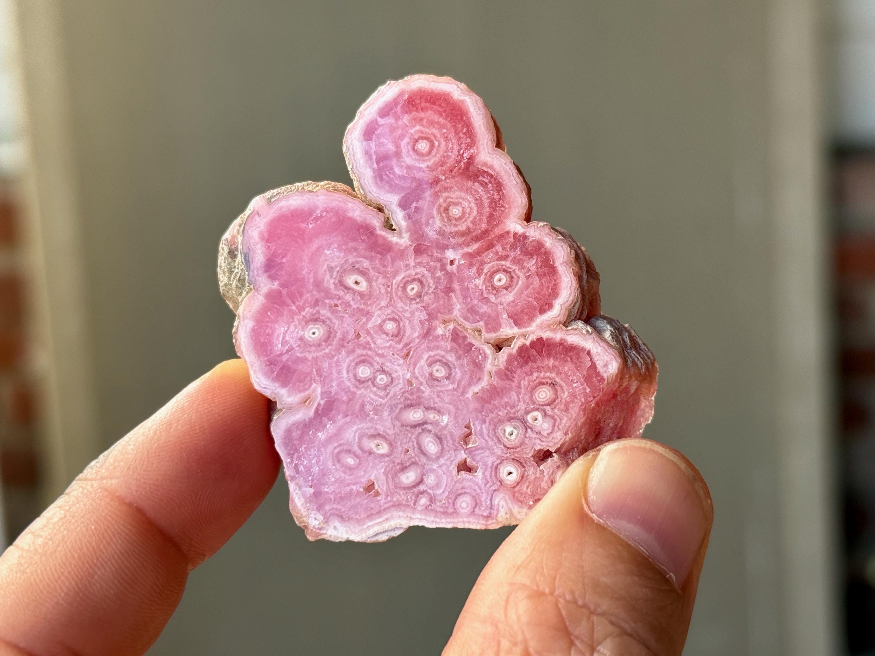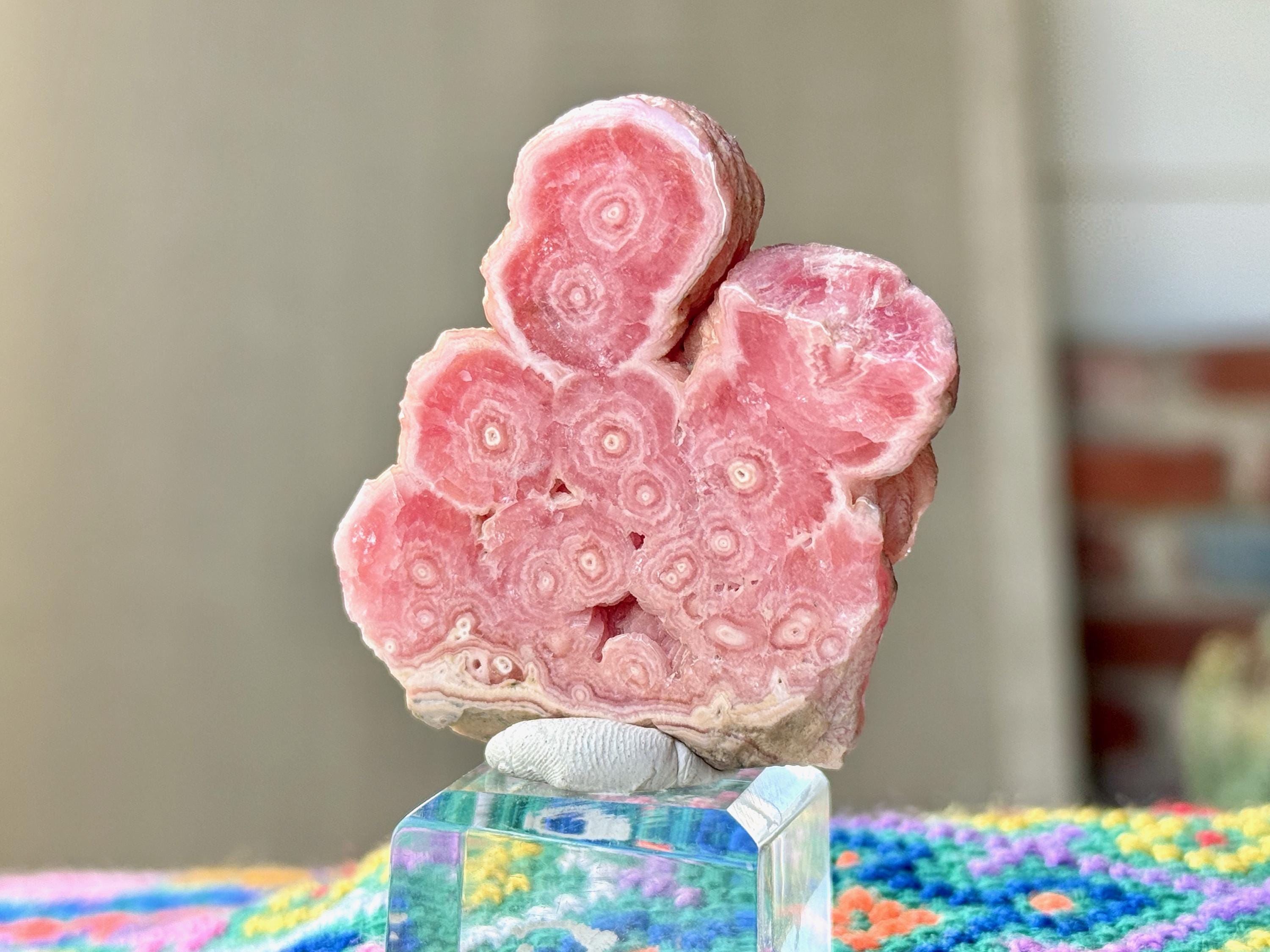 Gorgeous circular patterning to this superb Rhodochrosite Stalactite slice with a bubble-gum pink color and wonderful formation. This crystal has been polished on both the front and back, but the edges have been left natural. We love that the patterning is consistent on both sides!