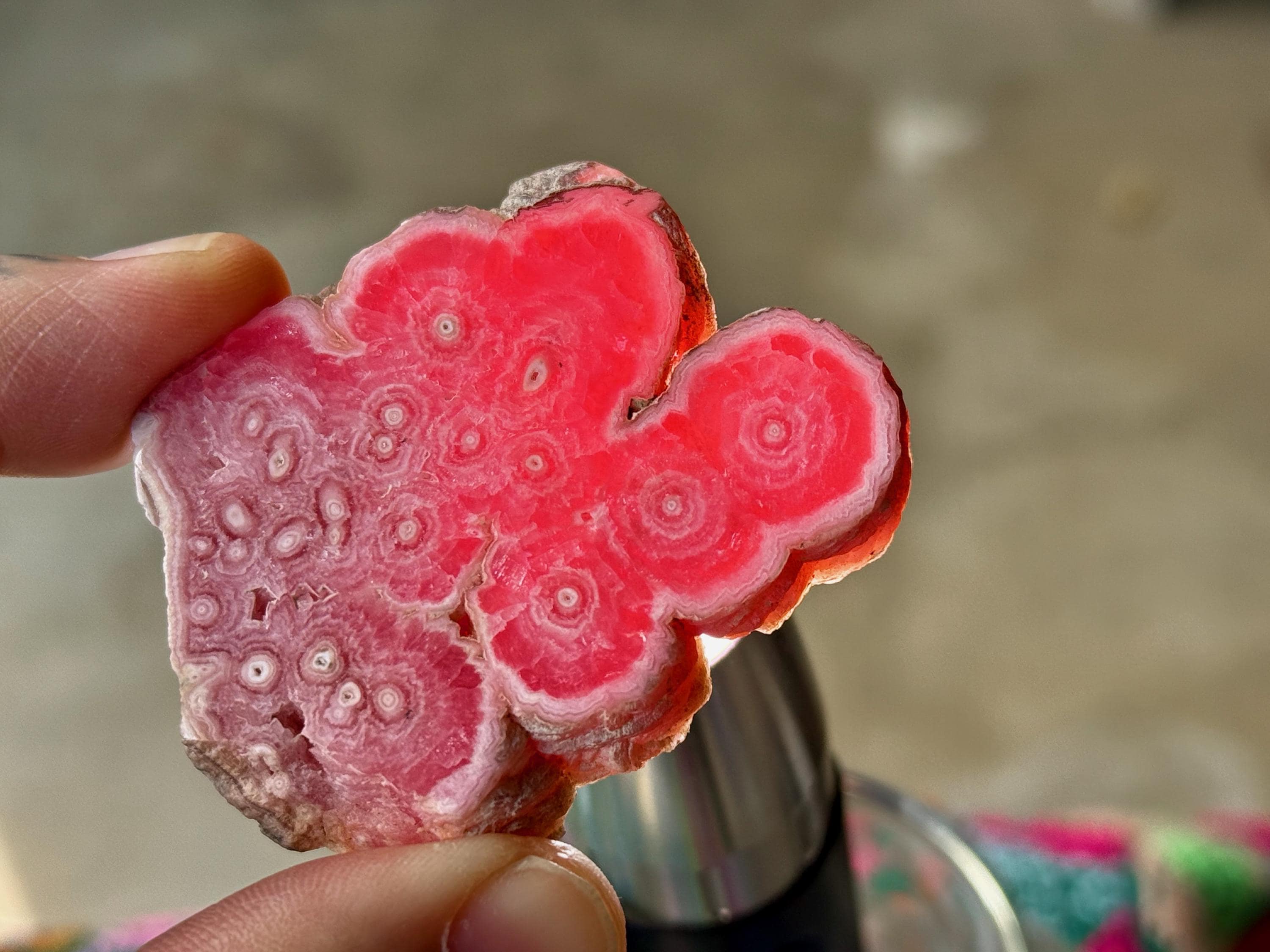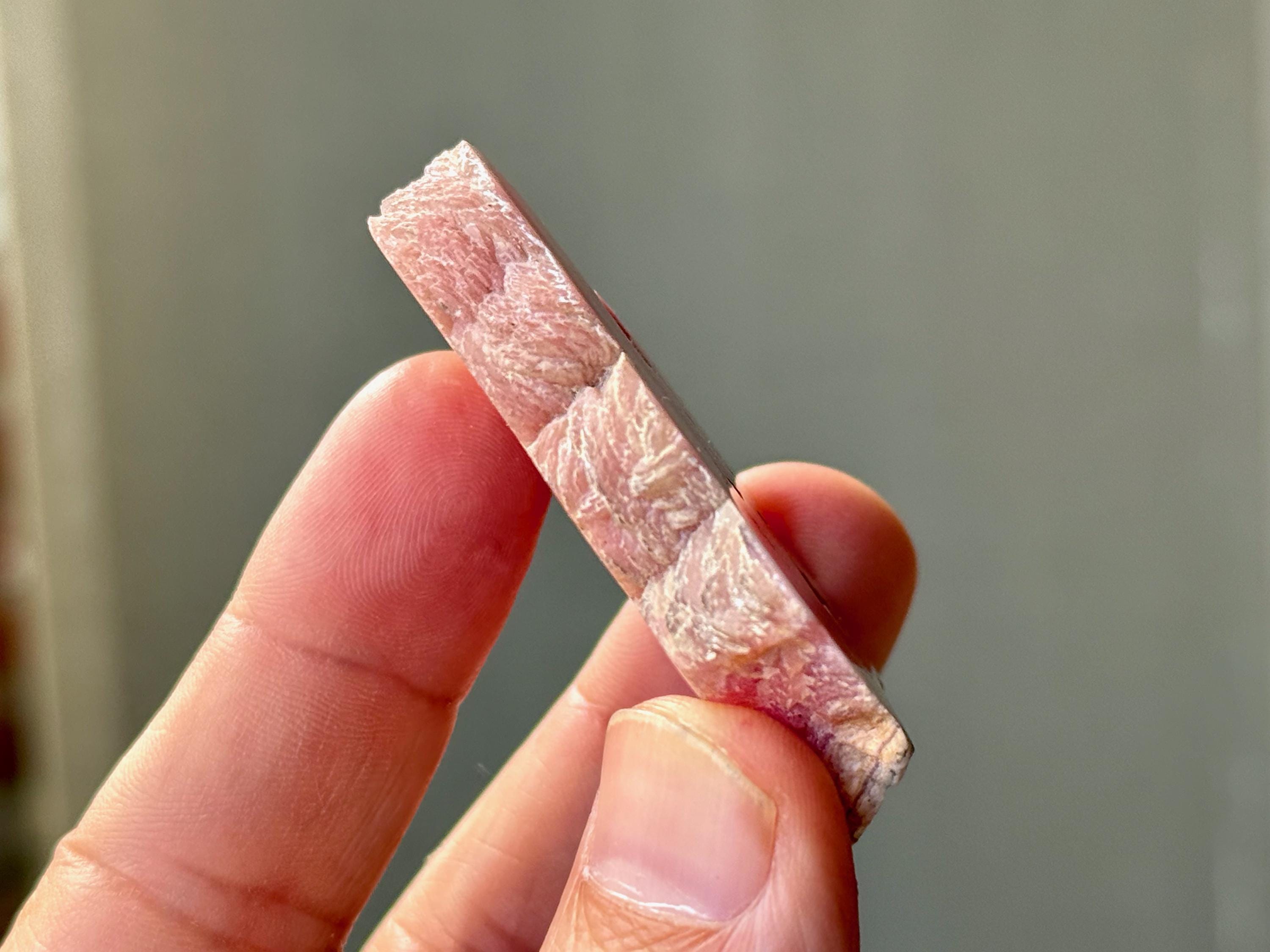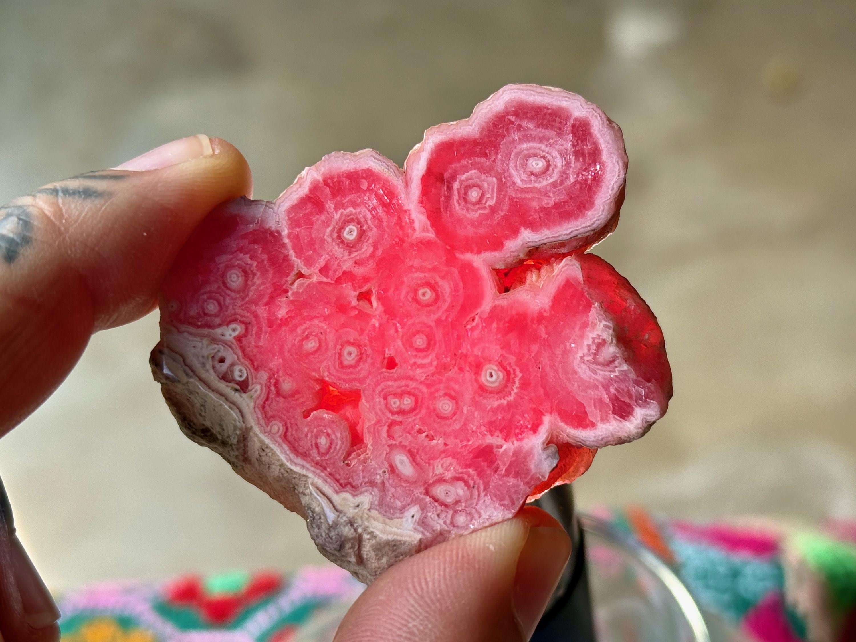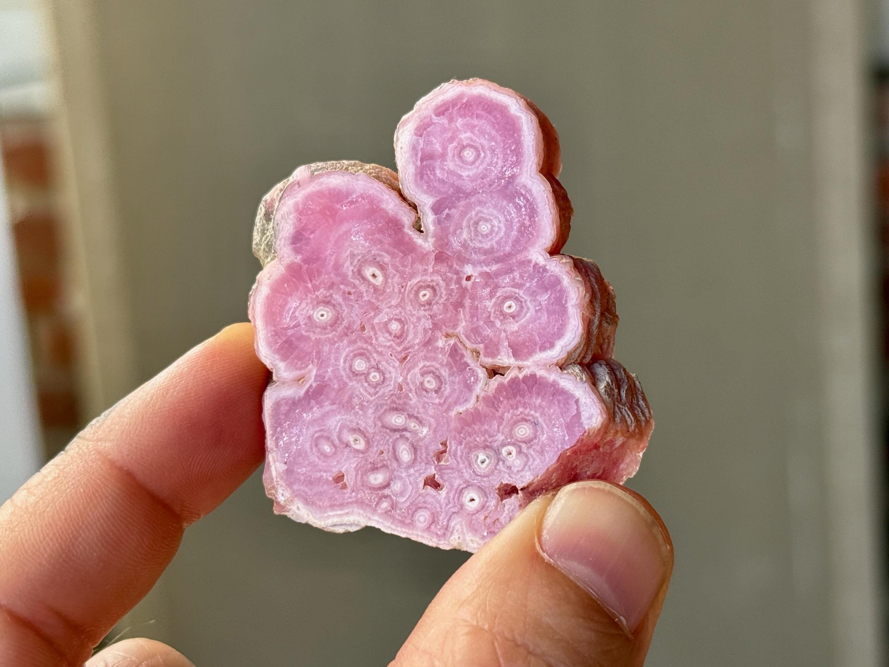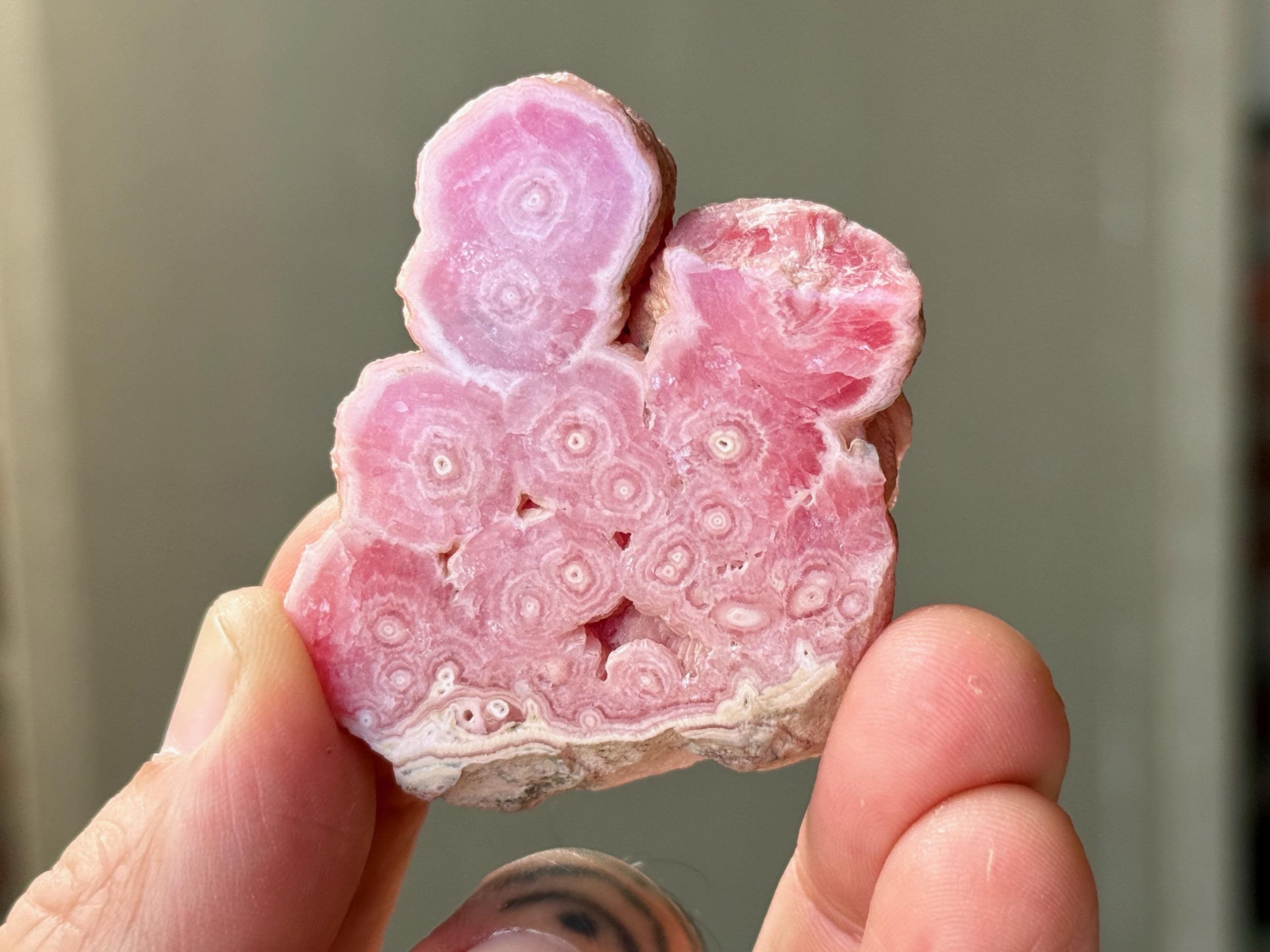 Gorgeous circular patterning to this superb Rhodochrosite Stalactite slice with a bubble-gum pink color and wonderful formation. This crystal has been polished on both the front and back, but the edges have been left natural. We love that the patterning is consistent on both sides!