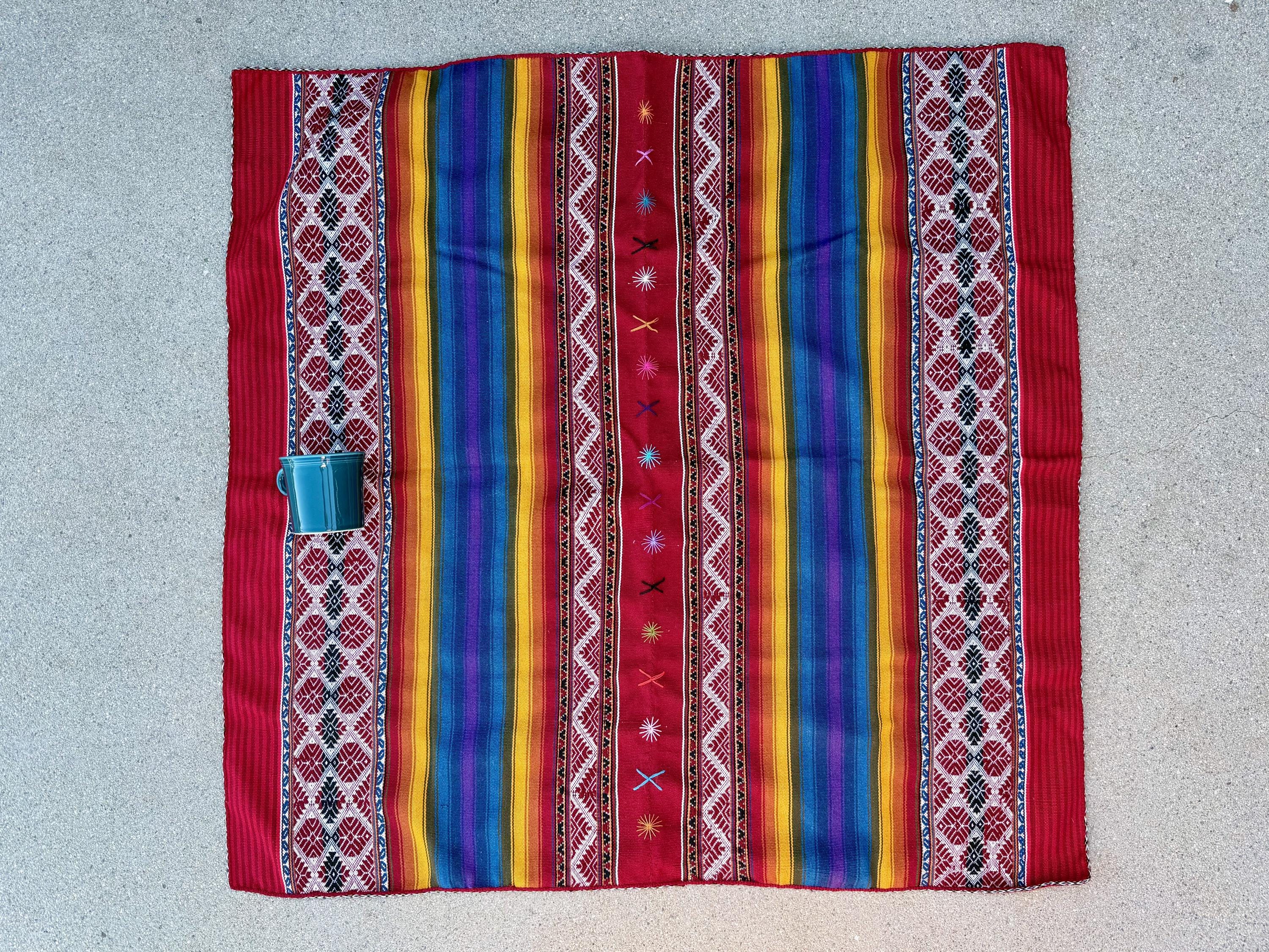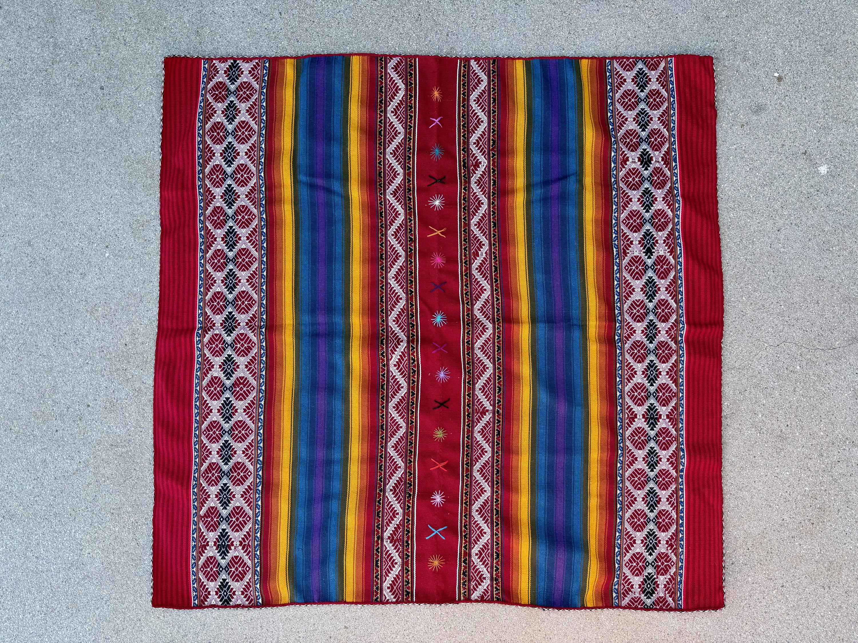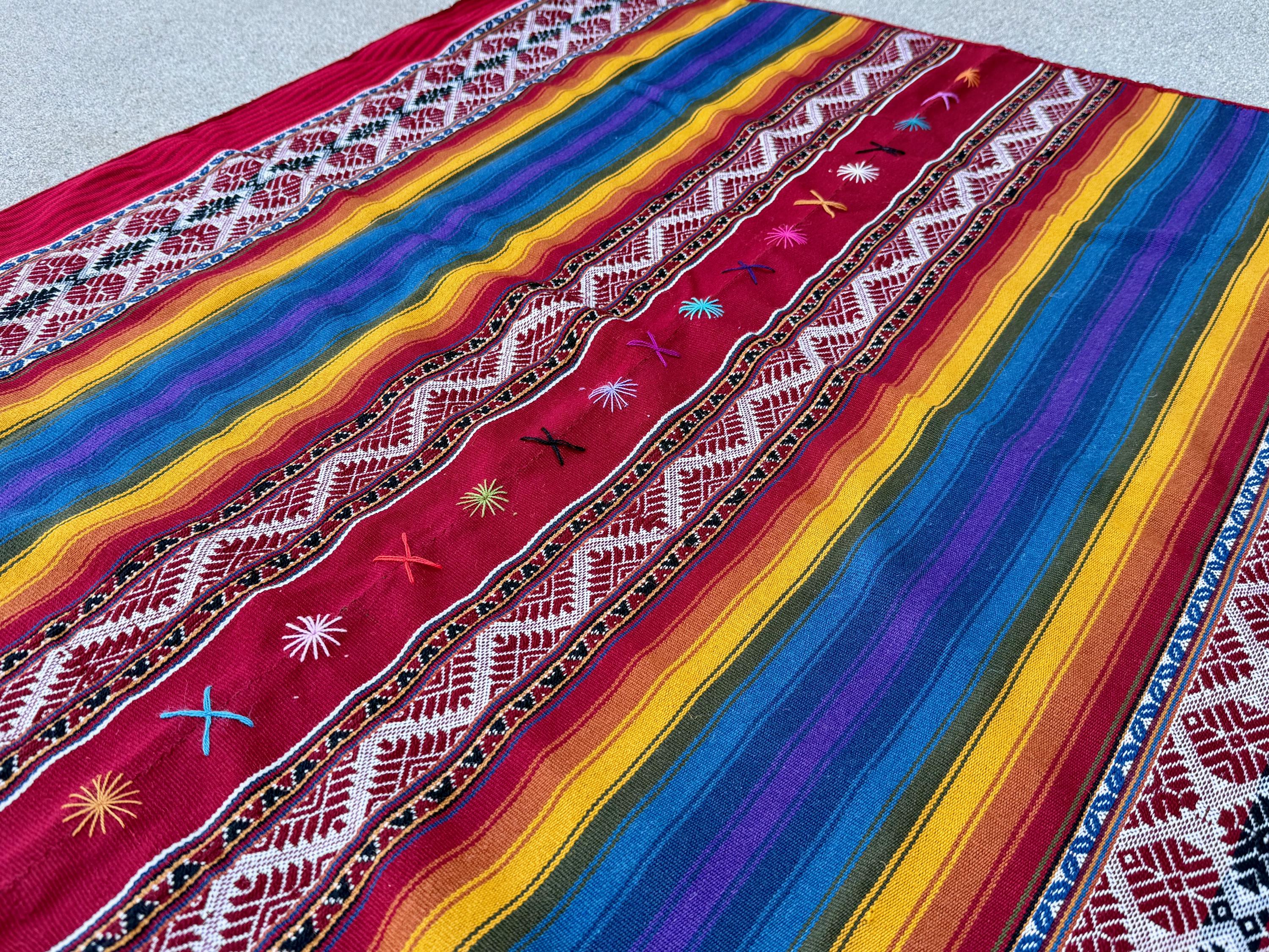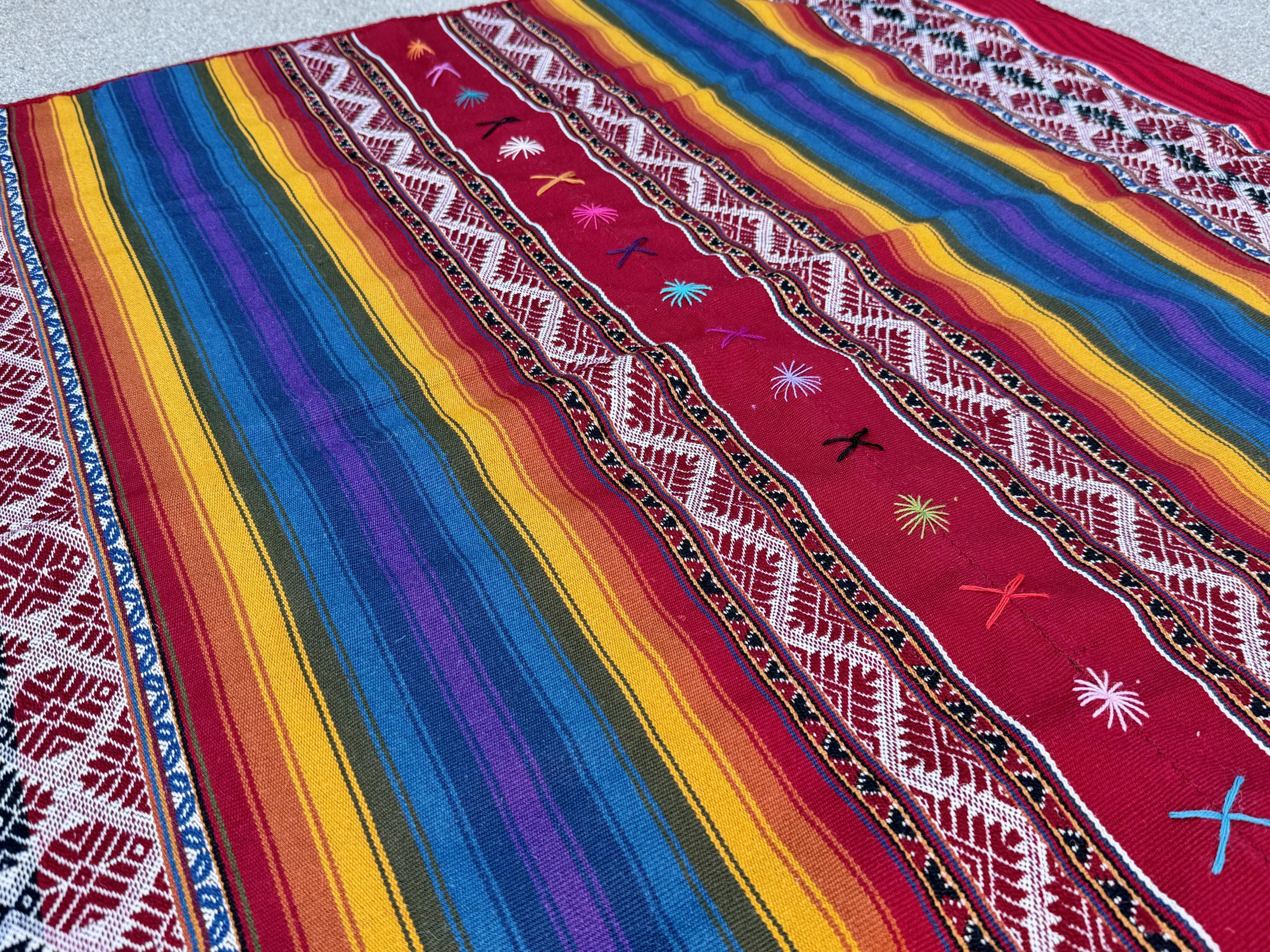 Vibrant colors and traditional patterns and symbols adorn this stunning manta from Ausungate! This is a larger sized manta than what we normally see from this community and it's magnificent. It is also reversible/double-sided, making it ideal for those who follow shamanic traditions that require "bundling" one's mesa.