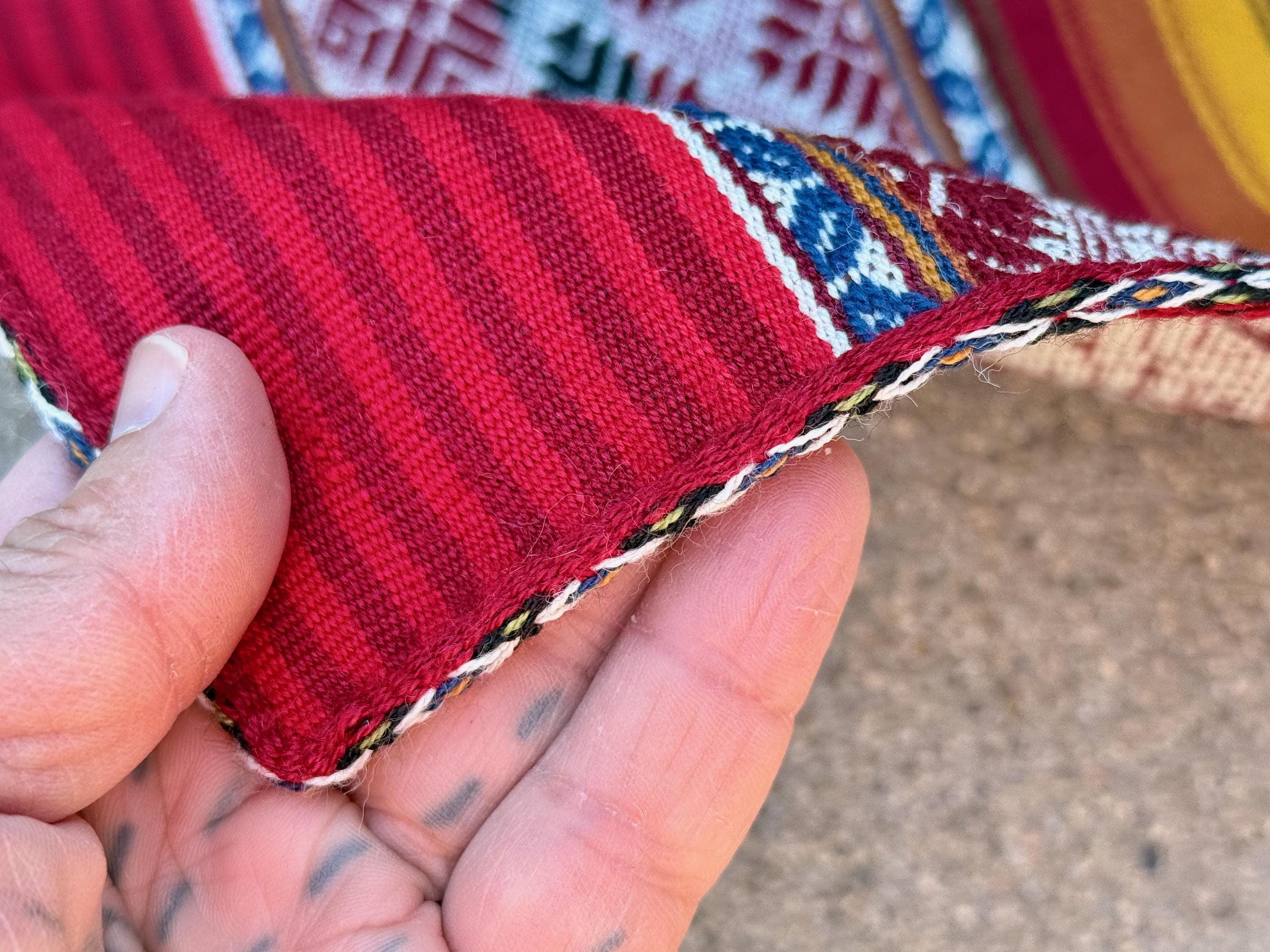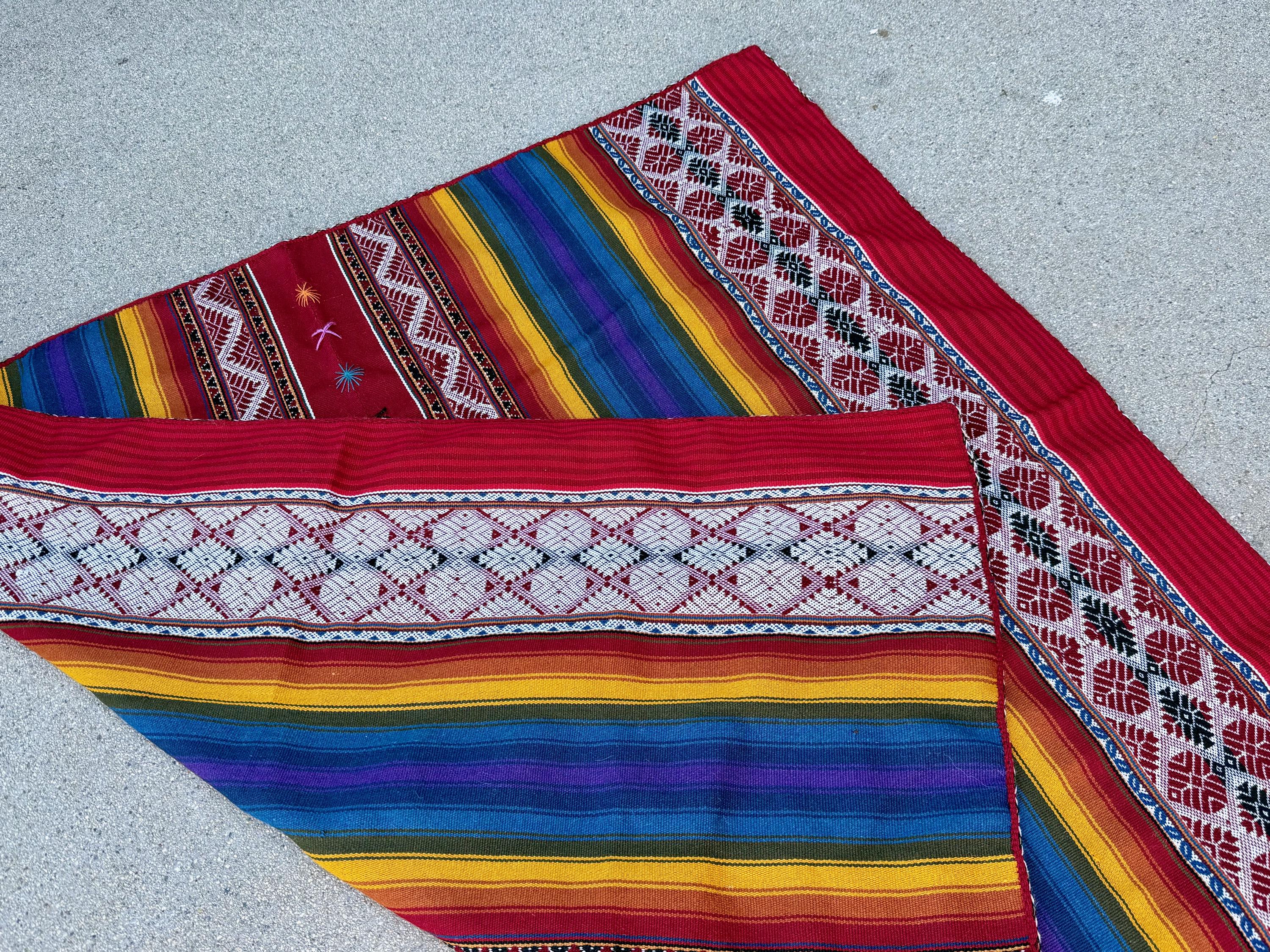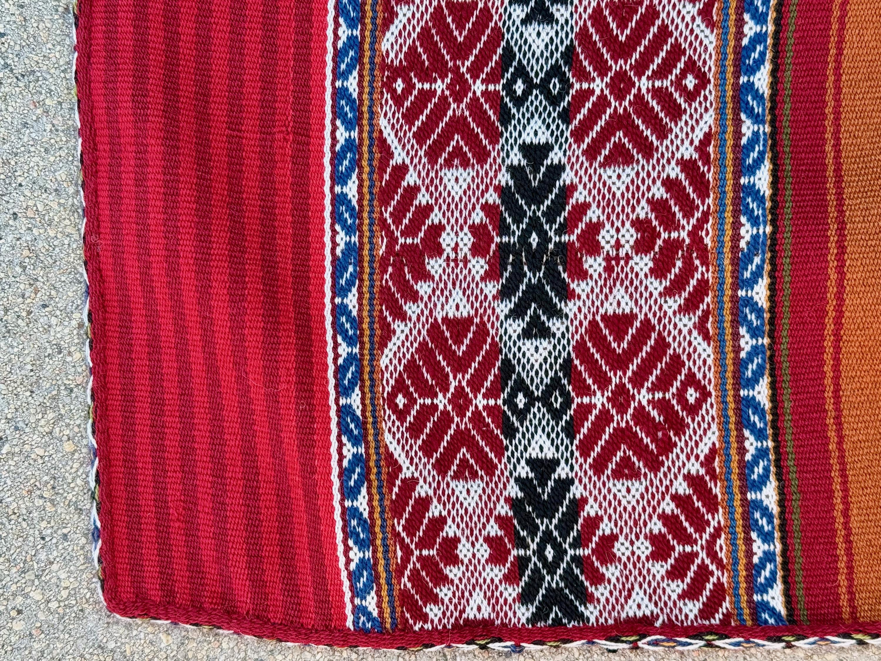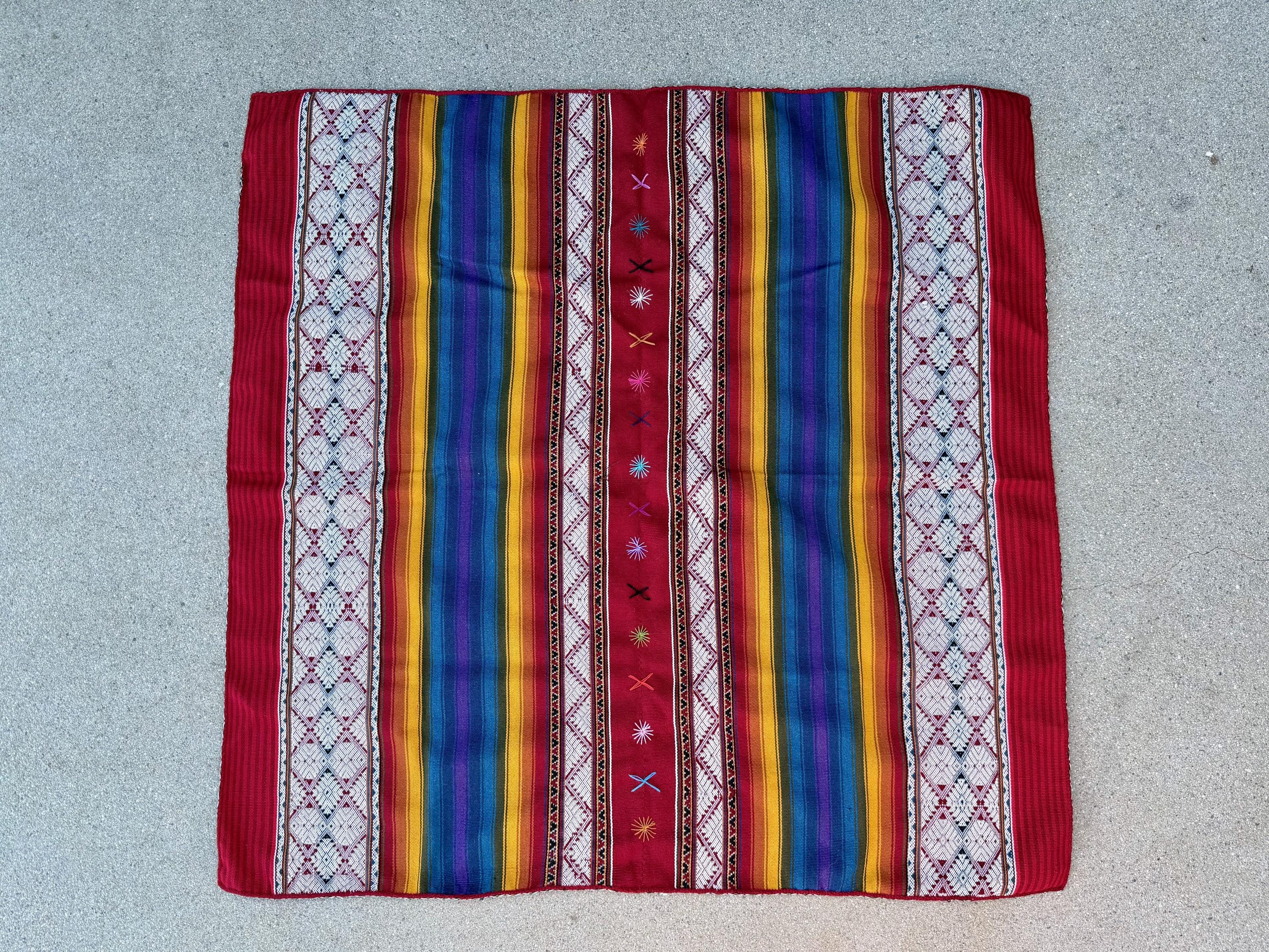 Vibrant colors and traditional patterns and symbols adorn this stunning manta from Ausungate! This is a larger sized manta than what we normally see from this community and it's magnificent. It is also reversible/double-sided, making it ideal for those who follow shamanic traditions that require "bundling" one's mesa.