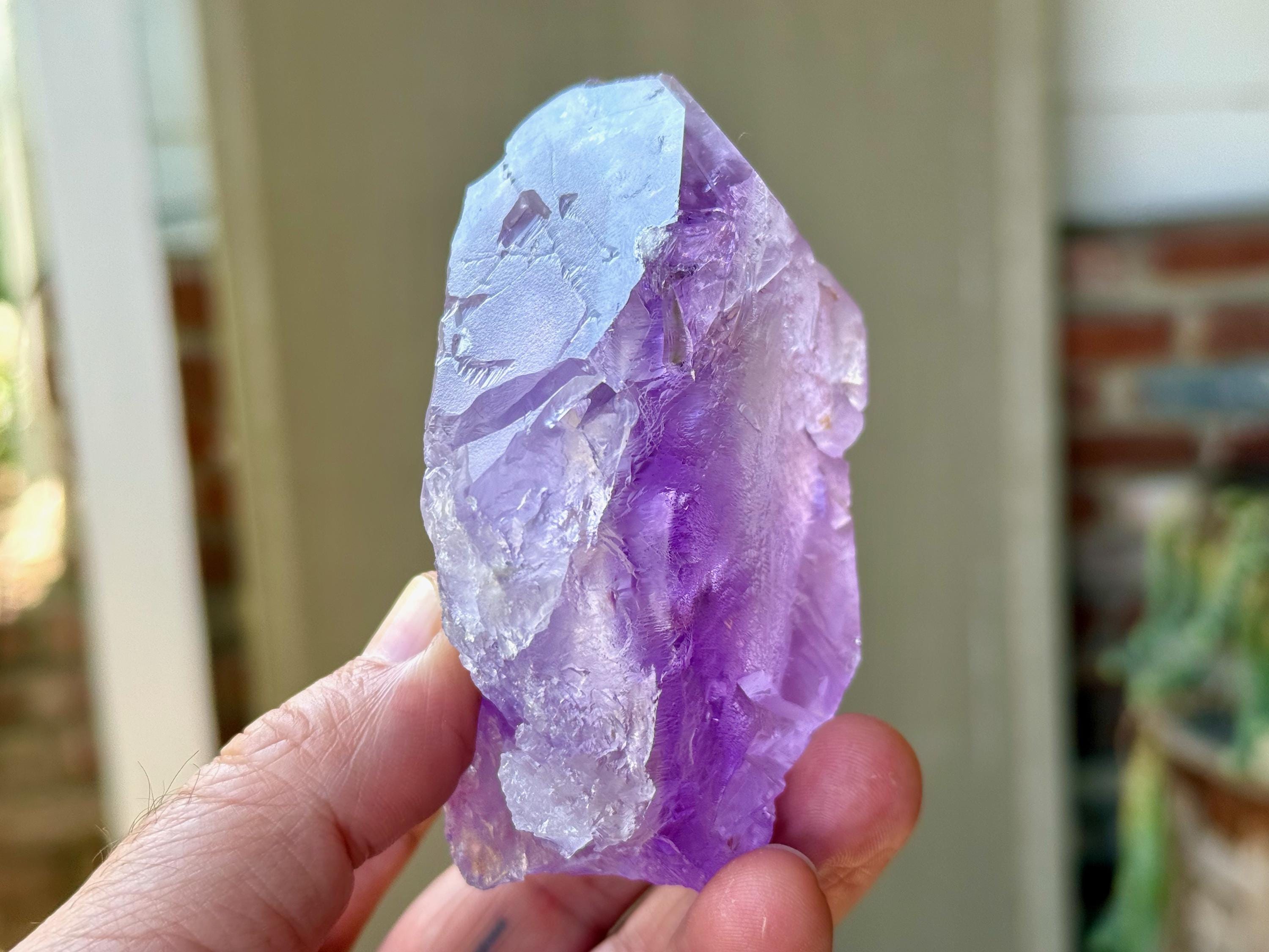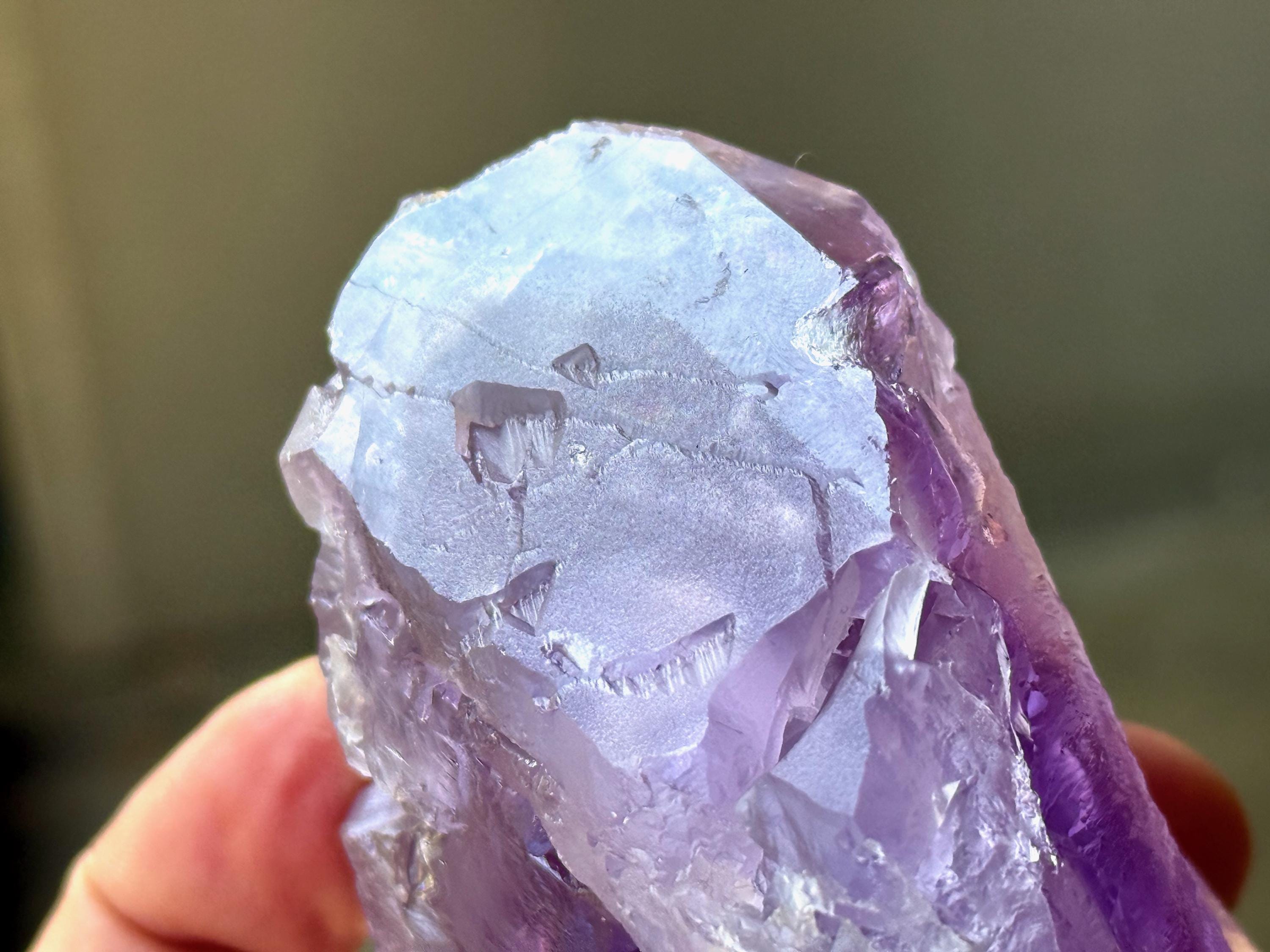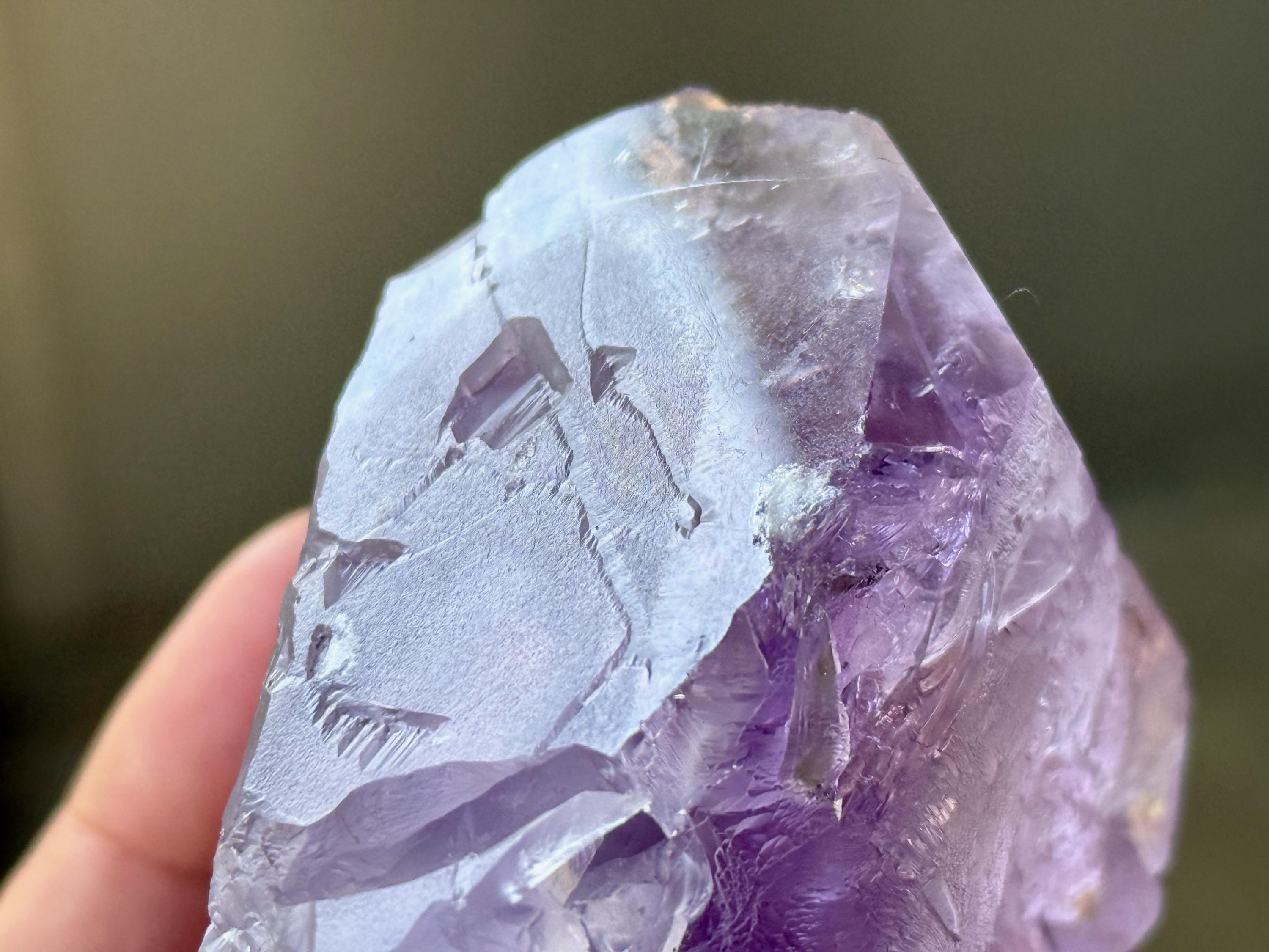 Vibrant purple color to this extraordinary Dissolution Amethyst crystal with multiple trigons imprinted in the main facet!