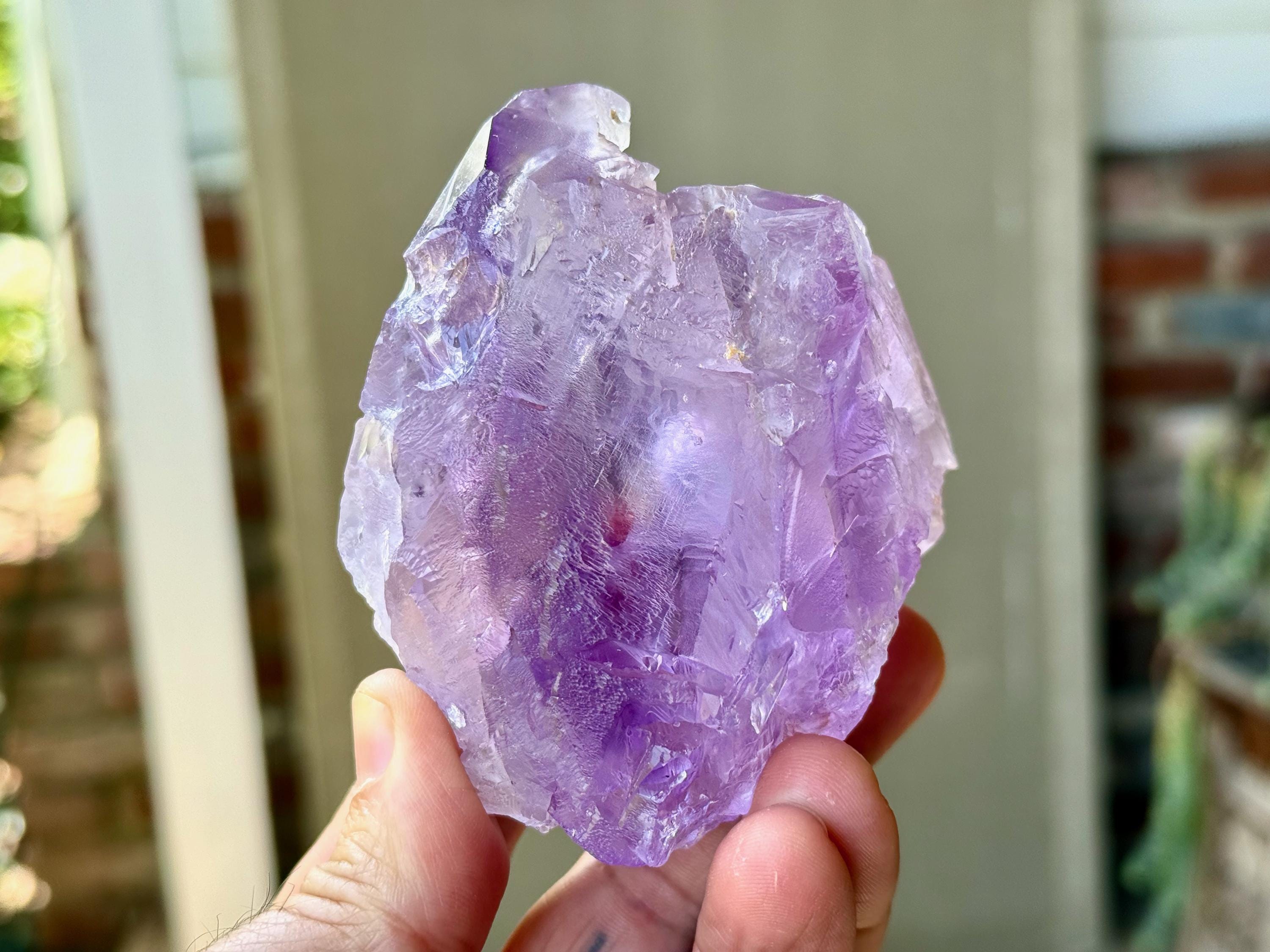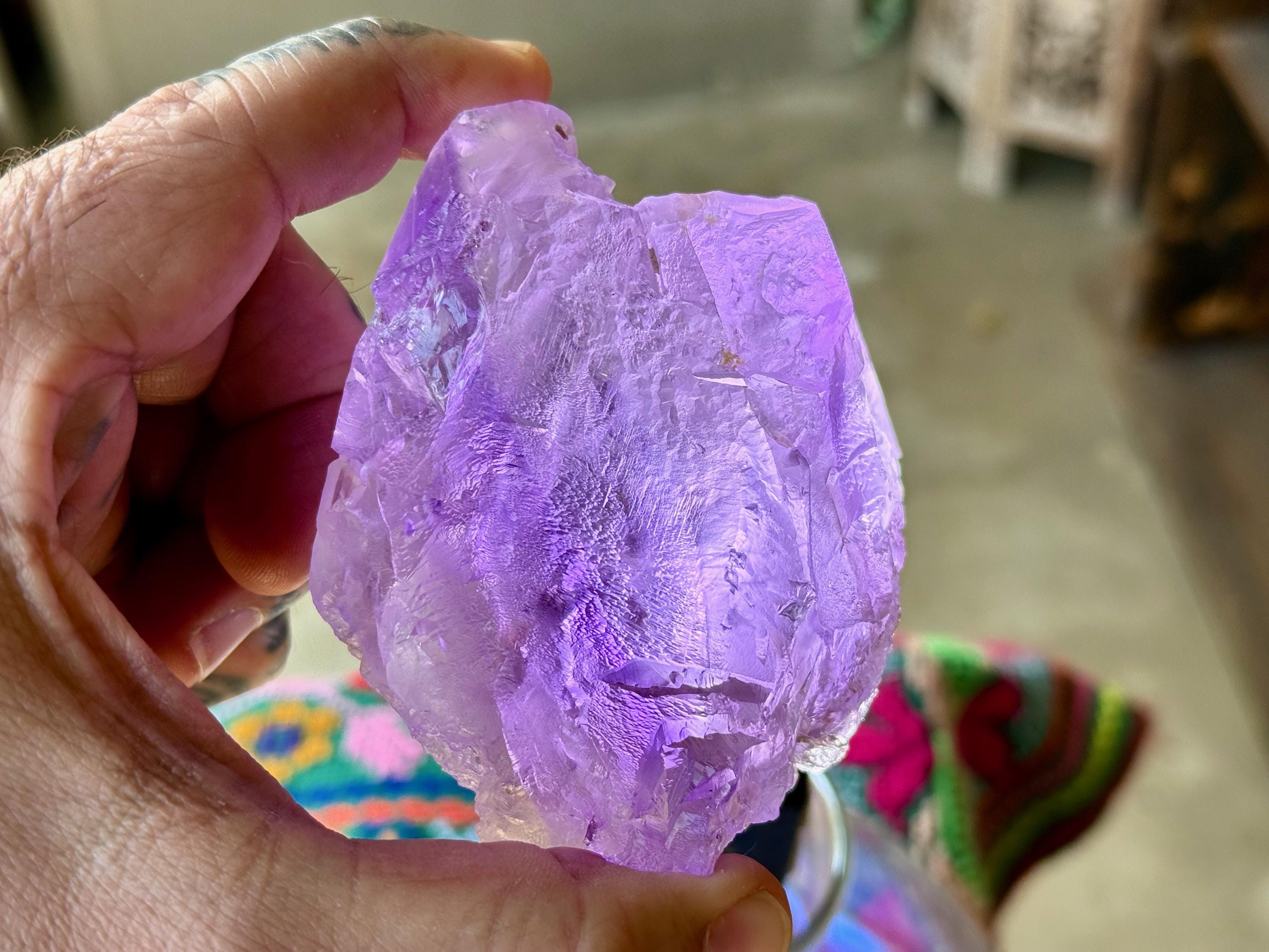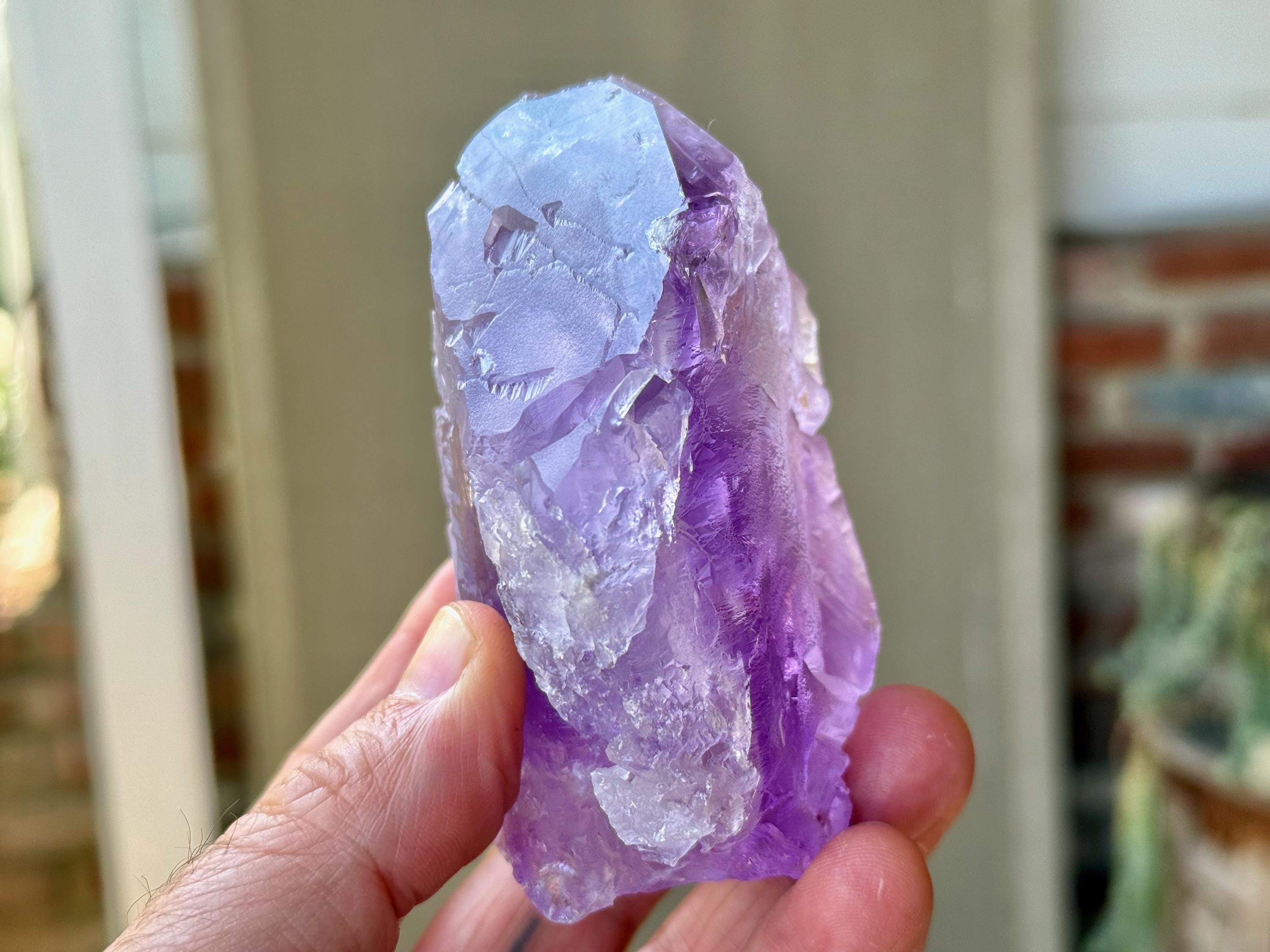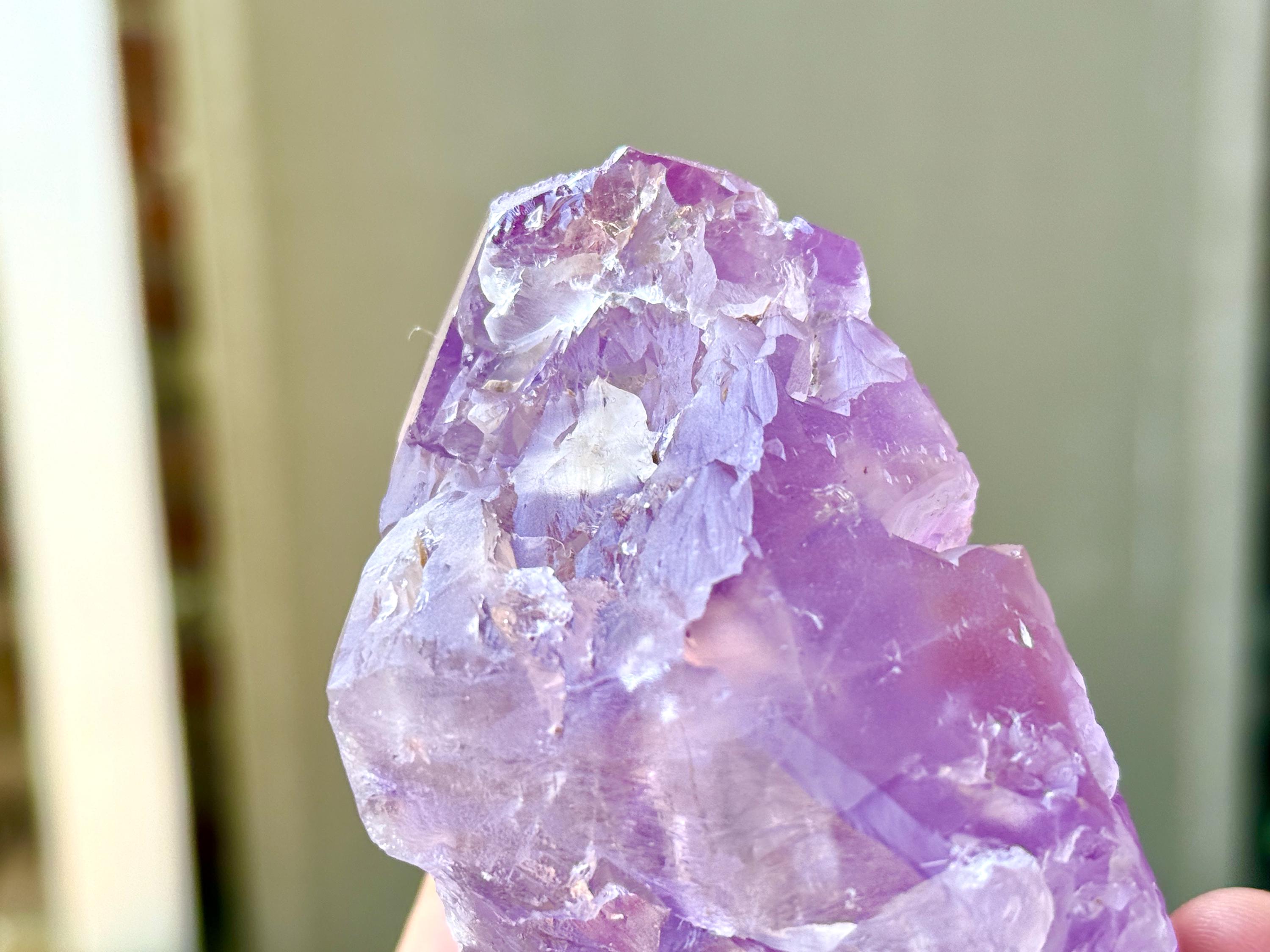 Vibrant purple color to this extraordinary Dissolution Amethyst crystal with multiple trigons imprinted in the main facet!