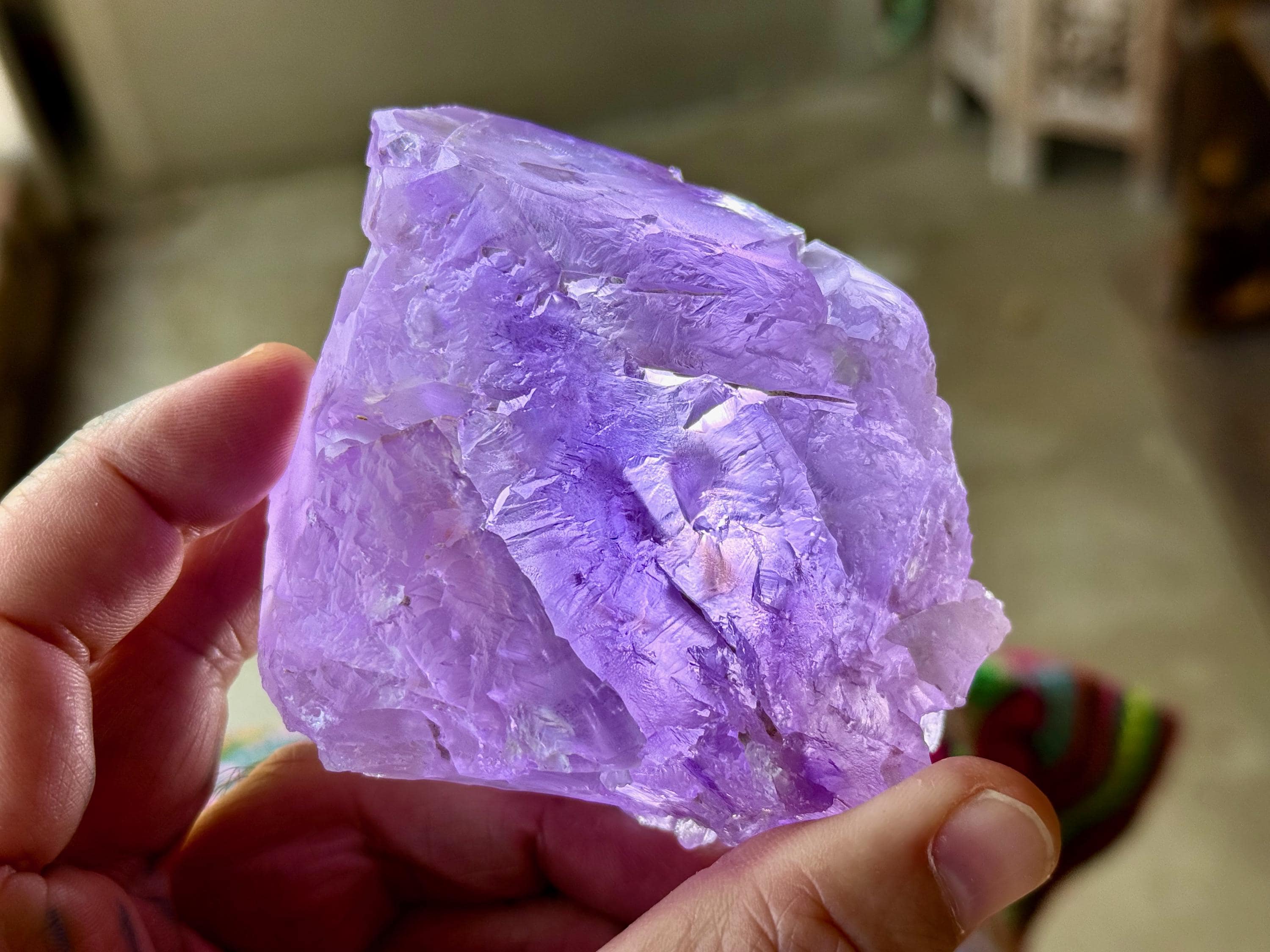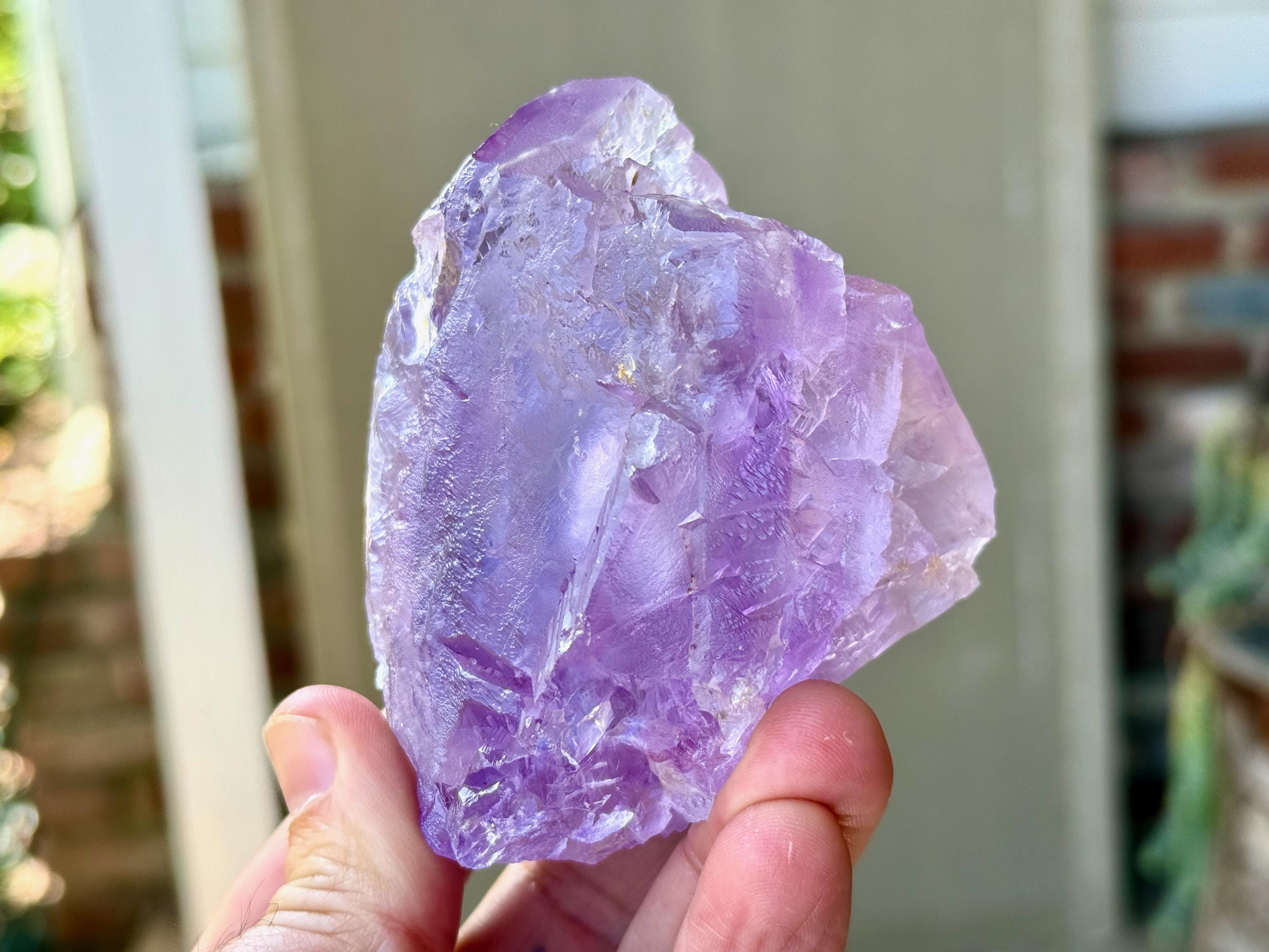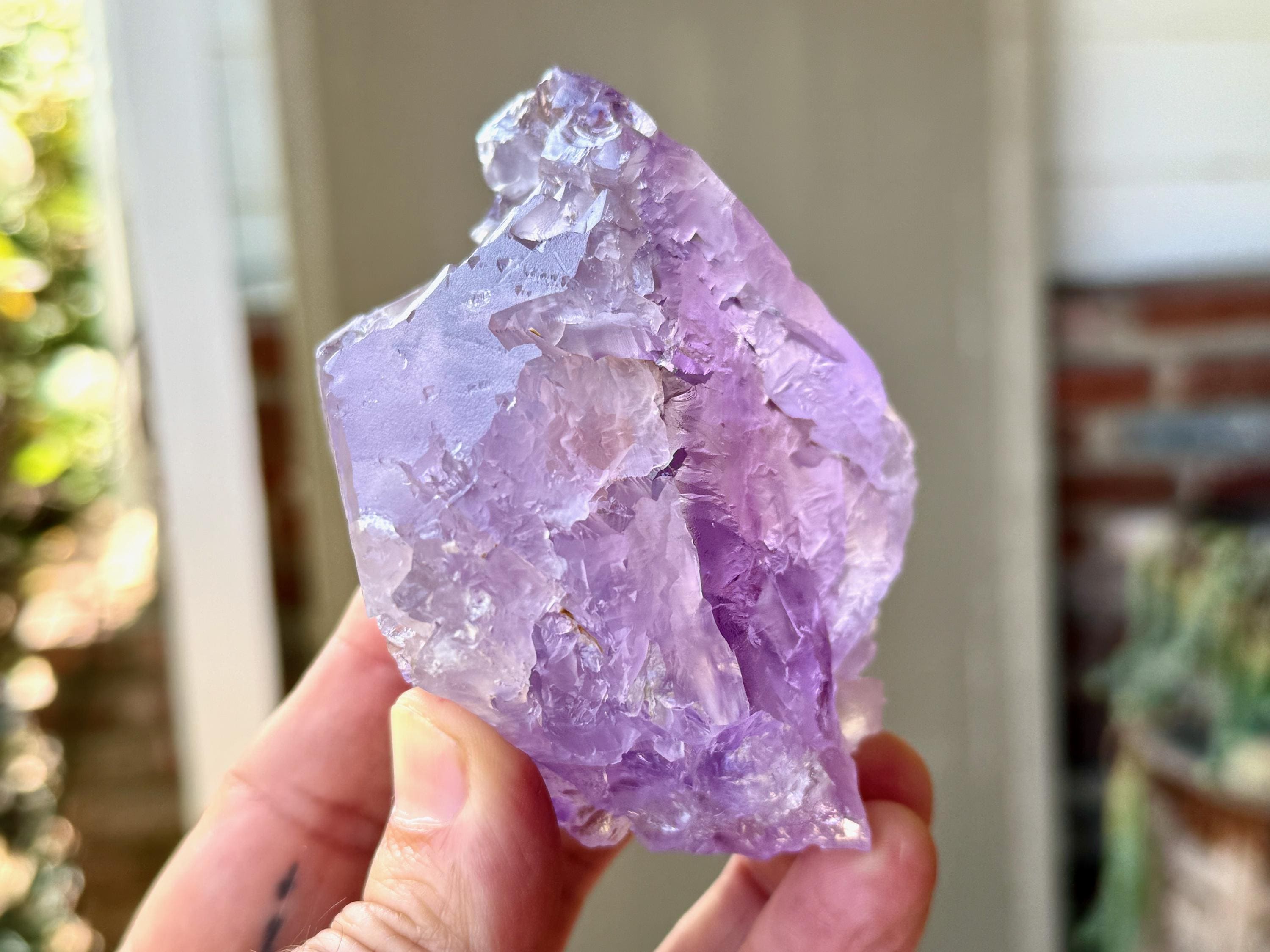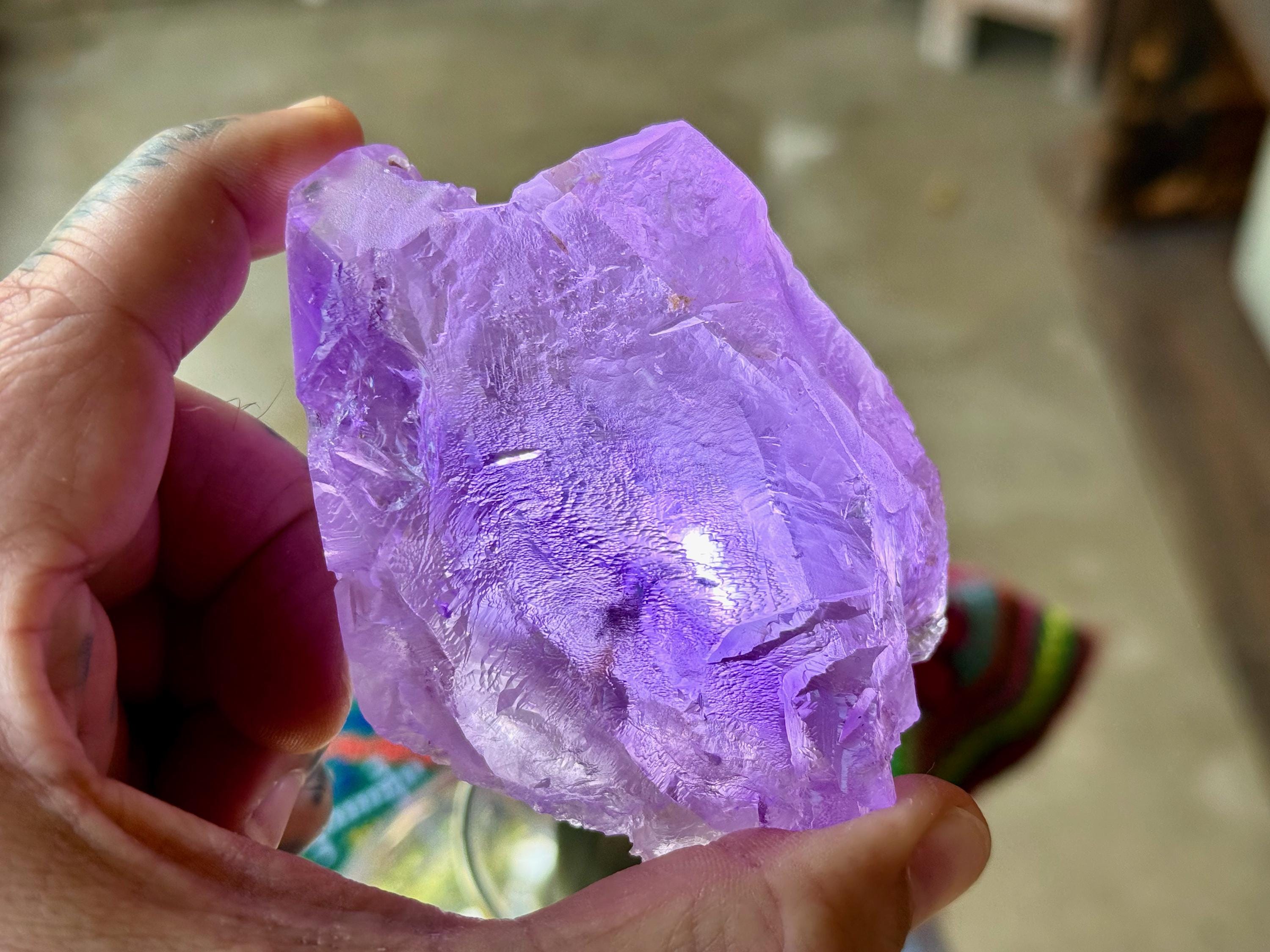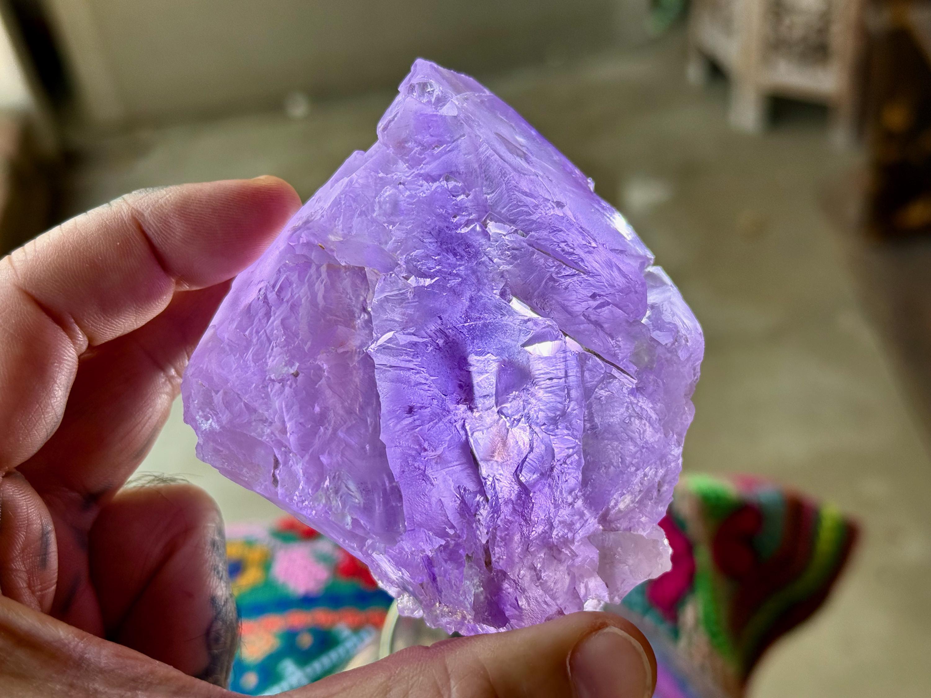 This crystal possesses a rich lilac hue with a vein of darker purple running through it lengthwise, as is characteristic of the crystals from this find. Its base and body display the gorgeous hydrothermal etchings that we love to see from these crystals. When backlit, as in Photos 4-7, we can see how brilliantly it lights up!