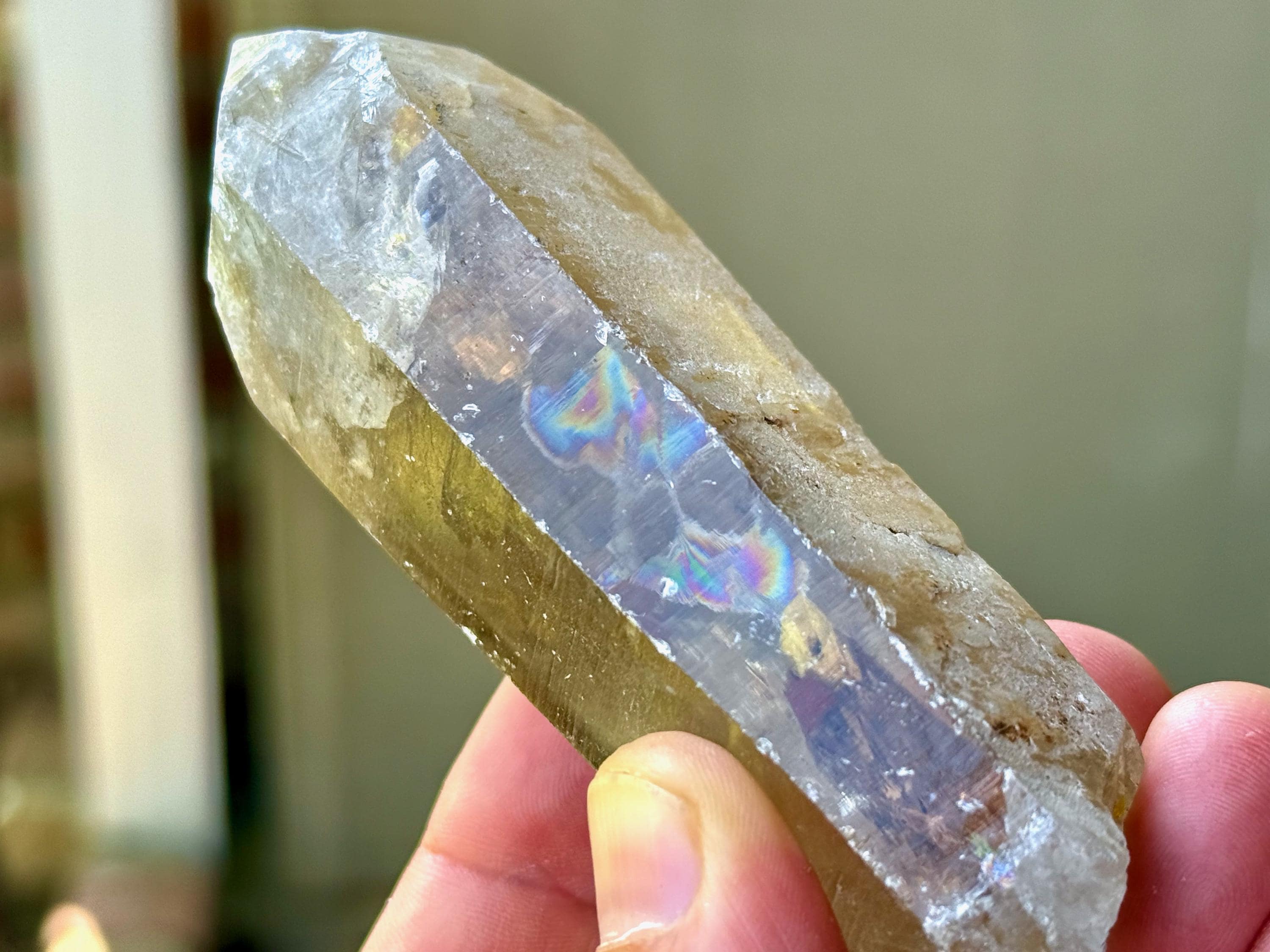 One striking characteristic is the vibrant rainbows we see in the body and base of this piece (Photos 4-5). Another is the white inclusions in the main facet area that give the piece a "snow-capped" look. The main facet is 5-sided, making this an "Isis" crystal (Photo 6 — see more on this below). The left facet features some very cool etched impressions (Photo 7).