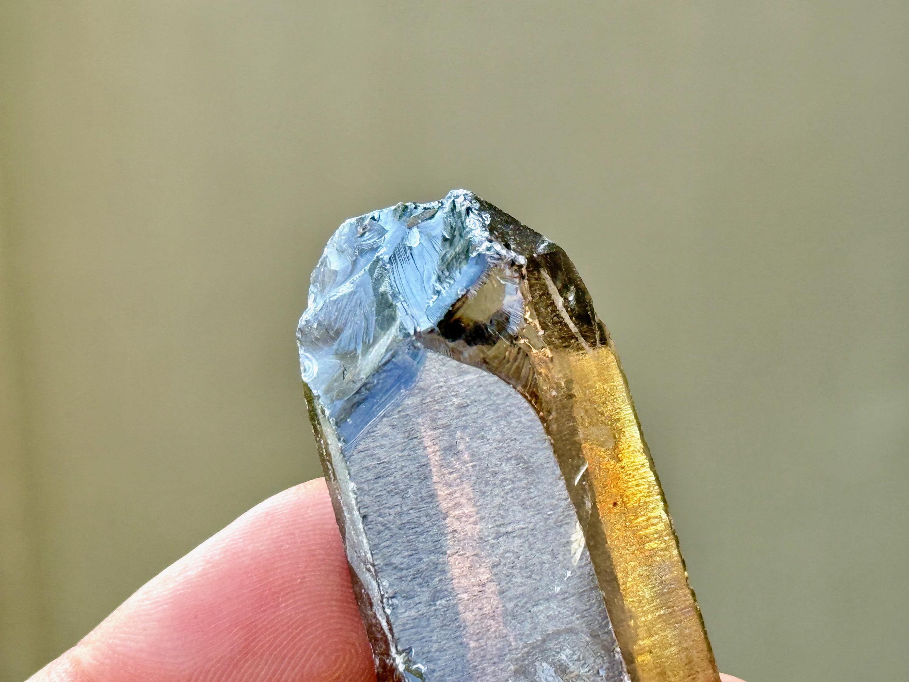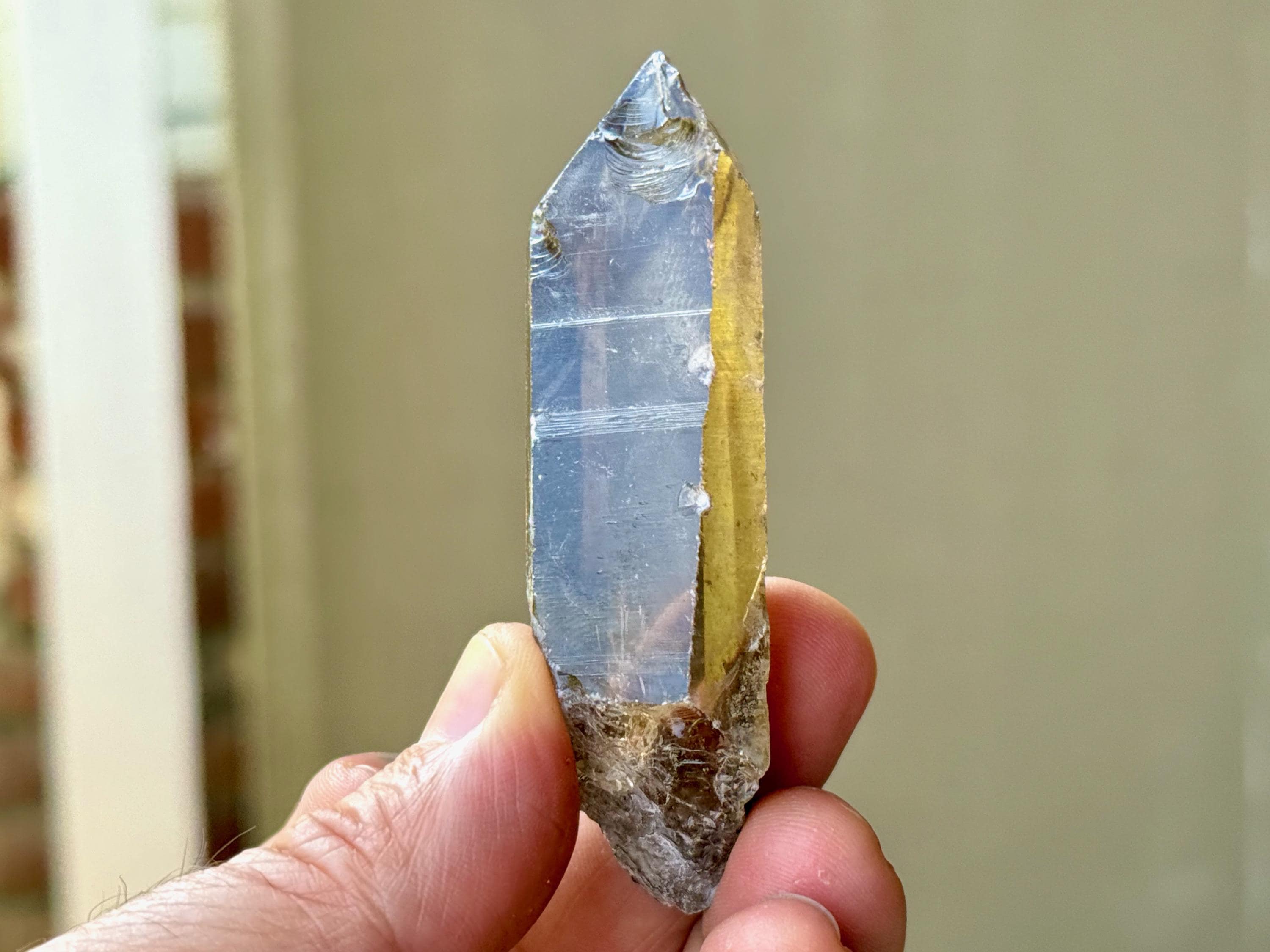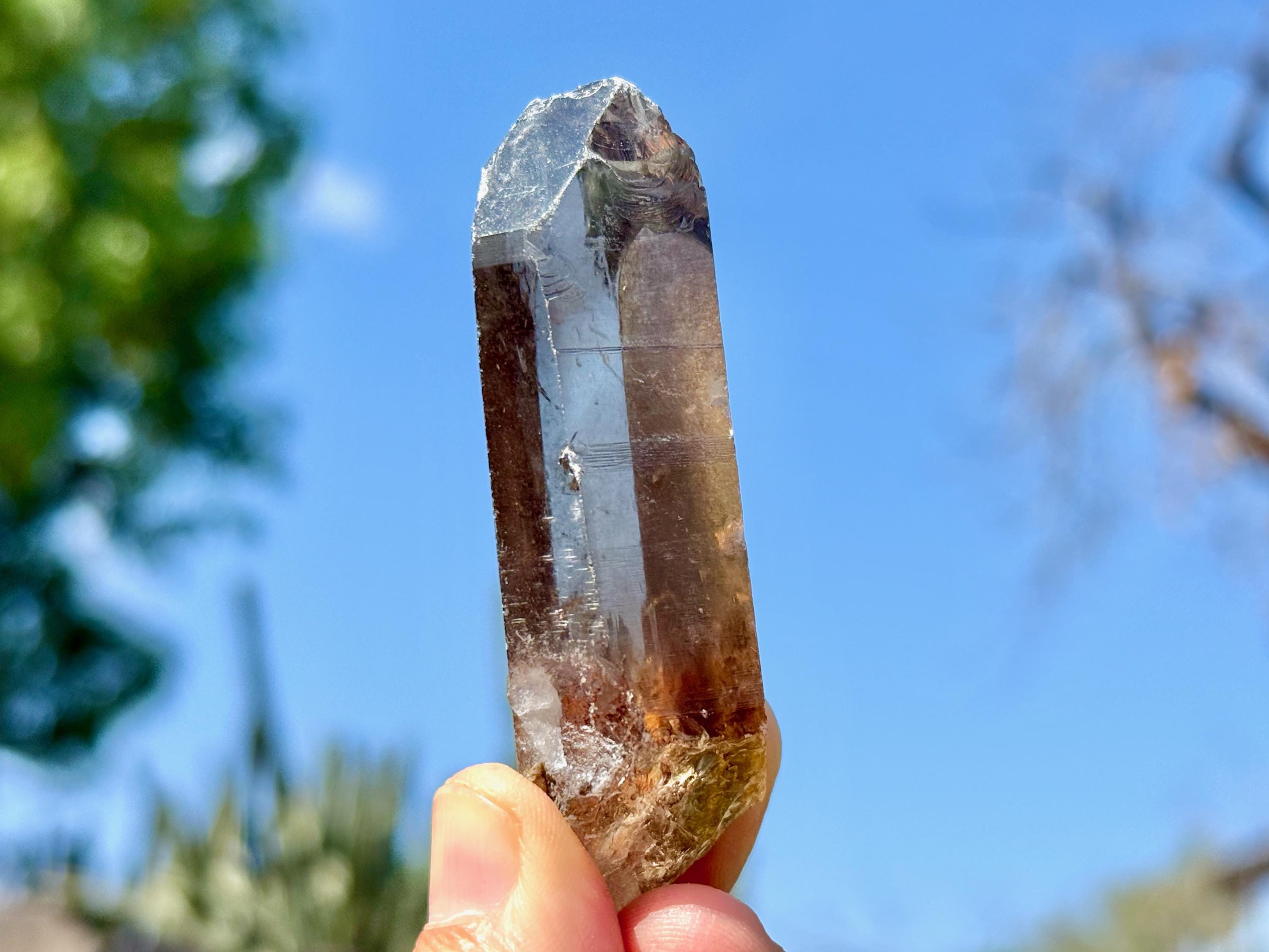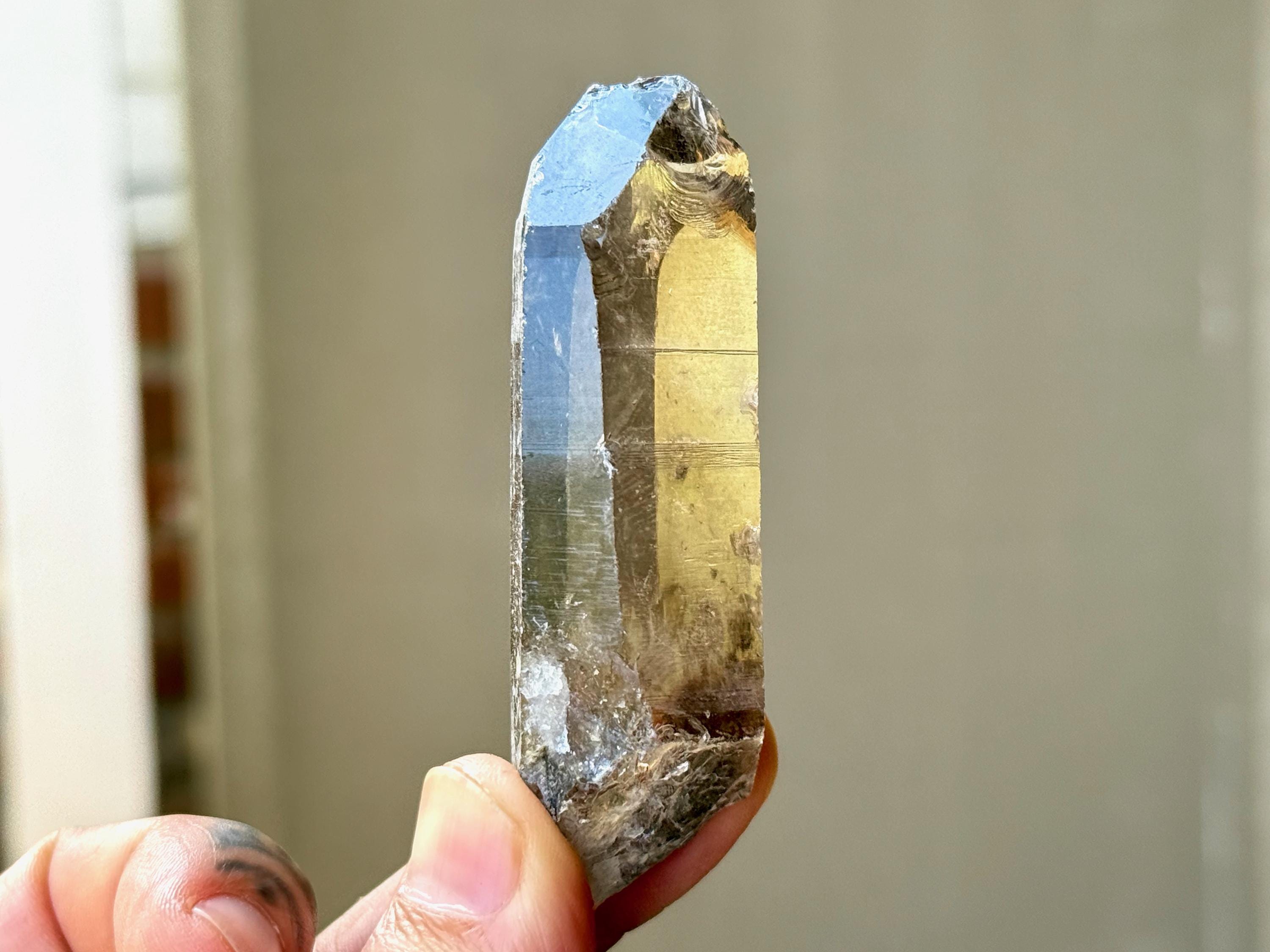 An elegant smoky-golden hue, outstanding clarity and brilliant luster to this gorgeous Sacred Scribe Lemurian Quartz. This crystal possesses some traditional Lemurian striations on its right side, as well as on the upper part of the left side.