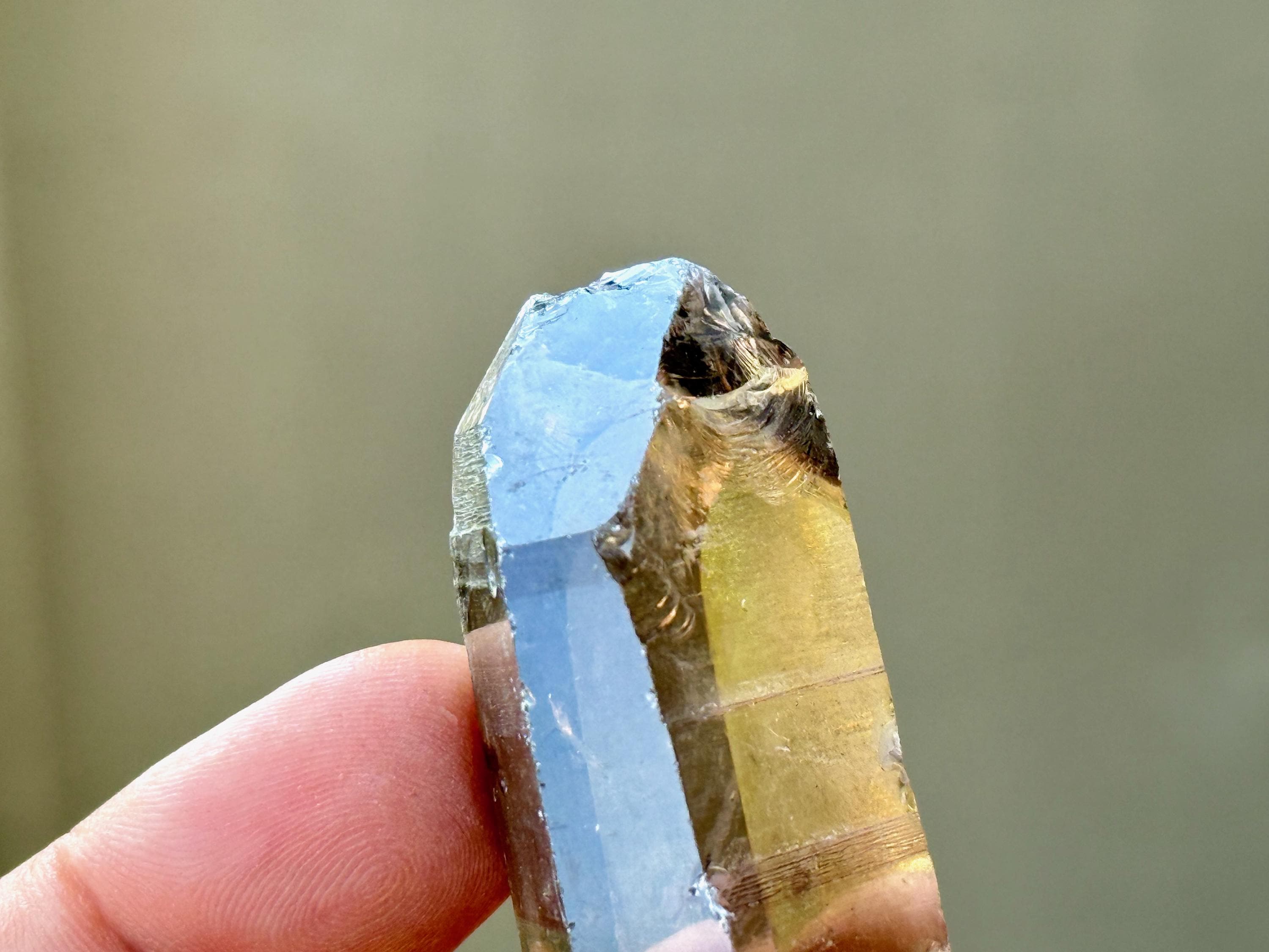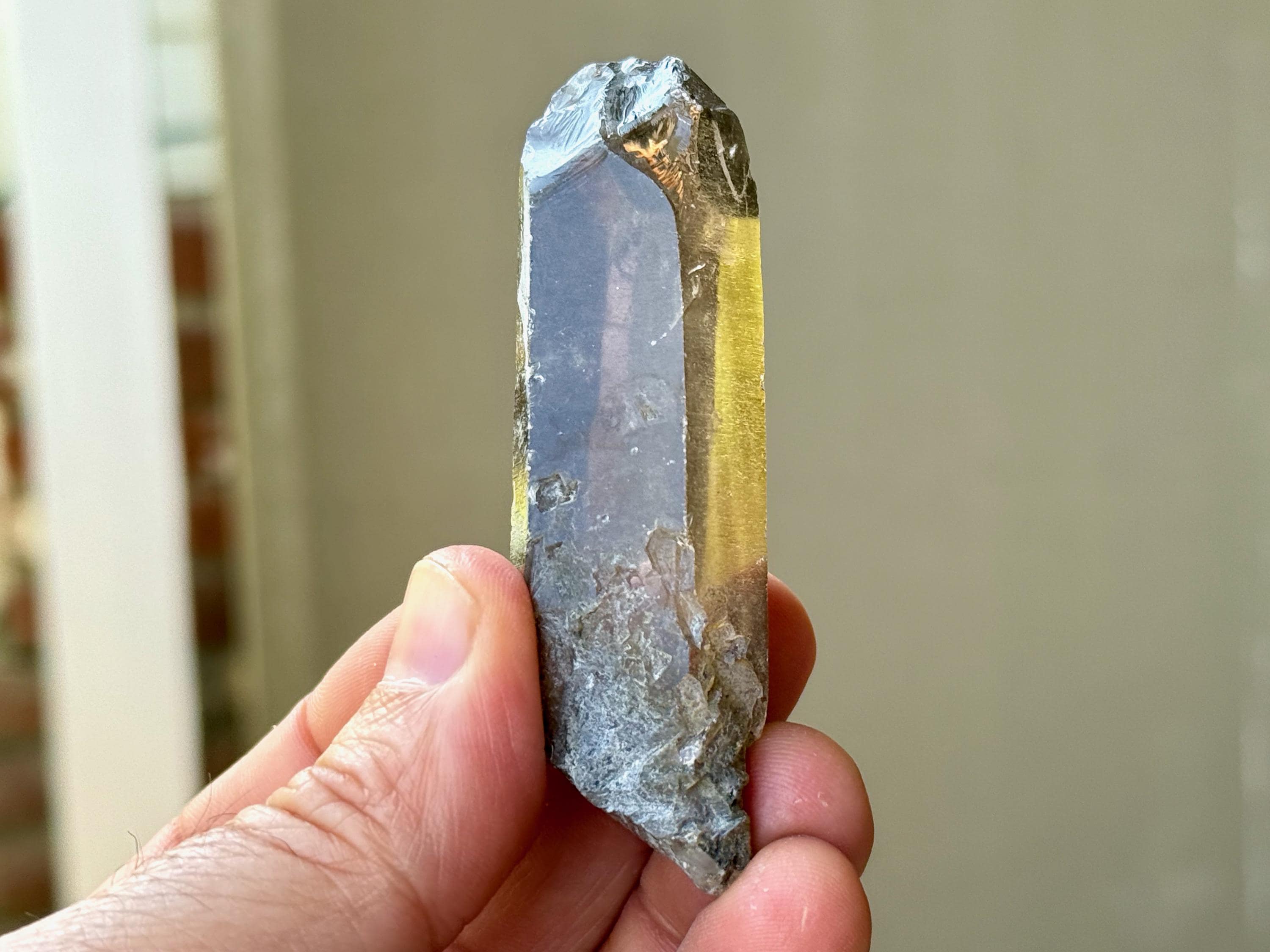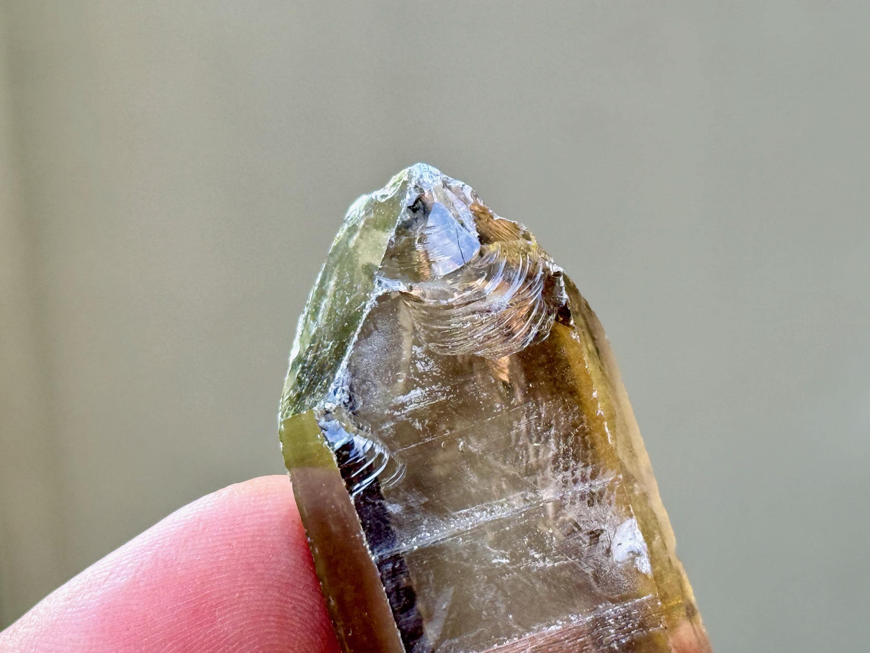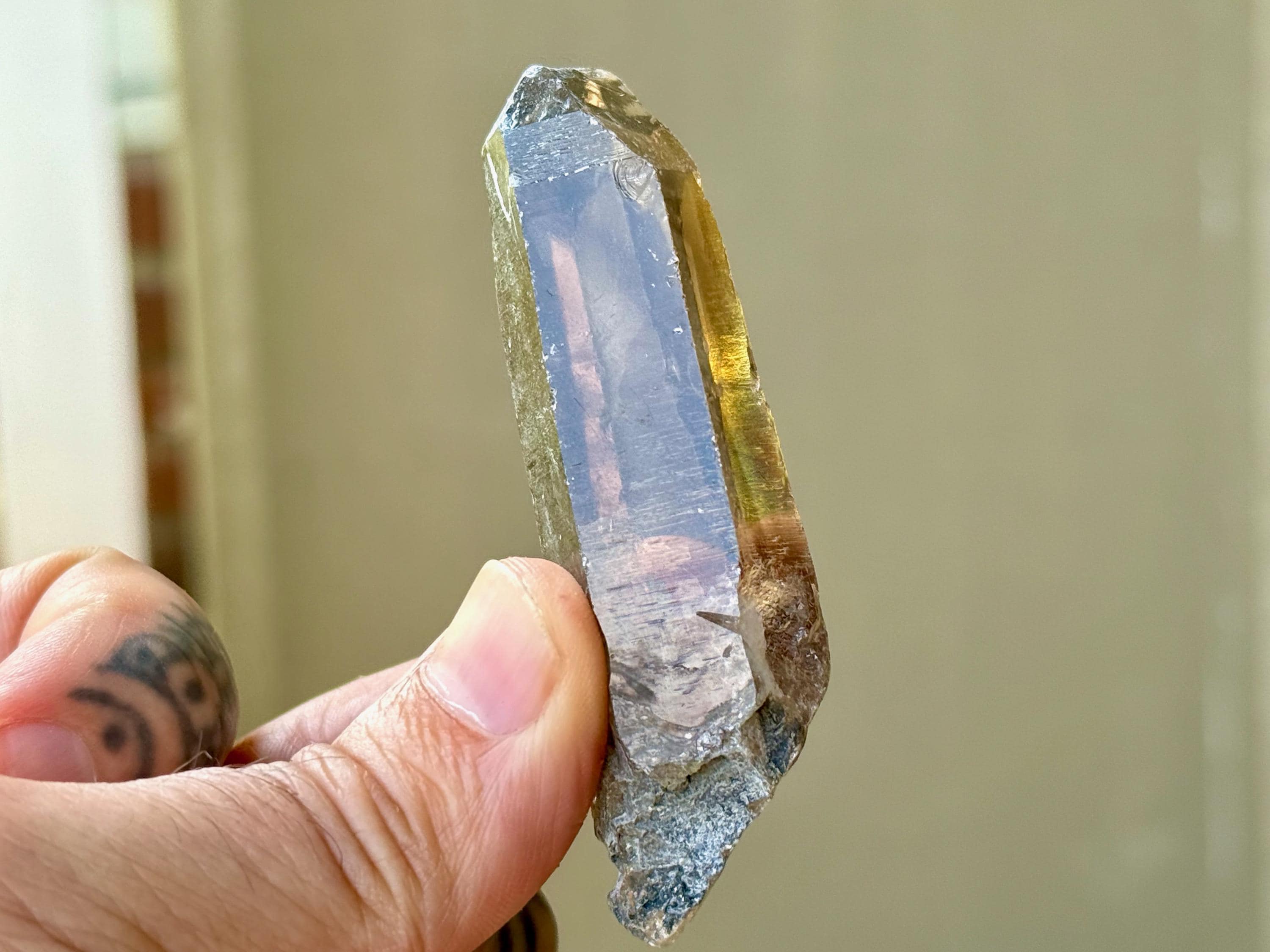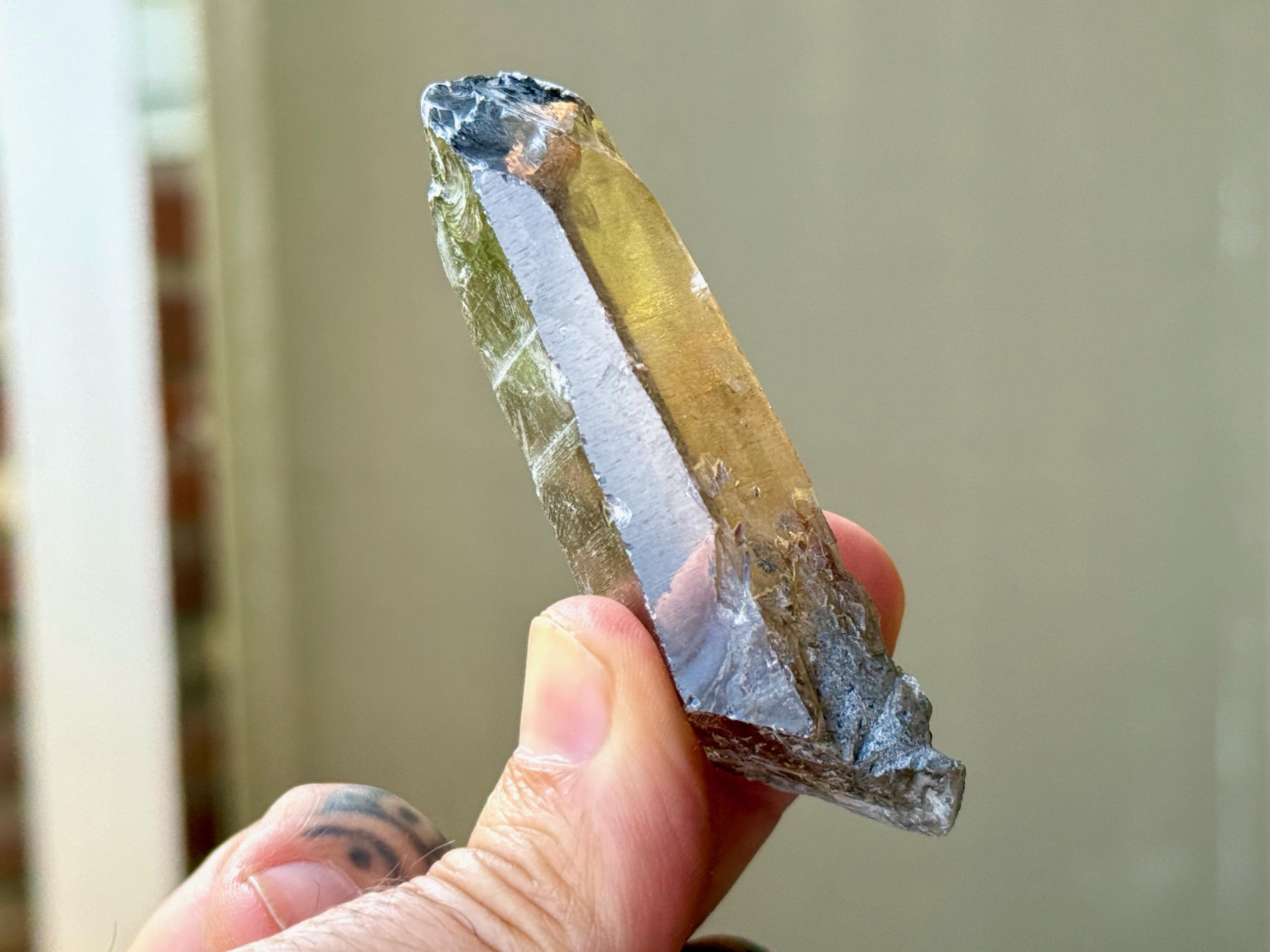 An elegant smoky-golden hue, outstanding clarity and brilliant luster to this gorgeous Sacred Scribe Lemurian Quartz. This crystal possesses some traditional Lemurian striations on its right side, as well as on the upper part of the left side.