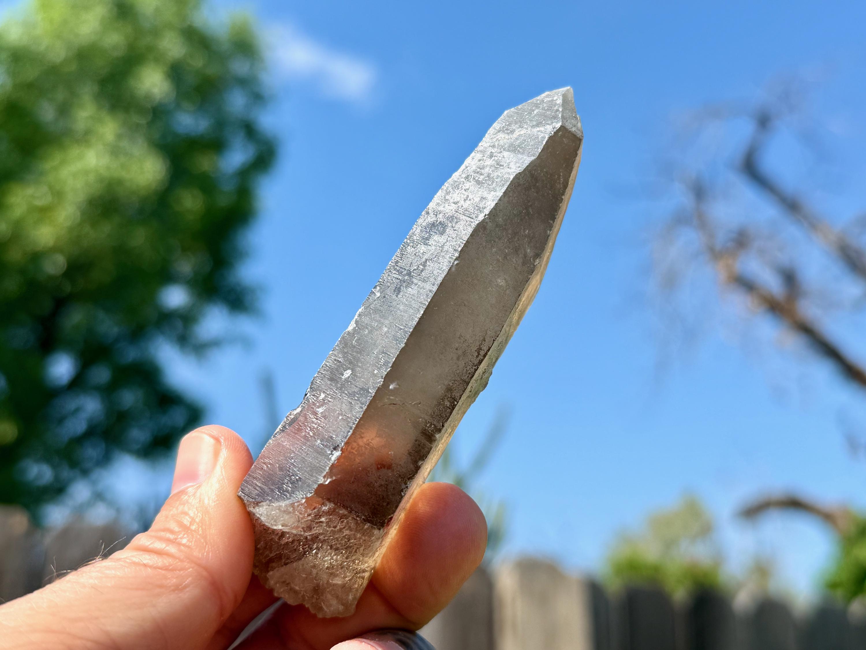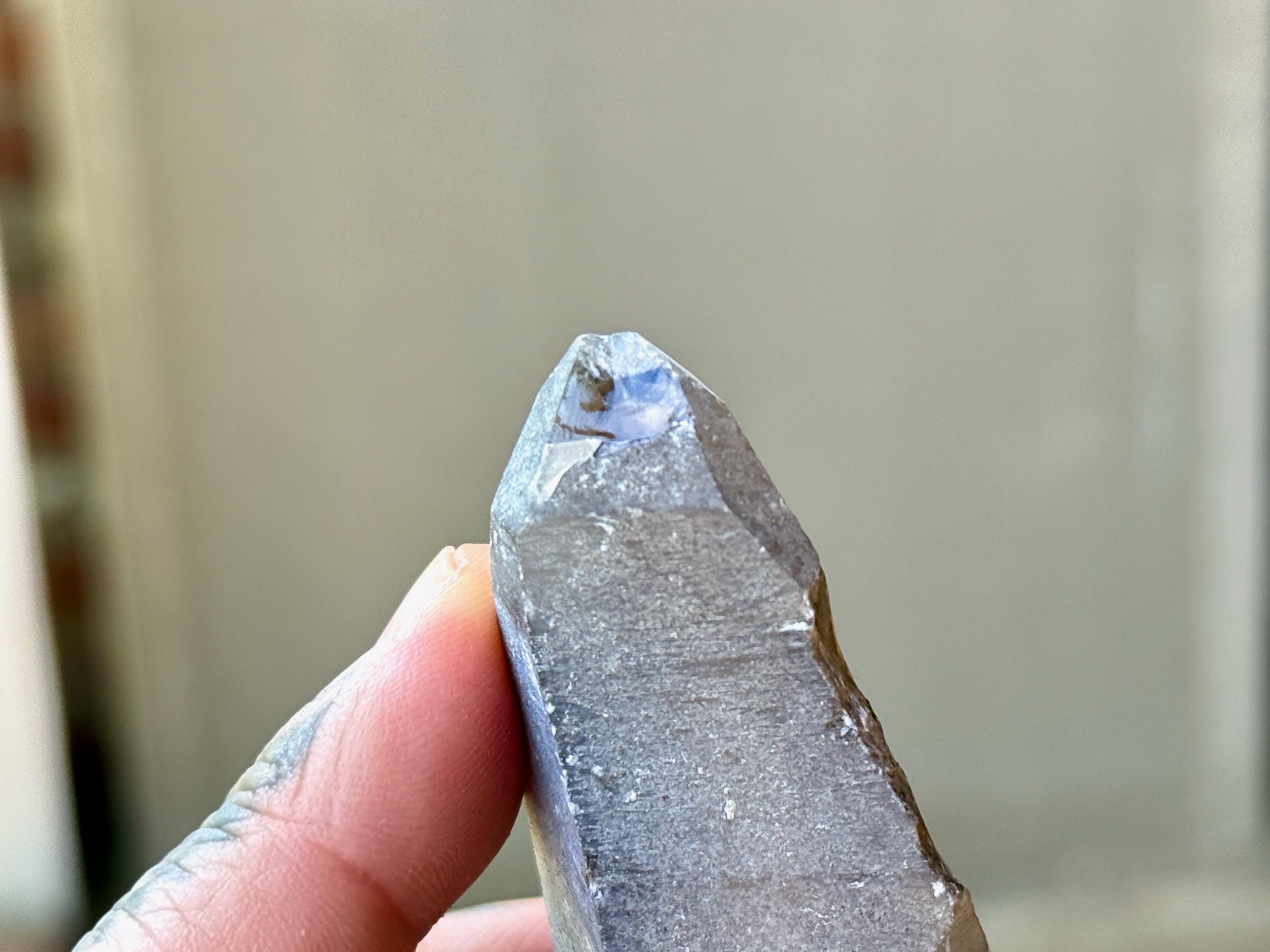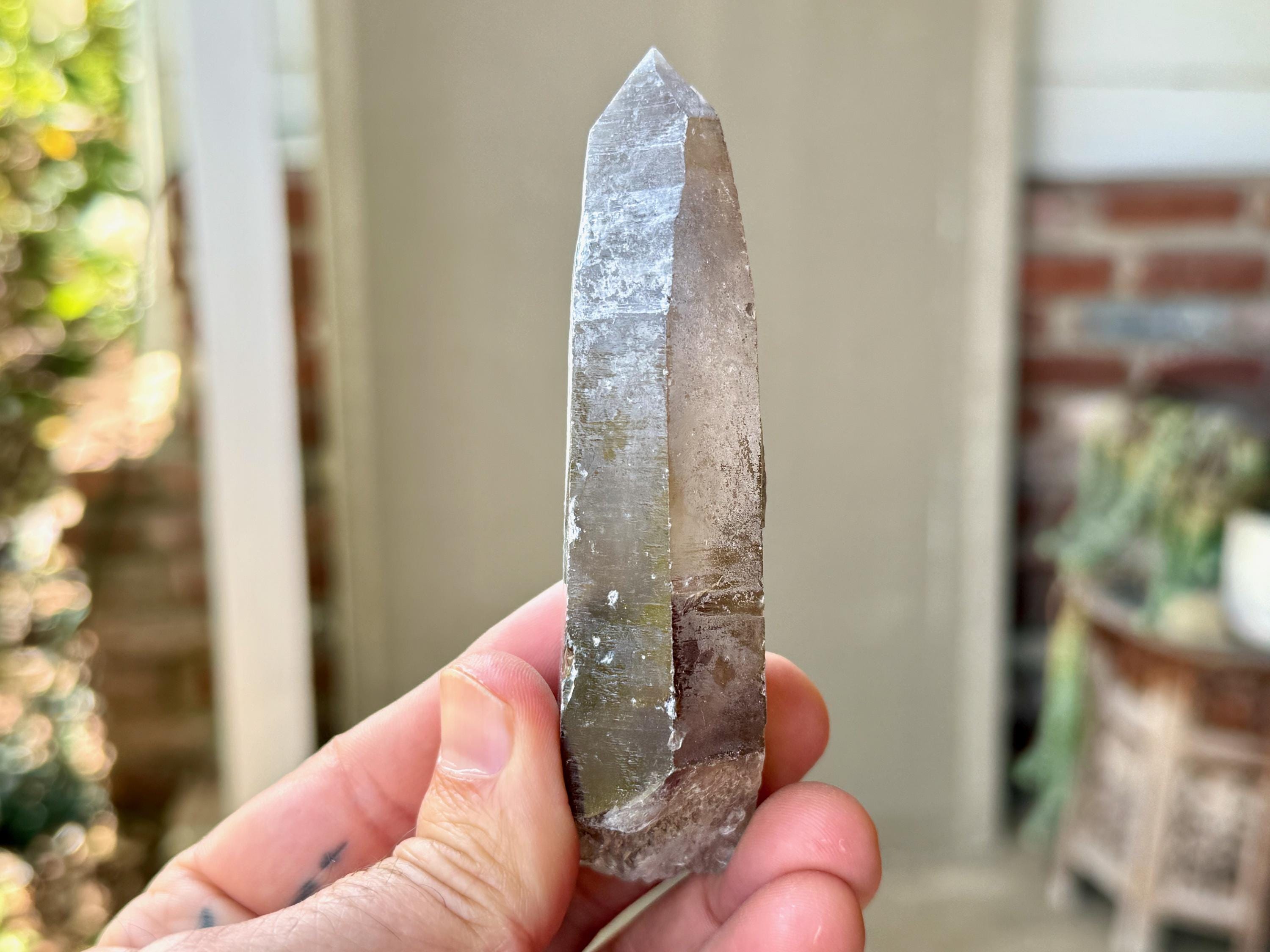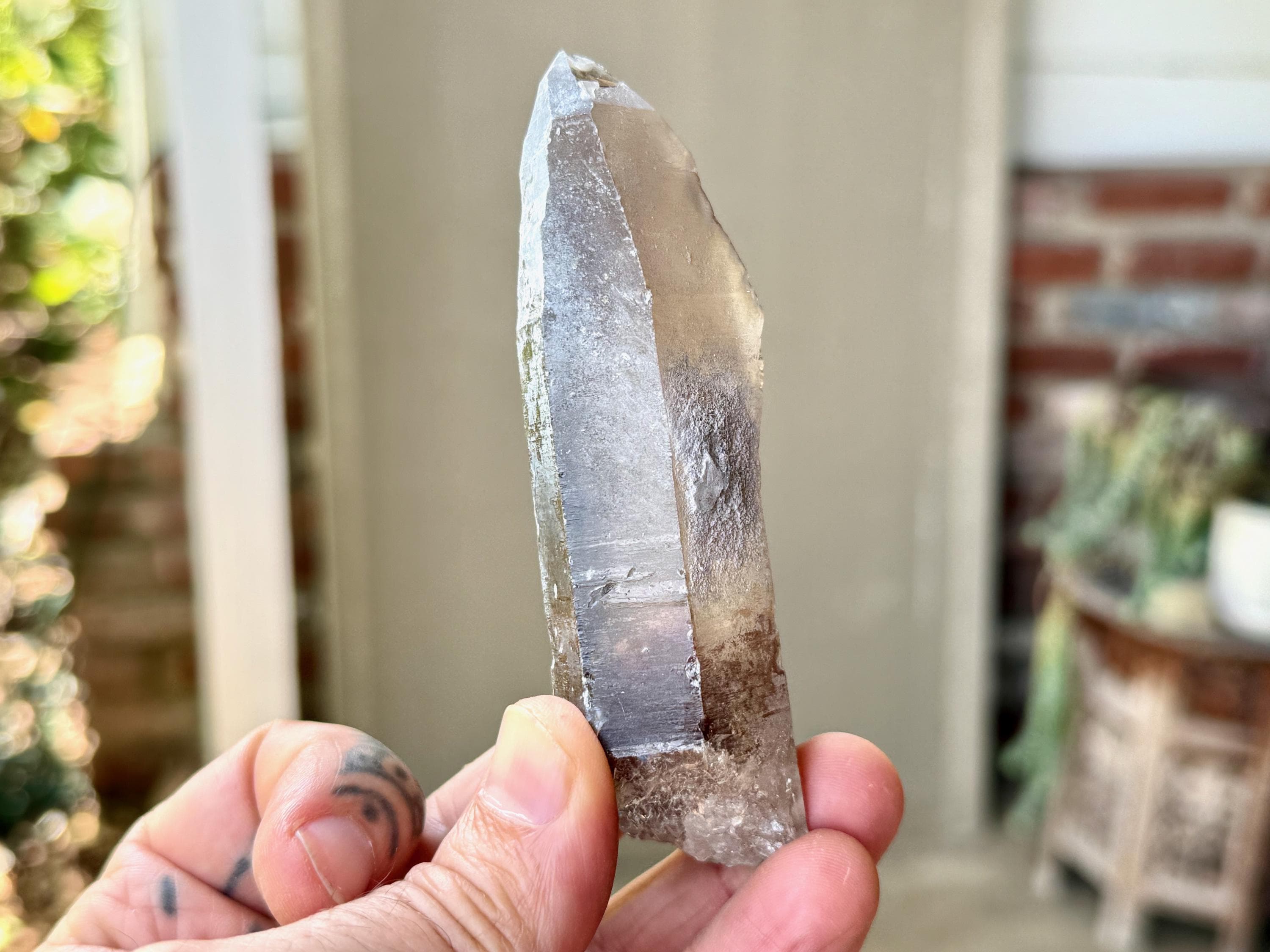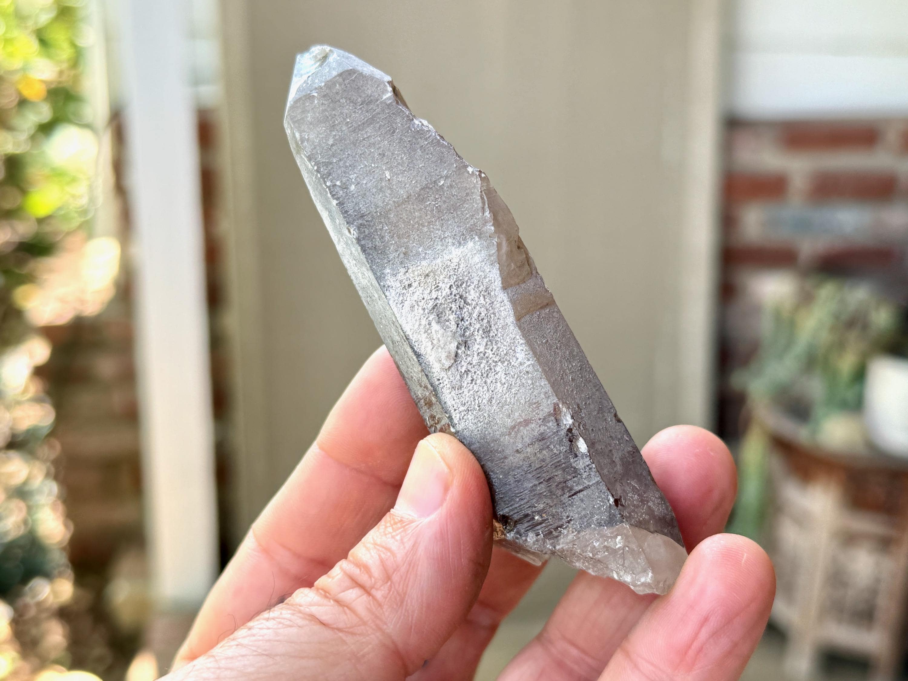A handsome elongated formation to this Sacred Scribe Lemurian with a deep smoky hue and a mild white "frost" on much of the exterior. We can make out some finely etched horizontal striations on at least one or two of its sides. The white frost on the exterior gives it a bit of a matte complexion, but we can see the nice luster of the crystal beneath it in the areas where the frost breaks.