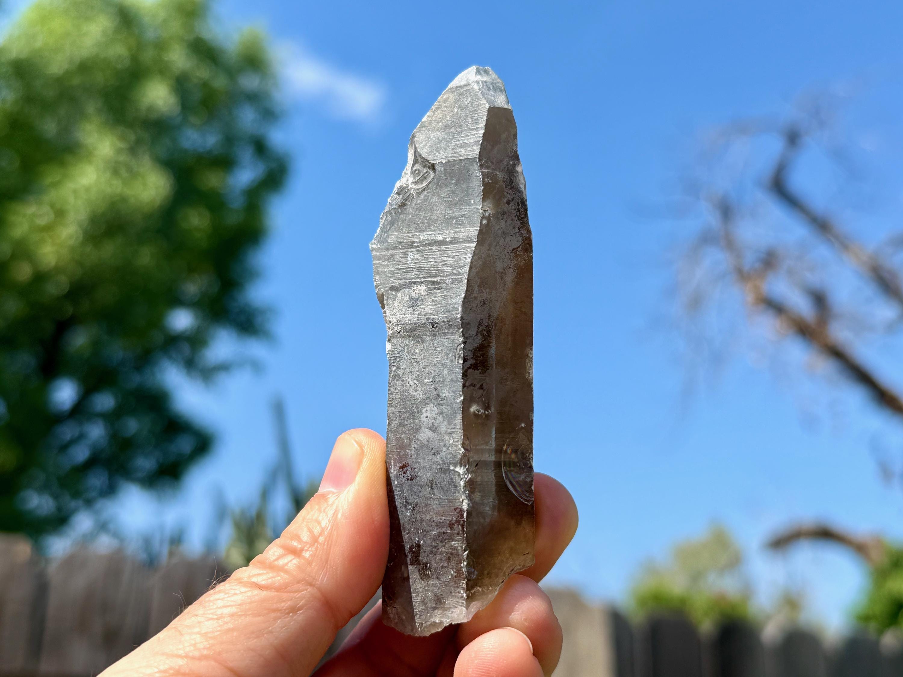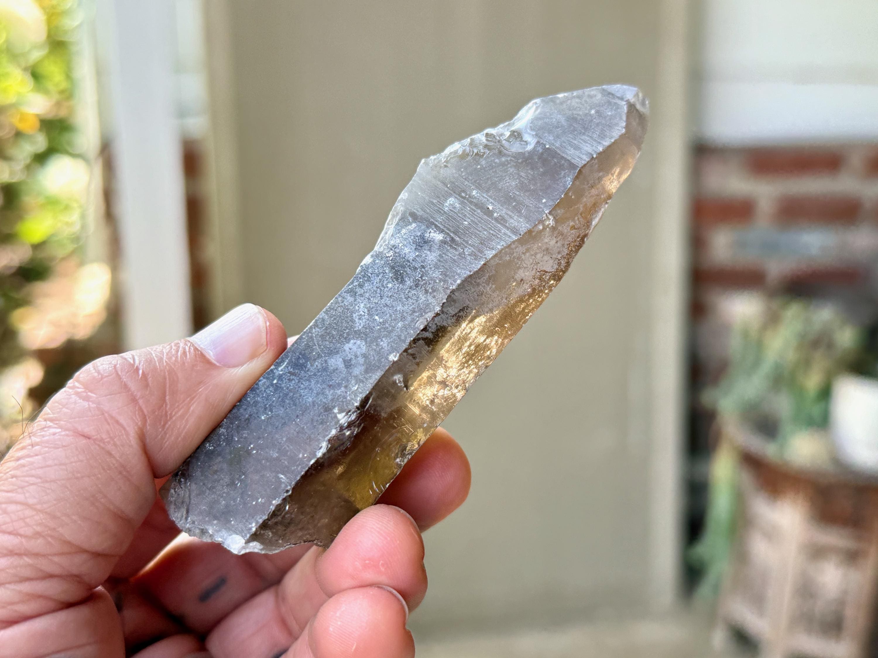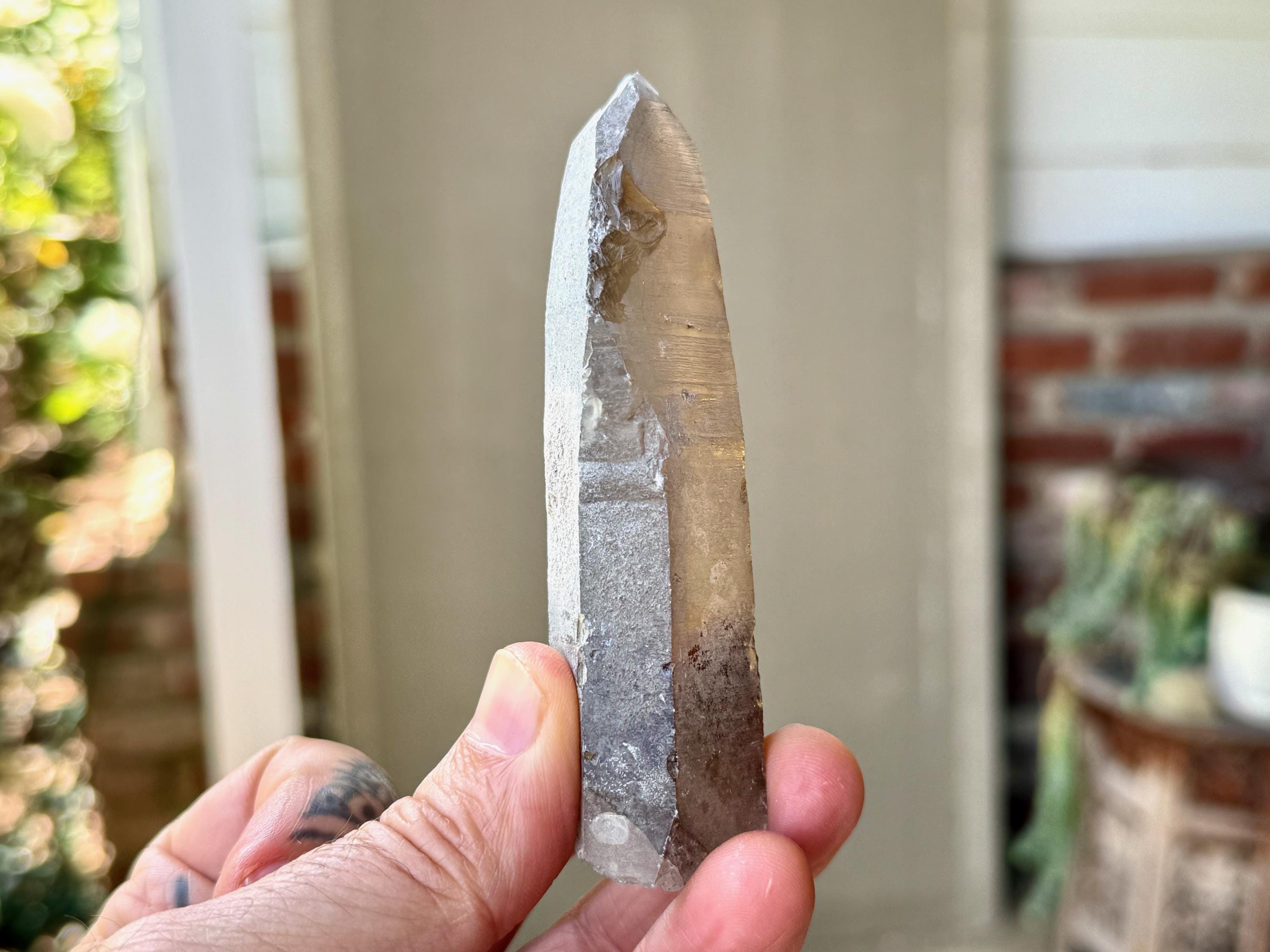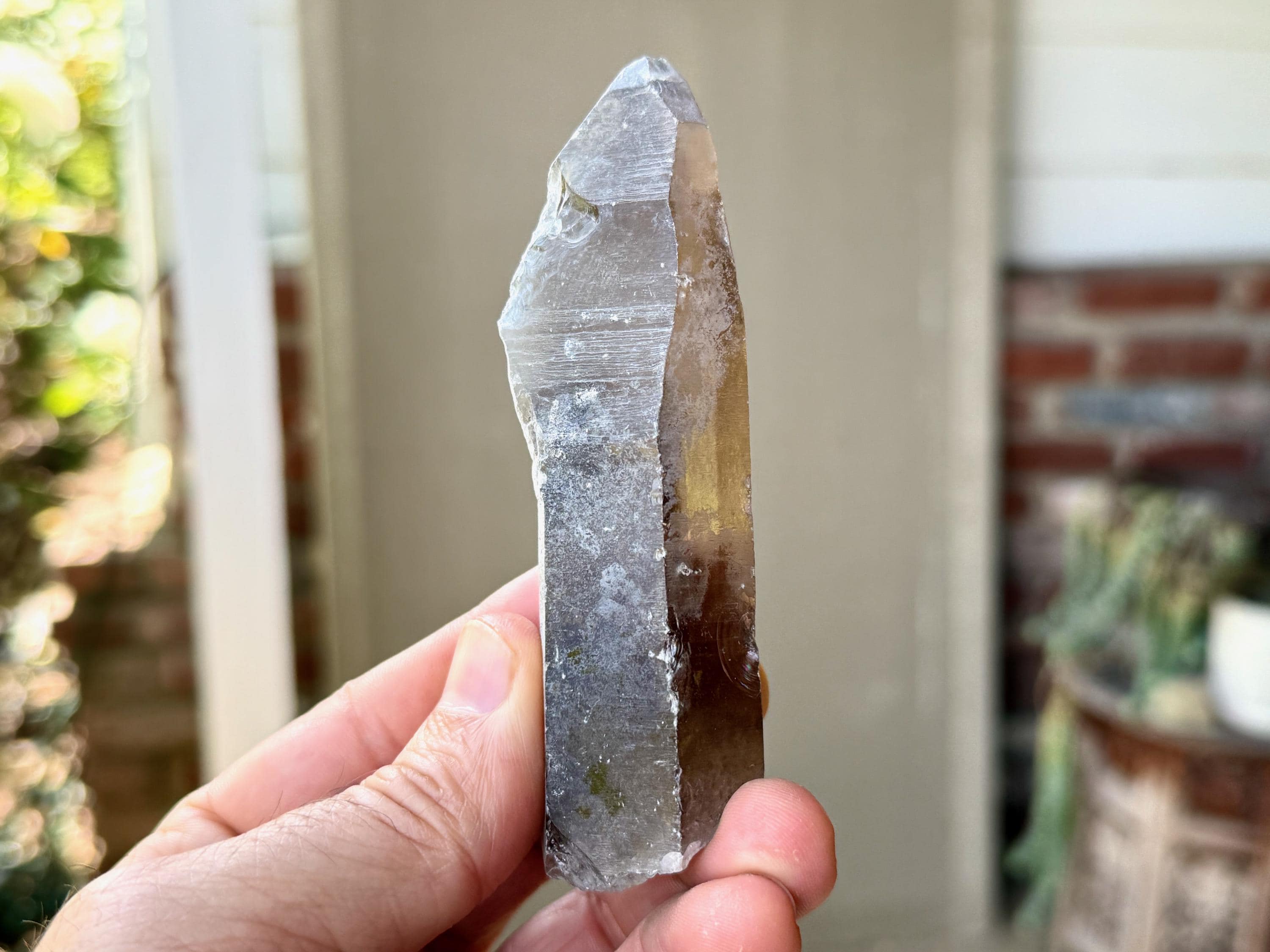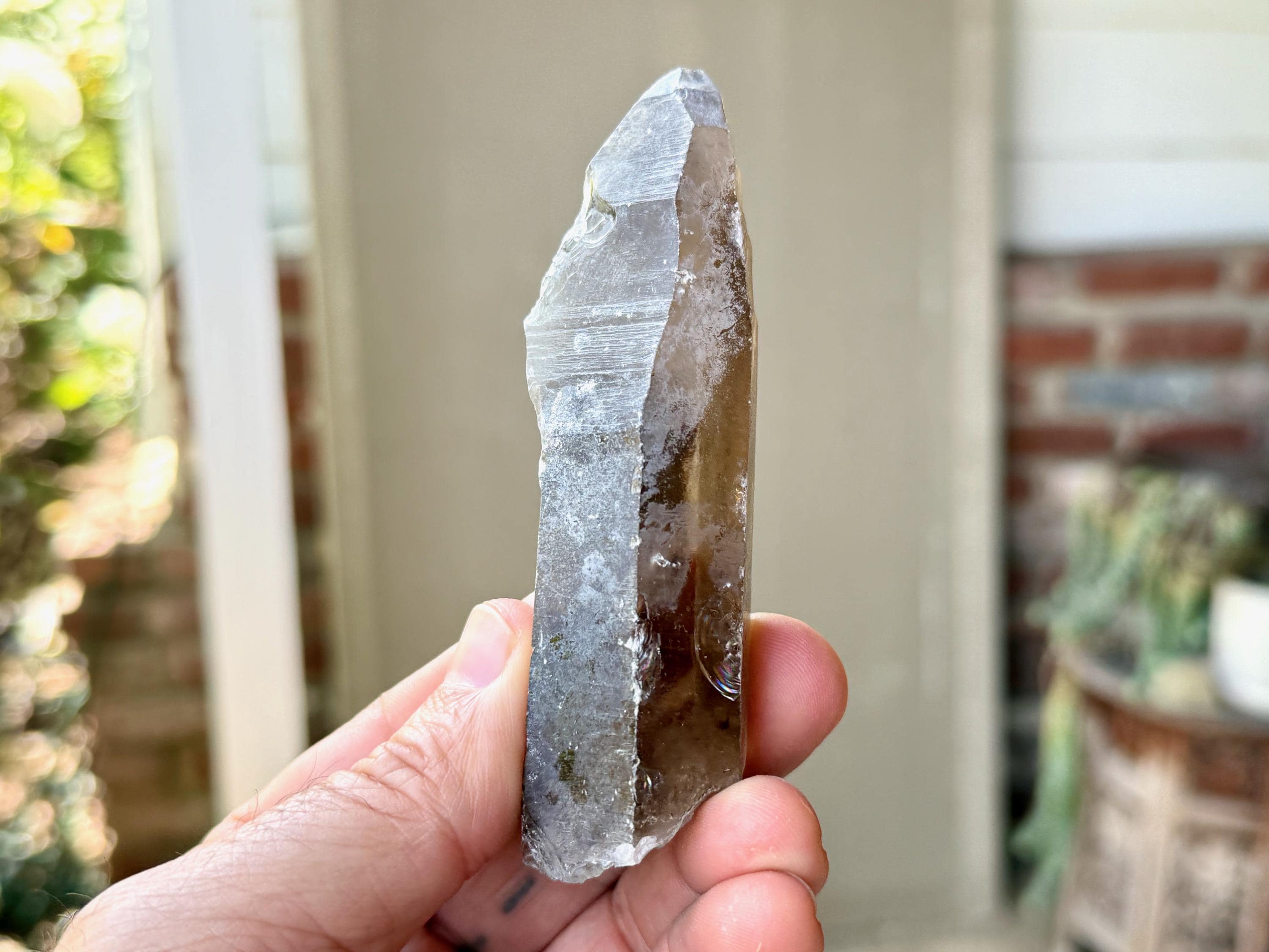 A handsome elongated formation to this Sacred Scribe Lemurian with a deep smoky hue and a mild white "frost" on much of the exterior. We can make out some finely etched horizontal striations on at least one or two of its sides. The white frost on the exterior gives it a bit of a matte complexion, but we can see the nice luster of the crystal beneath it in the areas where the frost breaks.