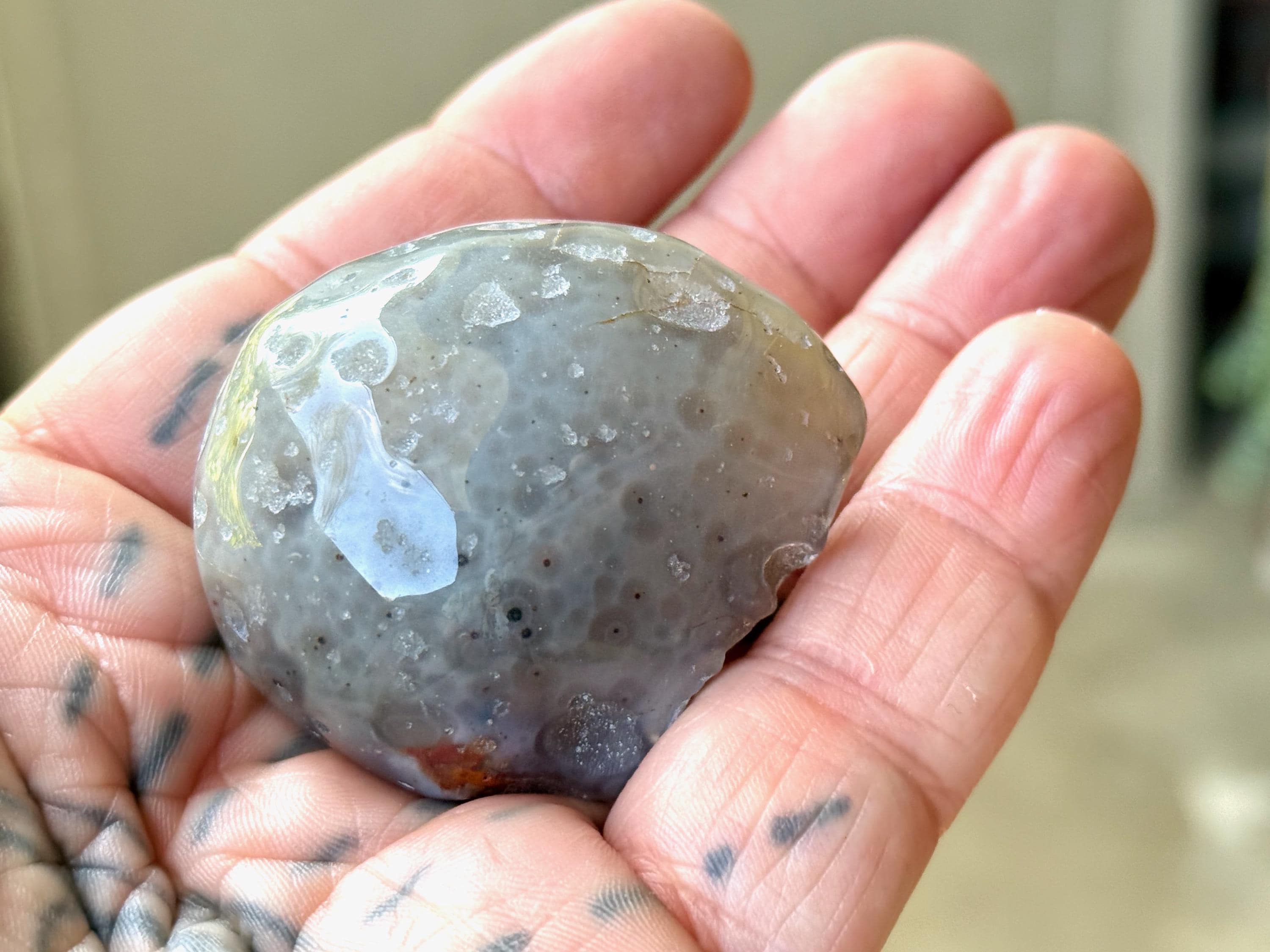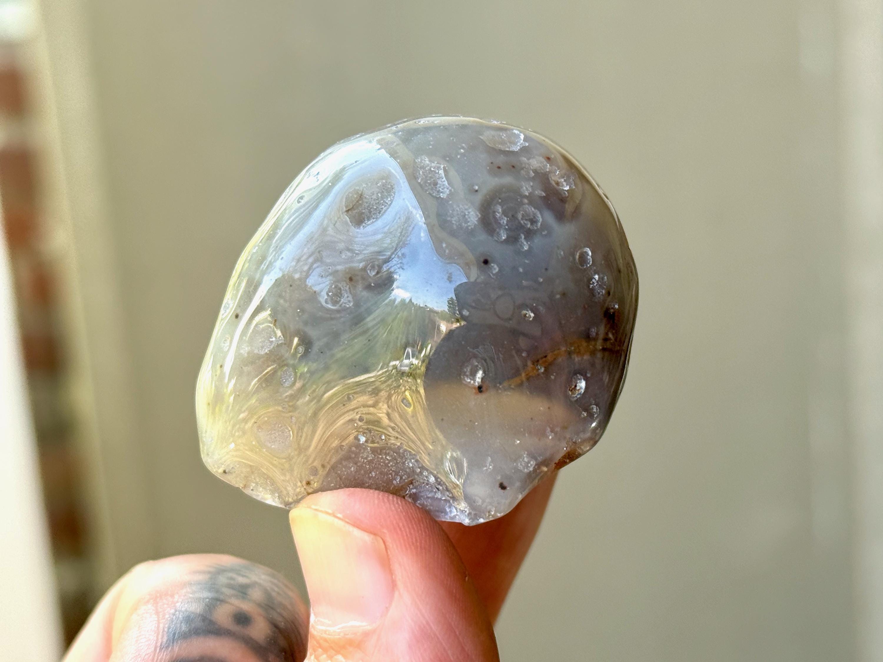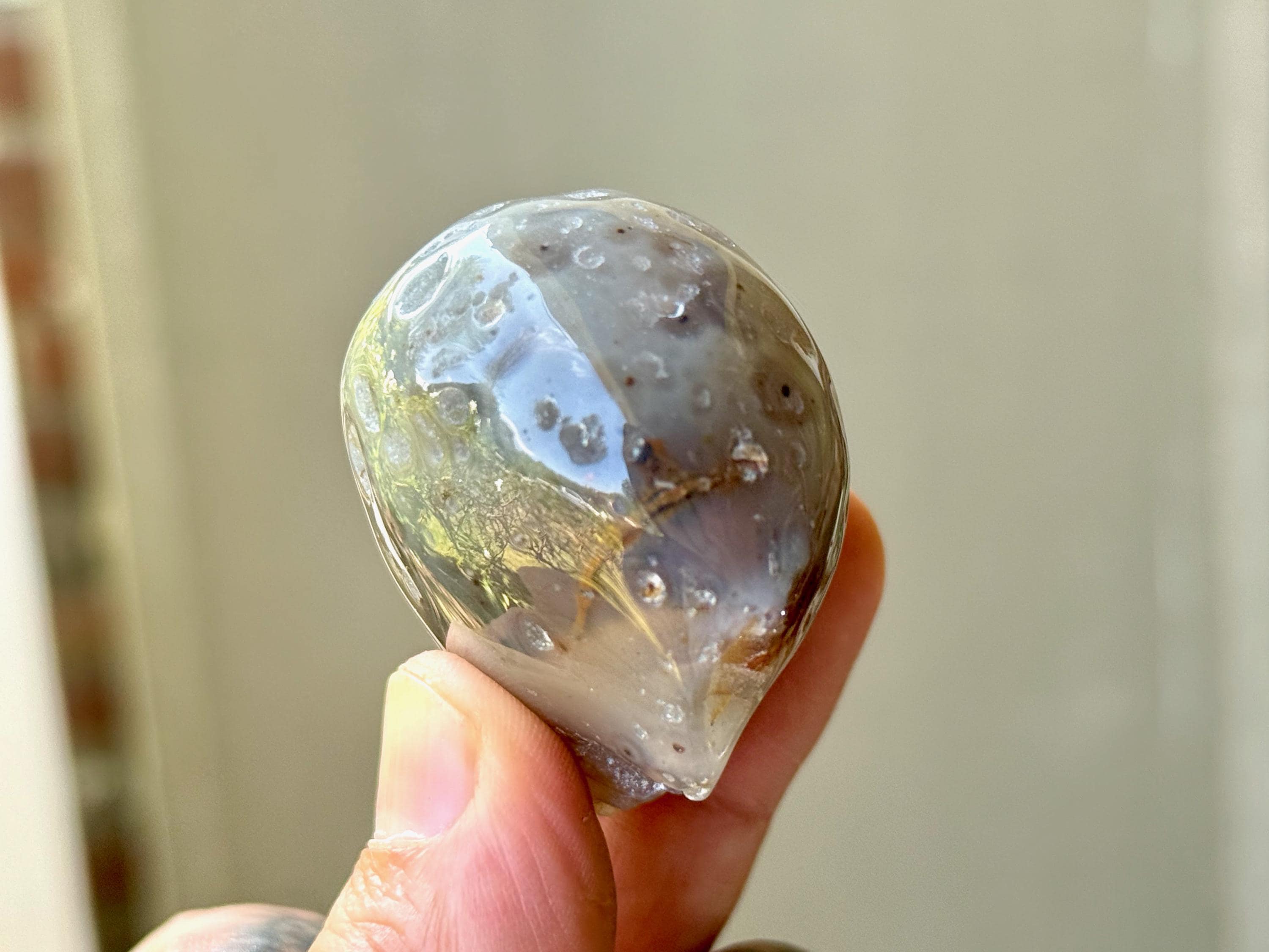 This Agate has outstanding translucency when backlit which makes it easy to see the water swishing inside. The video shows this and it will be much more evident in person. We recommend using a strong light to backlight and doing so in a darkened room to fully appreciate the water within. We've also included photos of this piece with backlighting (Photos 2-3).