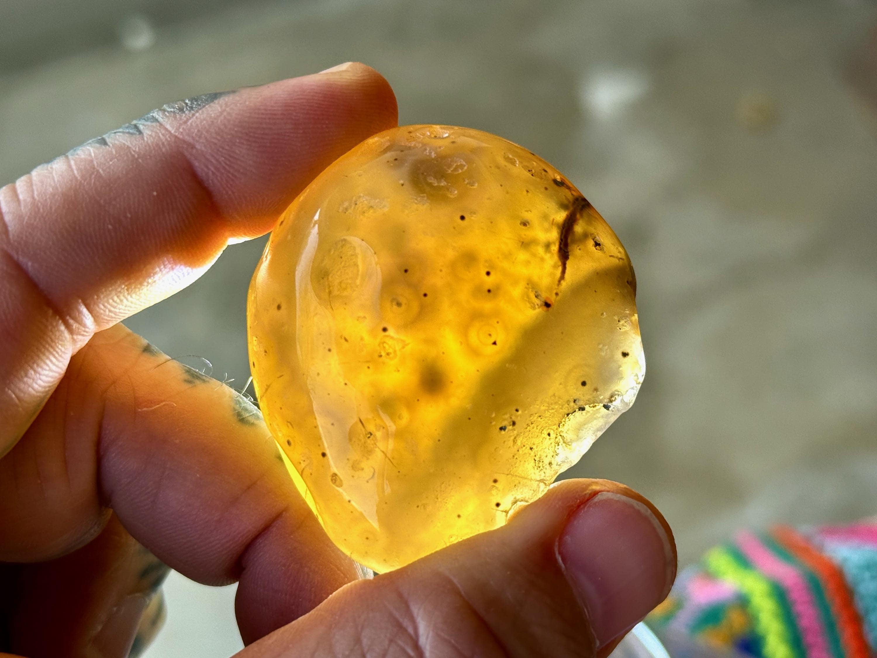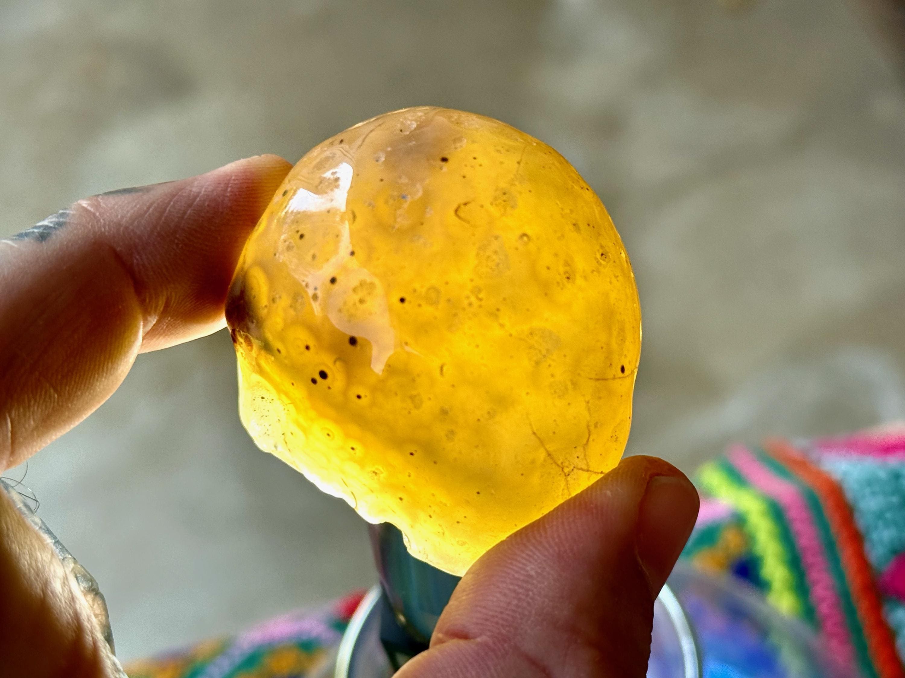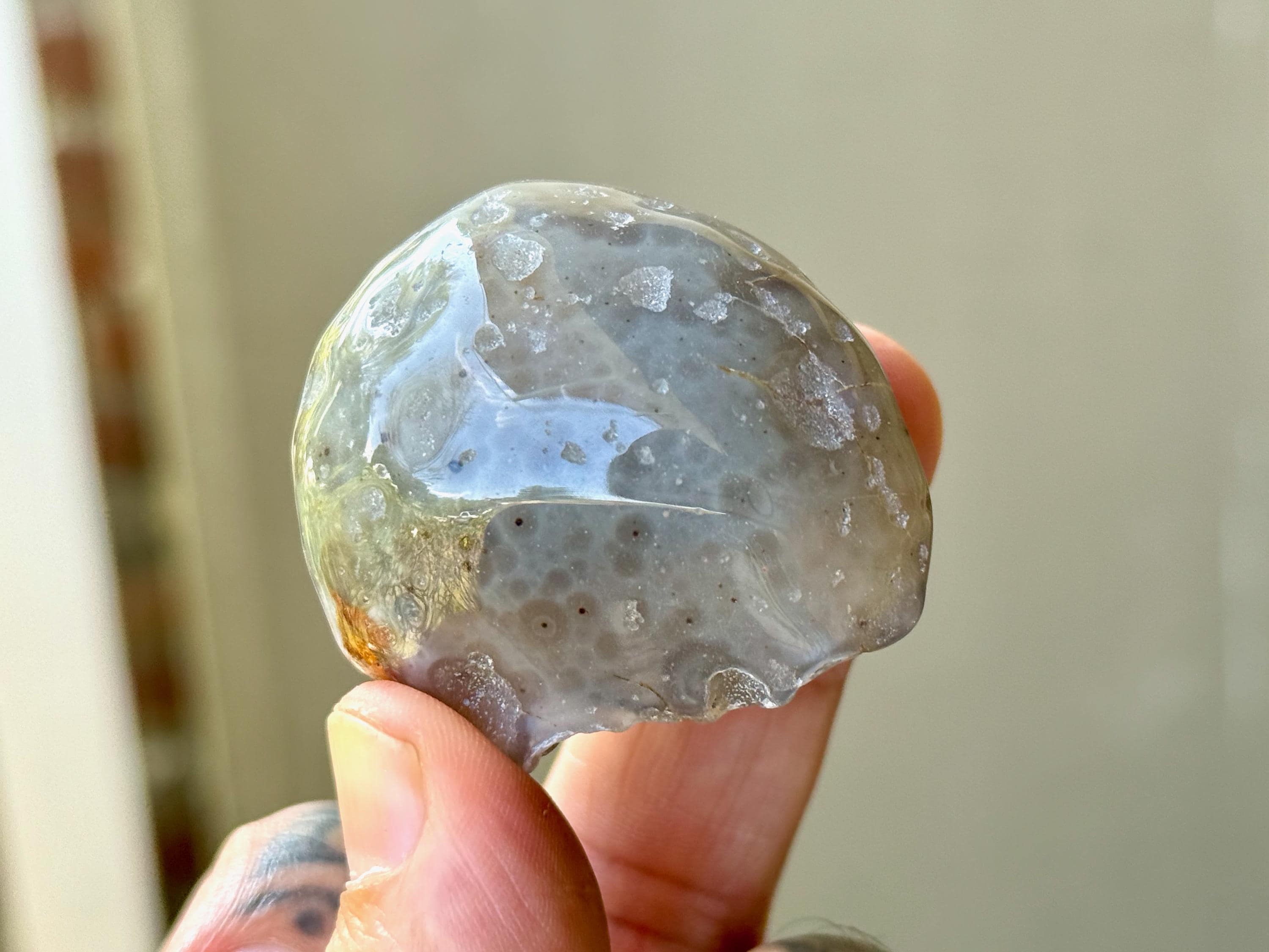 This Agate has outstanding translucency when backlit which makes it easy to see the water swishing inside. The video shows this and it will be much more evident in person. We recommend using a strong light to backlight and doing so in a darkened room to fully appreciate the water within. We've also included photos of this piece with backlighting (Photos 2-3).