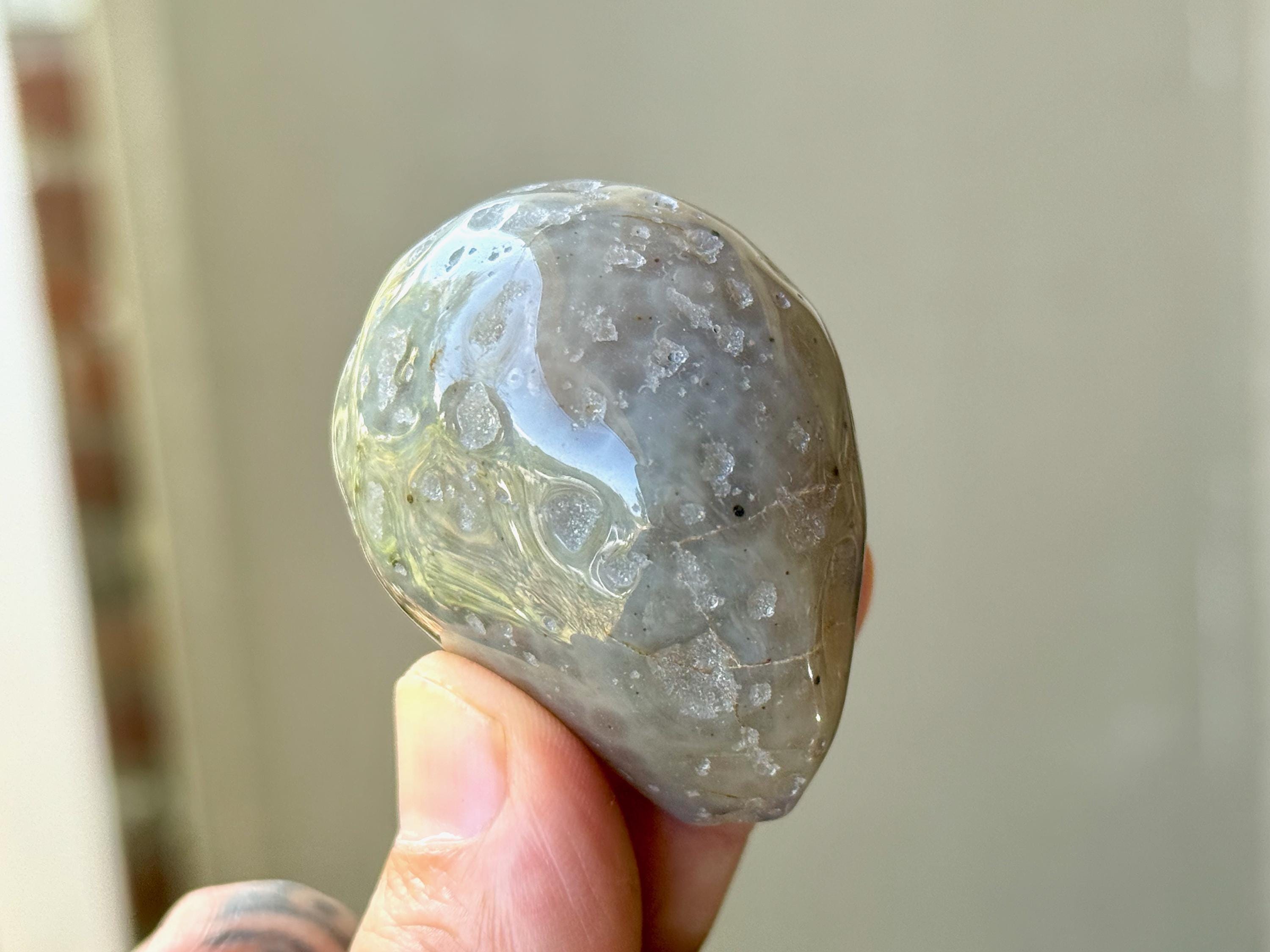 The Enhydro Agate brings a balance between the elements of the Earth and Water. Agate is a stone with the gentle protective energy of stability and composure, encouraging self-confidence and self-reliance. The inclusion of ancient water, brings an energy of increased empathy and spiritual receptivity. This is a beautiful stone for meditation and deep inner journeying.
