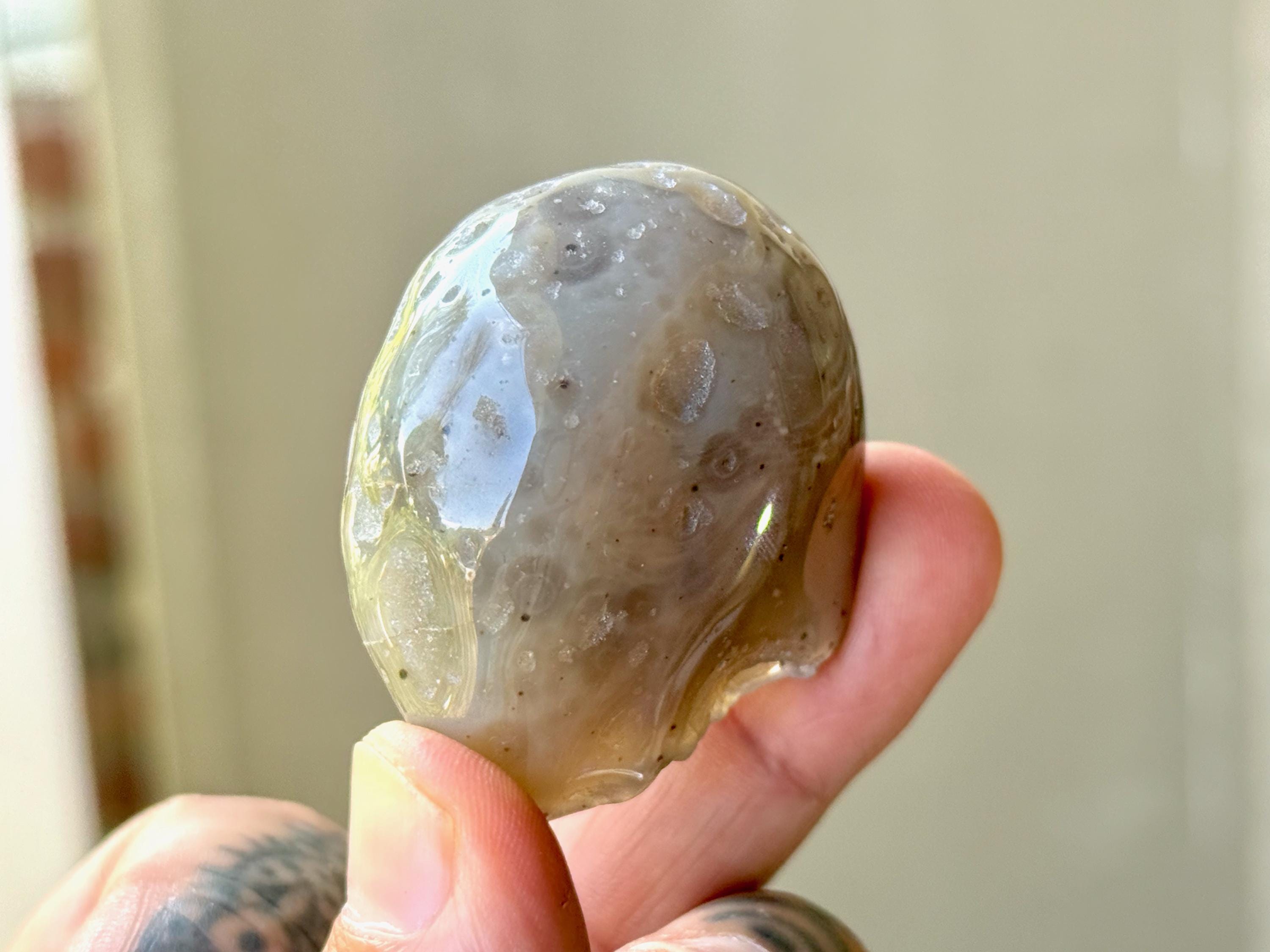 This unique Ocean Agate comes from a 2018 find in Rio Grande do Sul, Brazil. While it is absolutely beautiful to look at from a glance, it has a secret within that makes it incredibly special and rare: it contains quite a large amount of water inside!