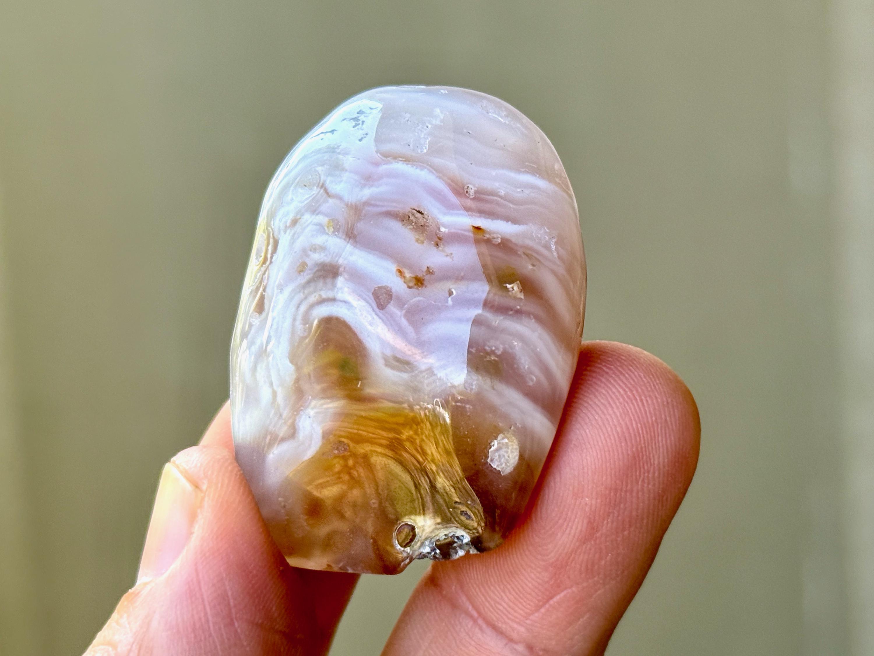 An Enhydro is the term for the natural phenomenon that occurs when water is trapped inside of an Agate (or crystal, etc) during its million-of-years development. In most cases of Enhydro Quartz (or other crystals), only a droplet of water is included, and it may move if contained within an air pocket. In the case of these Enhydro Agates, there is an ample amount of water included, so much that in most cases one can see it move if the Agate is backlit (with a flashlight), and in some cases even hear it swishing around when shaken.