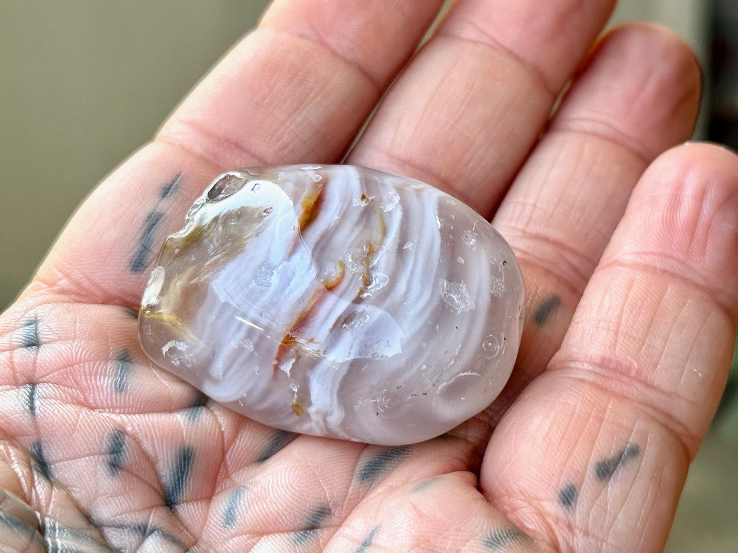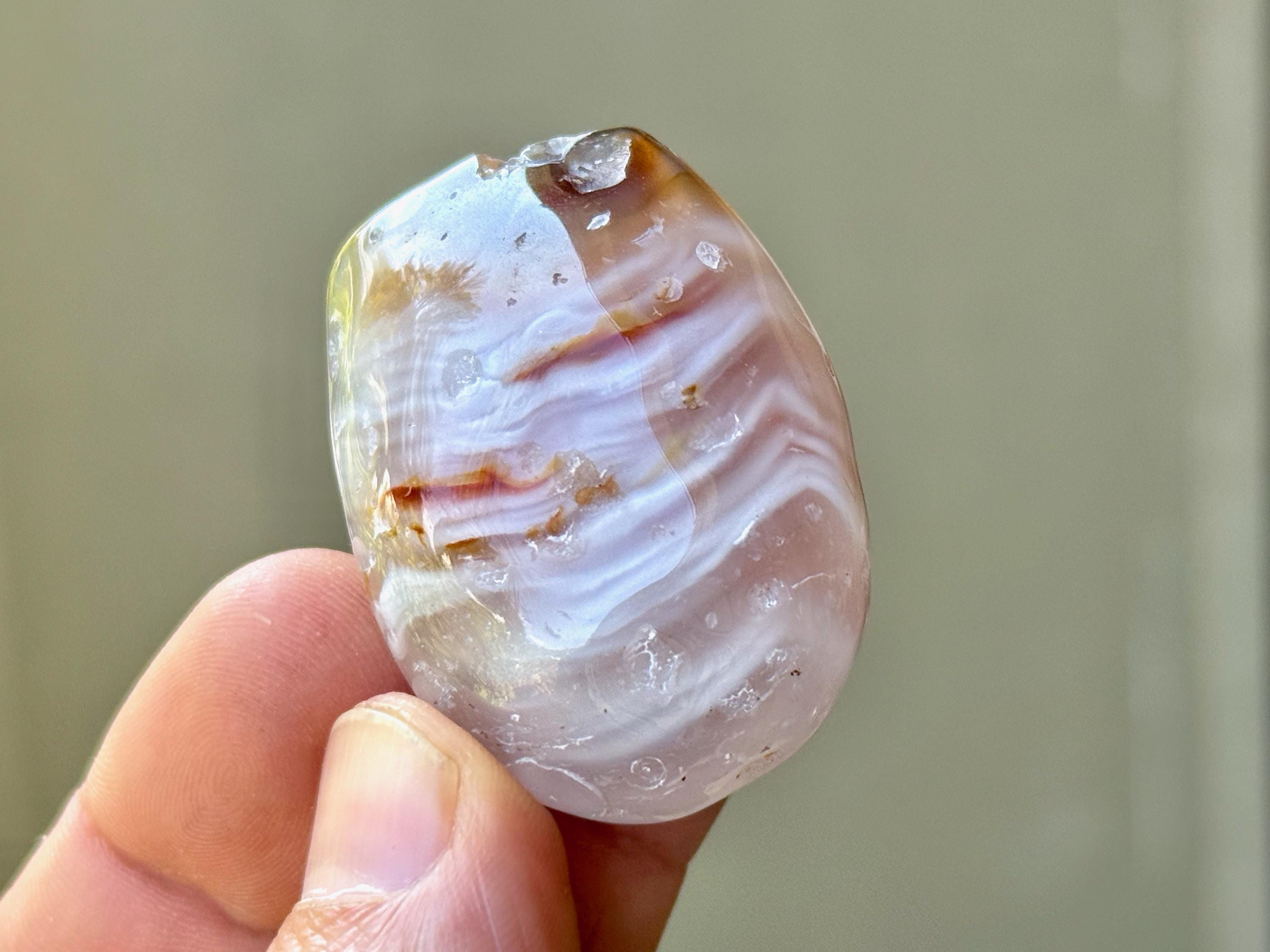 The term for this natural phenomenon is "Enhydro" and it occurs when water is trapped inside of an Agate (or crystal) during its millions-of-years development. These Agates have been polished so that one can see the water moving within when backlit (with a flashlight, for instance). In many cases, you can actually hear the water swishing if you shake it next to your ear. This is an incredibly rare phenomenon, as most Enhydro crystals contain only the smallest drop of water. These very special stones bring a balance between the elements of Earth and Water, increased spiritual receptivity and balance.