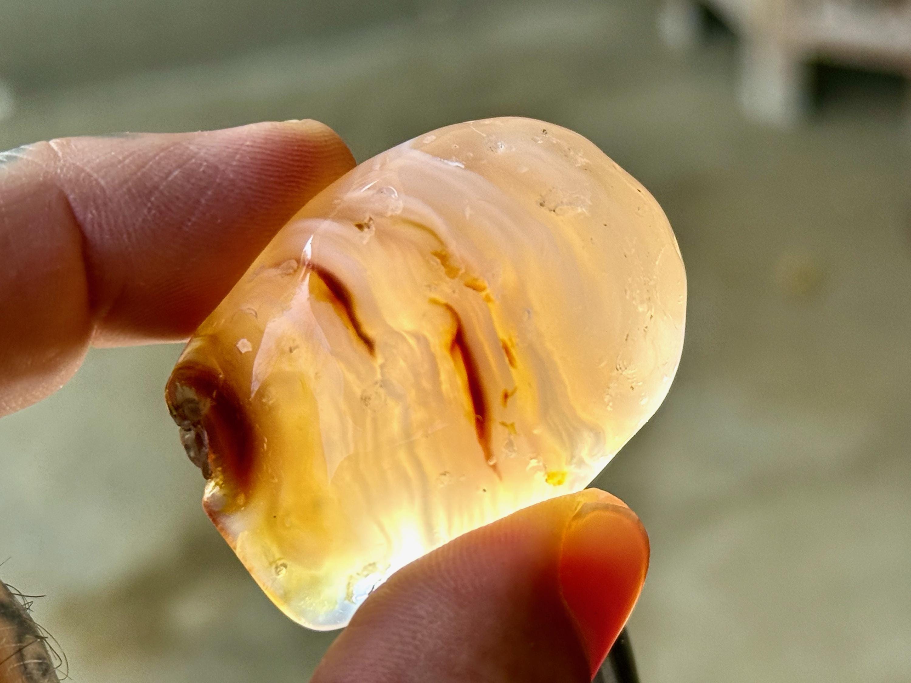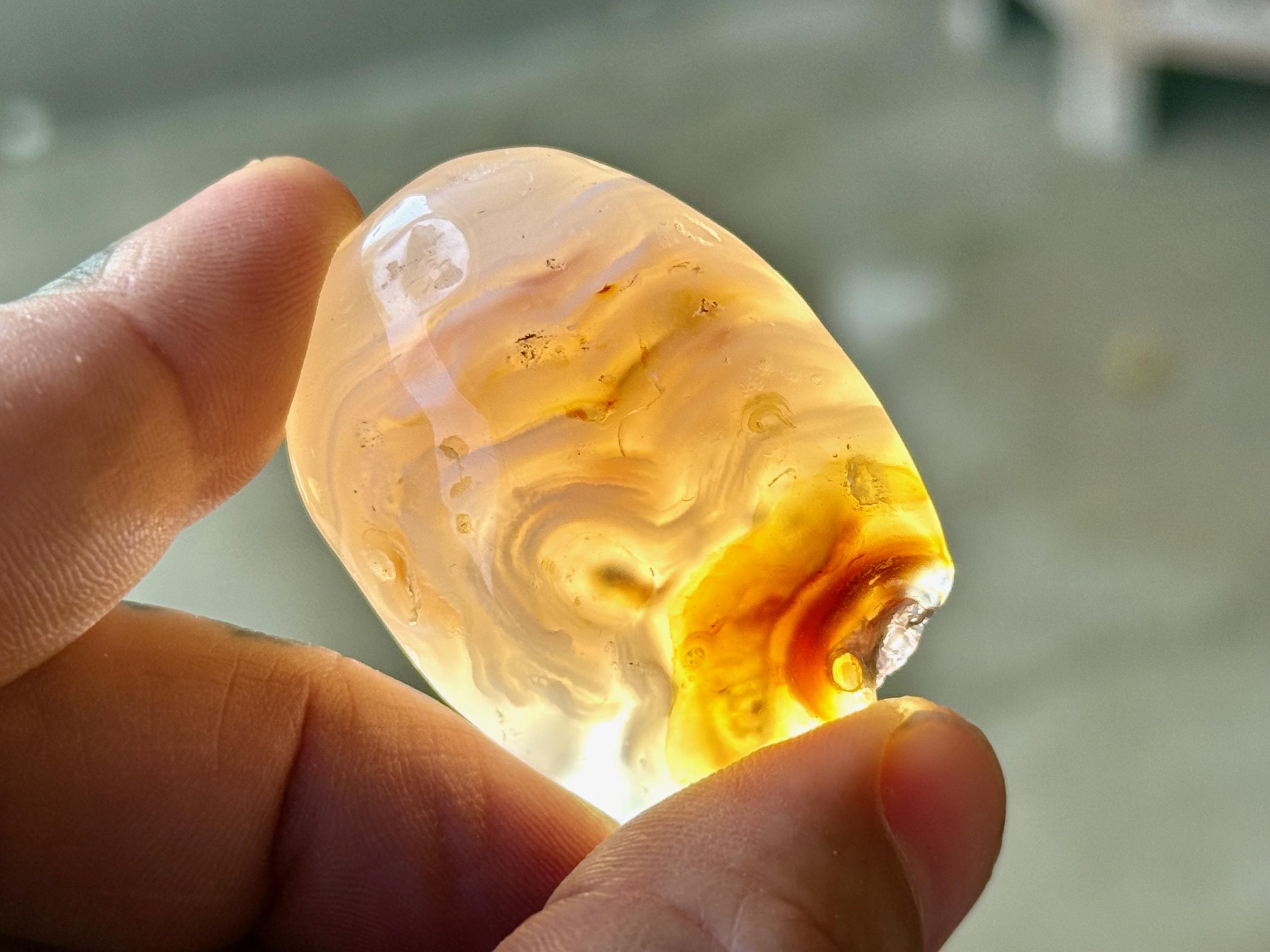 This Agate has AMAZING translucency when backlit which makes it easy to see the water swishing inside. The video shows this and it will be much more evident in person. We recommend using a strong light to backlight and doing so in a darkened room to fully appreciate the water within. We've also included photos of this piece with backlighting (Photos 2-3).