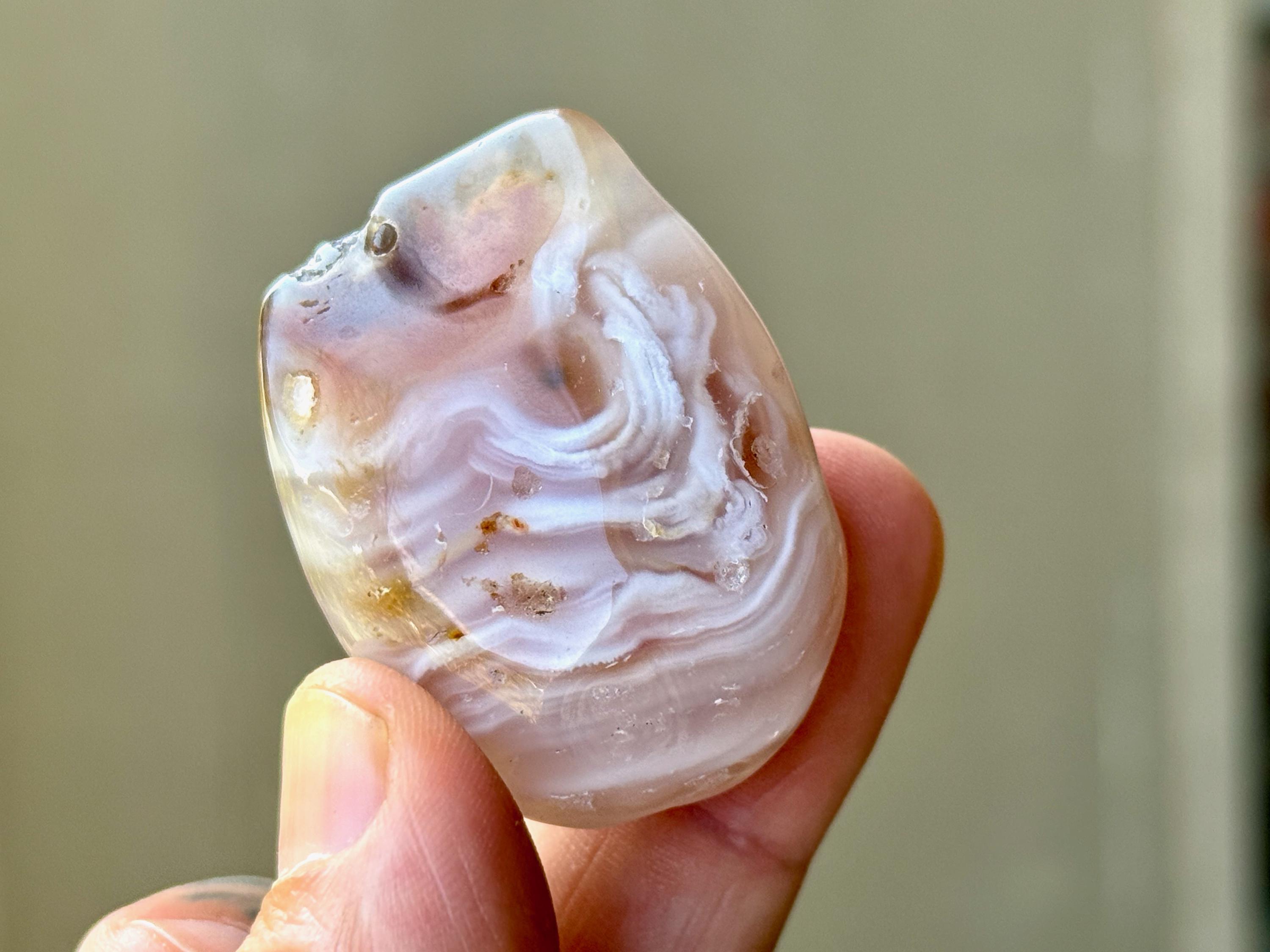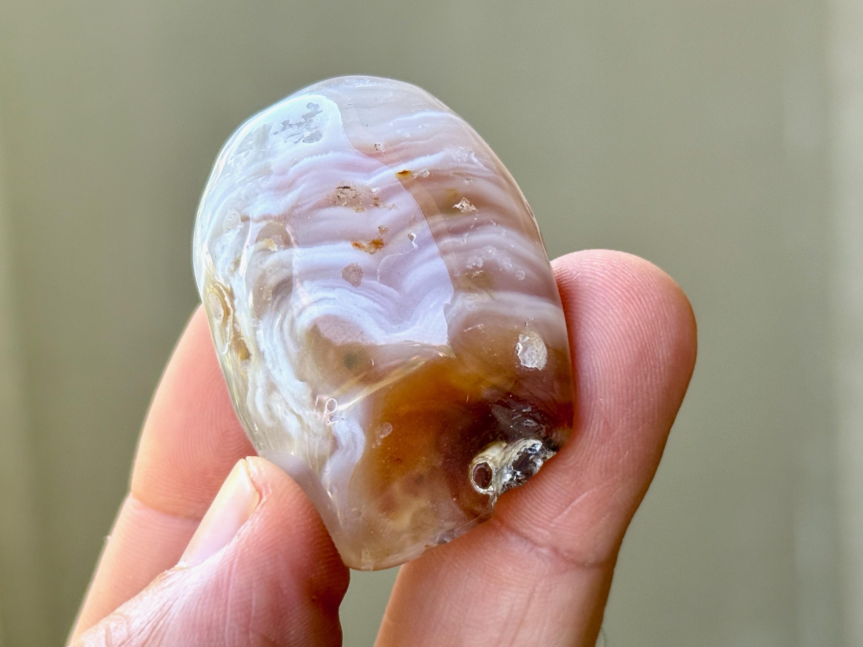 This beautiful Ocean Agate comes from a 2018 find in Rio Grande do Sul, Brazil. While it is absolutely beautiful to look at from a glance, it has a secret within that makes it incredibly special and rare: it contains quite a large amount of water inside!