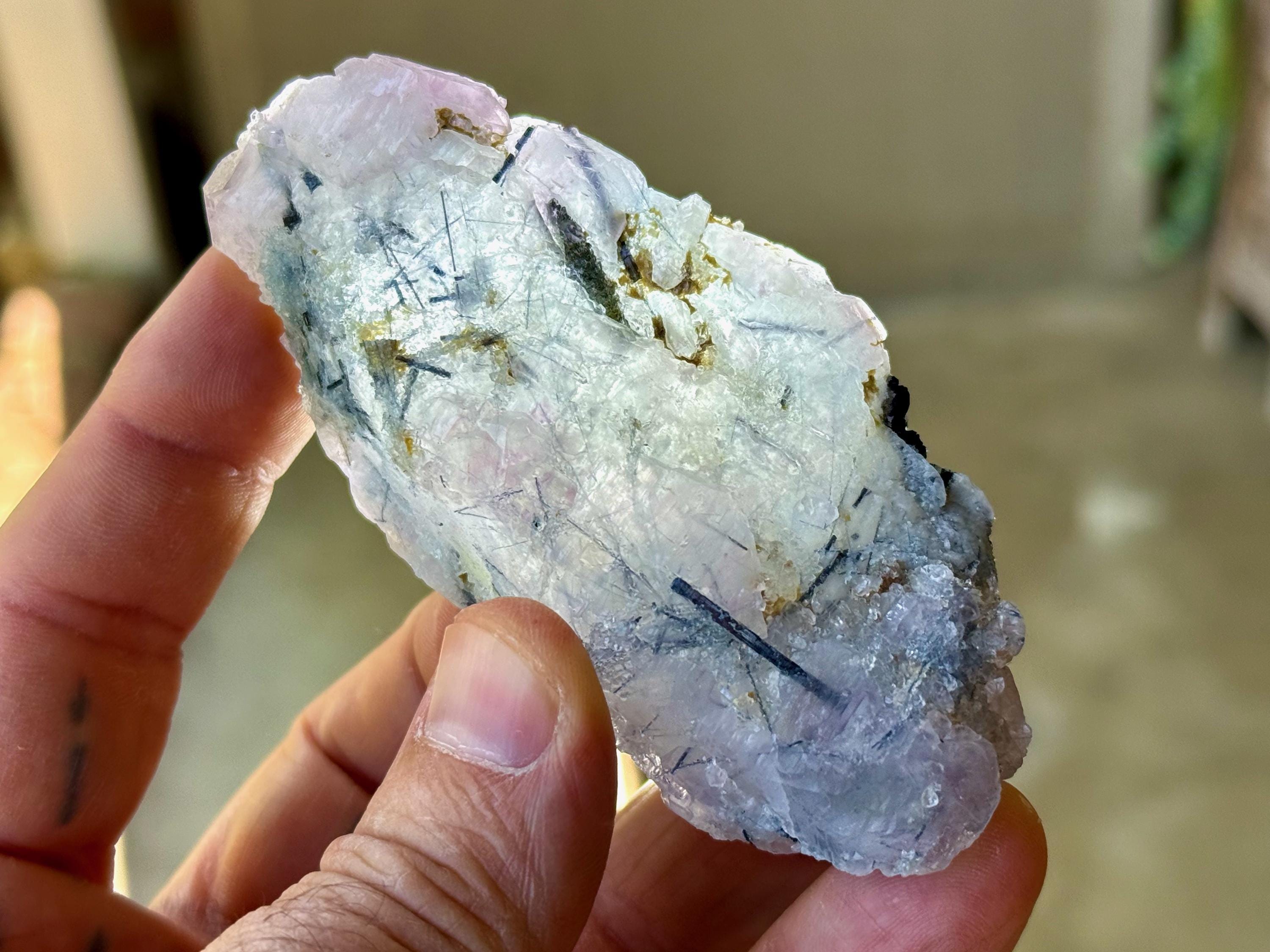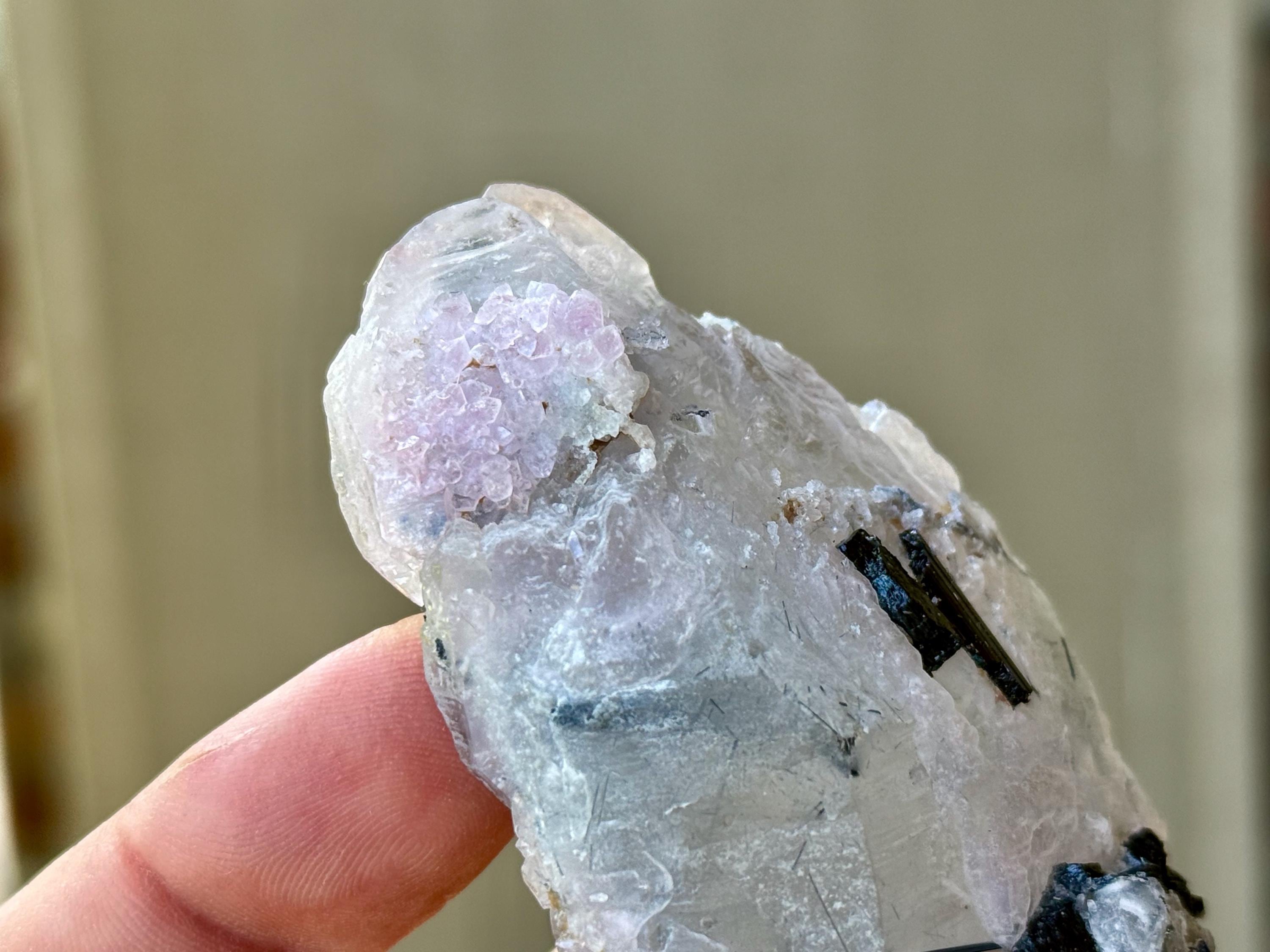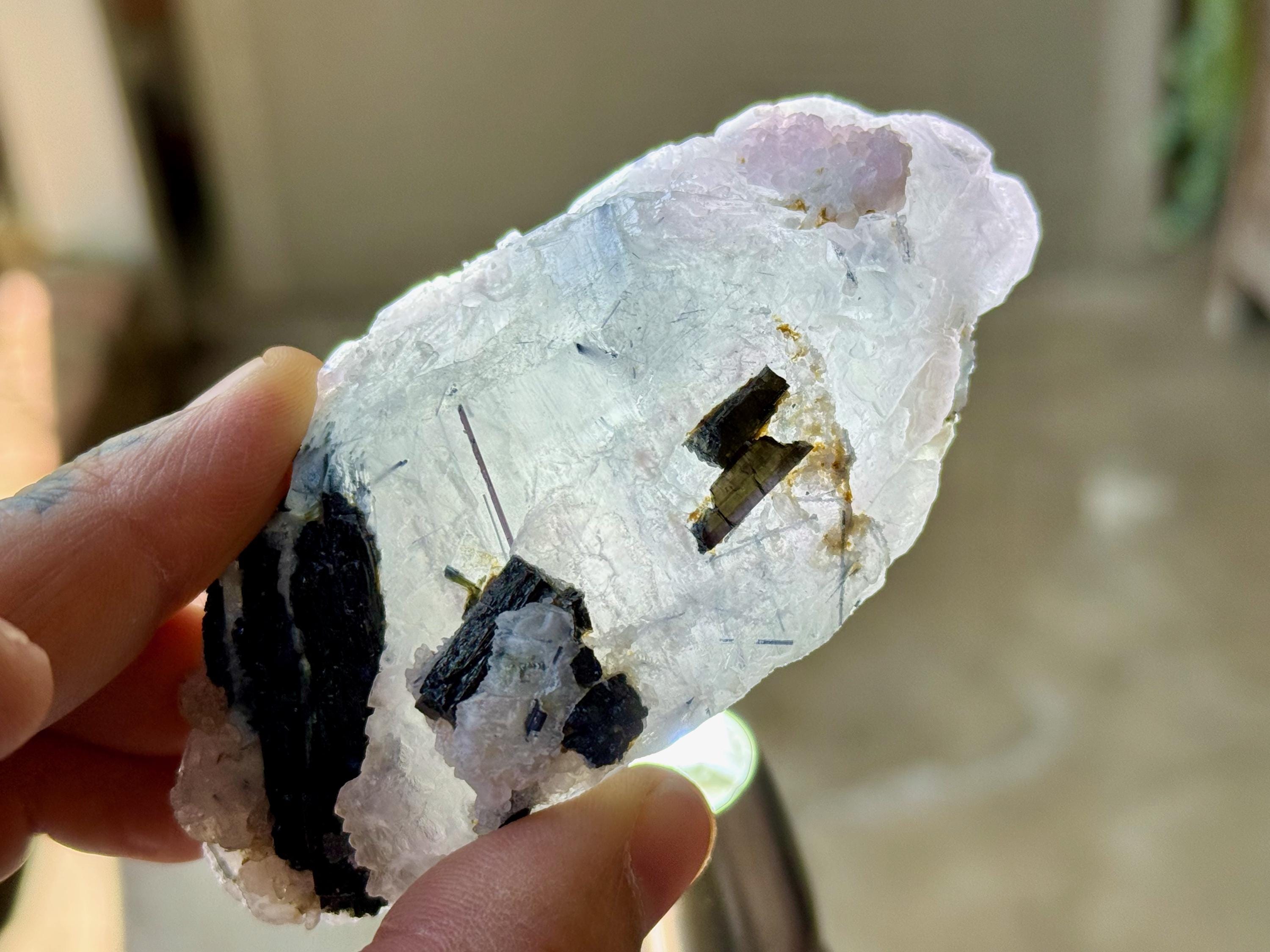 It comes from a small pocket where both Blue Tourmaline and Canga Rose Quartz were growing together, resulting in mild Canga Rosa inclusions. Blue Tourmaline is an exceptional tool for spiritual or healing practitioners for its ability to receive and transmute the high vibrations of the spirit realm. I