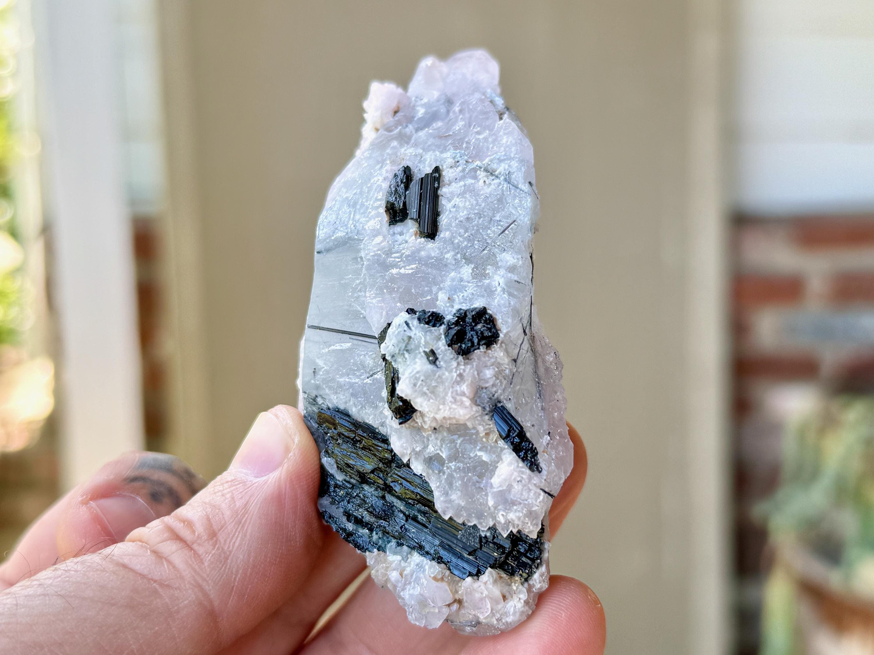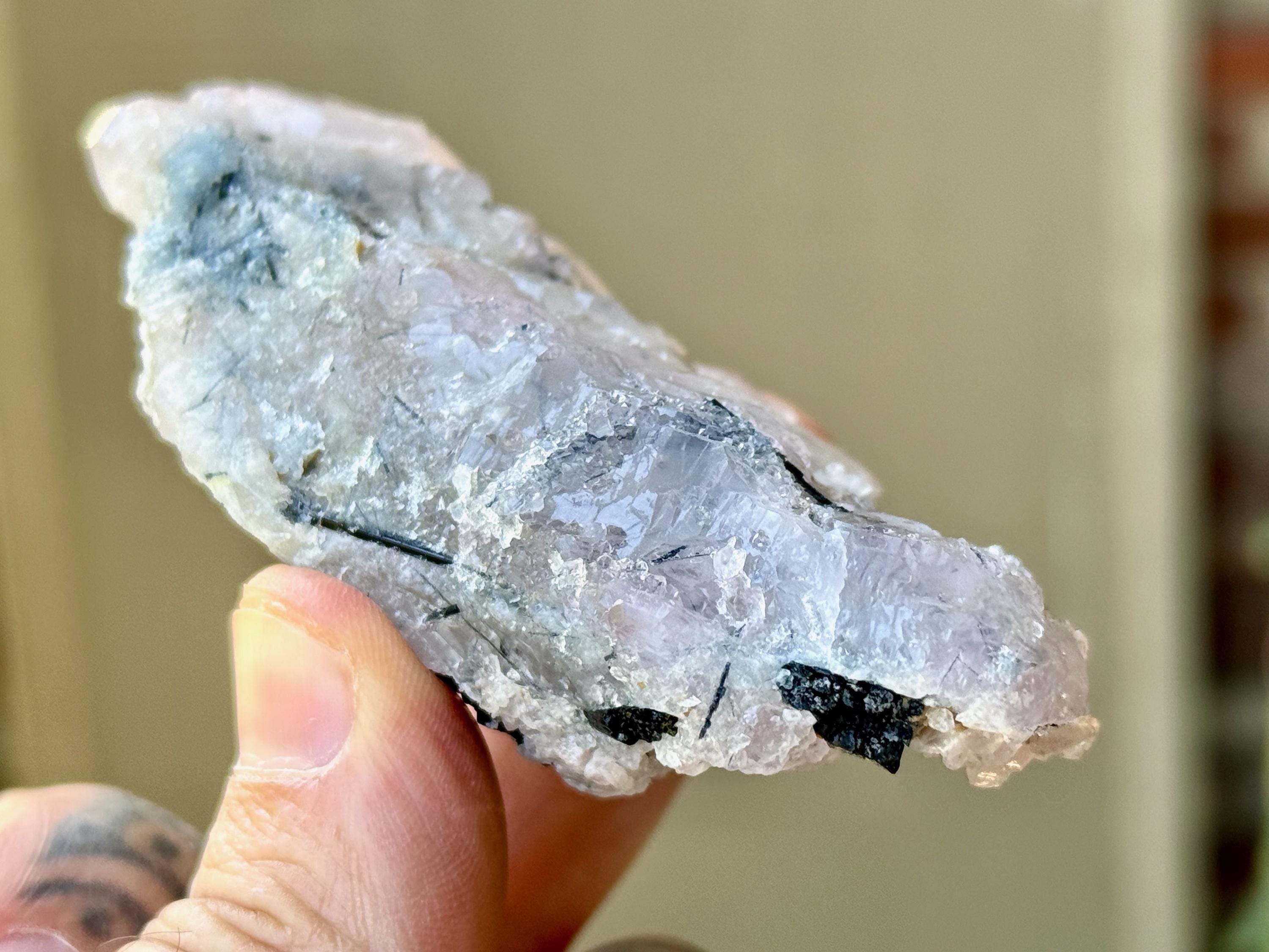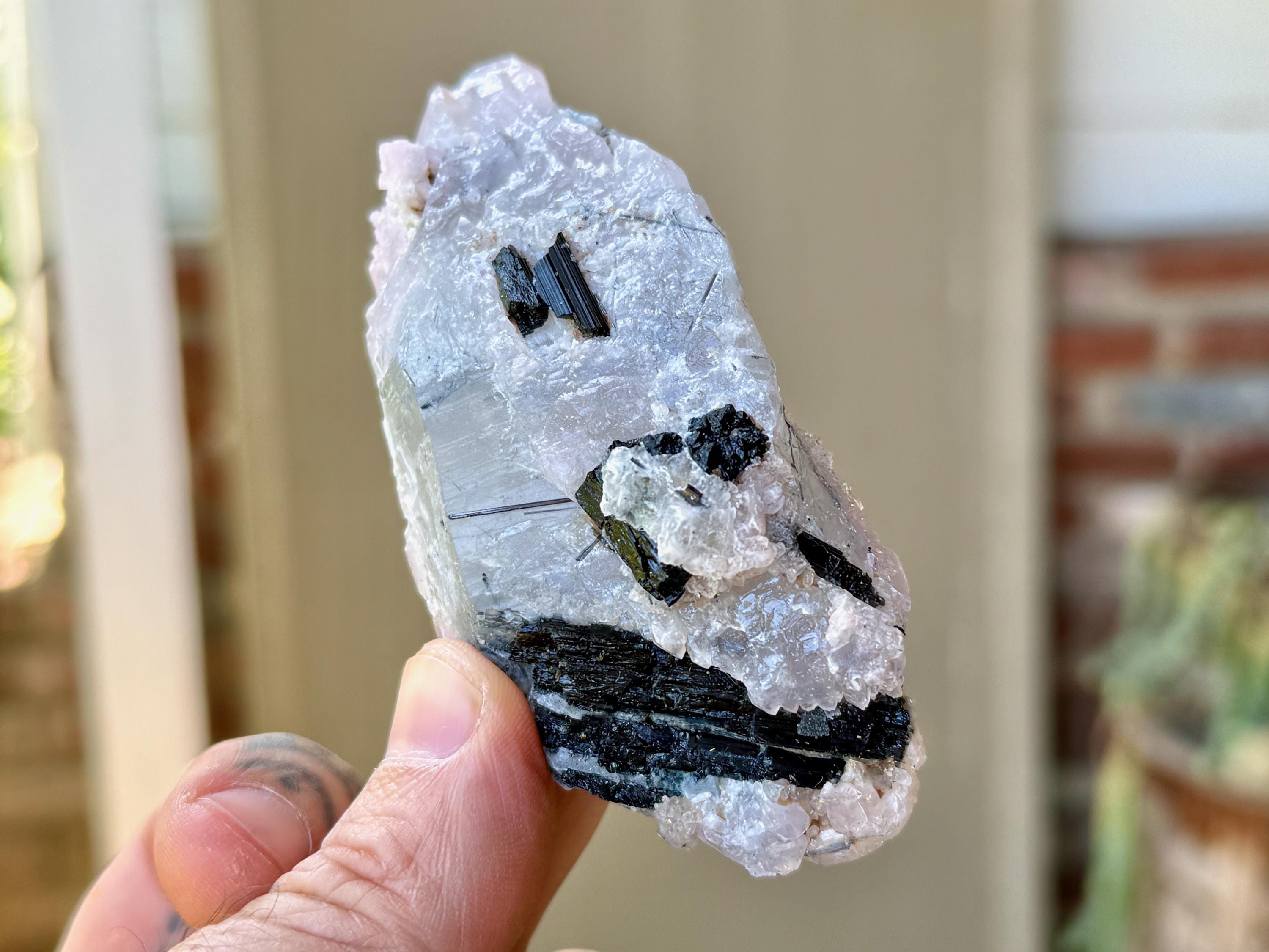 It comes from a small pocket where both Blue Tourmaline and Canga Rose Quartz were growing together, resulting in mild Canga Rosa inclusions. Blue Tourmaline is an exceptional tool for spiritual or healing practitioners for its ability to receive and transmute the high vibrations of the spirit realm. I