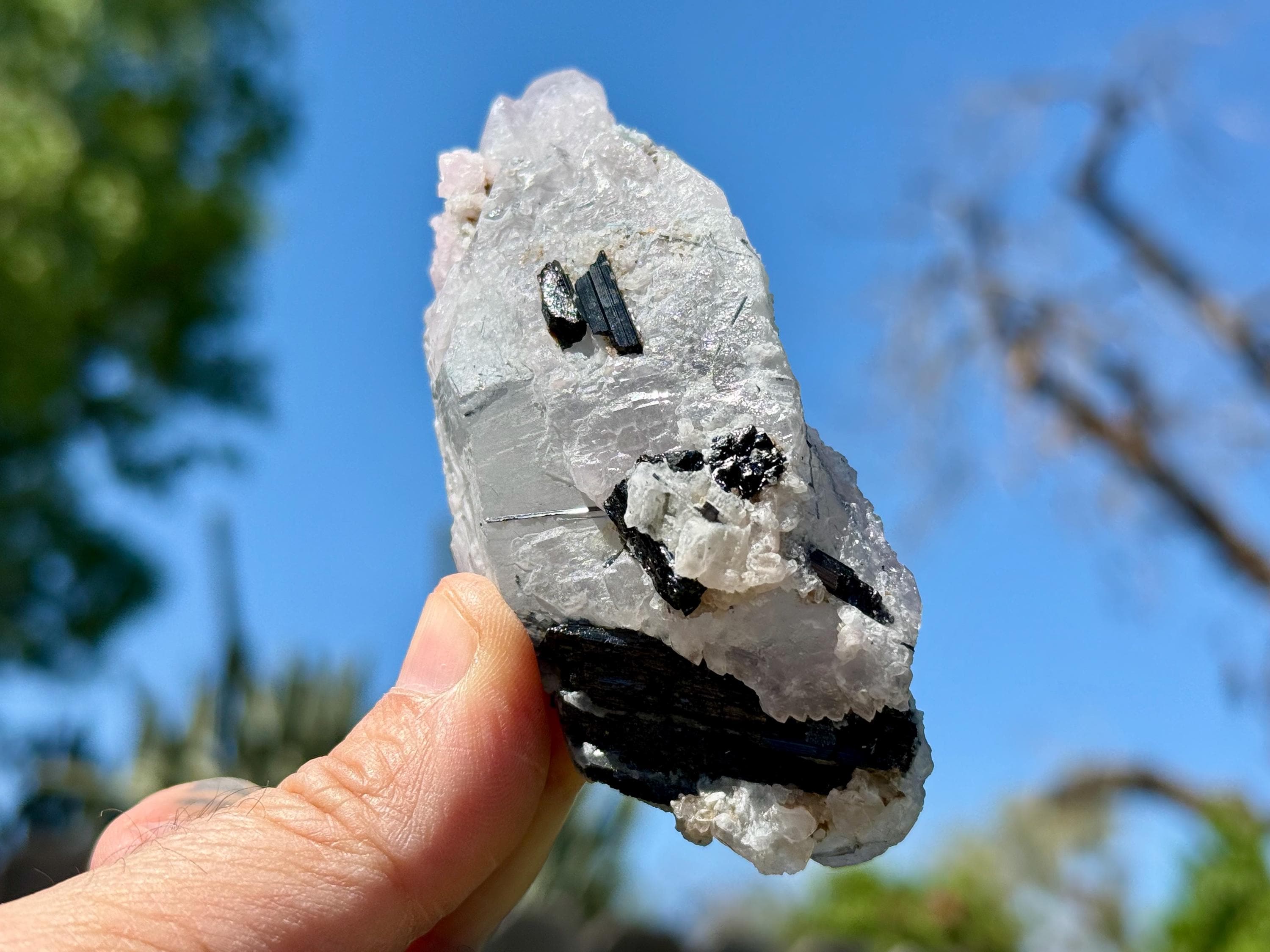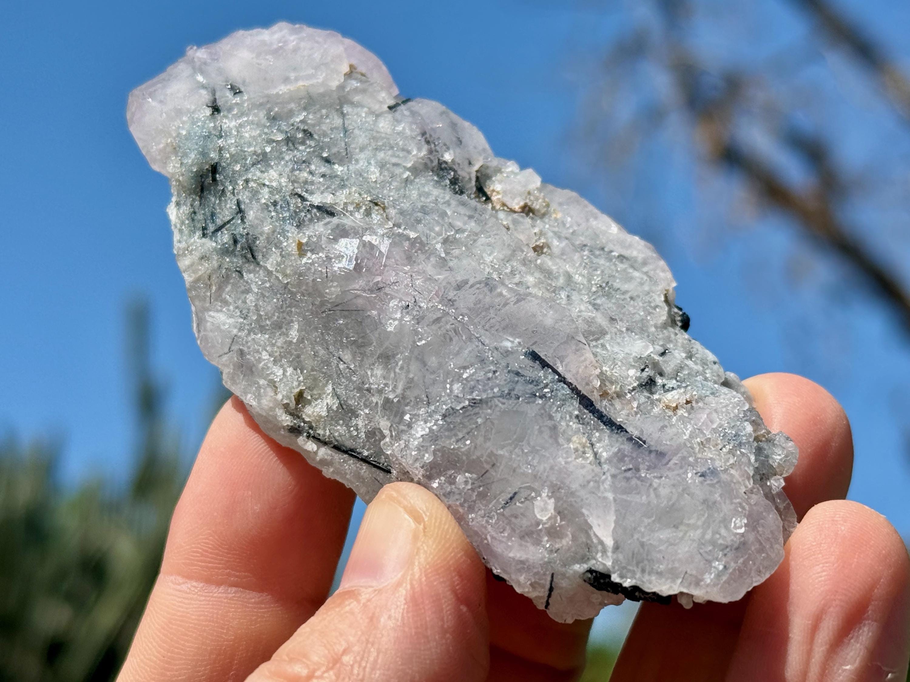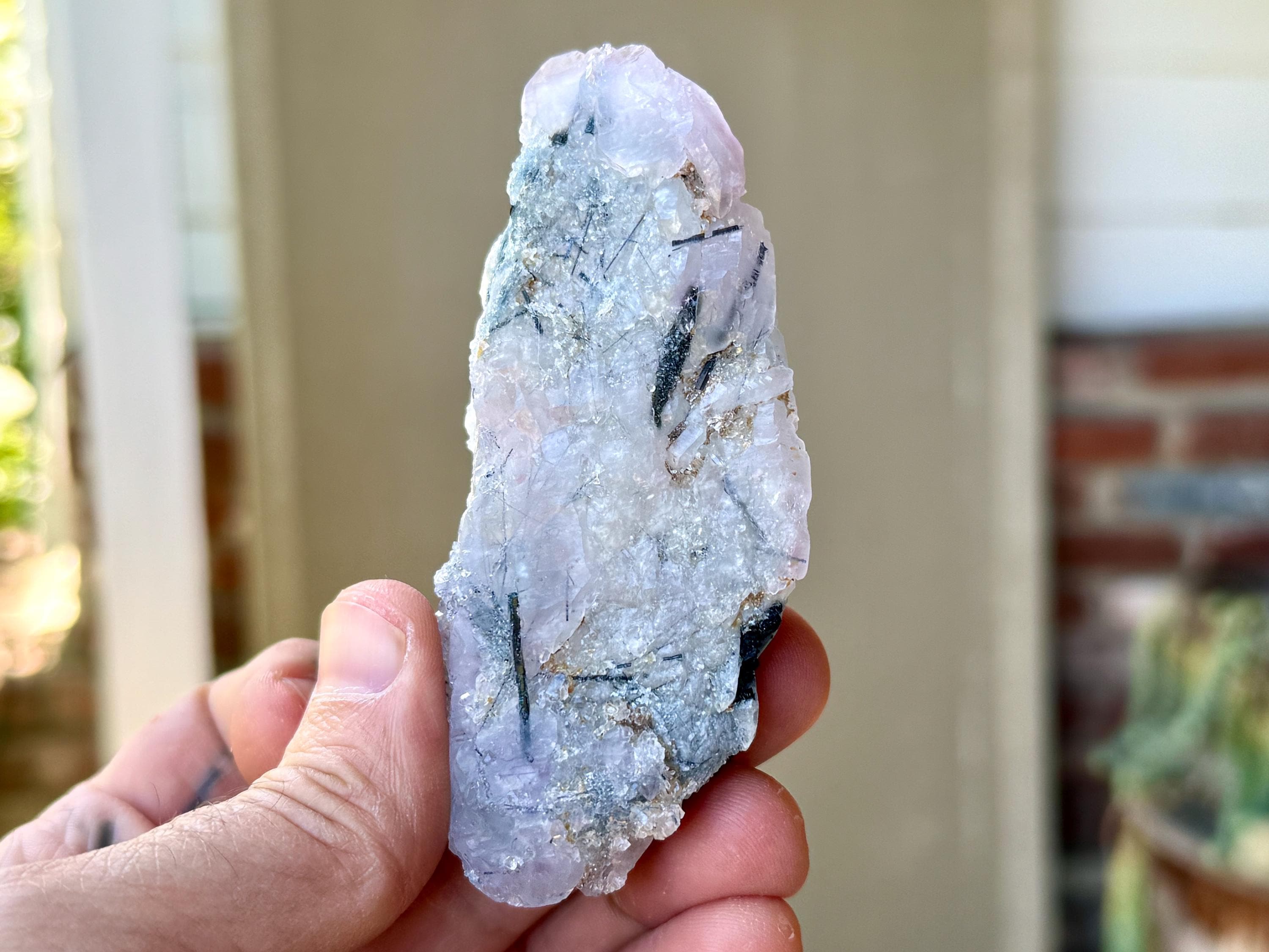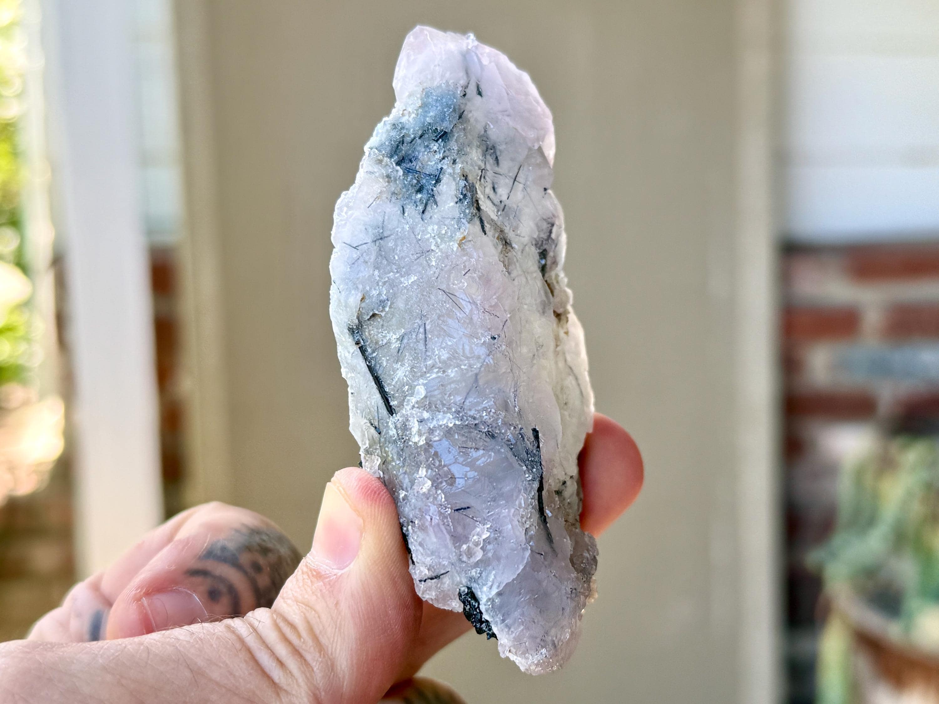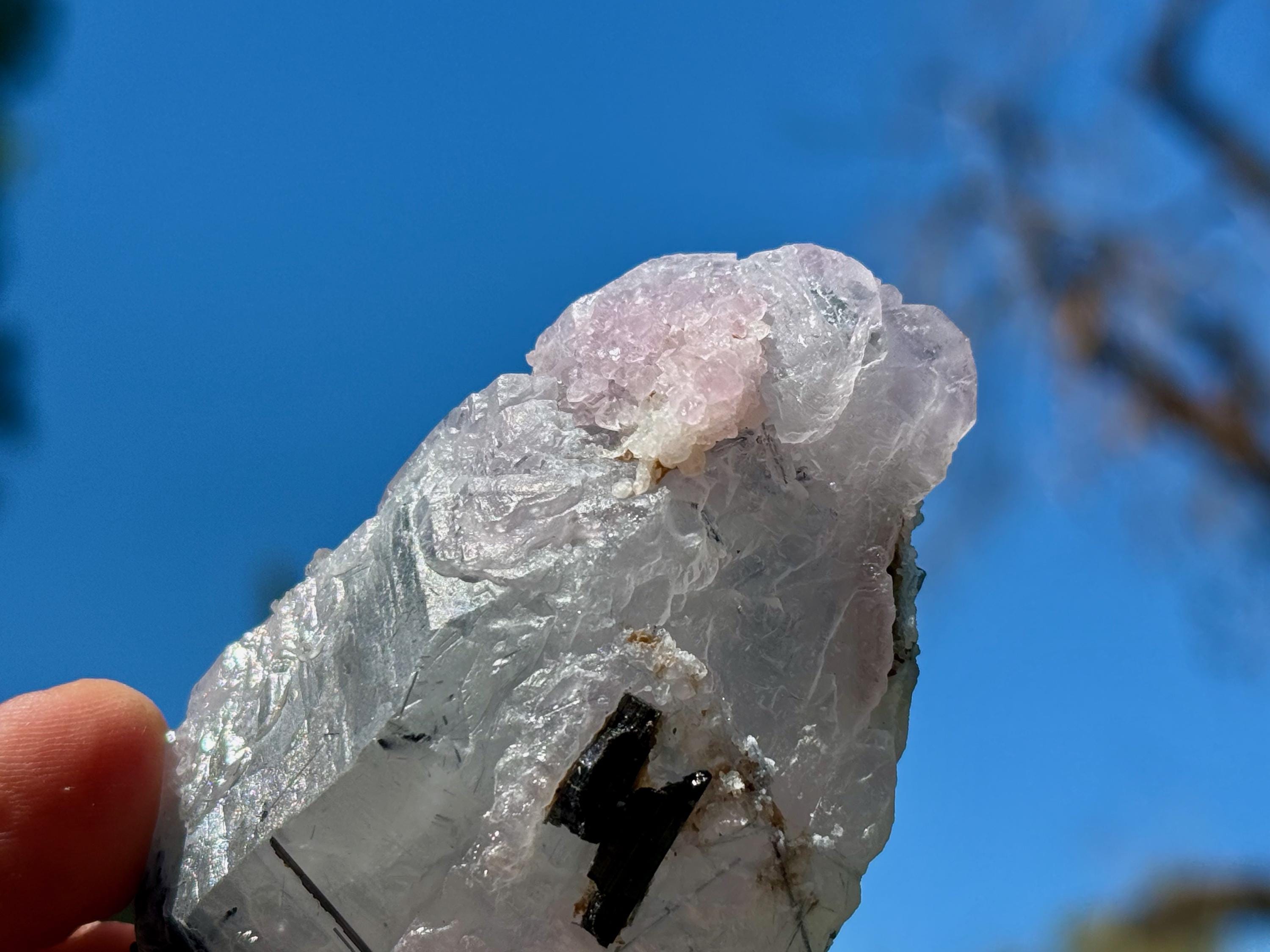 This Blue Tourmaline Quartz with Canga Rose Quartz inclusions comes from a 2025 find in Taquaral, Minas Gerais, Brazil.