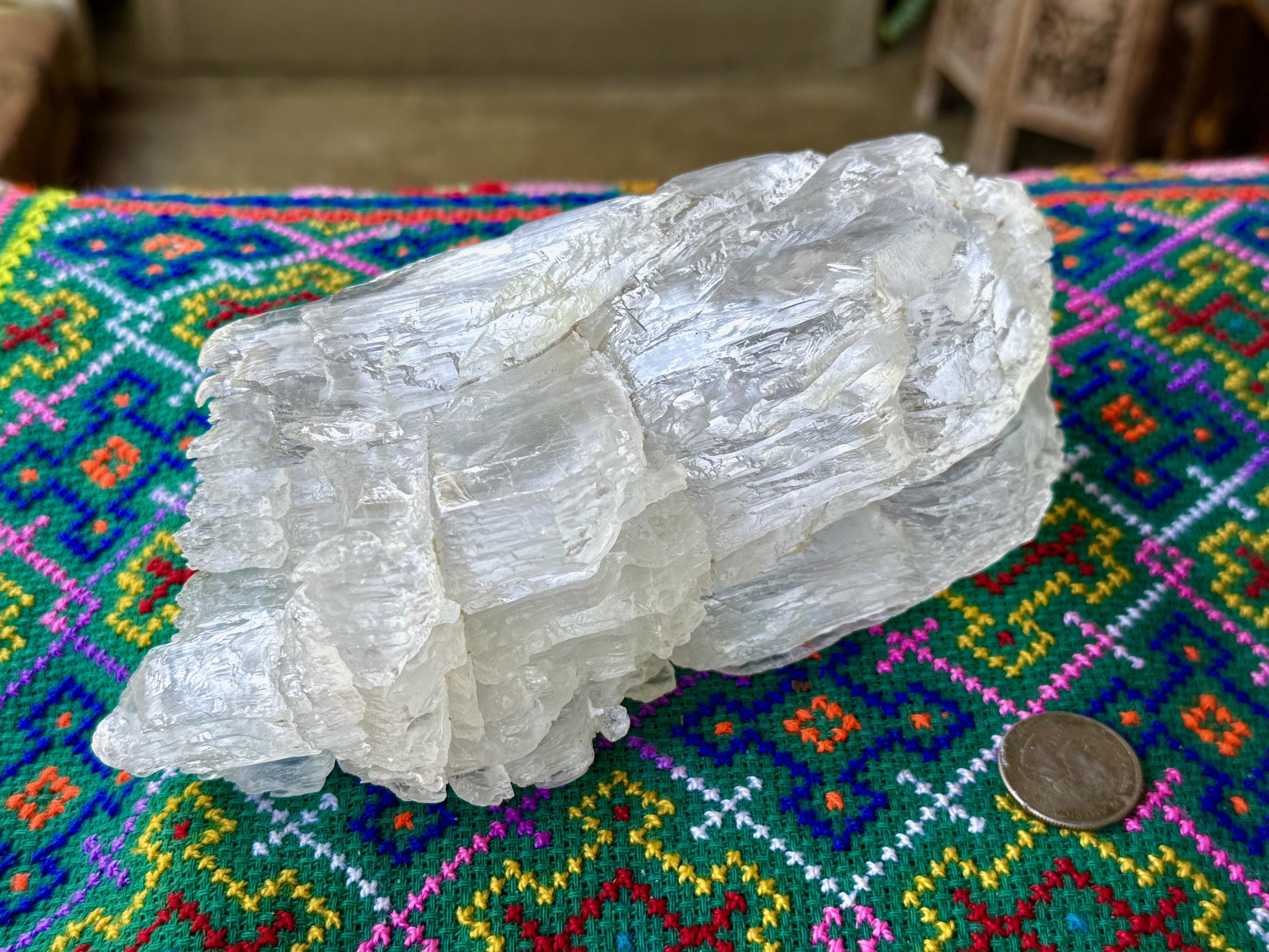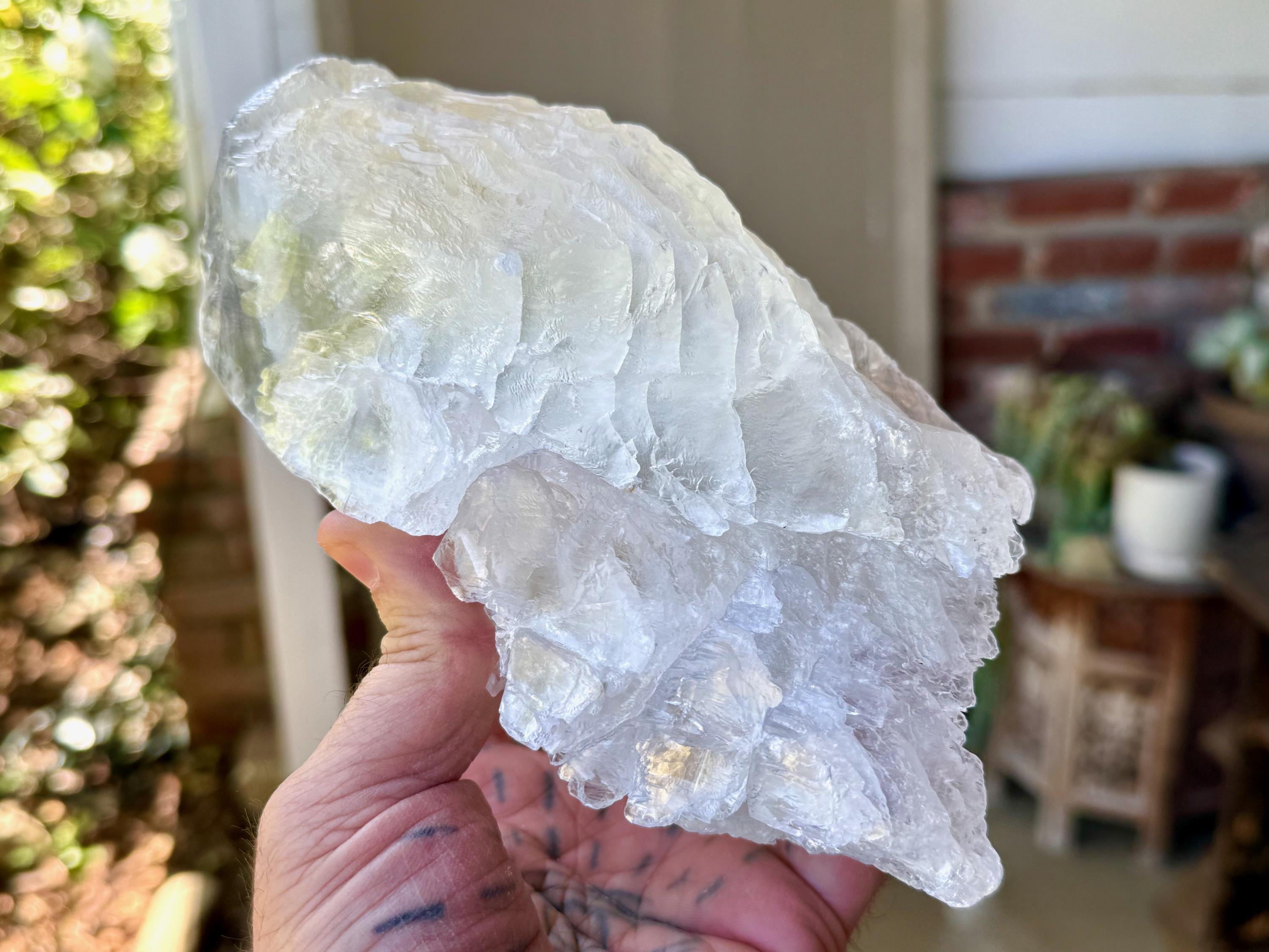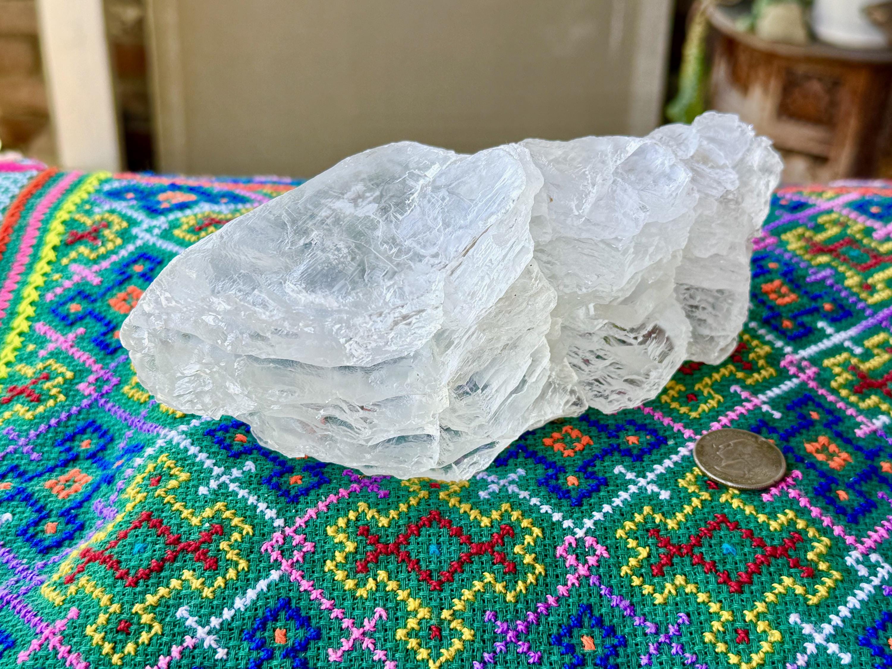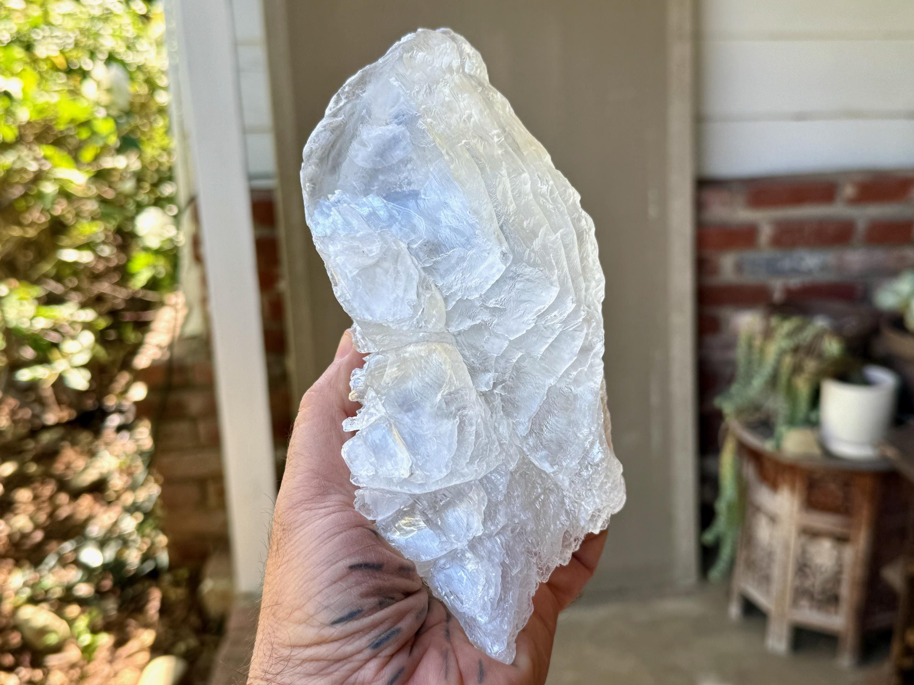 One of the largest pieces from this collection! Spectacular, icy luster to this brilliant Selenite crystal in a layered formation, with so many natural etchings and crevices throughout. This piece has a broad and flat underside that allows it to sit nicely for display, as pictured. Outstanding quality to this one!
