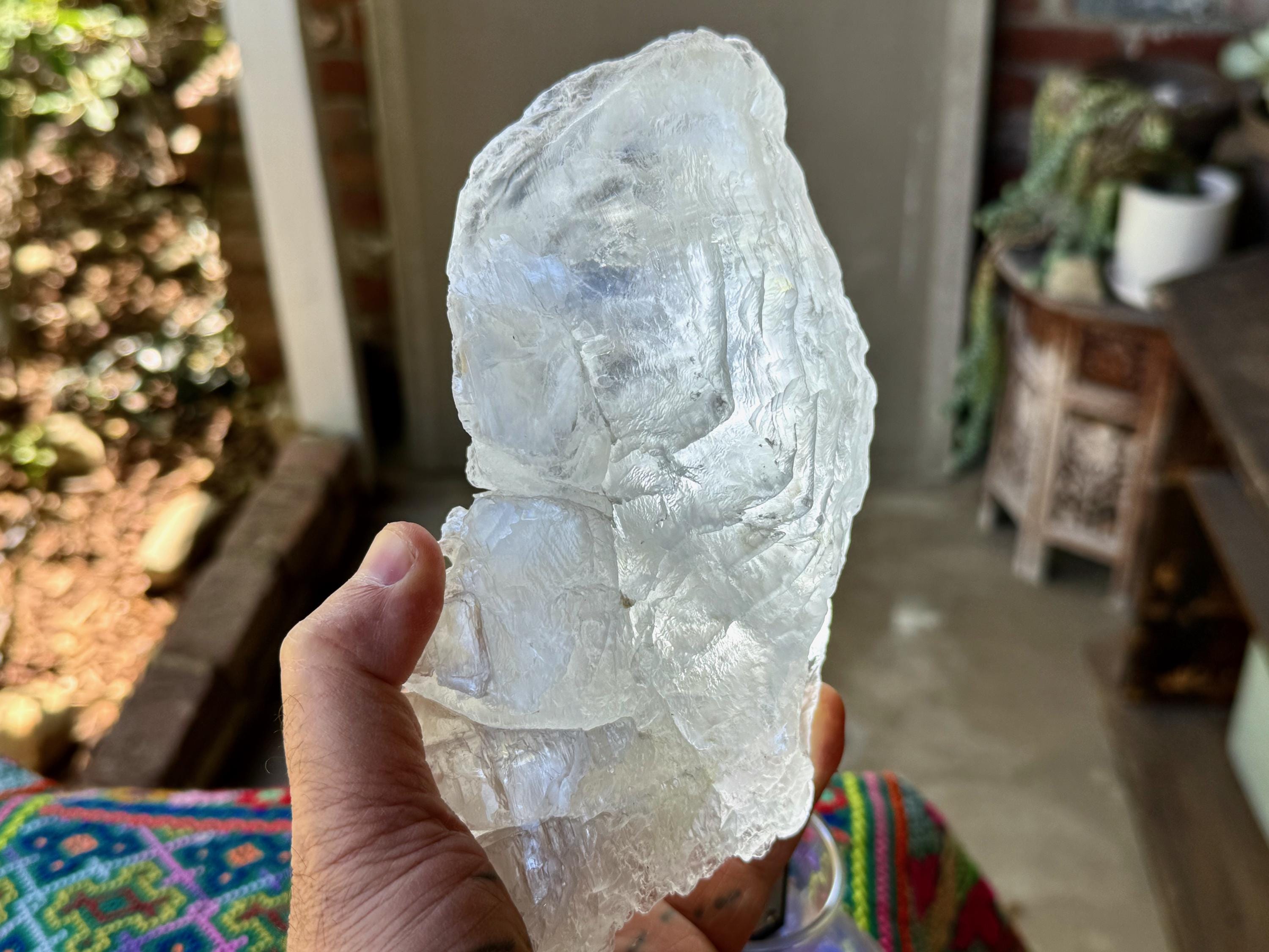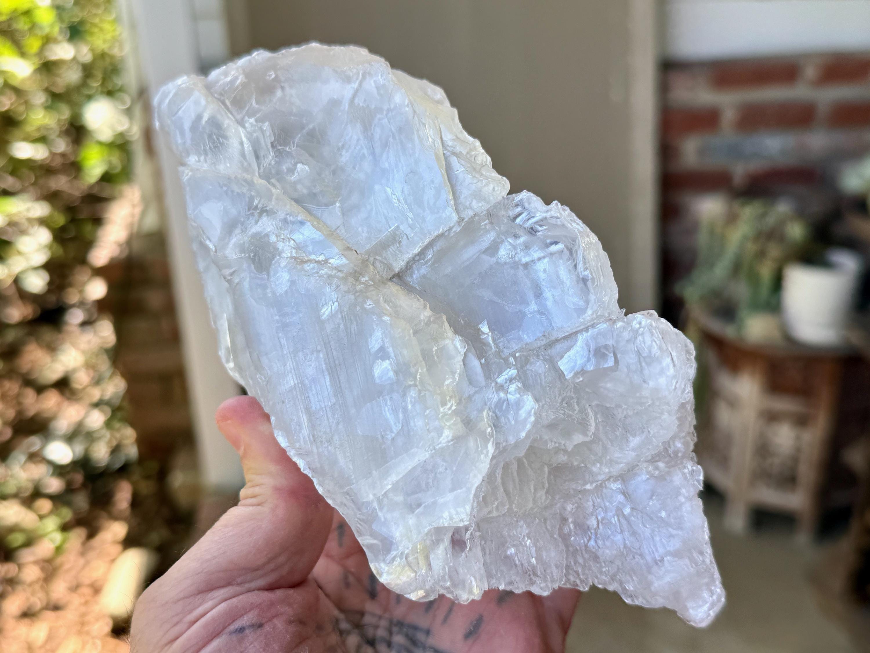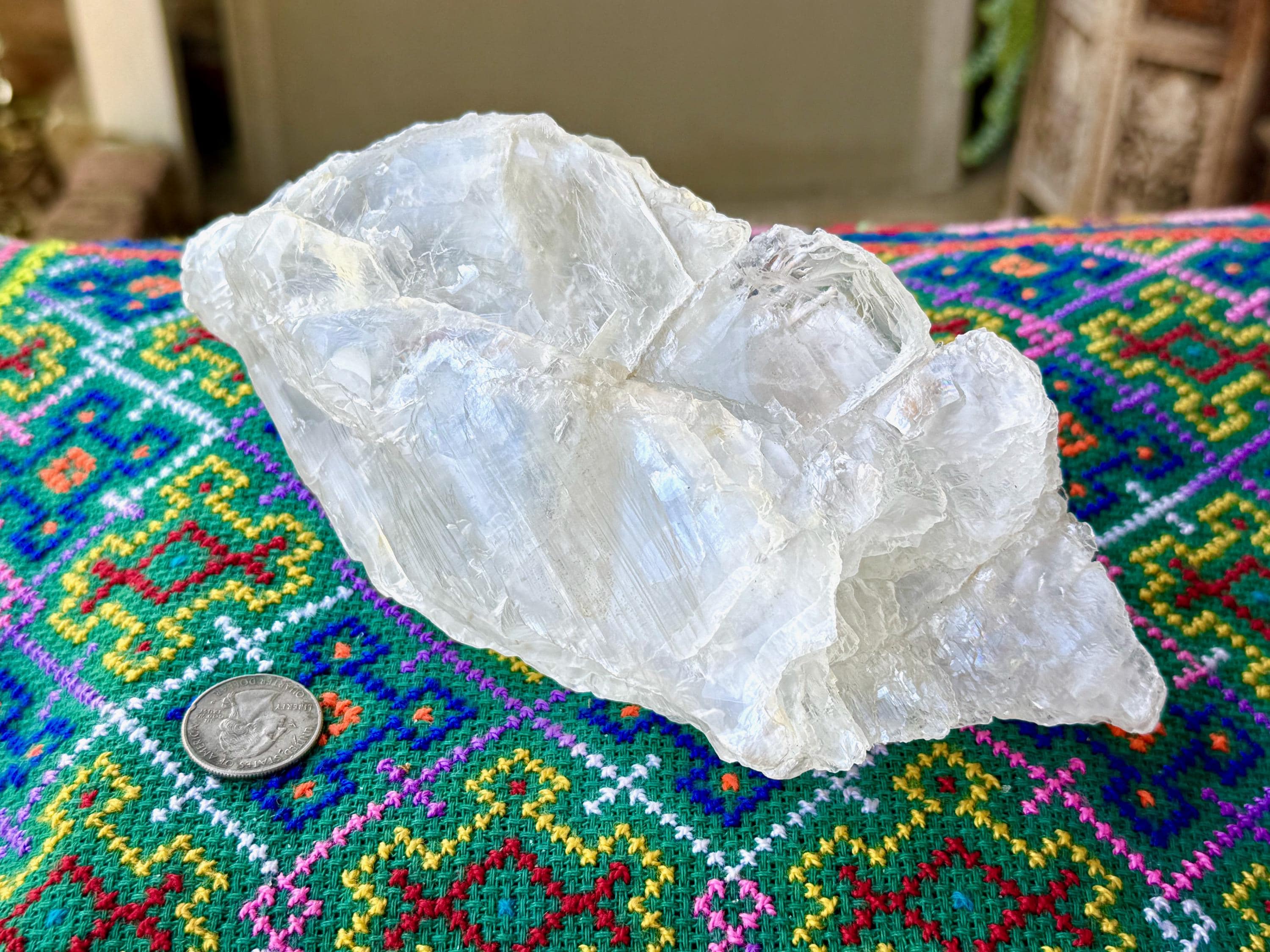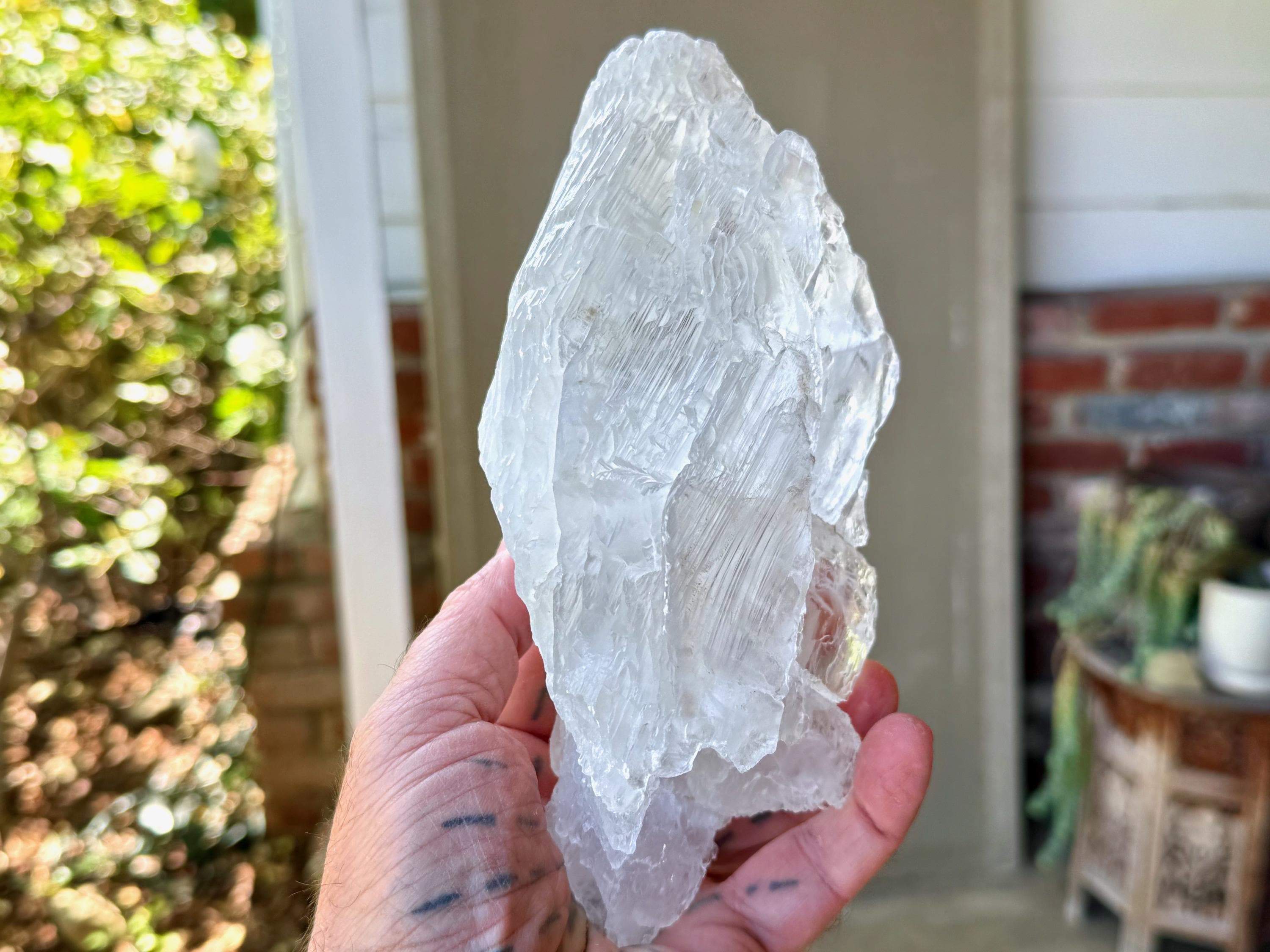 One of the largest pieces from this collection! Spectacular, icy luster to this brilliant Selenite crystal in a layered formation, with so many natural etchings and crevices throughout. This piece has a broad and flat underside that allows it to sit nicely for display, as pictured. Outstanding quality to this one!