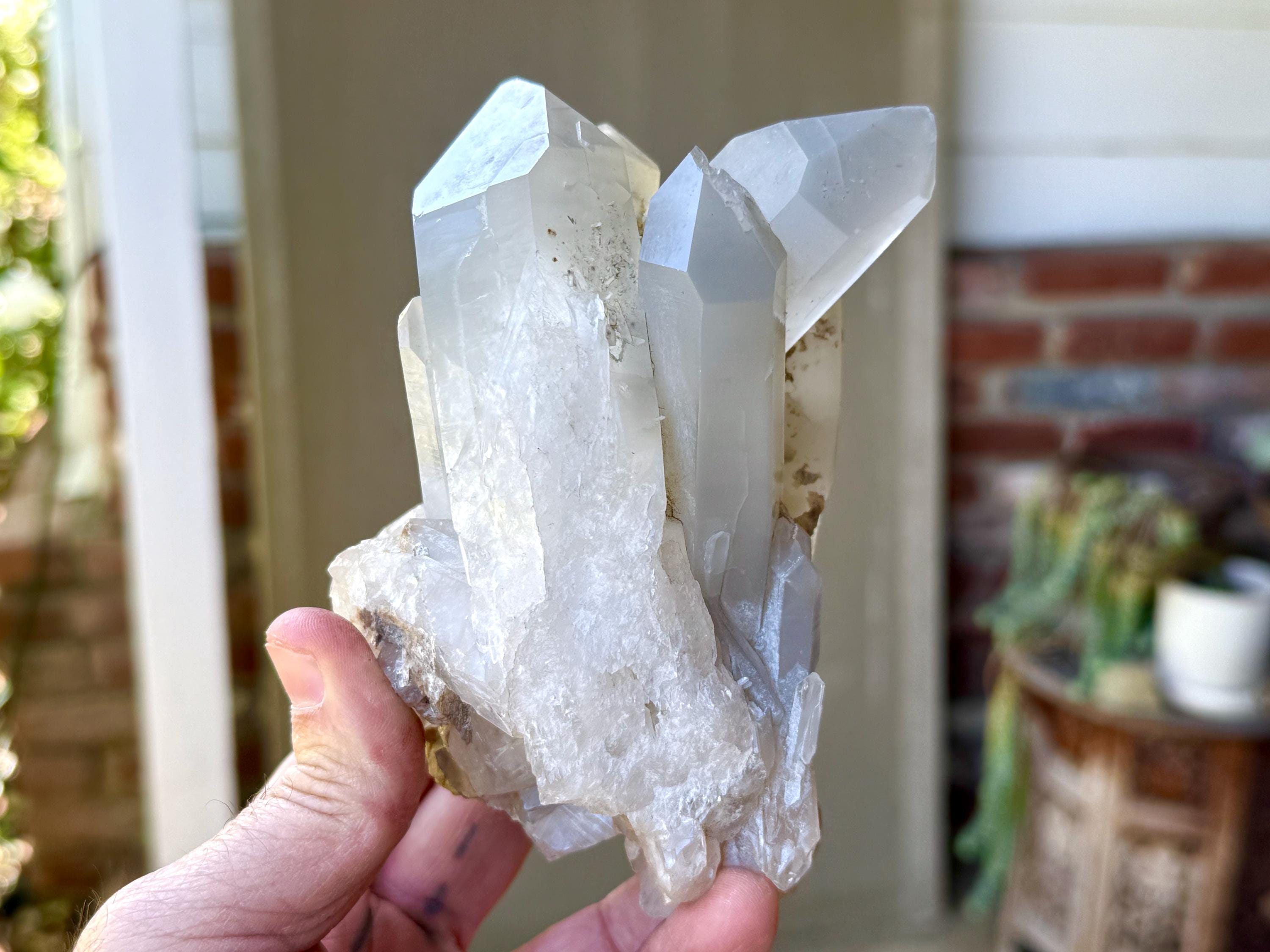While some crystals from this find displayed vibrant inclusions of Green Chlorite, this crystal has more of a whitish-grey, milky complexion due to a different kind of Chlorite inclusion. This girasol complexion gives it an otherworldly, ghostly quality. When backlit, it lights up brilliantly (Photos 2-4).