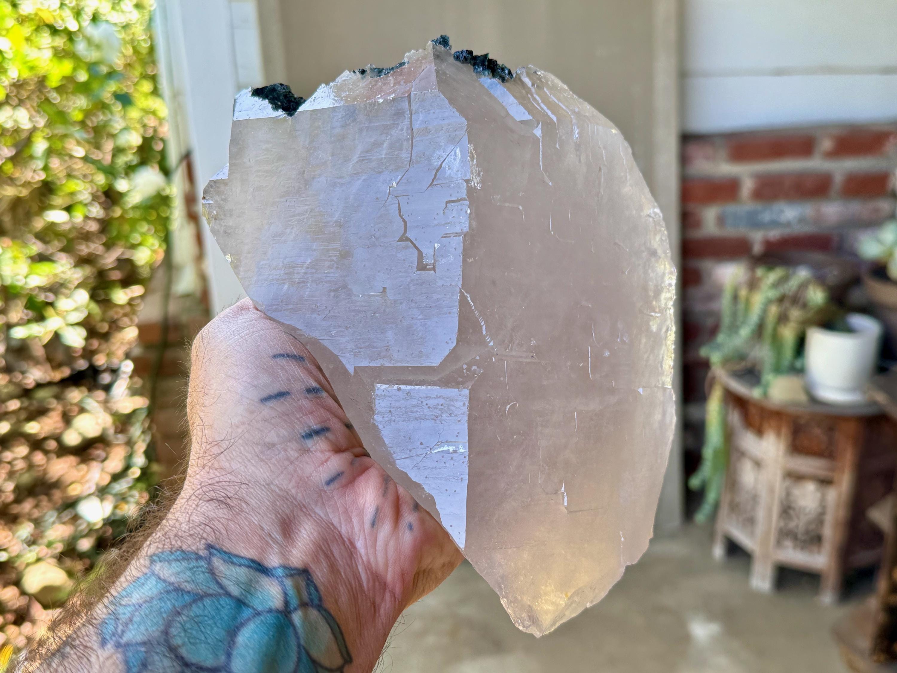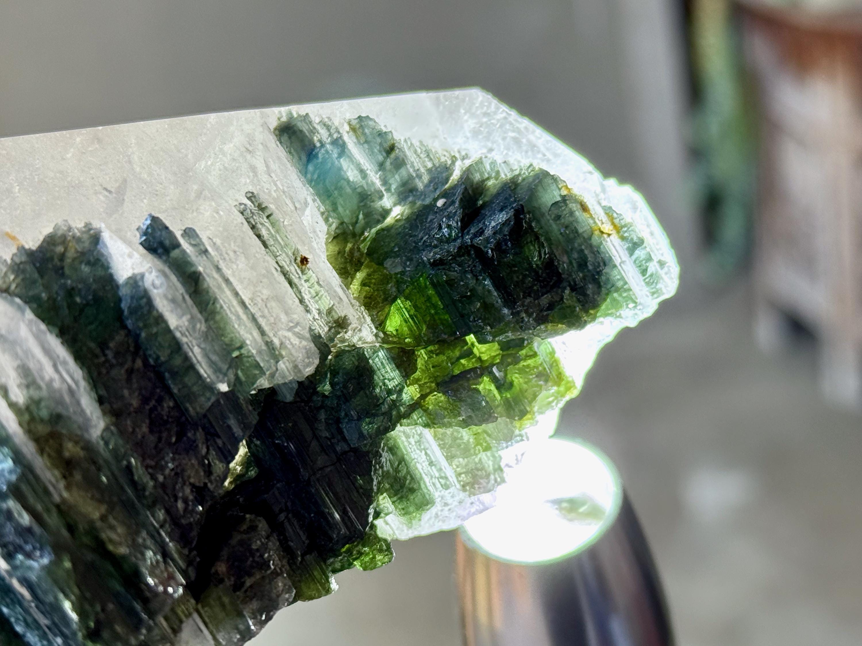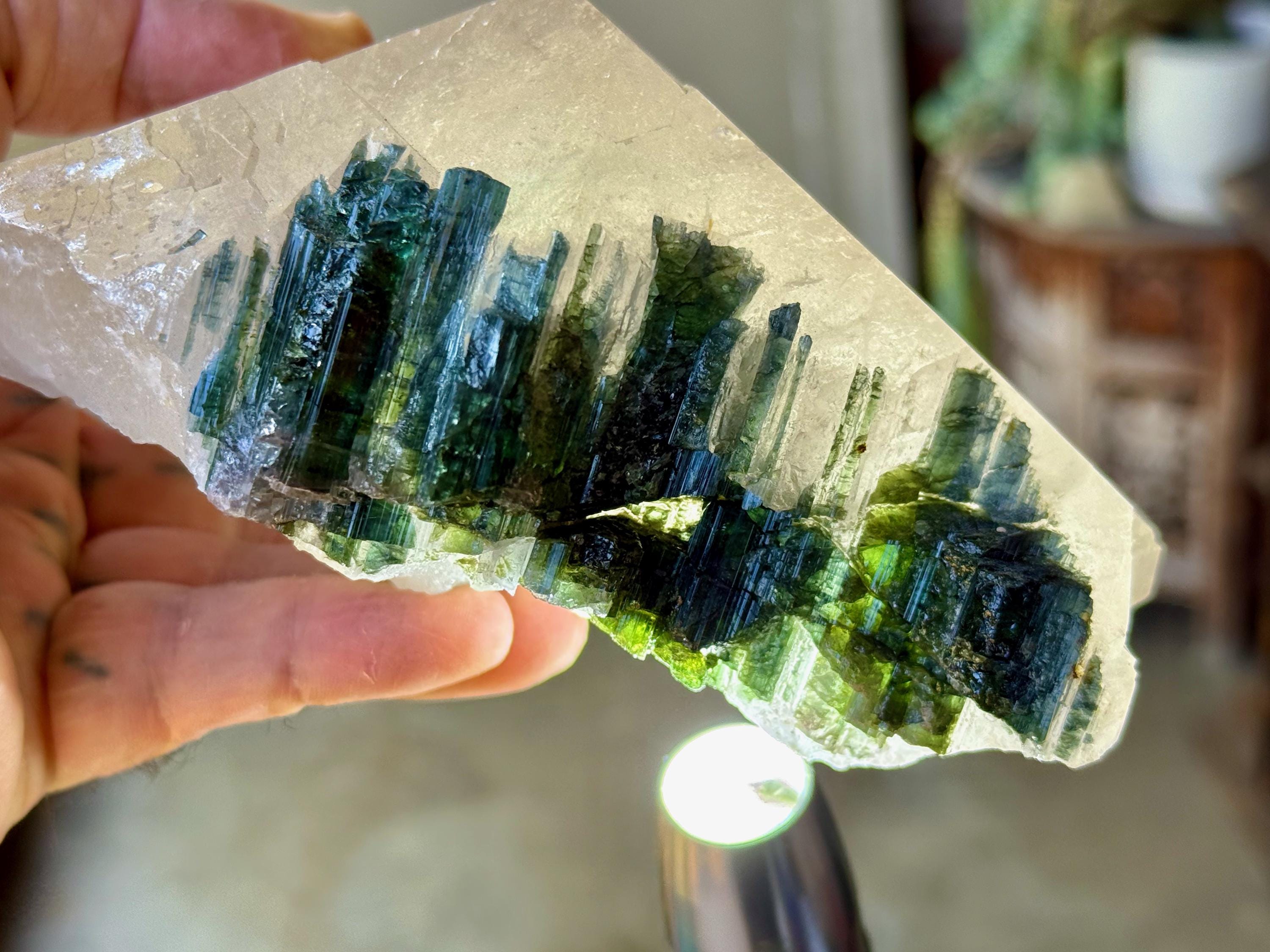 What makes this crystal extra special is the large inclusion of Green Tourmaline embedded in the main facet area. The color of these tourmalines is so vibrant and juicy! When backlit, they light up brilliantly (Photos 5-8).