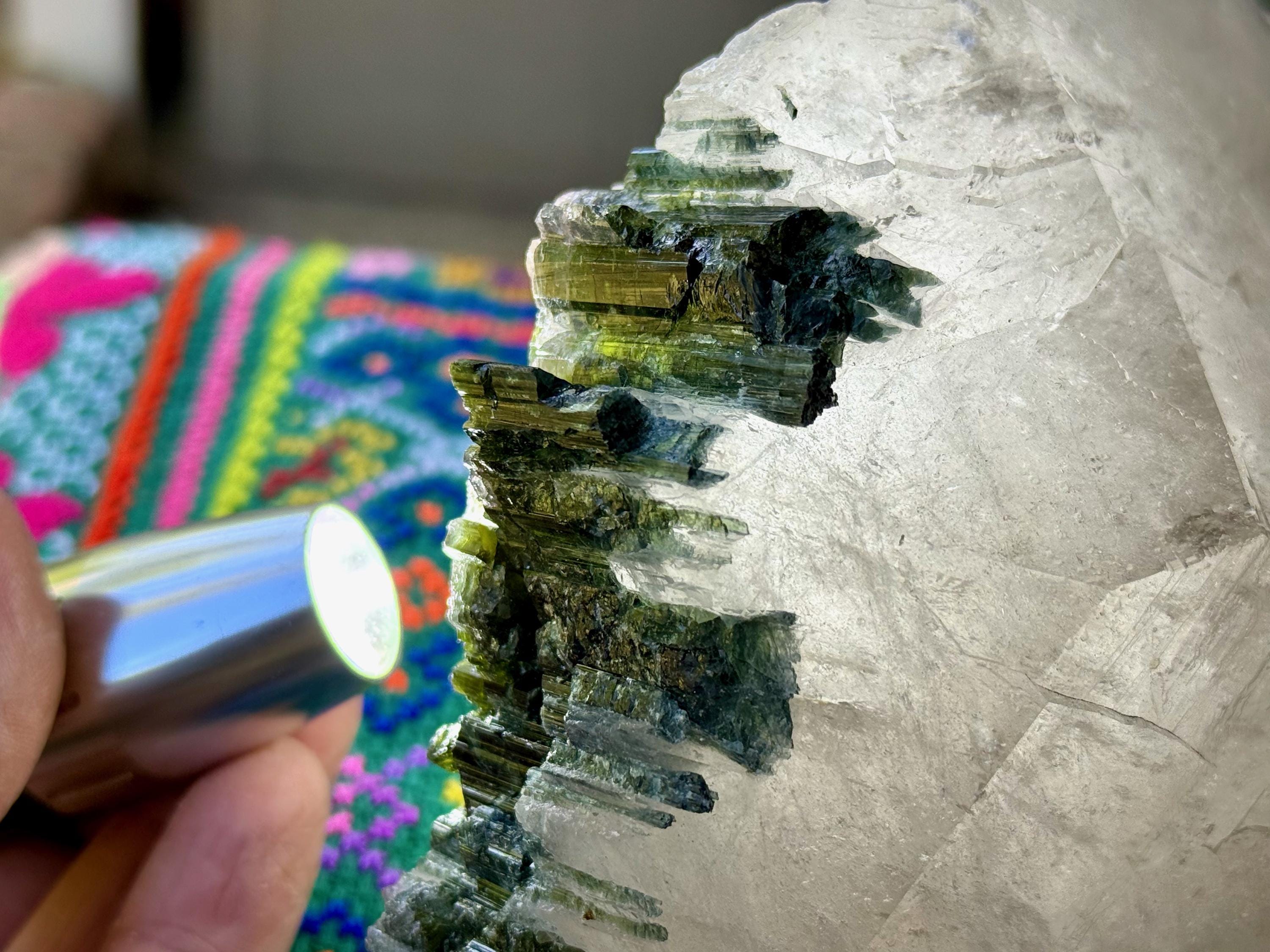 This crystal would make an incredible display piece, as it sits nicely on its own in a variety of ways, as pictured. It is entirely intact and complete, with the Green Tourmaline lining the "termination" area.