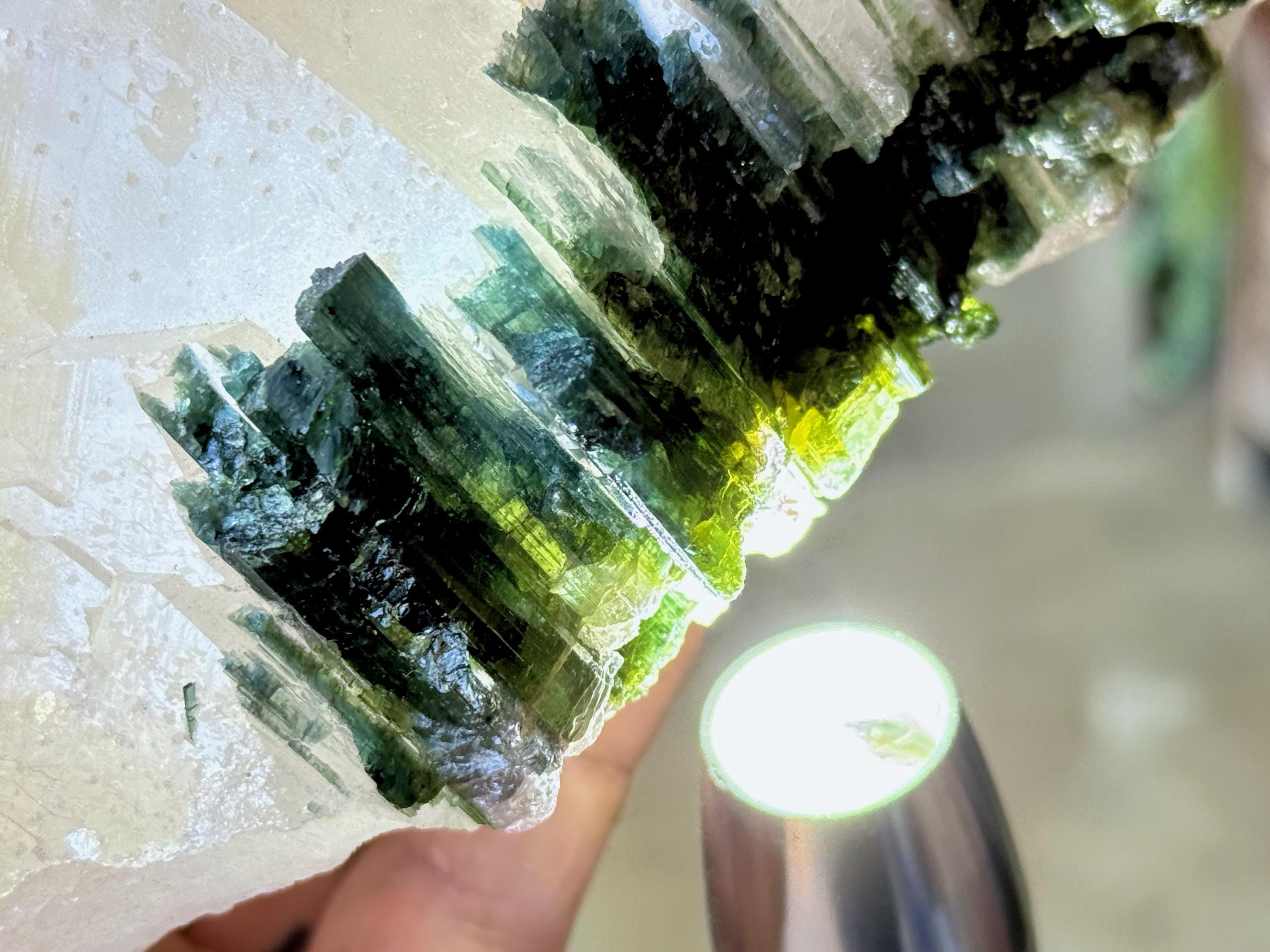 Green Tourmaline purifies and strengthens, allowing one to energetically carry greater amounts of Life Force (Prana Energy). As more energy is carried within the physical body, higher degrees of consciousness can be maintained. It is a wonderful protection stone, deal for sealing holes in the aura that leave one vulnerable to negativity.