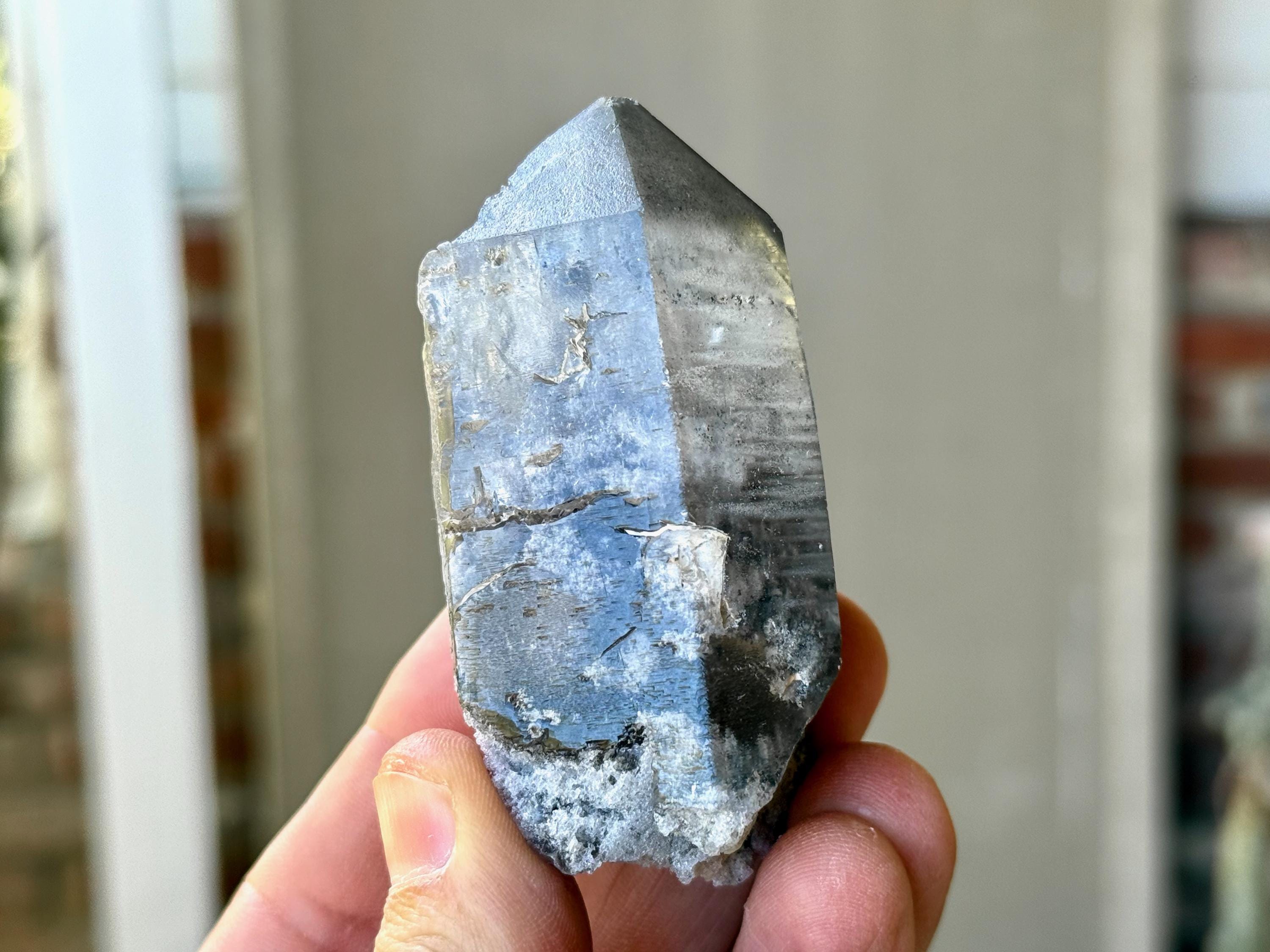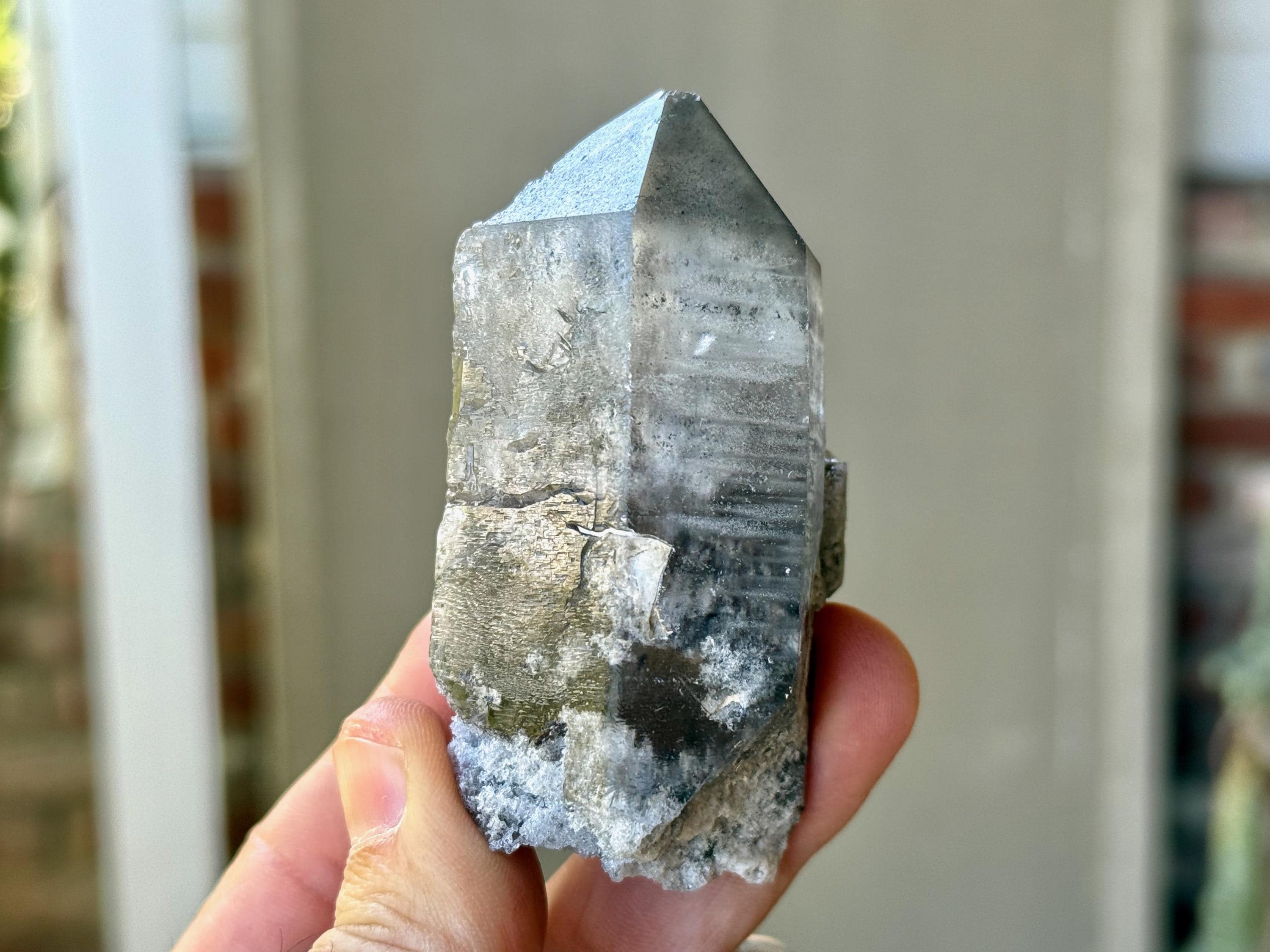 Beautiful textures and hydrothermally etched formations to this lustrous Black Phantom Lemurian with an array of both black Anthraxolite inclusions and white Kaolinite. We love that this formation is the "best of both worlds," so to speak, with the front side displaying a more traditional "point" formation, and then backside displaying the partially dissolved, hydrothemal indications.