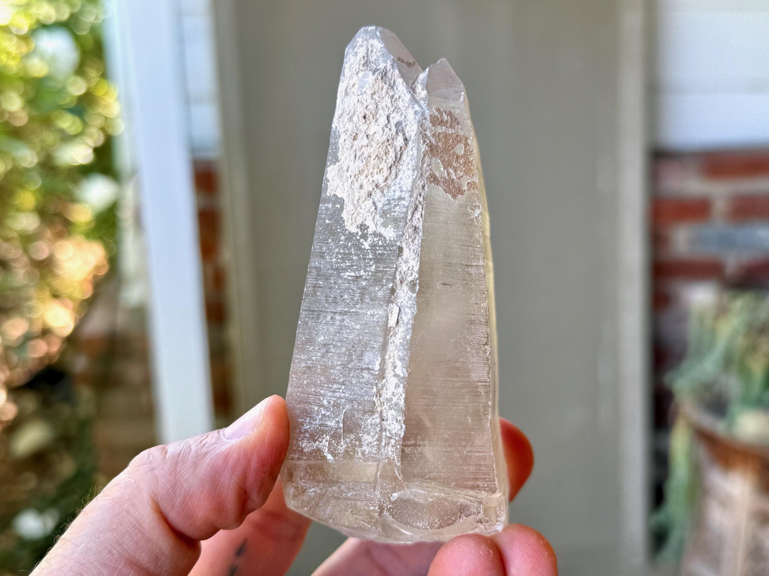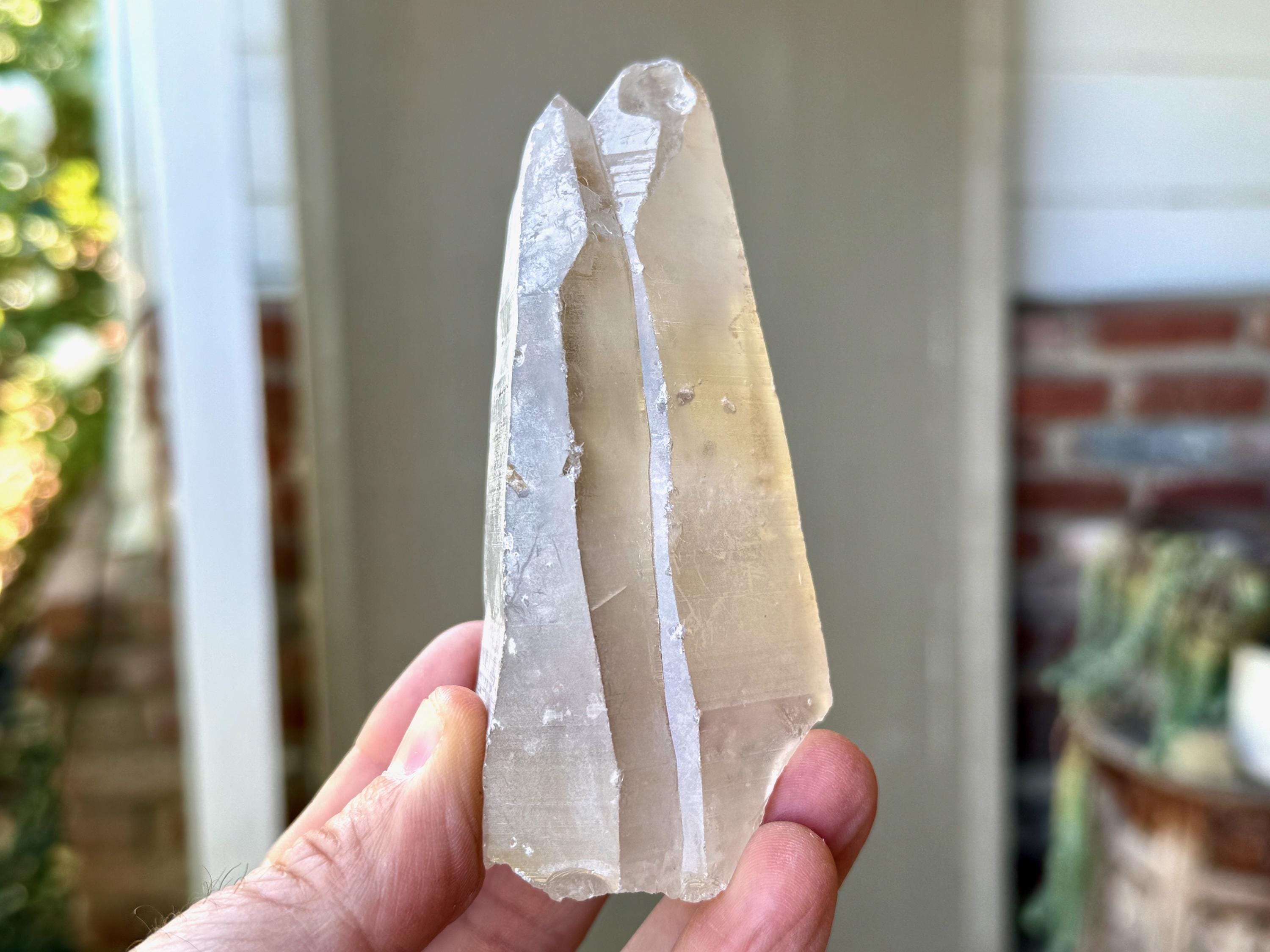 This crystal is a perfect Tantric Twin formation, with two crystals growing together side by side This is the only Tantric Twin we've seen so far in this collection of Russian Lemurians. Both crystals feature long and sloping main facets.