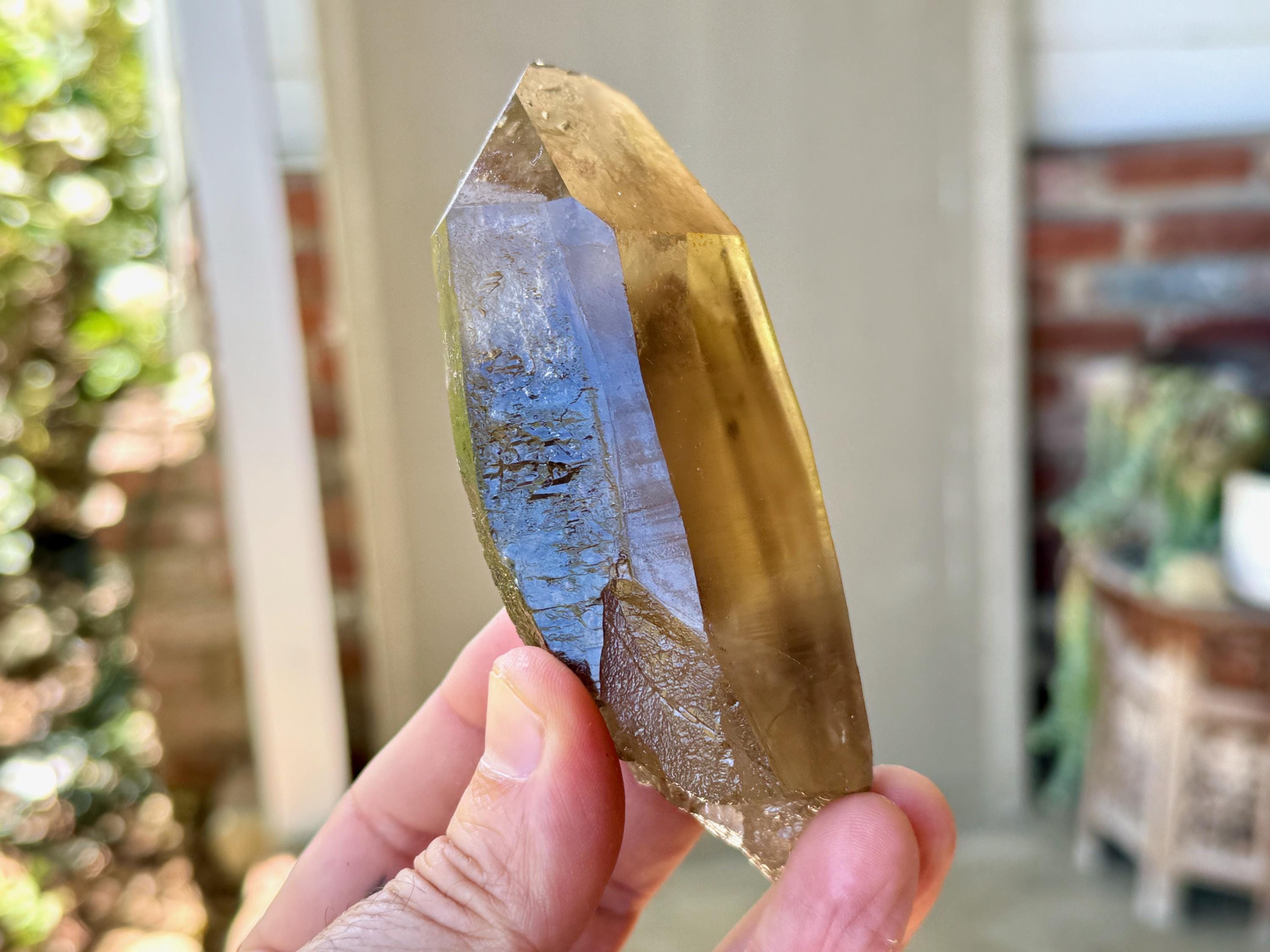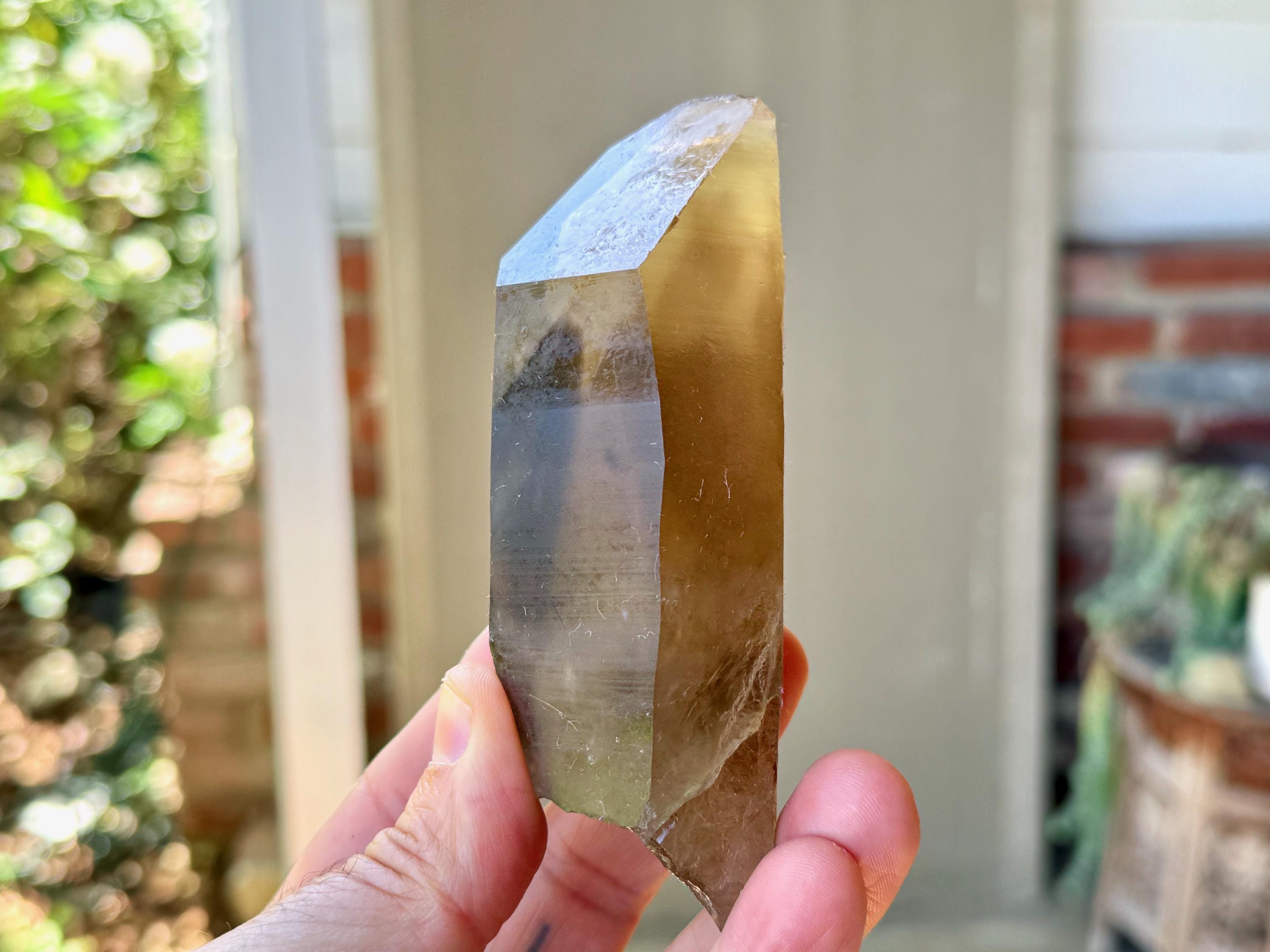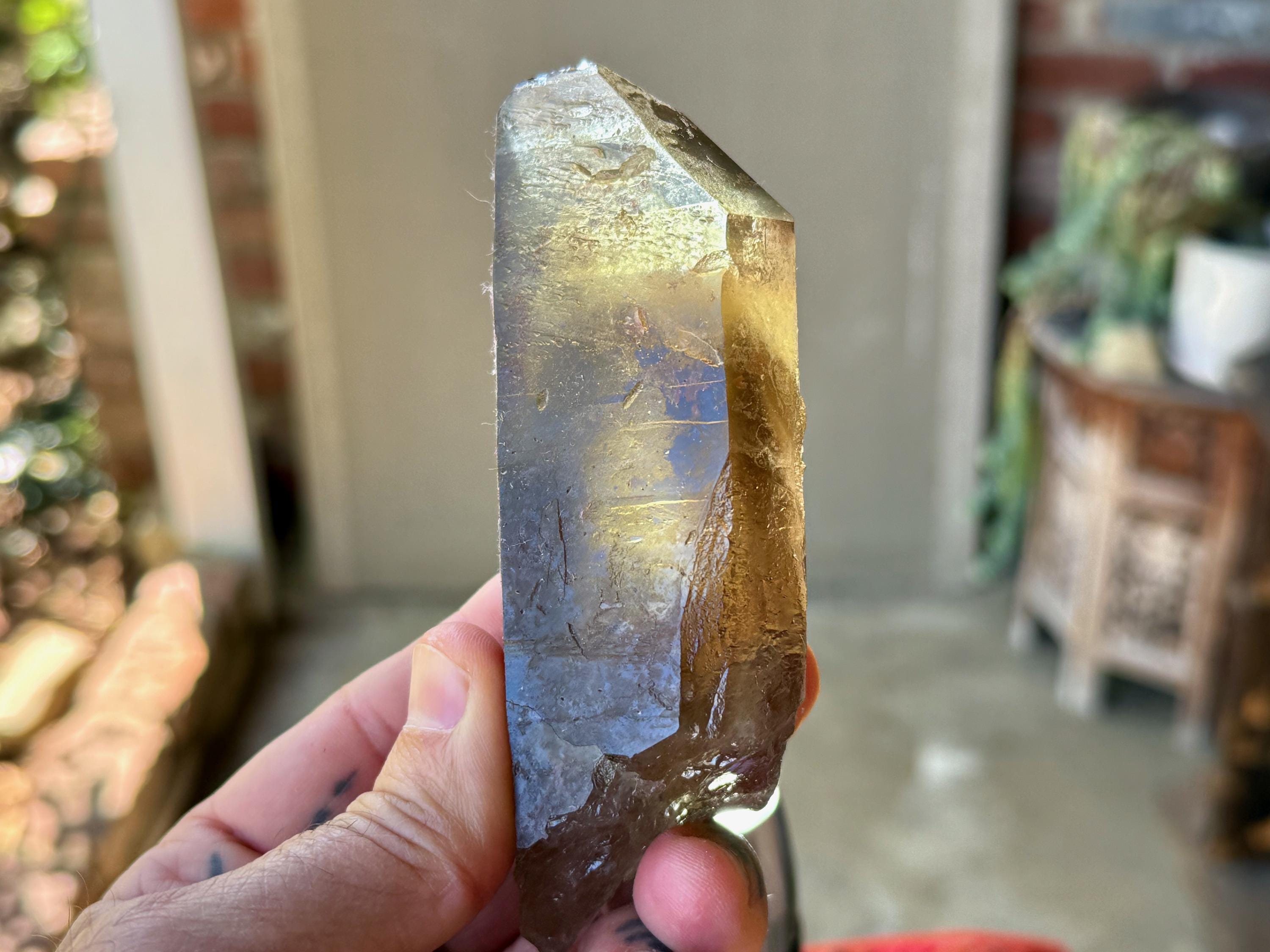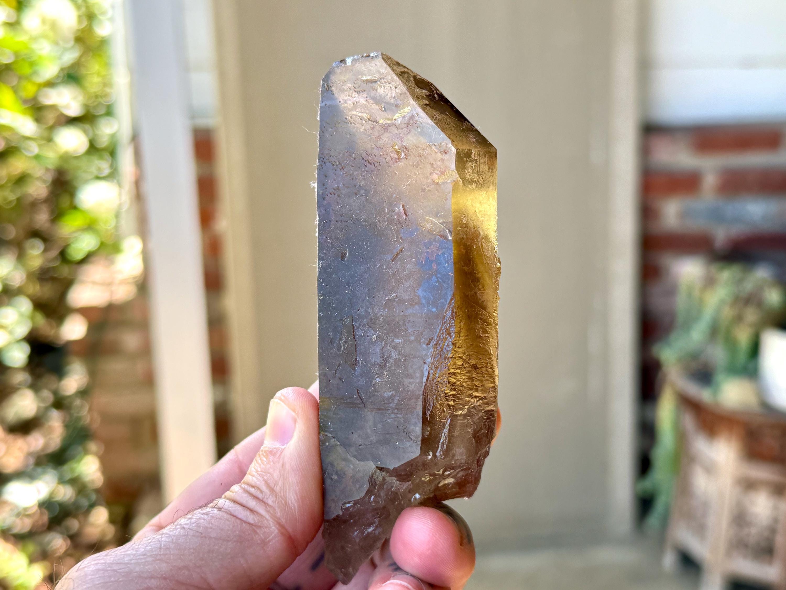 A powerful, broad and elongated formation to this lustrous Pele's Dream Lemurian with a deep smoky-golden color. This crystal exhibits the gradient color we love to see on these crystals, with a darker smoky base that blends into a clearer and more golden top portion.