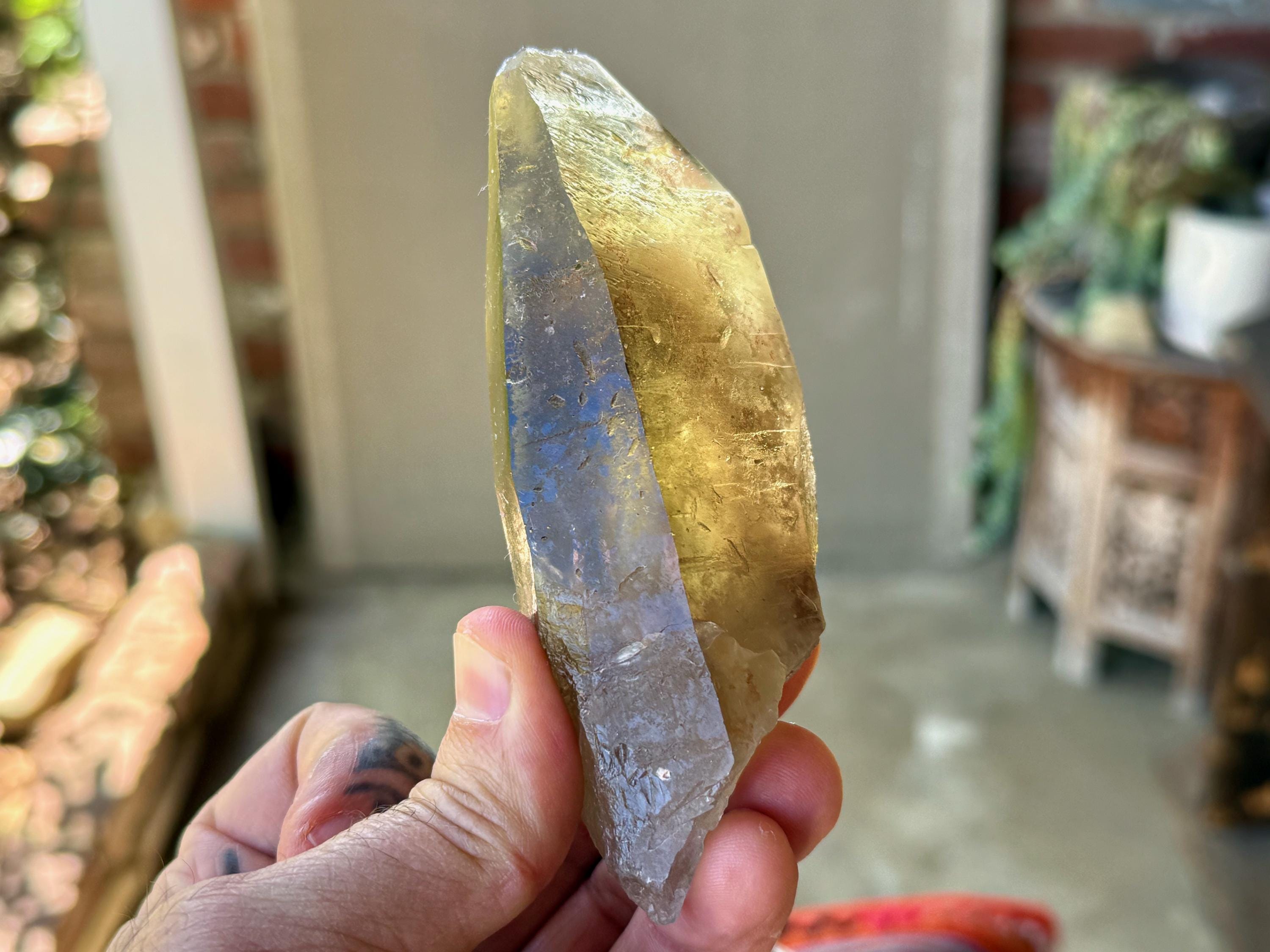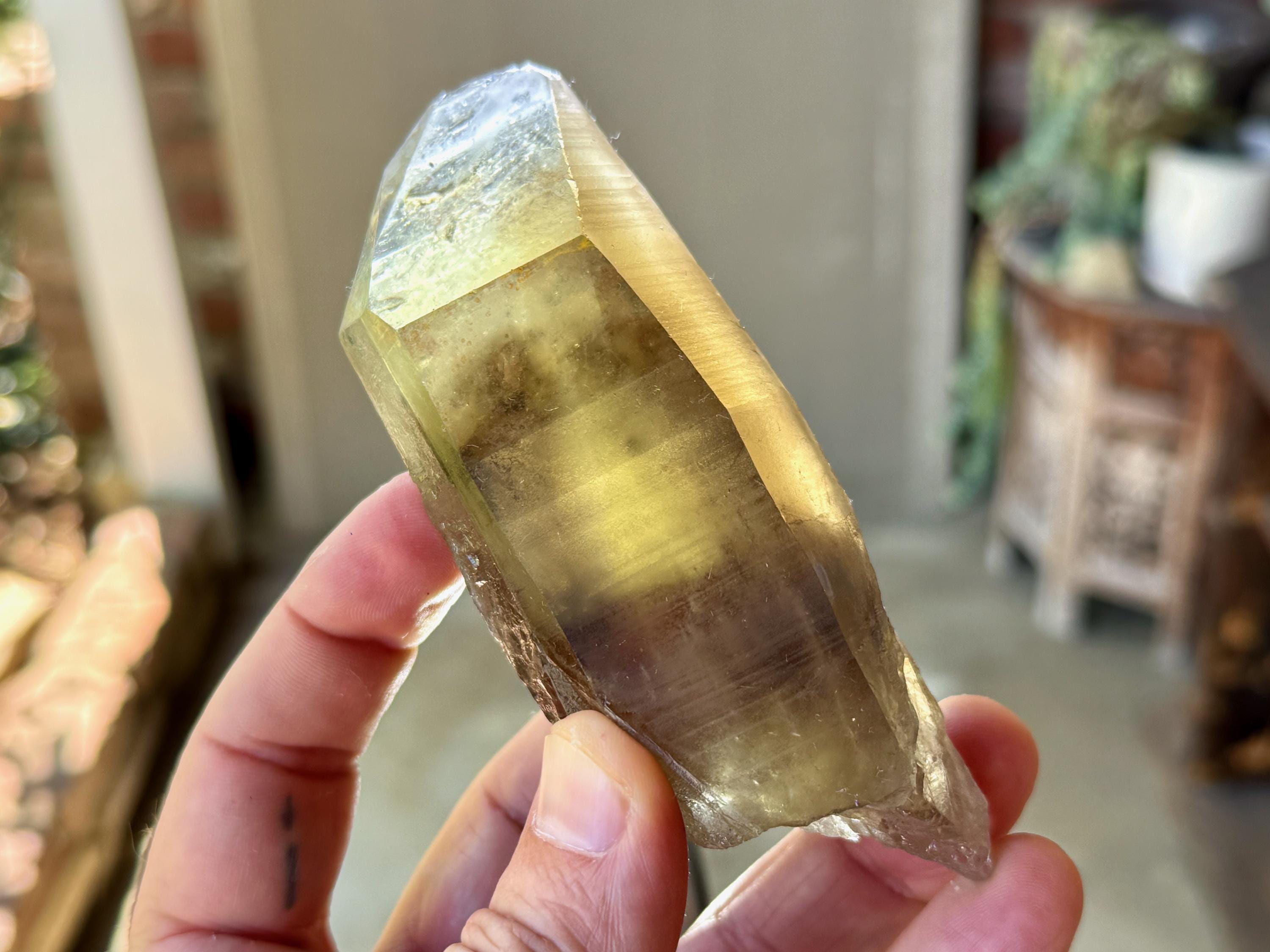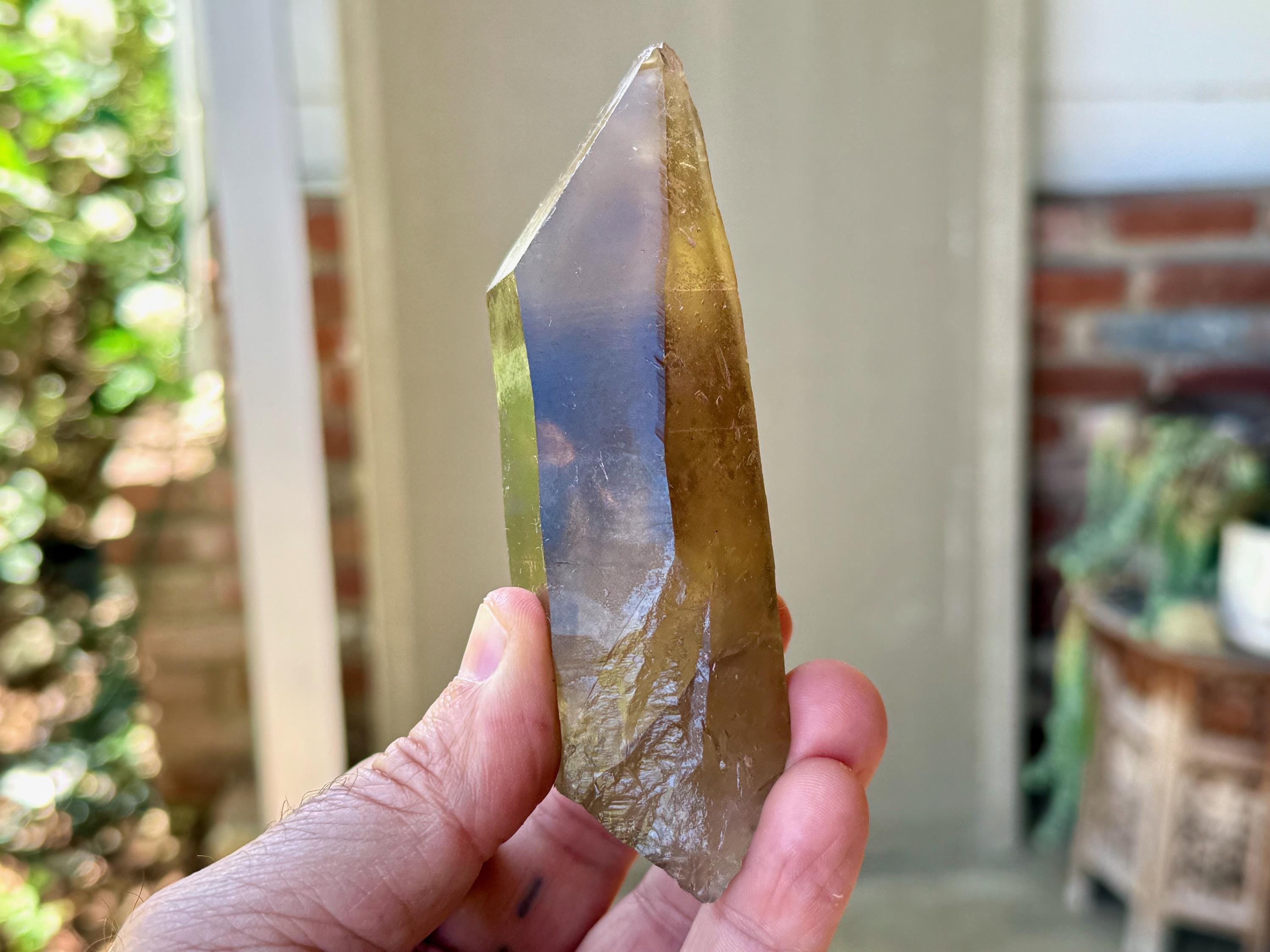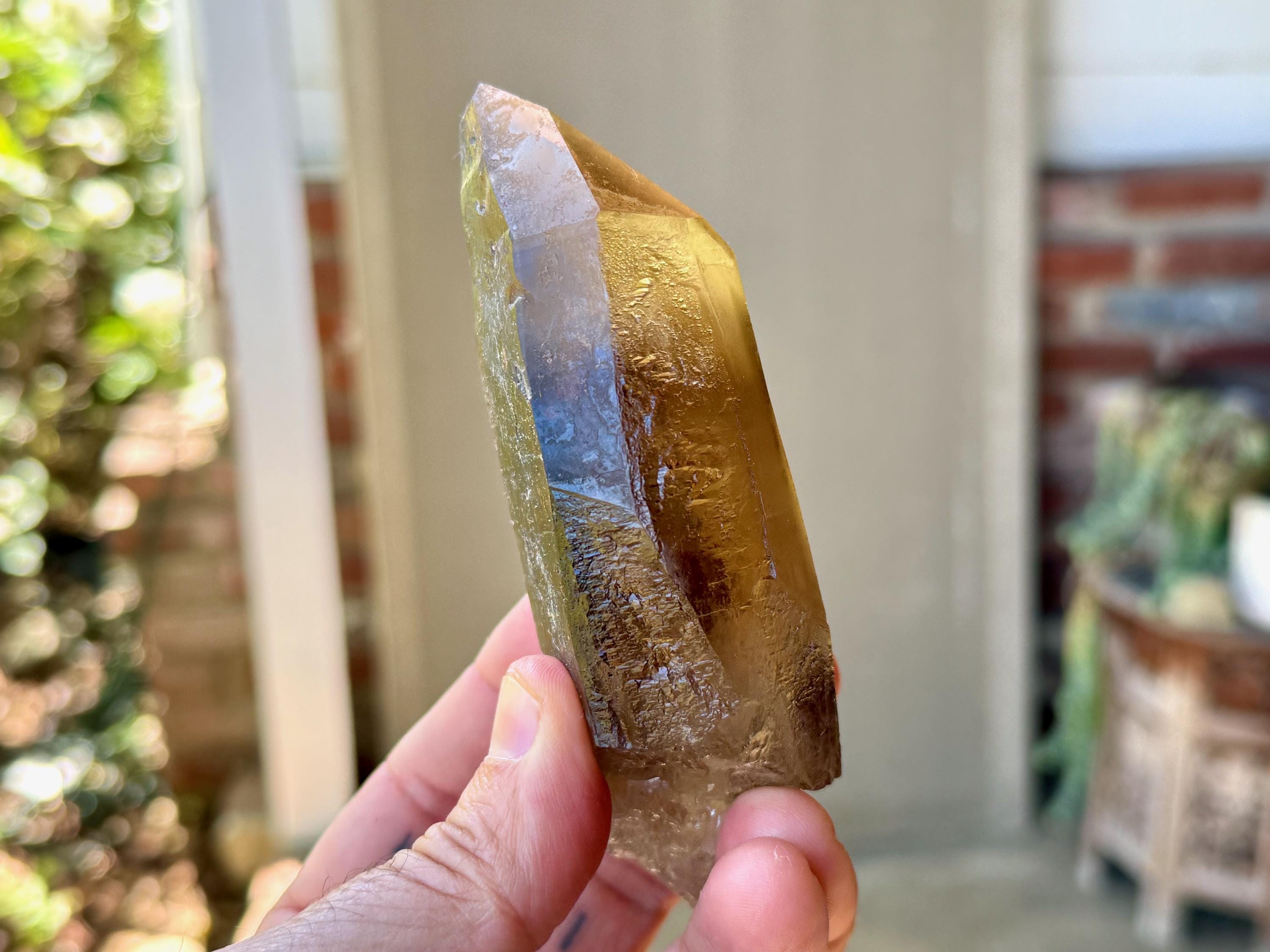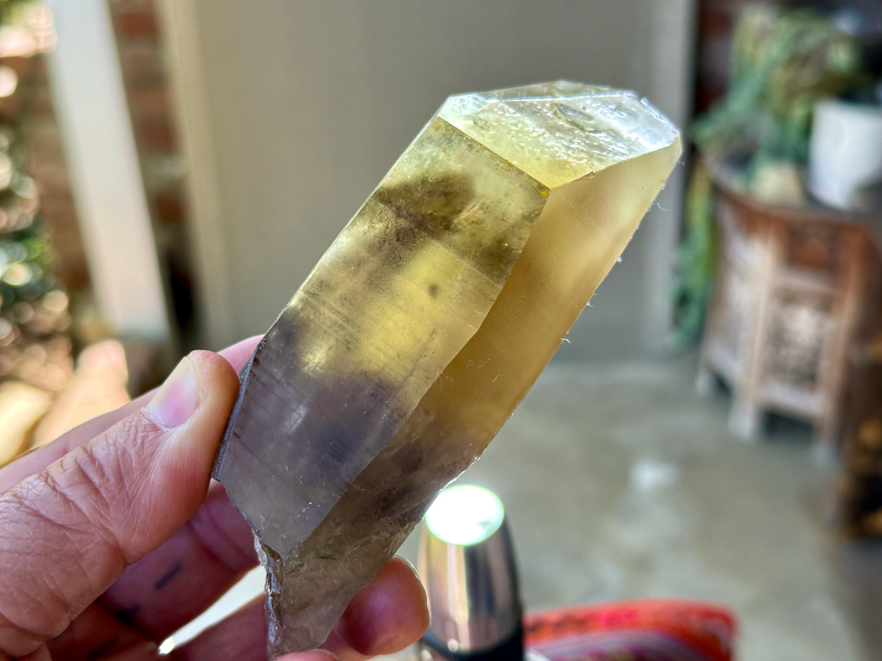 A powerful, broad and elongated formation to this lustrous Pele's Dream Lemurian with a deep smoky-golden color. This crystal exhibits the gradient color we love to see on these crystals, with a darker smoky base that blends into a clearer and more golden top portion.