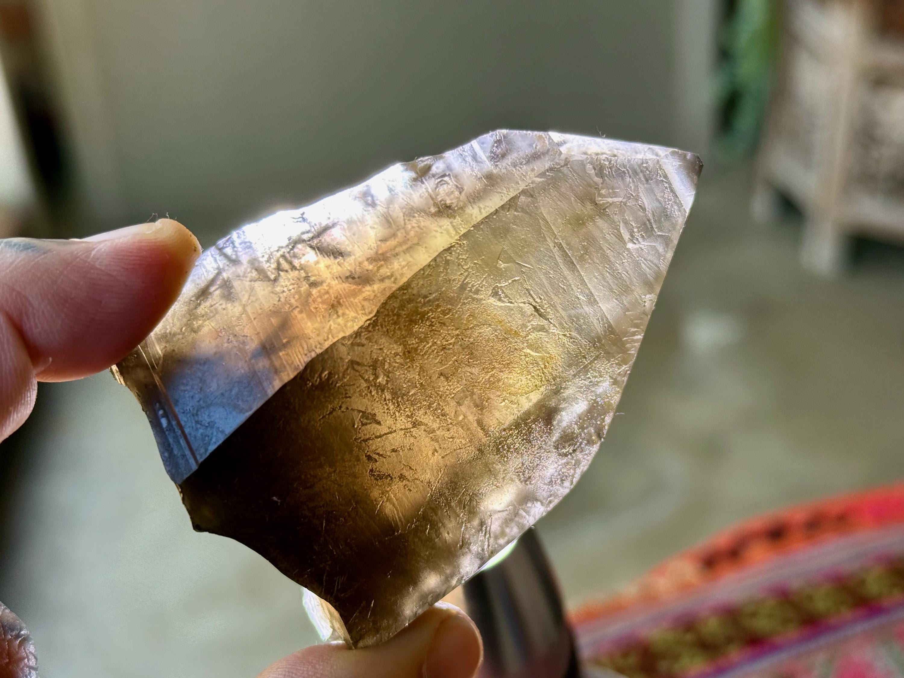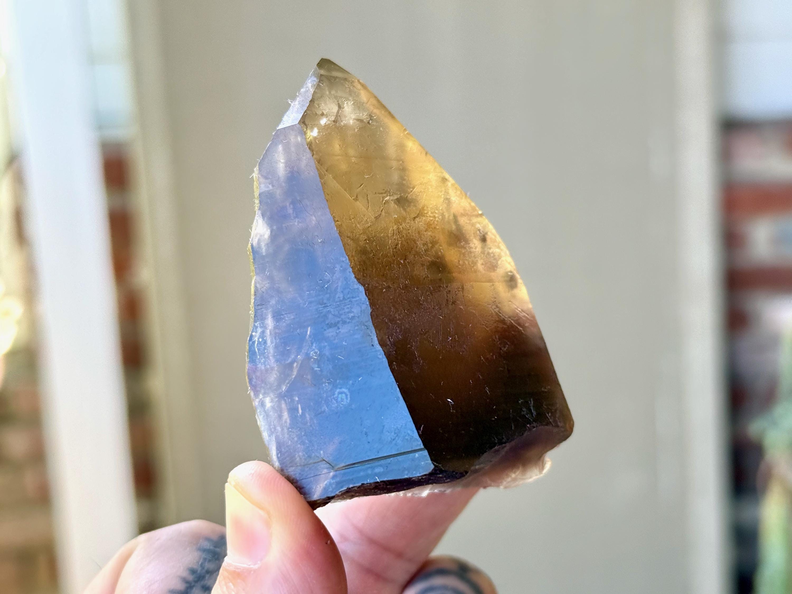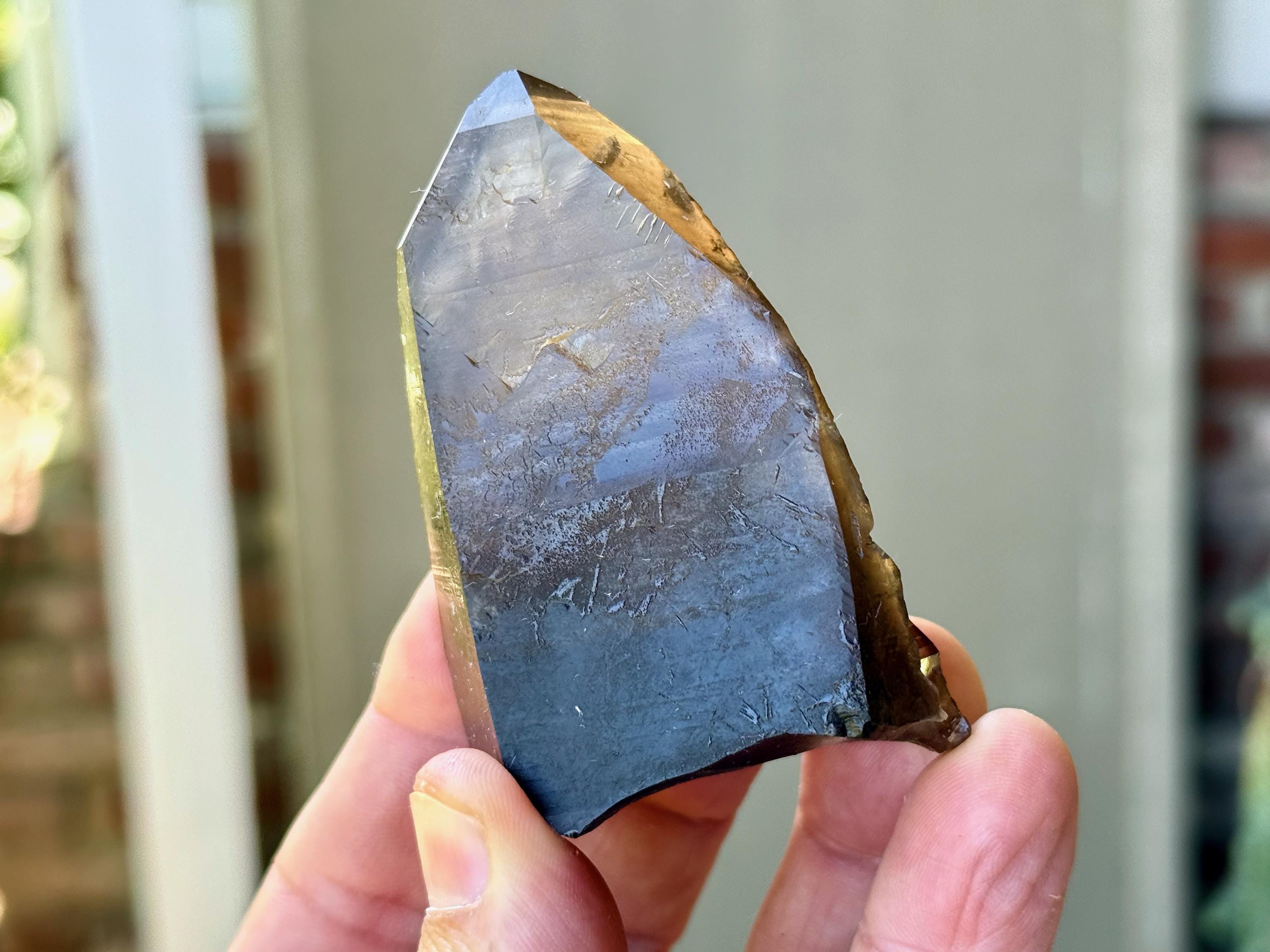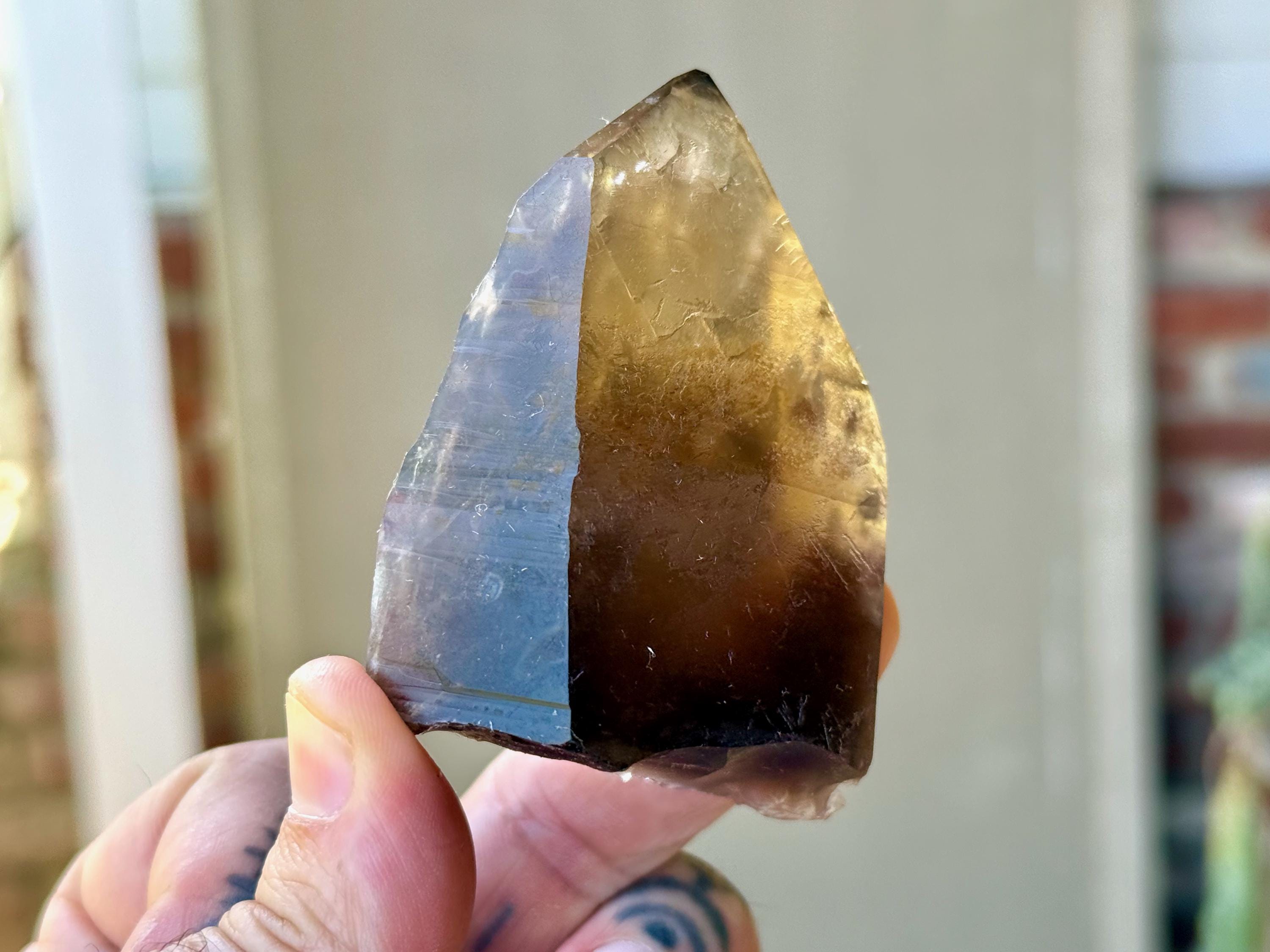 A unique, broad and tapered formation to this superb Pele's Dream Lemurian with wonderful luster and a rich smoky-golden hue. This crystal exhibits the gradient color that is characteristic of these crystals, with a darker smoky base that blends into a clearer and more golden top portion. When backlit, as in Photos 4-6, we can see just how brilliantly it lights up.