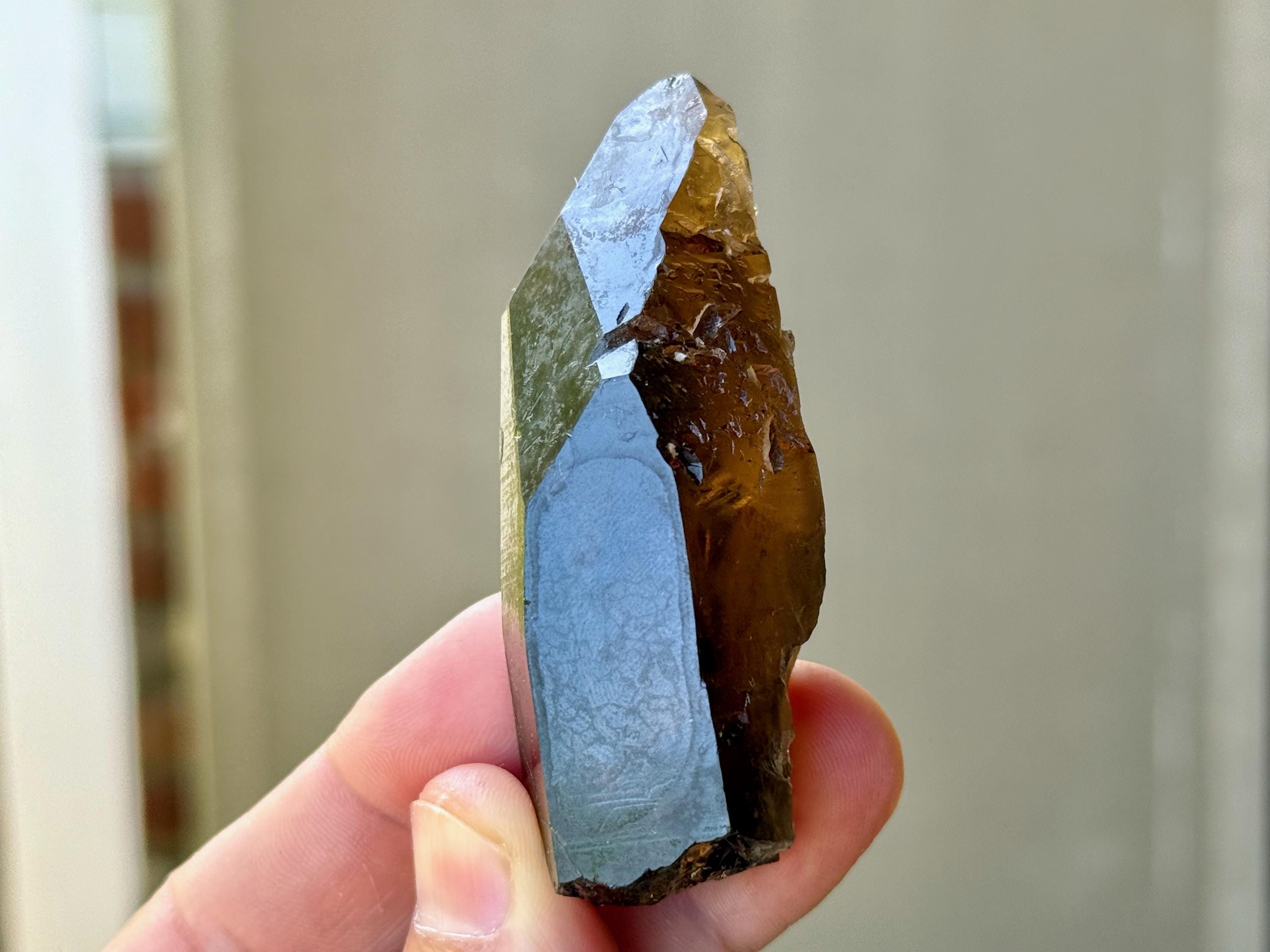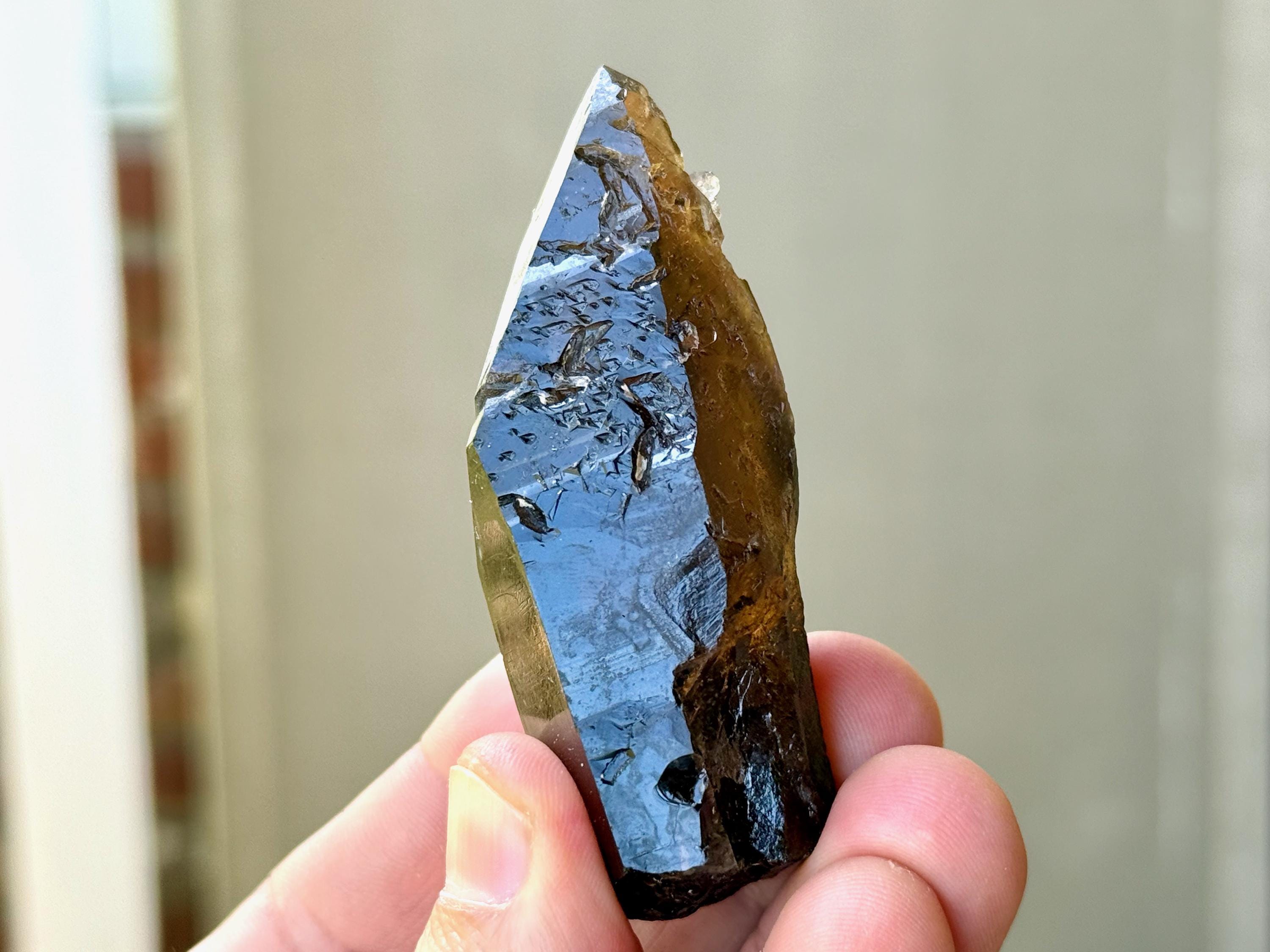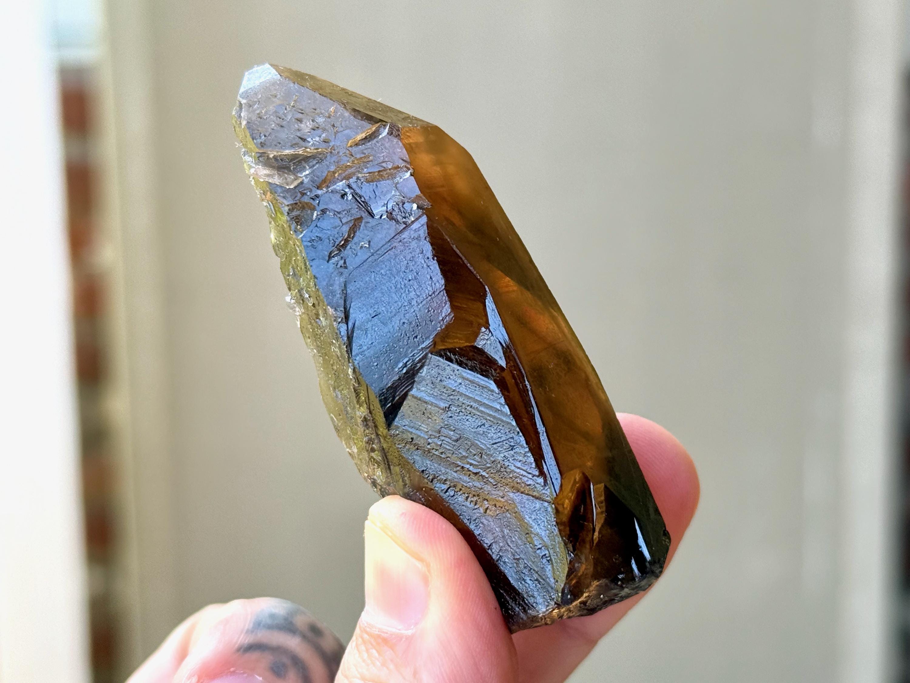 Darkly elegant luster to this Pele's Dream Lemurian Quartz with a sleek, elongated formation. This crystal features a deep smoky color, with a gradient complexion that becomes clearer and more golden toward the top. When backlit, the entire crystal lights up beautifully (Photos 3-6).