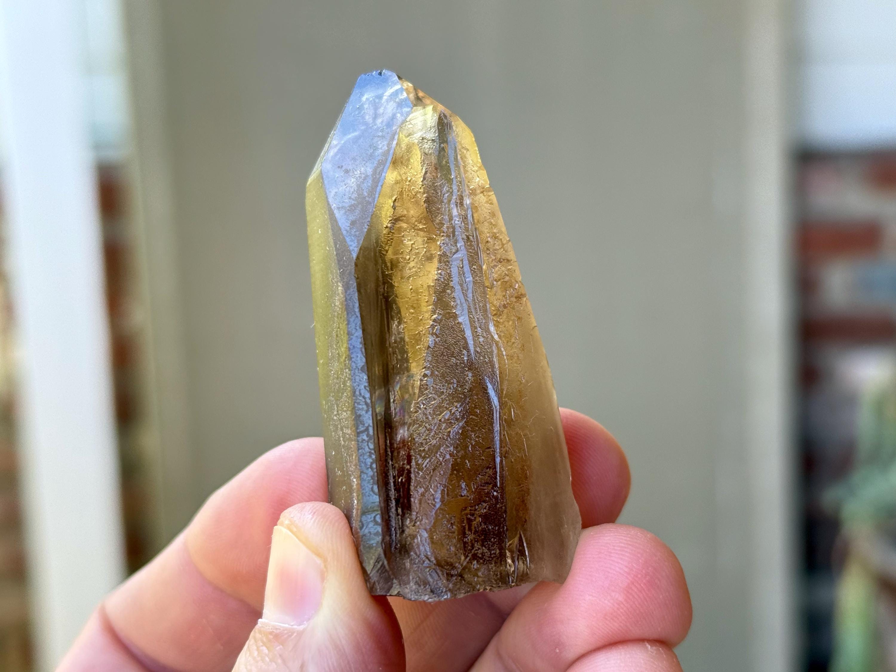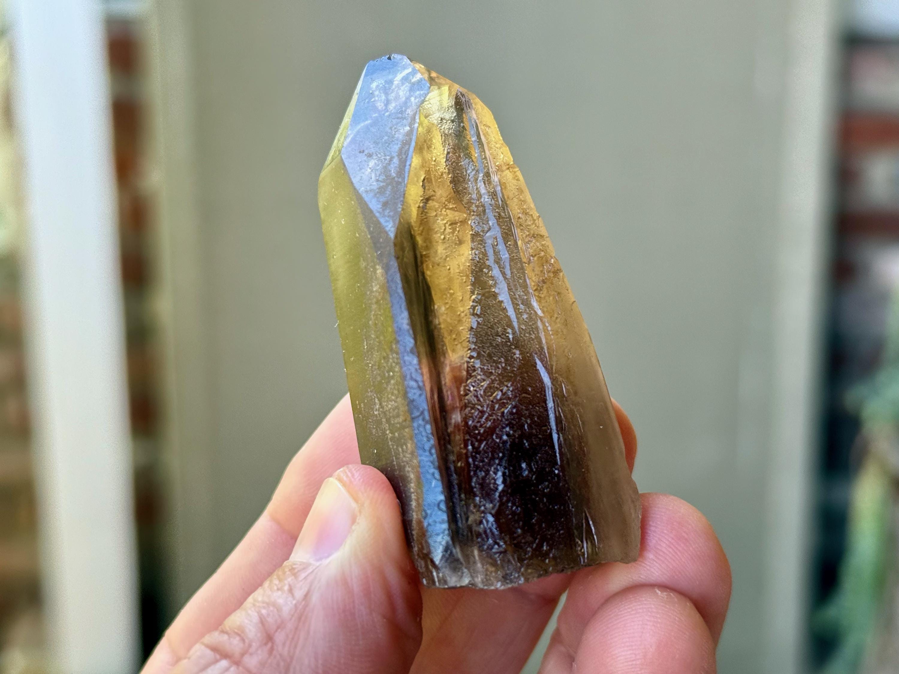 Marvelous luster and excellent clarity to this Pele's Dream Lemurian with the gradient color we love to see on these crystals — a darker smoky base that blends into a clearer and more golden top portion. When backlit, as in Photos 4-6, it lights up magnificently.