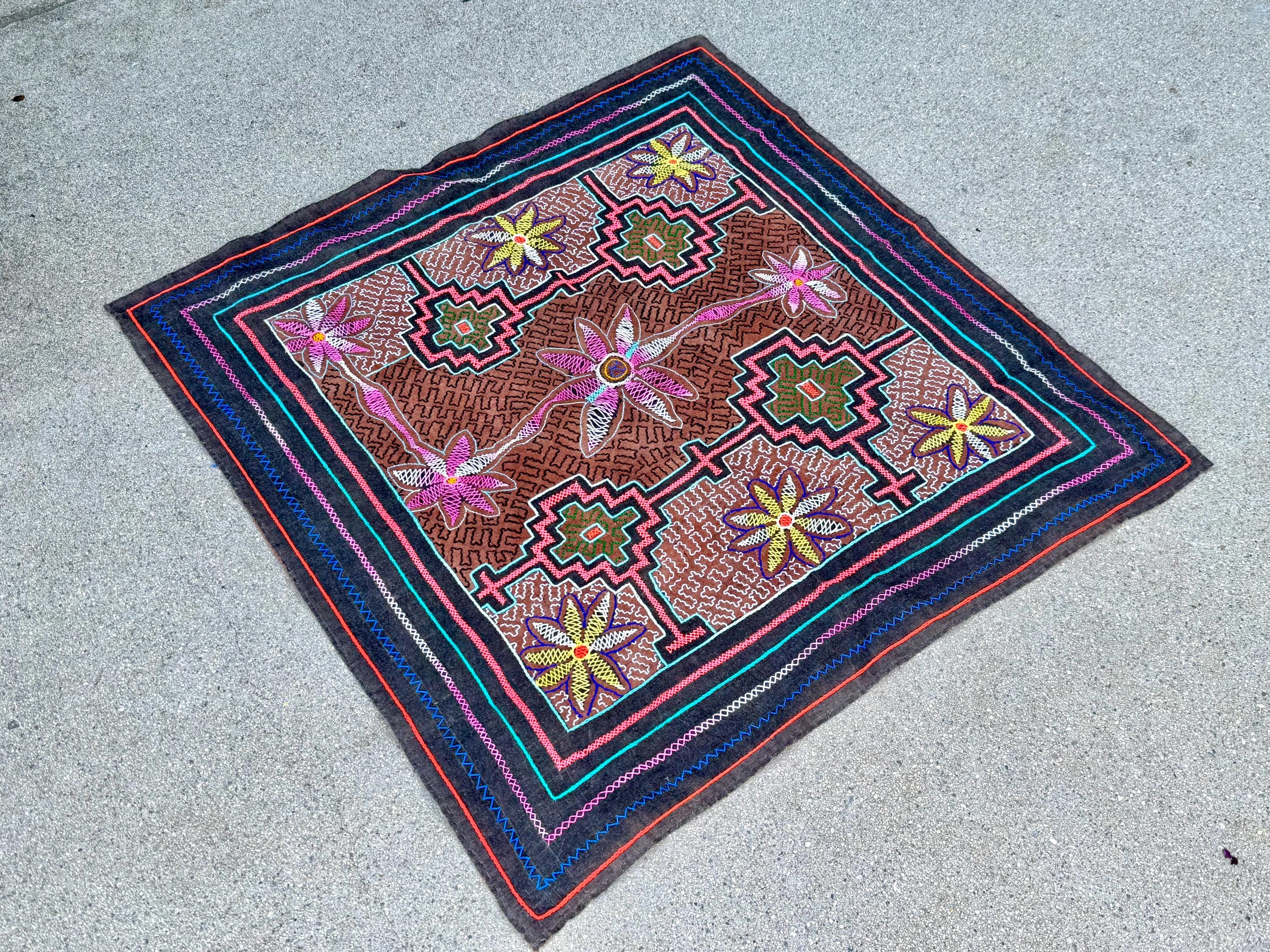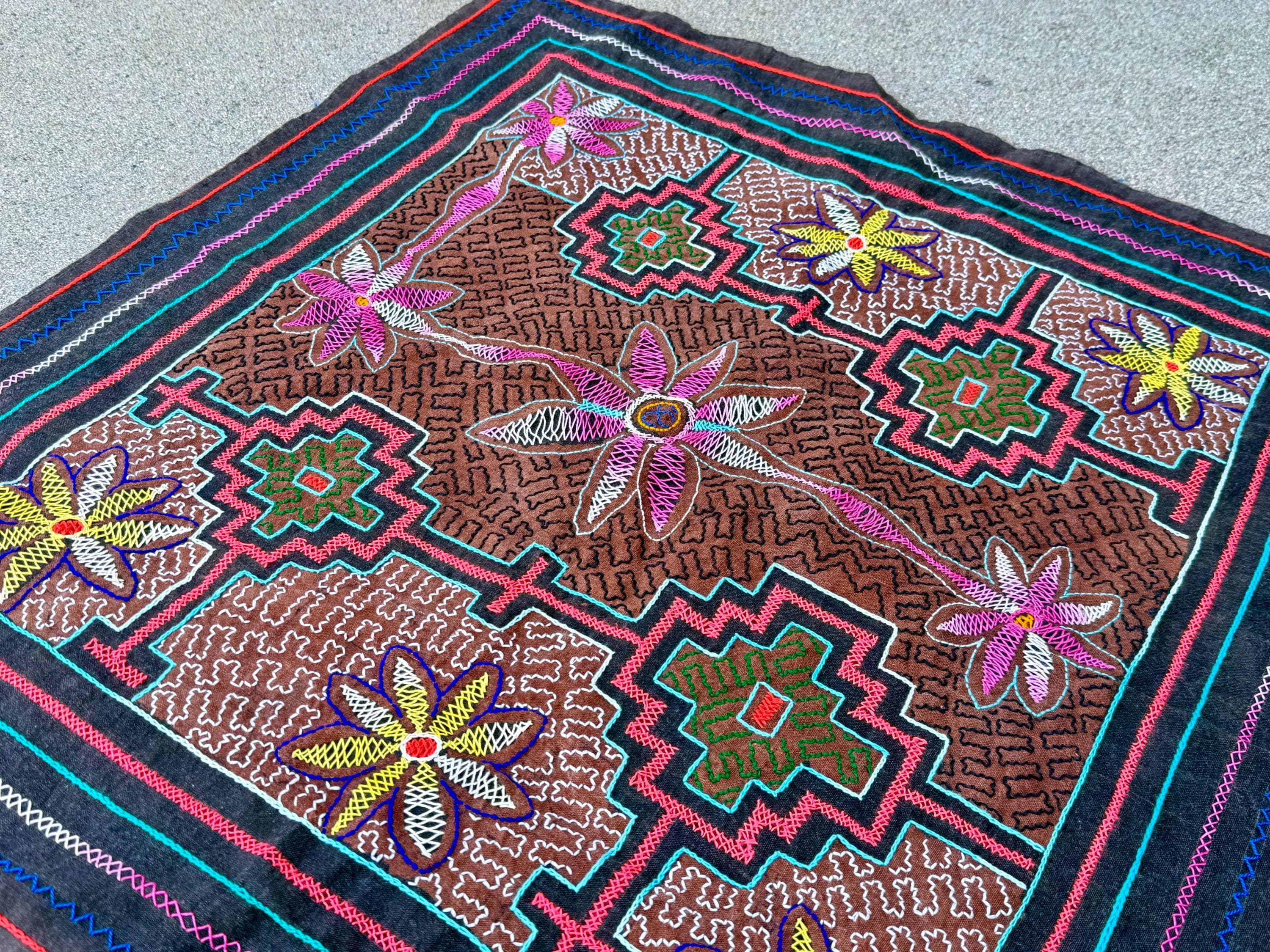 Vibrant colors and well-executed embroidery to this magnificent manta cloth depicting Cha*runa flowers and vine, along with festive kene designs.