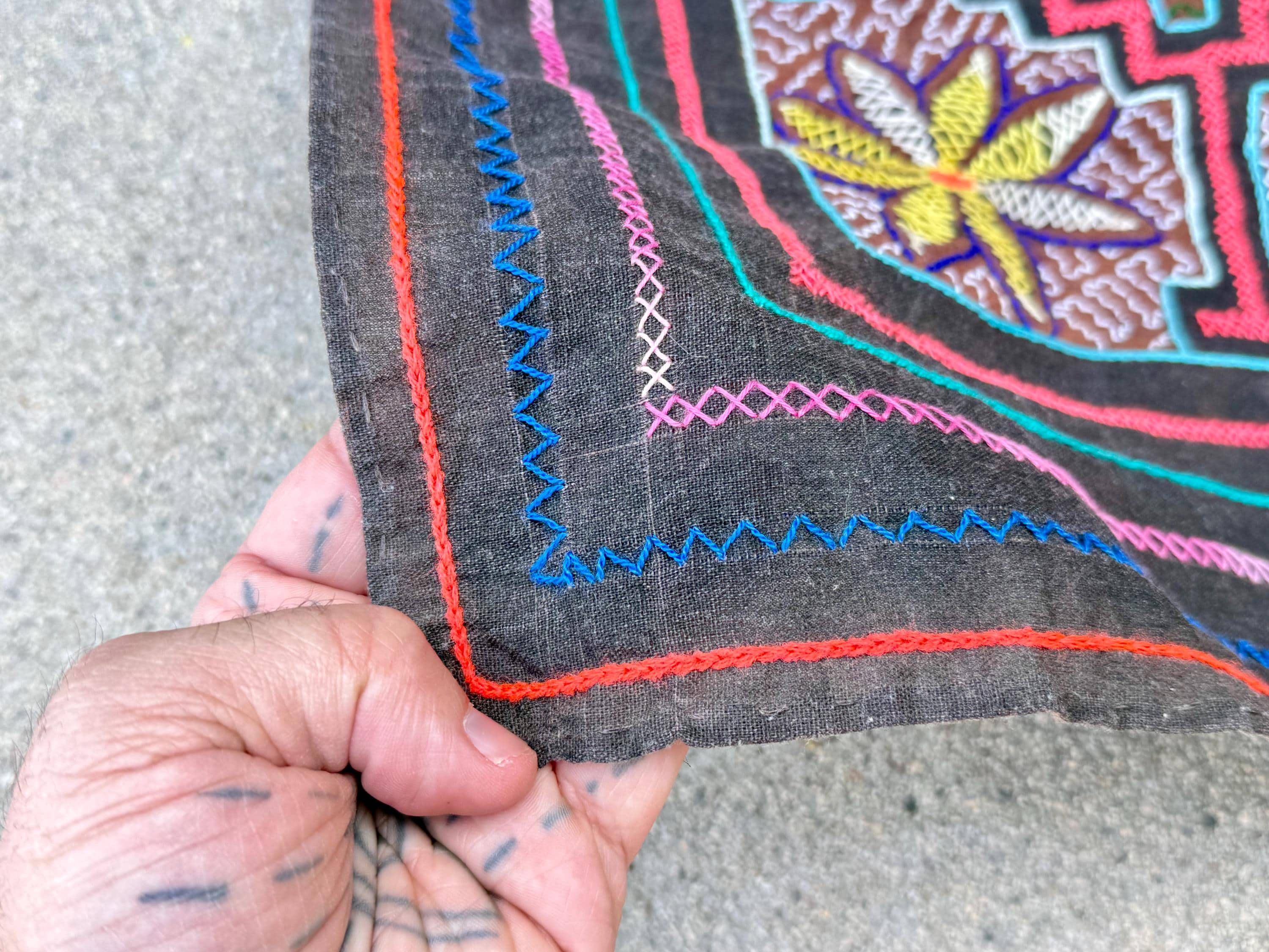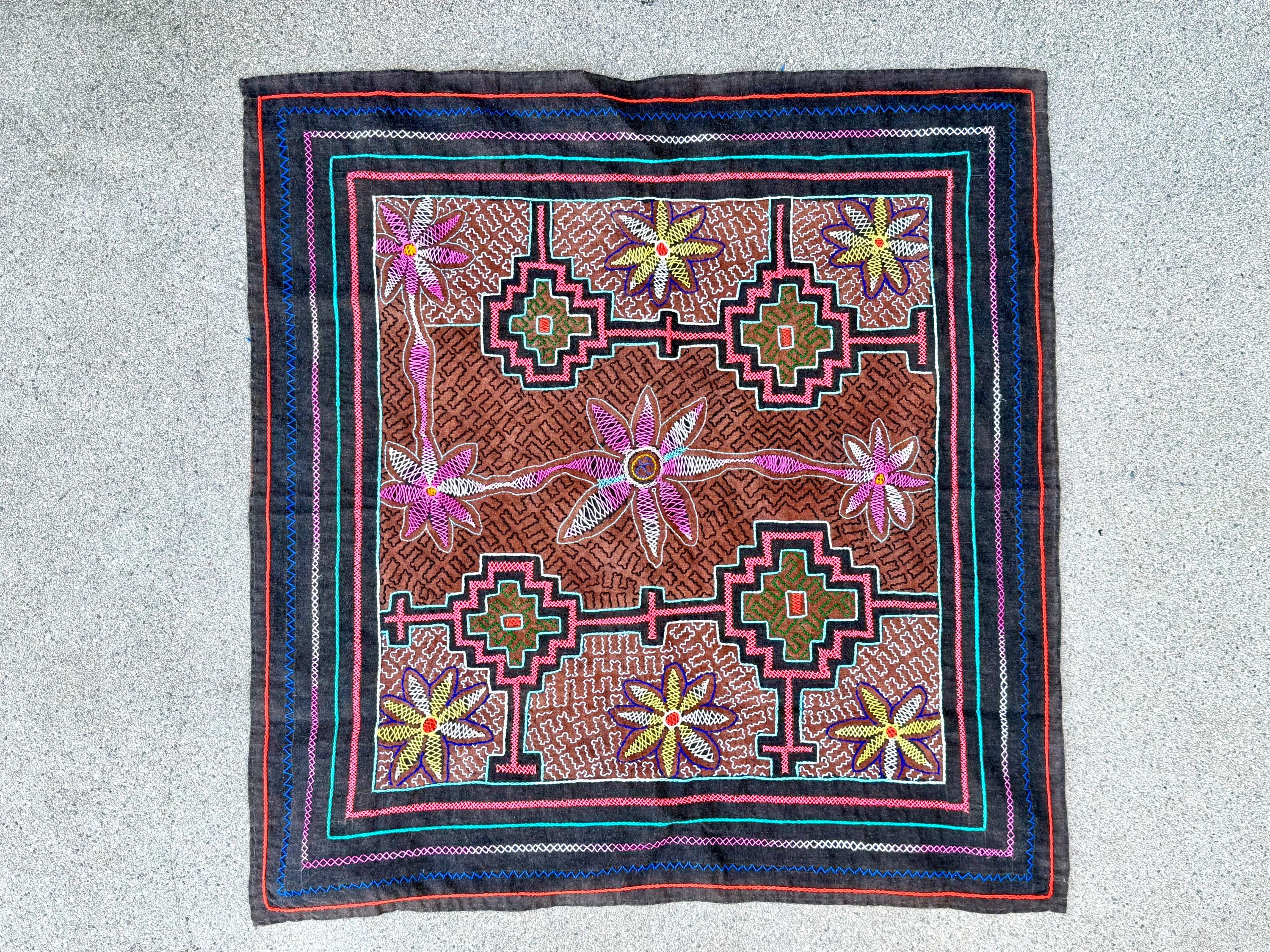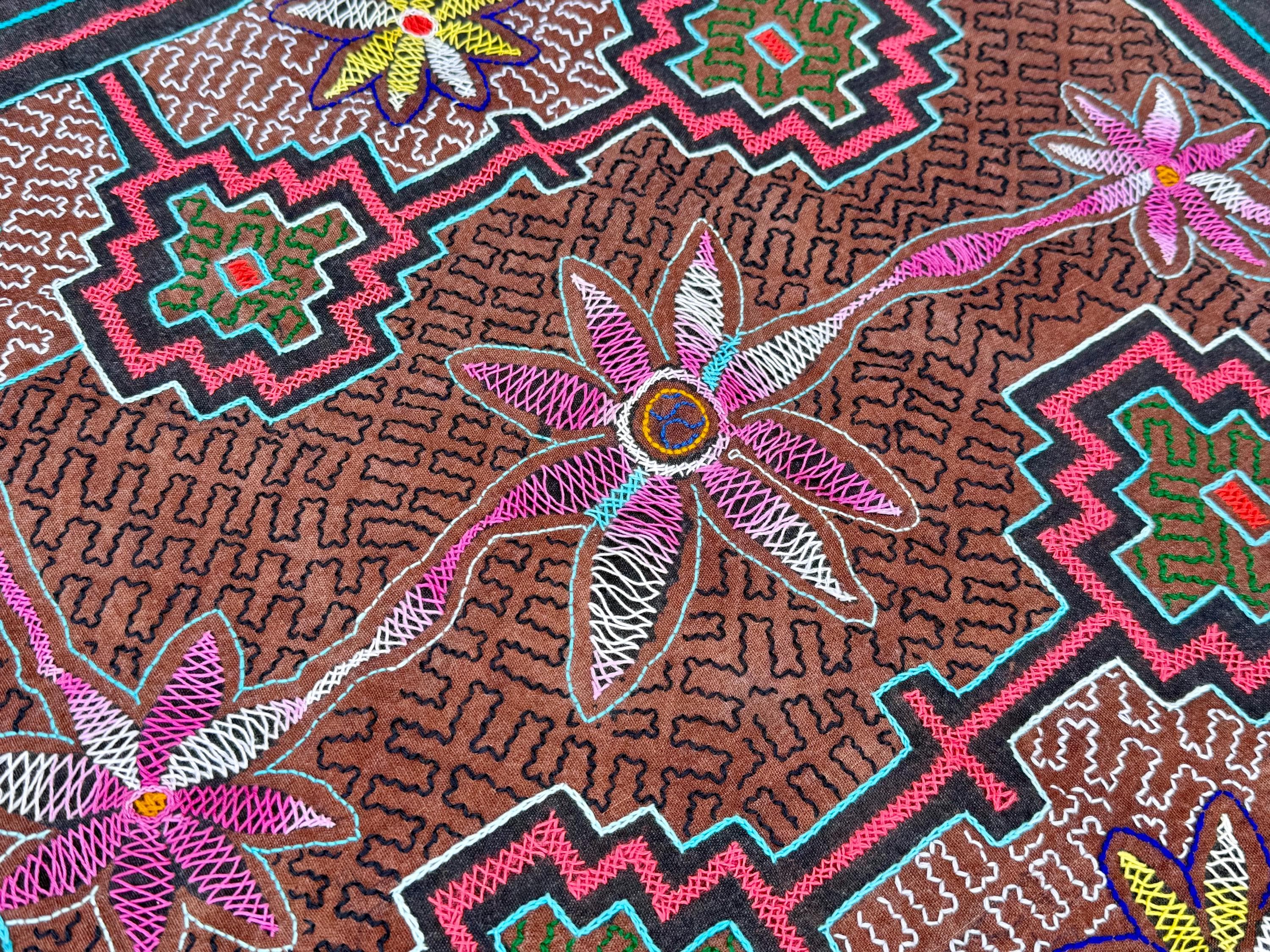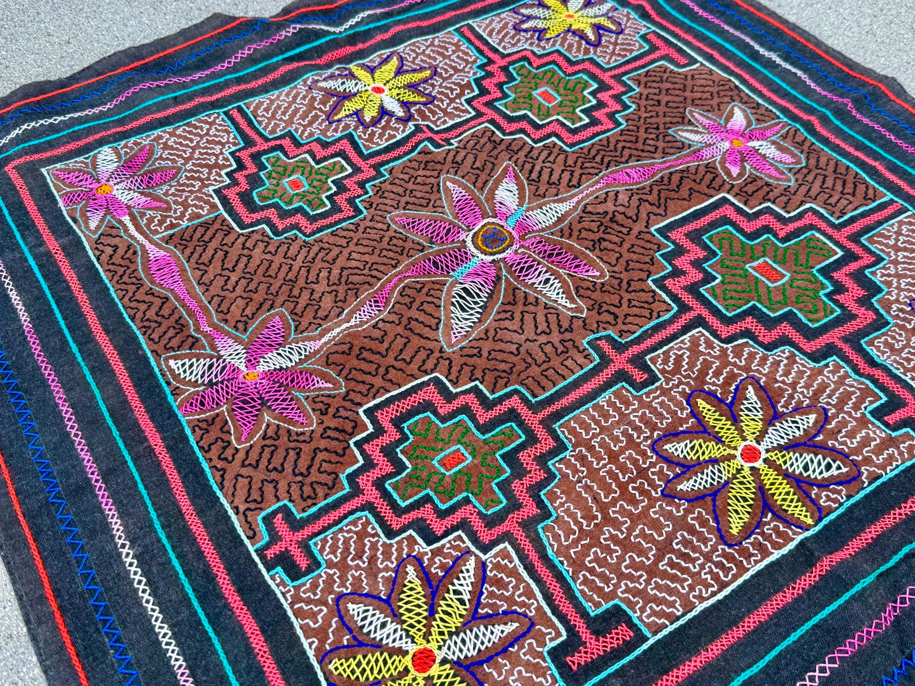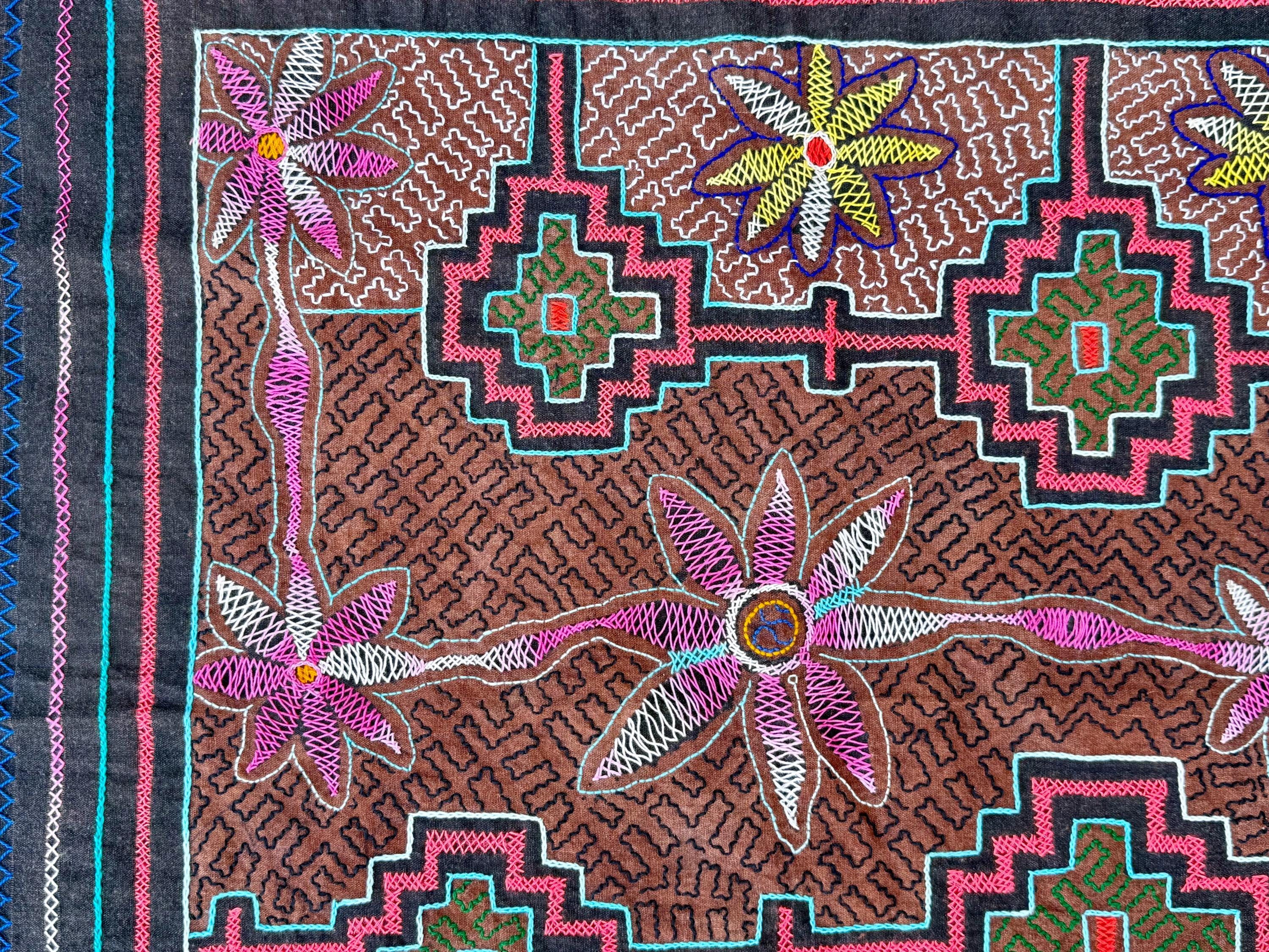 These embroidered cloths are traditional to the Shipibo-Conibo and are artistic expressions of medicine songs (icaros), that bring the energies of the plants they represent to life with their exquisite patterning and designs (kene). These powerful songs are sung during their creation, imbuing each stitch with the beauty and energy of the plant icaro.